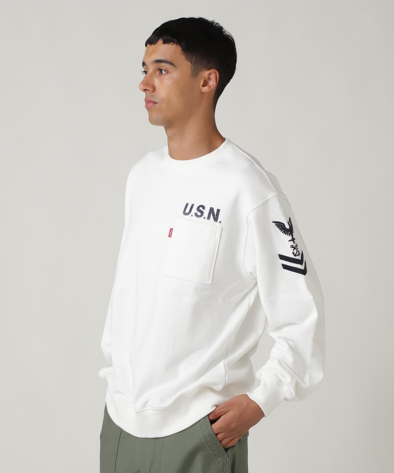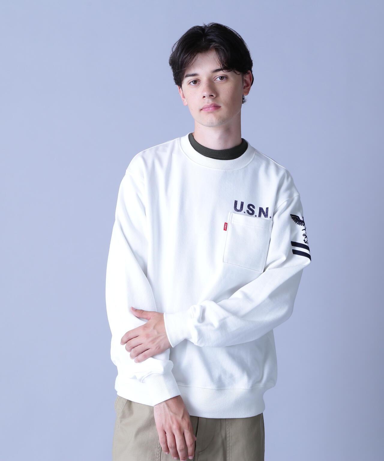 NAVAL CREWNECK SWEAT / AVIREX / AVIREX 產品詳情 - 舒適的100%純棉材質針織衫 - AVIREX流行的美國海軍圖案 - 白色,深藍色,灰色該品牌成立於 1975 年,當時是美國空軍的承包商,通過提供飛行夾克而知名度大增。Avirex 源自軍方,以功能性設計所散發出的獨特美感為基礎。其獨特的外觀曾出現在電影 "諜影重重 "中。