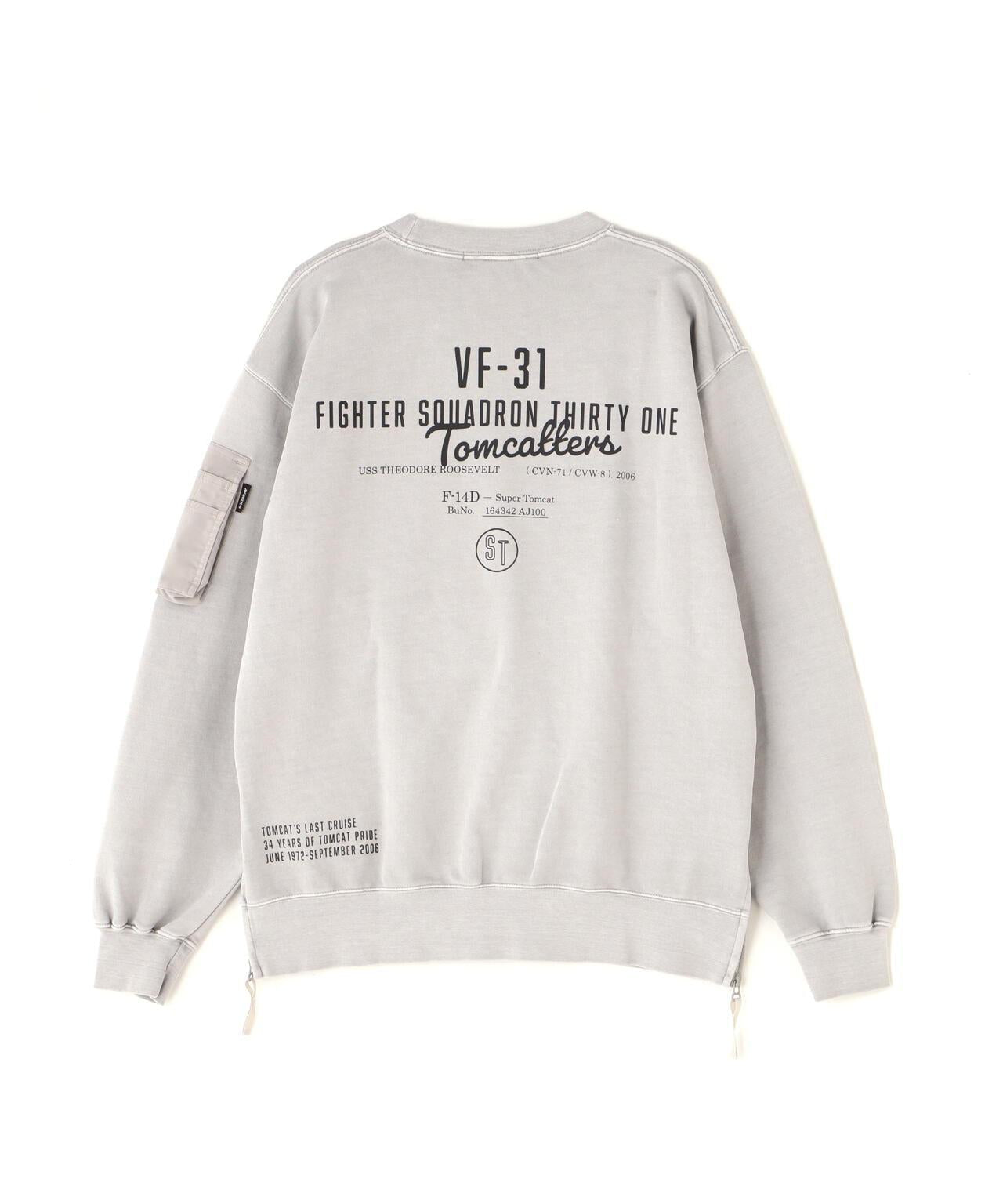 POCKET SWEAT(口袋運動衫) 產品詳情 - 採用獨特色素染色法處理的平領運動衫 - 左袖軍裝口袋和左右下襬側扣具特色 - 通過開合扣可改變輪廓 - 兼具透氣功能的設計 - VF-31 "TOMCATTERS "圖案印花 - 面料採用手感舒適的絲質襯裡。設計和 VF-31 "TOMCATTERS "印花圖案兼具透氣功能,面料採用質感良好的絲質襯裡毛髮,沉穩的軍旅風味飾面,勻稱的廓形 [AVIREX / AVIREX] 1975 年。它作為美國空軍的承包商而成立,並通過提供飛行夾克而大大提高了知名度。軍事淵源。