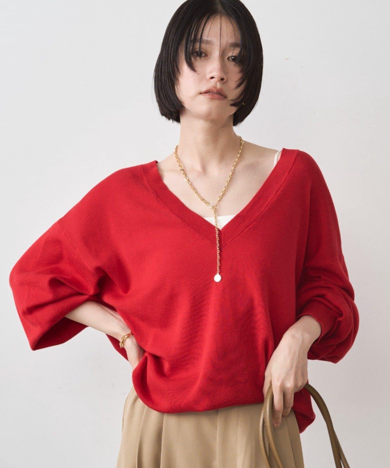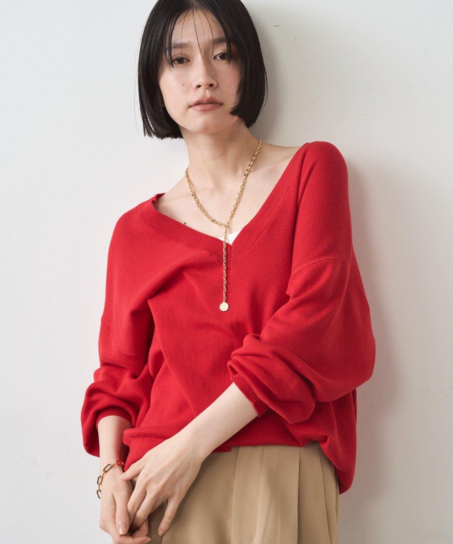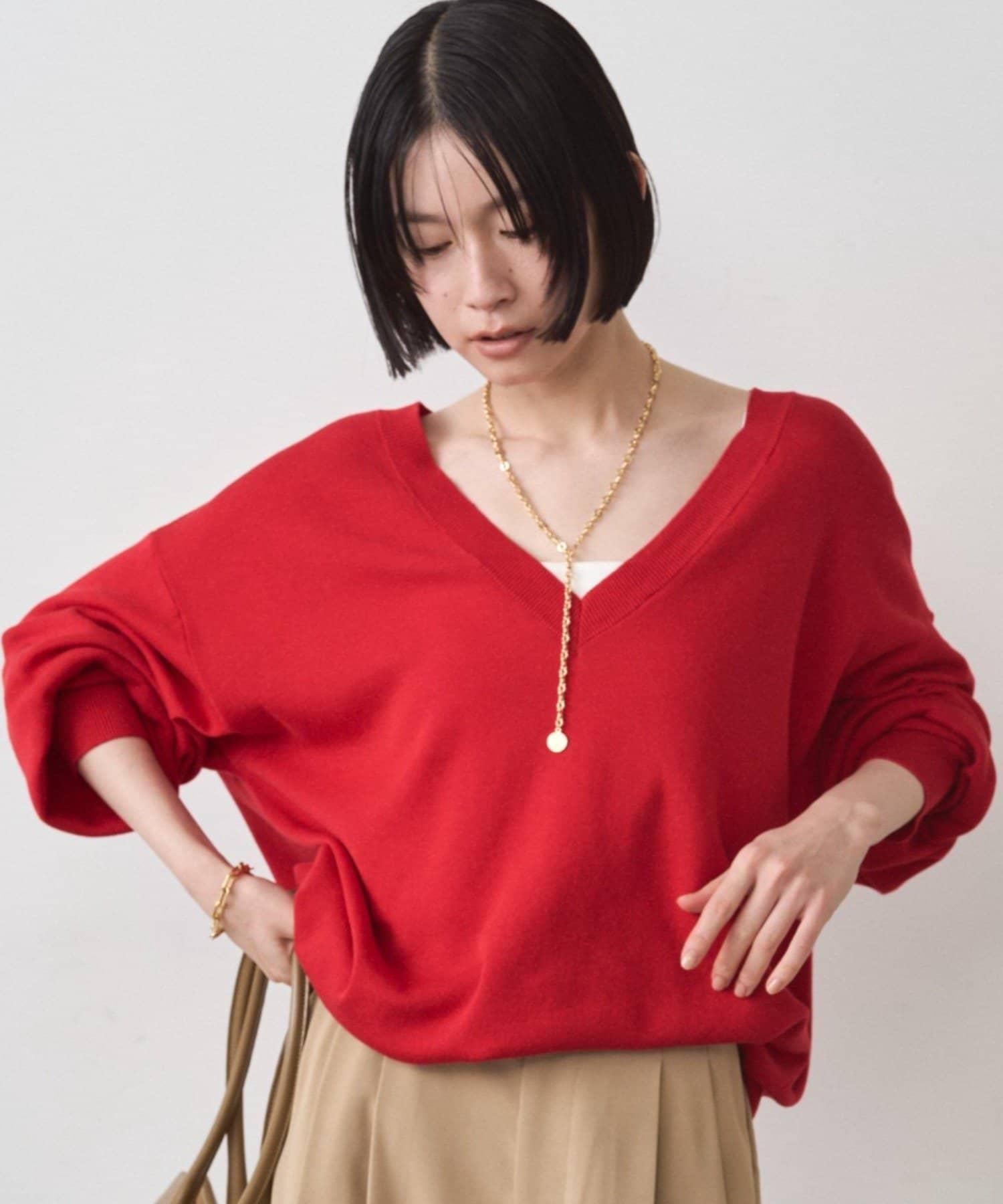 這款針織上衣採用深 V 領設計,能很好地突出肩部線條。