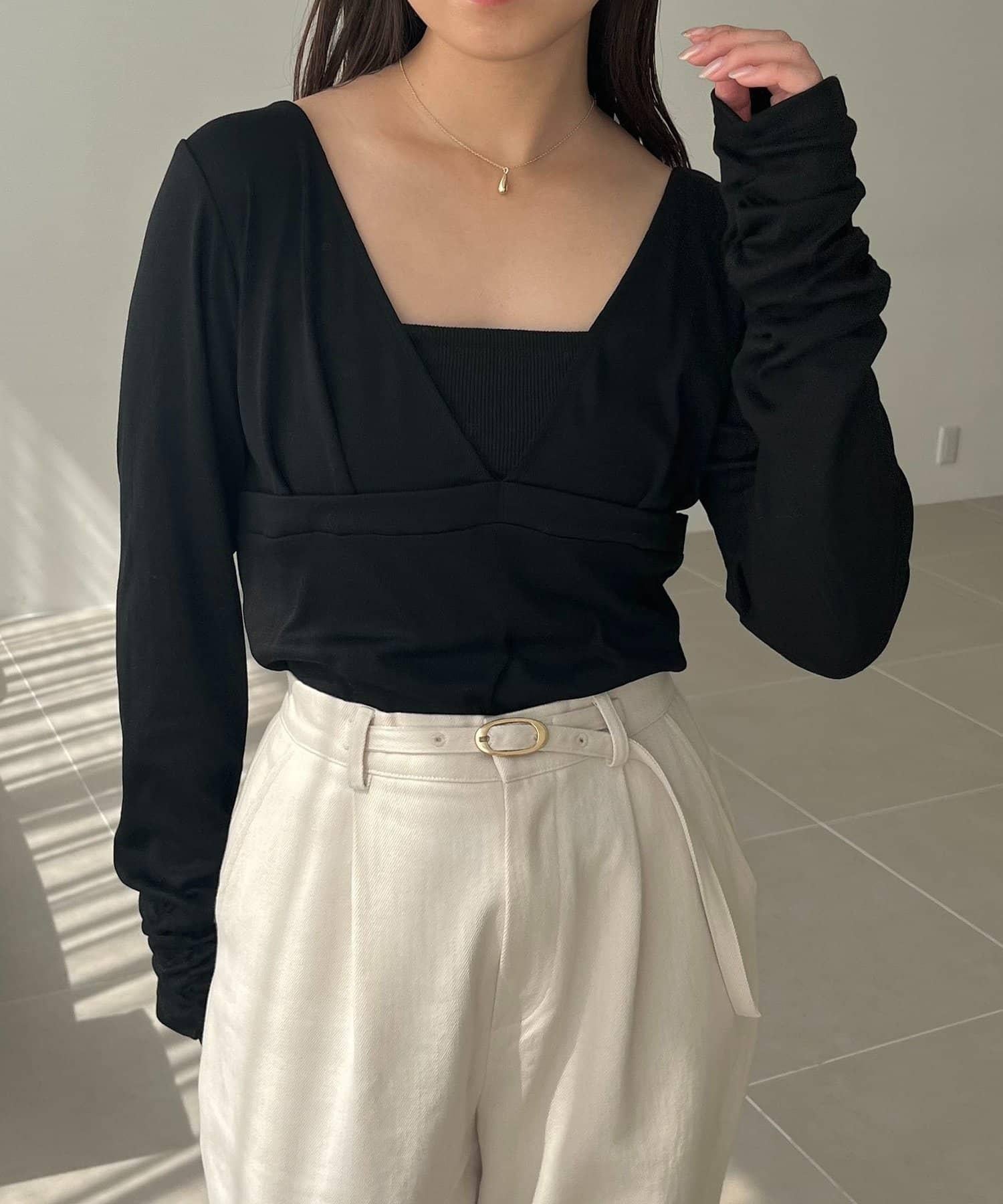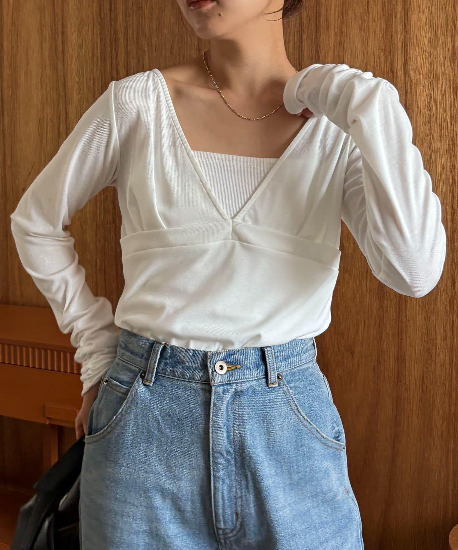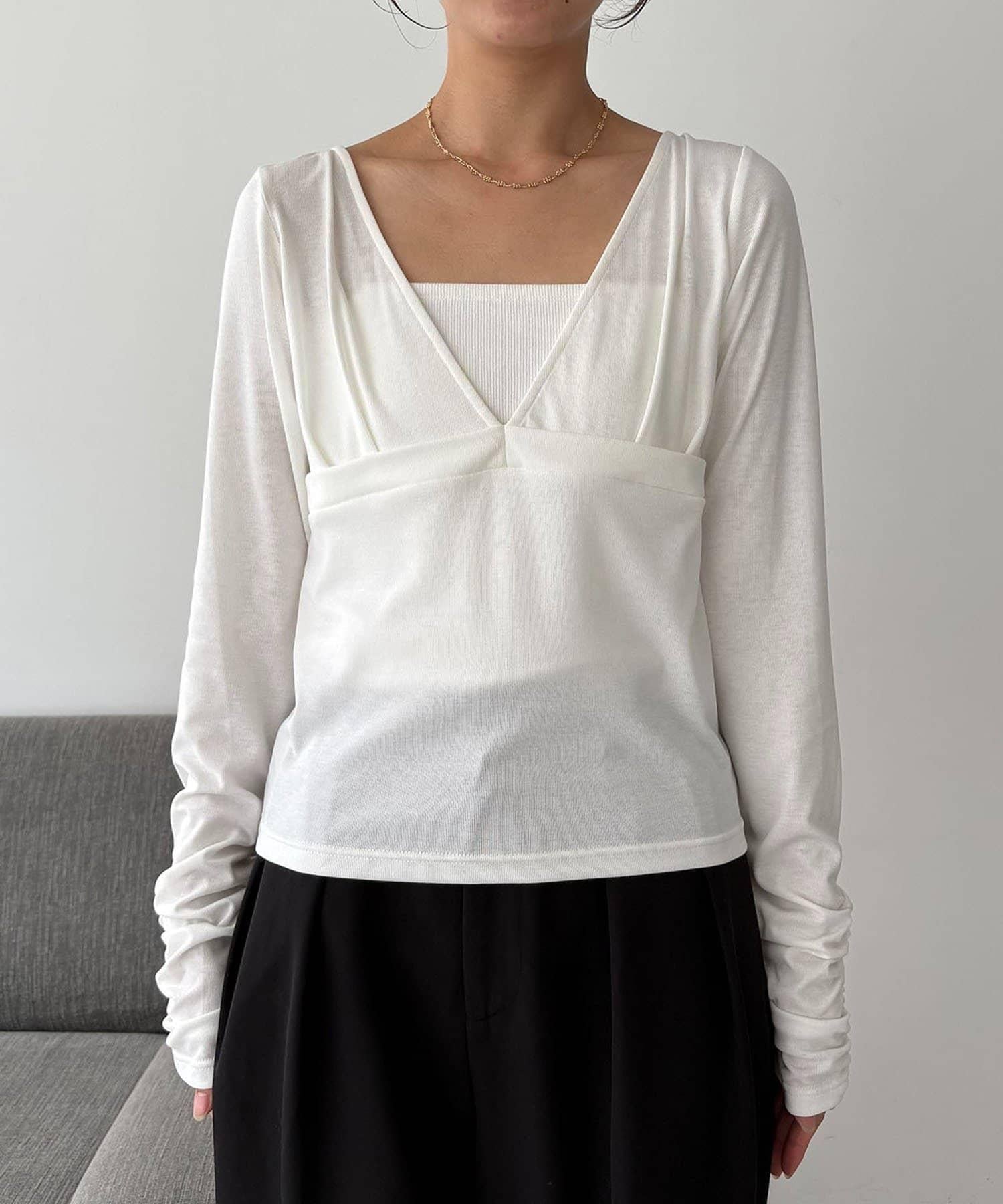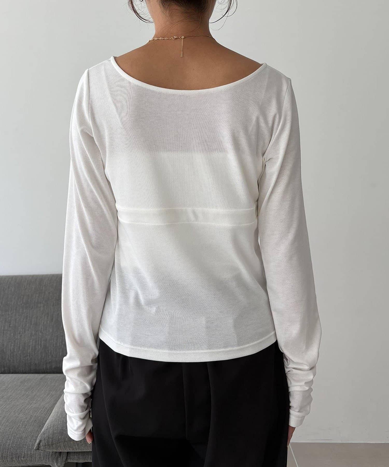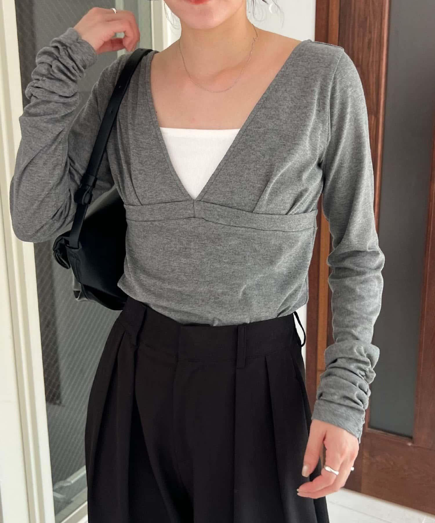 胸前下方的剪裁將視線上移,營造出時尚效果。