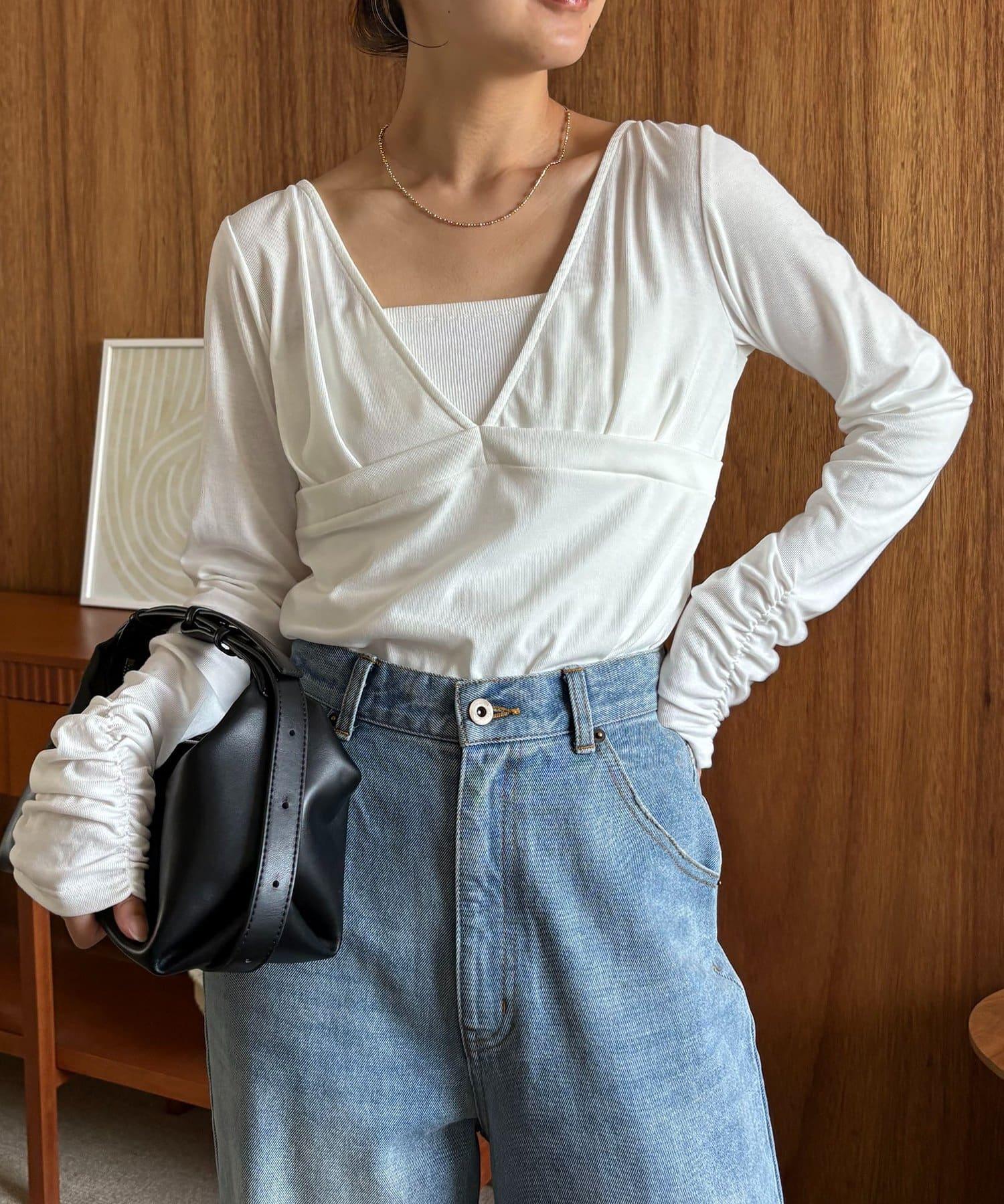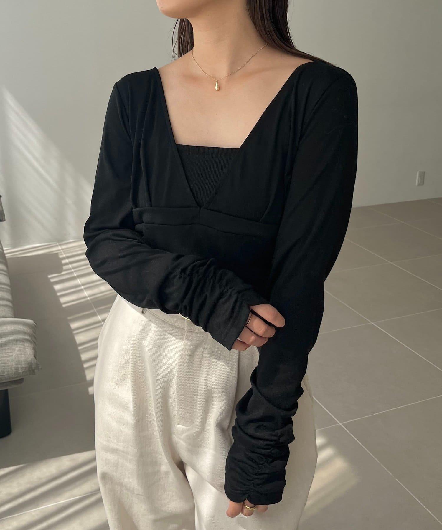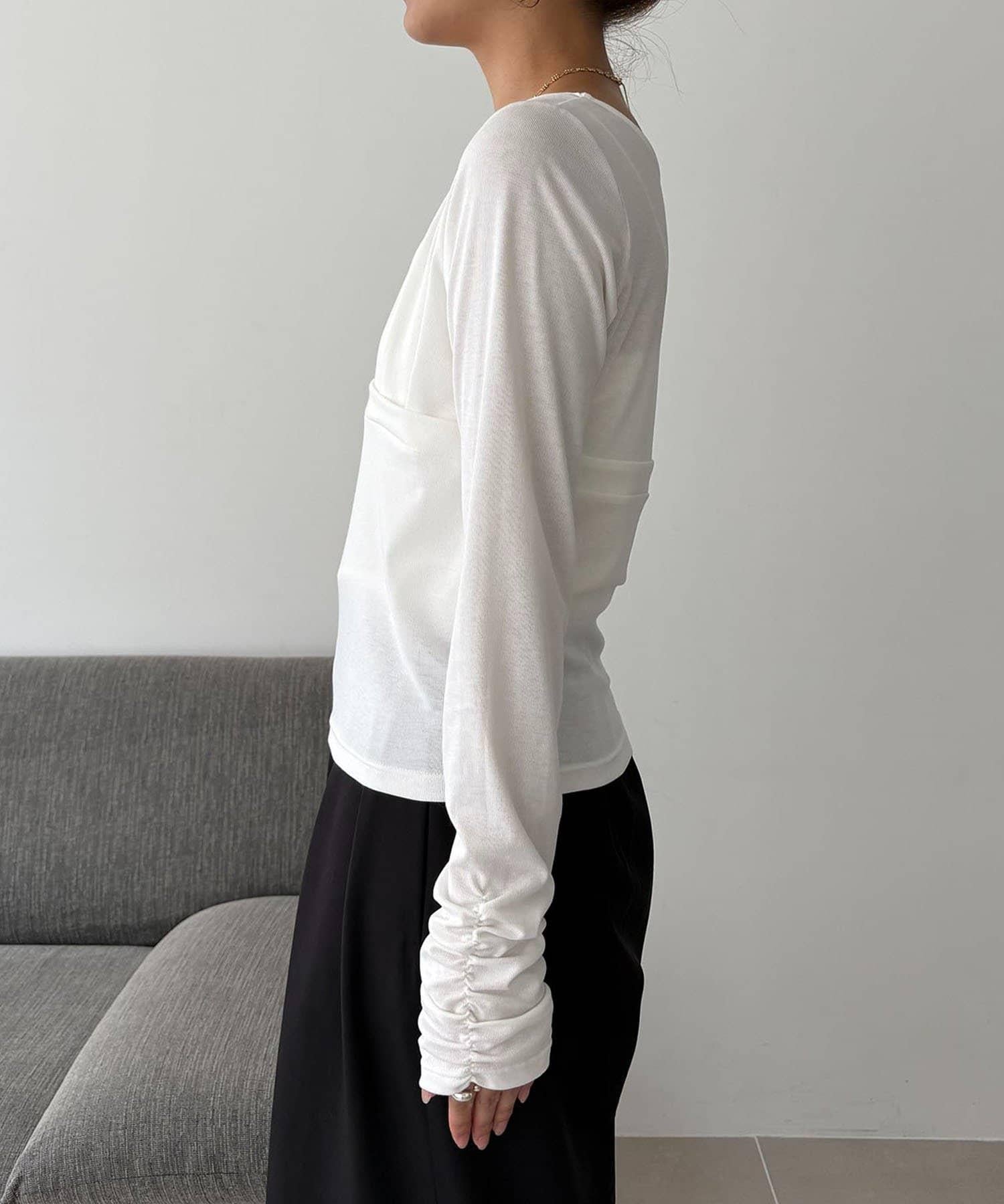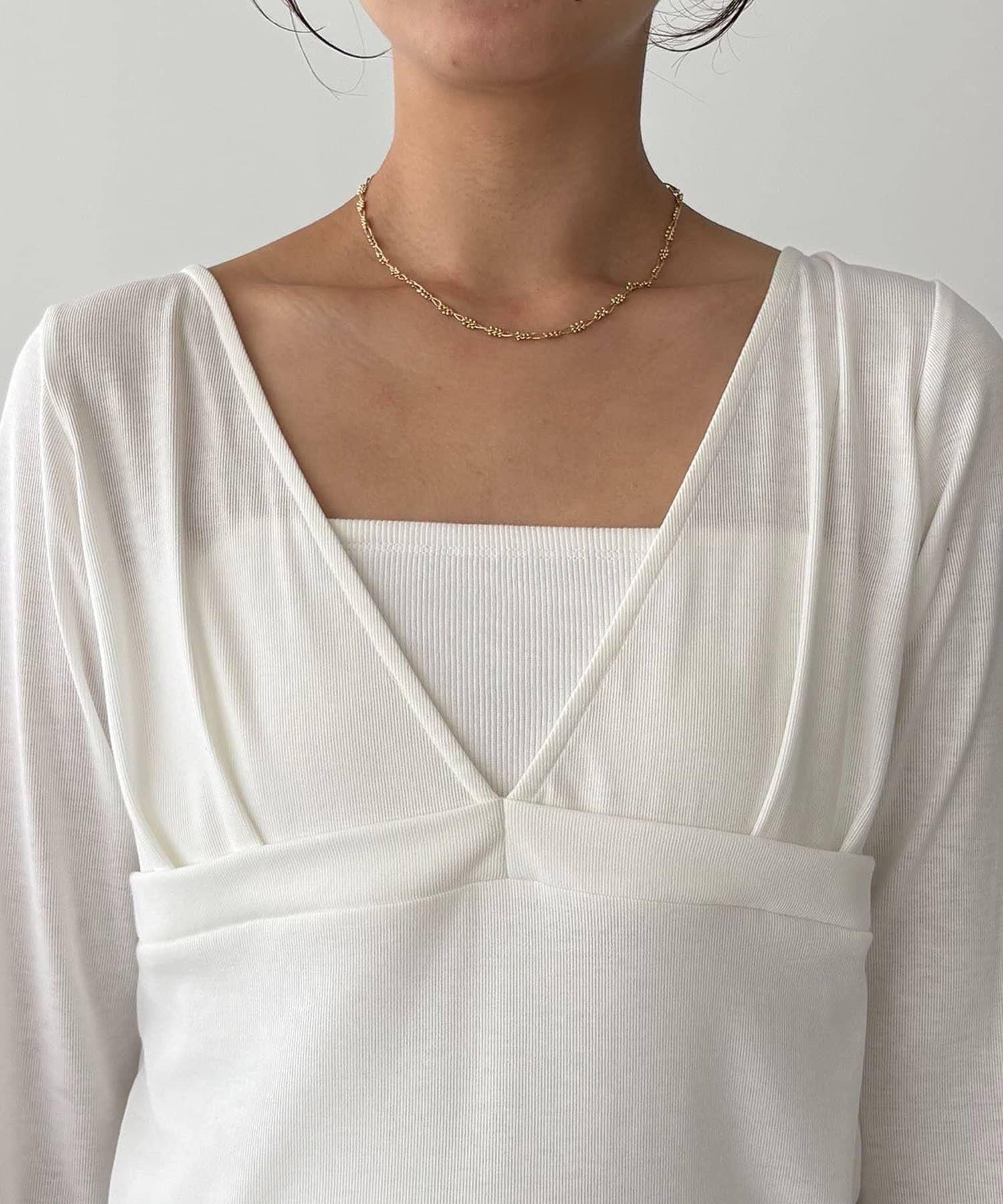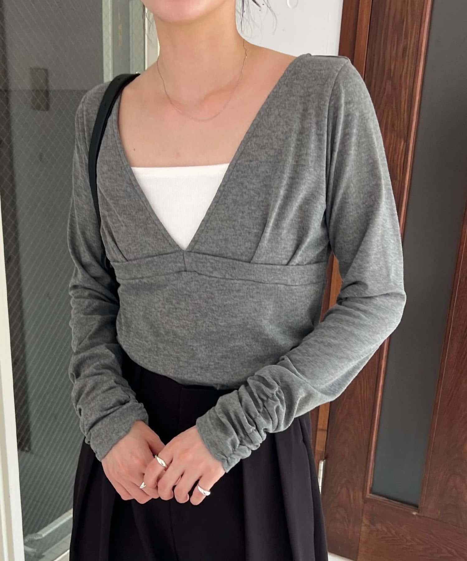 胸前下方的剪裁將視線上移,營造出時尚效果。