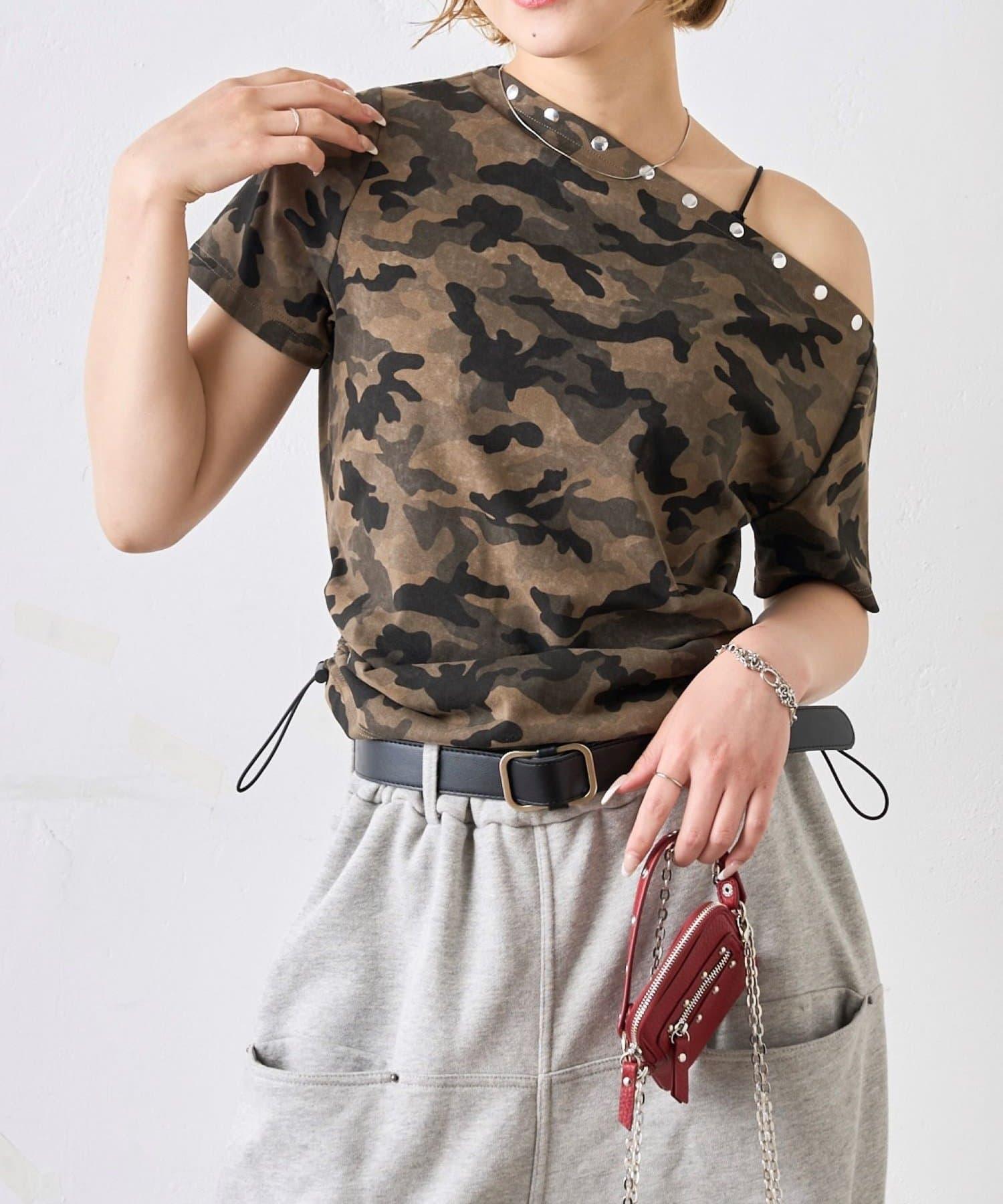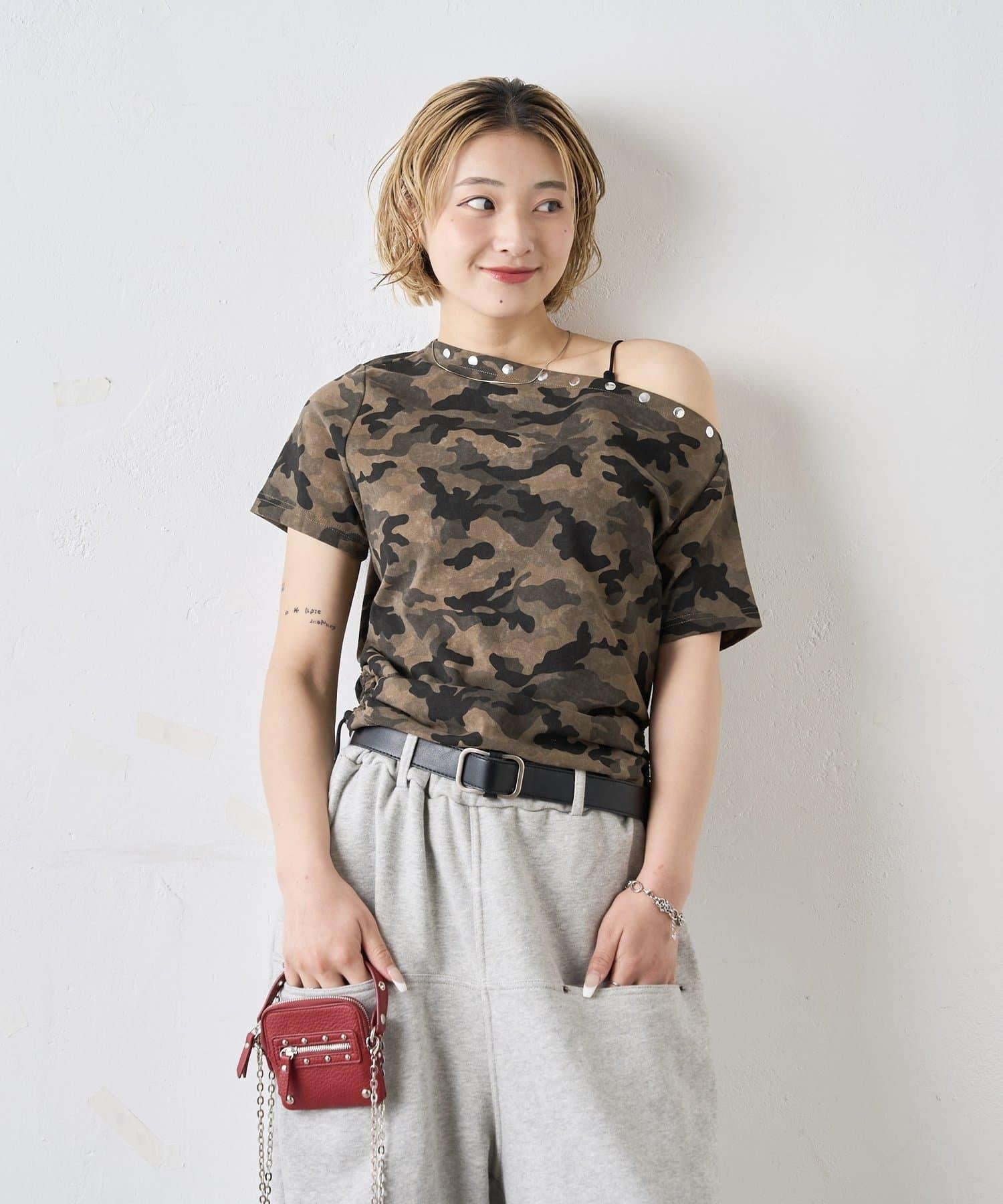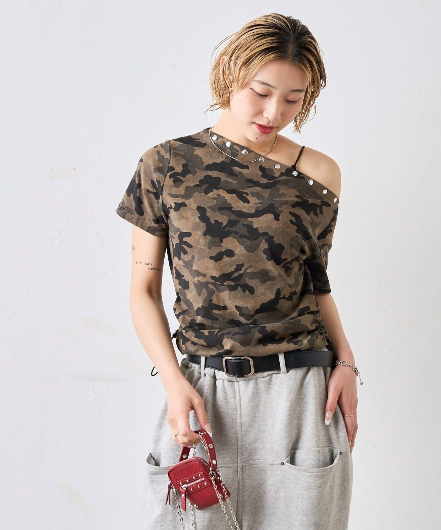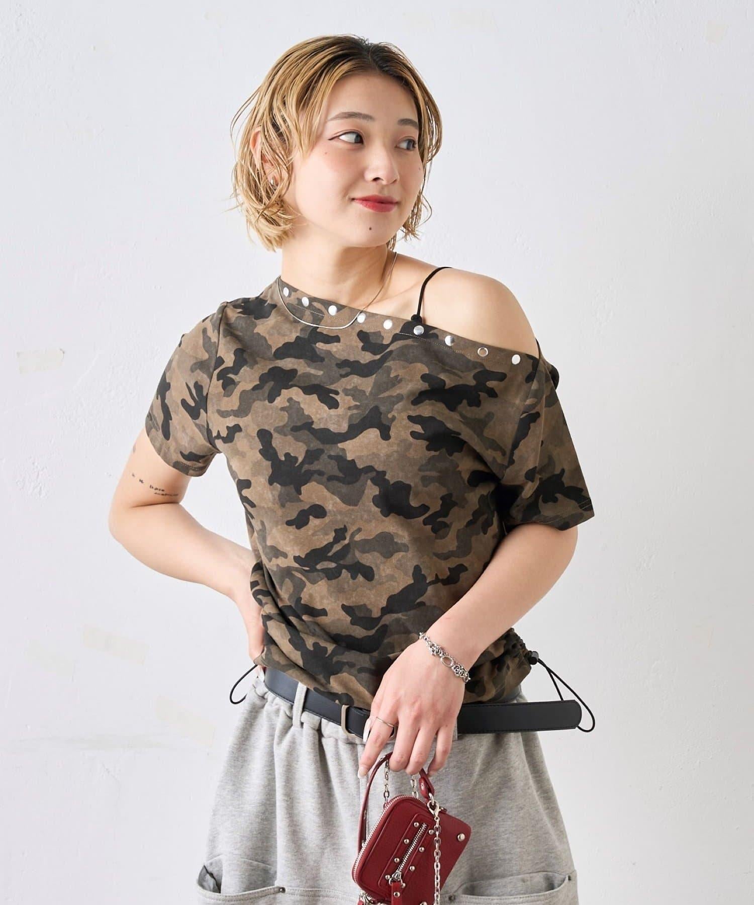 迷彩和豹紋印花!流行的鉚釘單肩上衣。