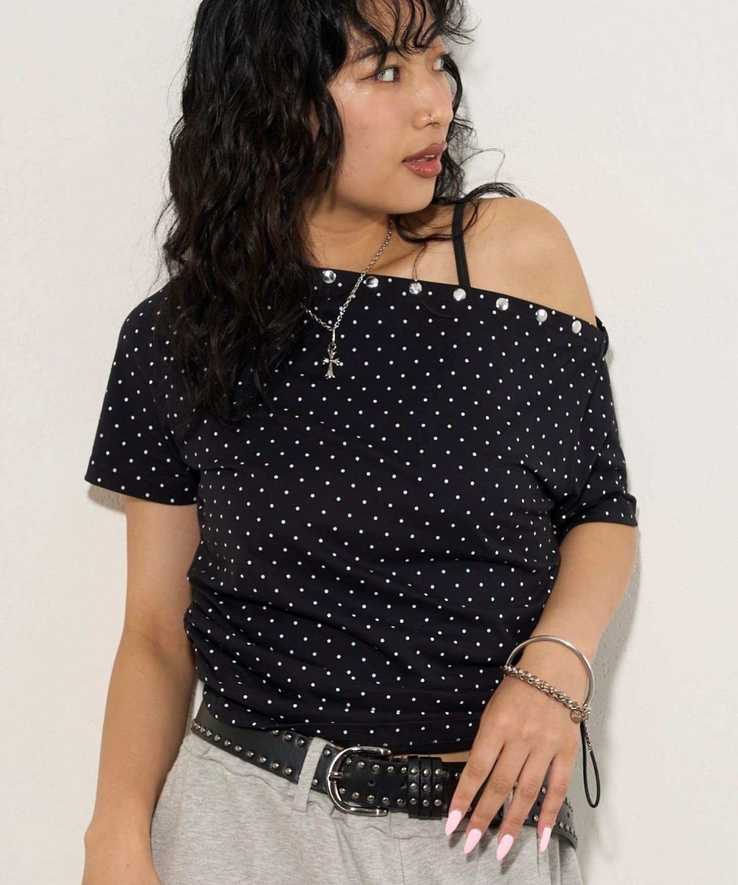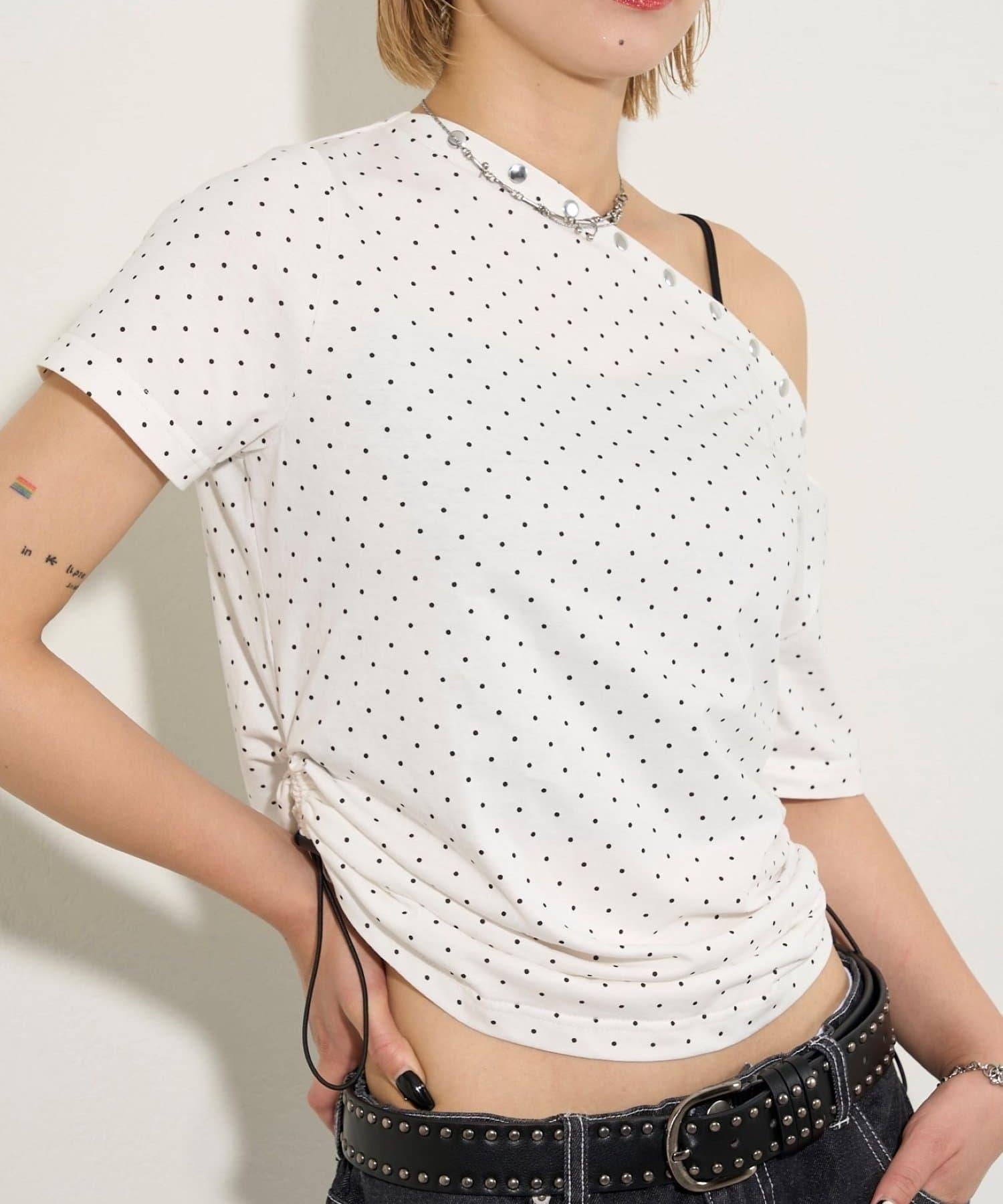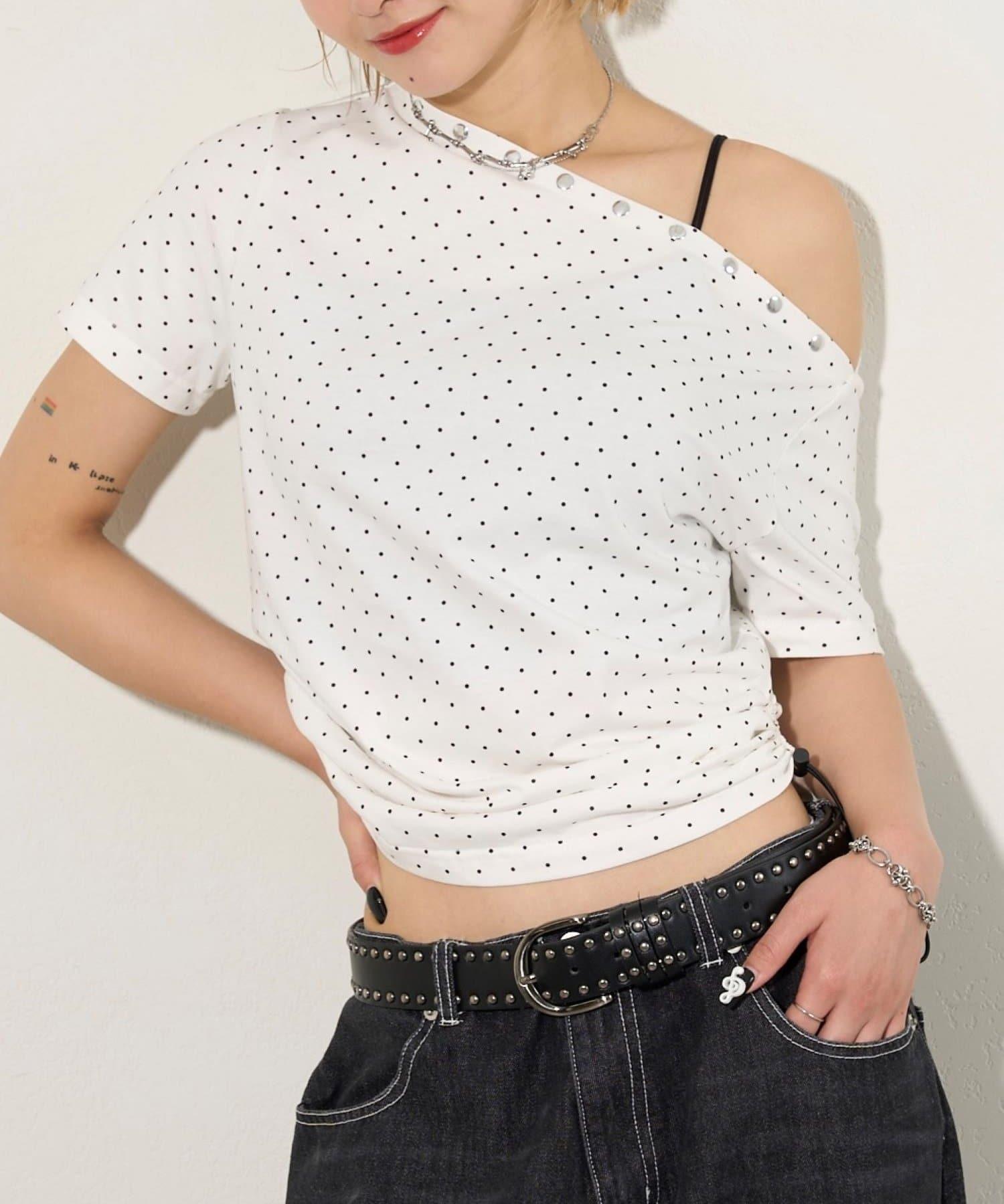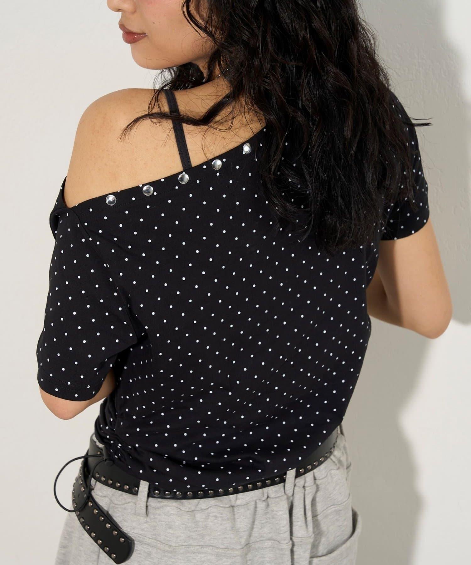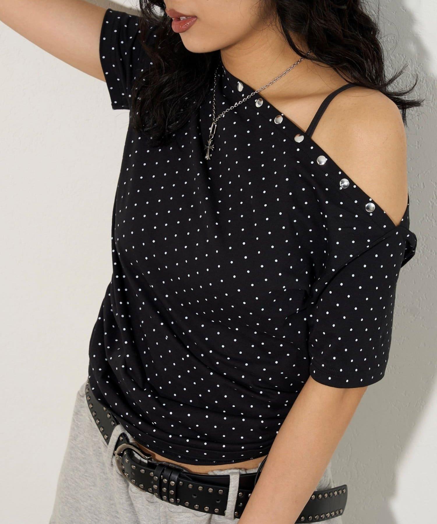 這件上衣既有頸部鉚釘的酷感,又有單肩上衣的女人味。