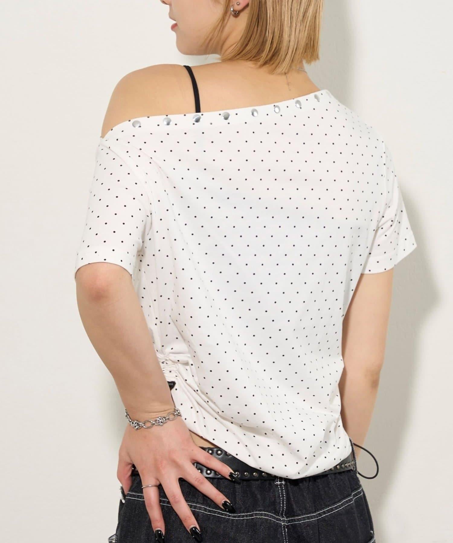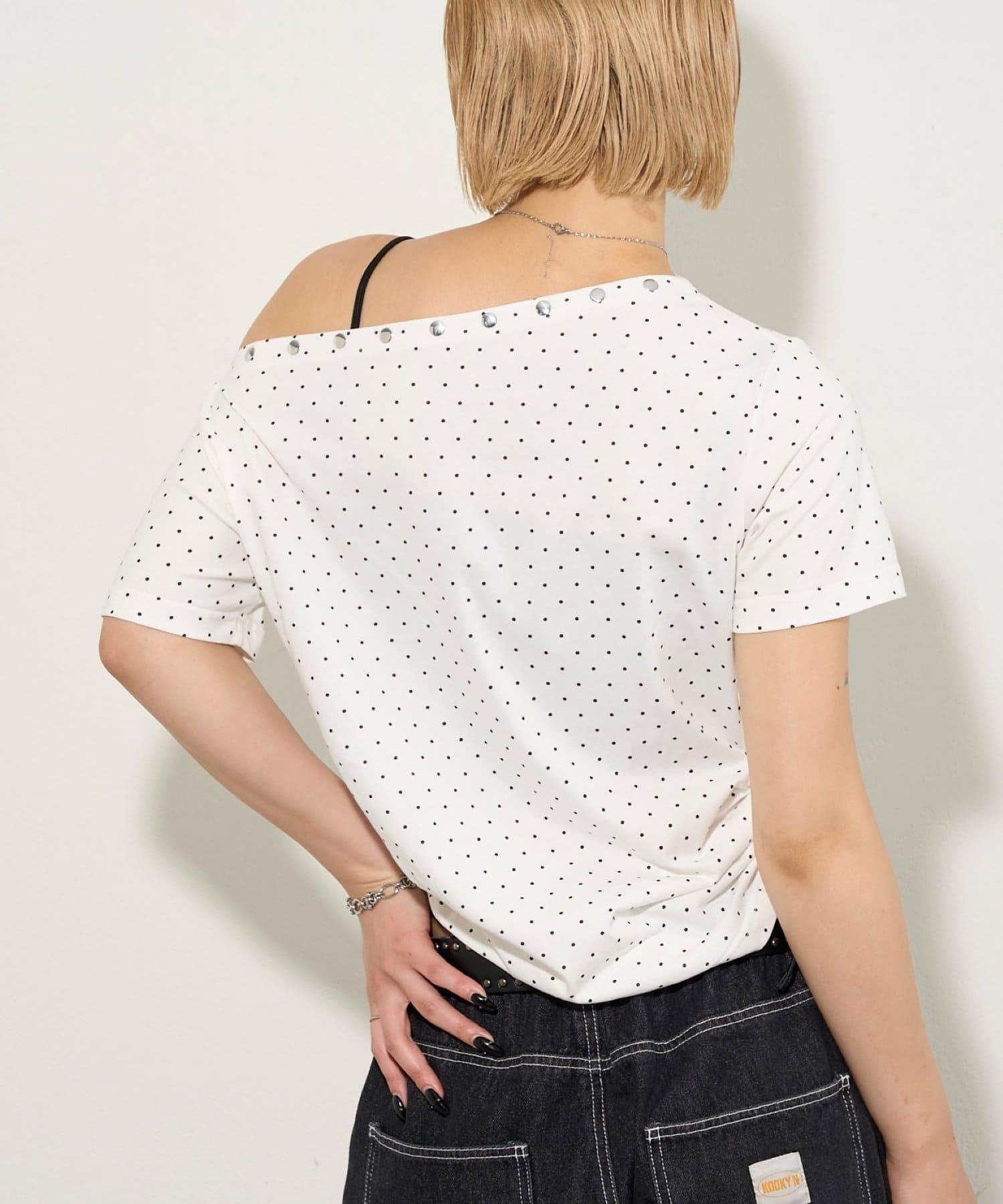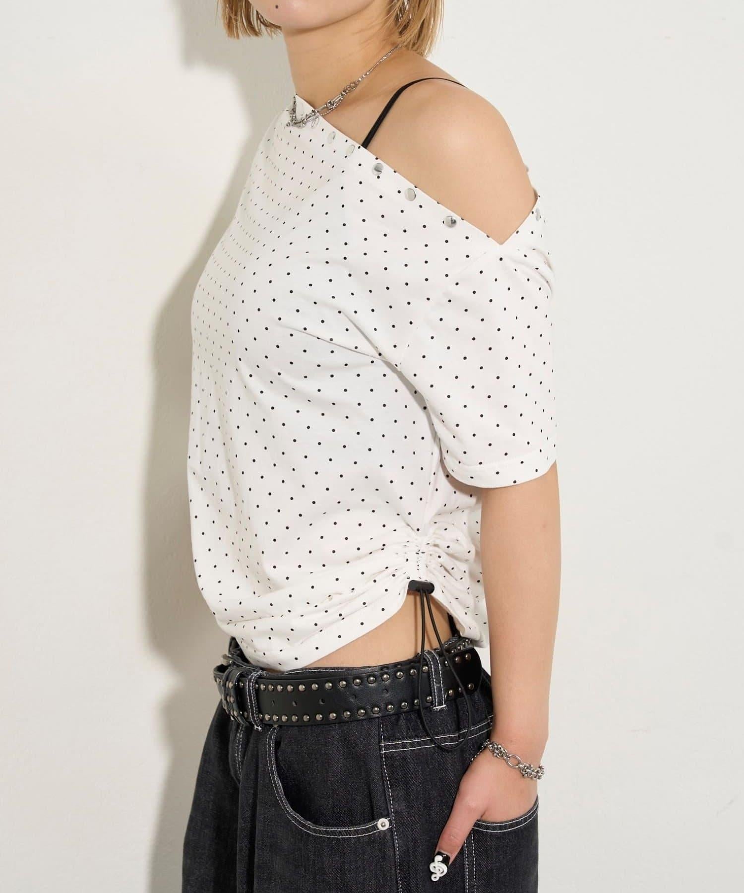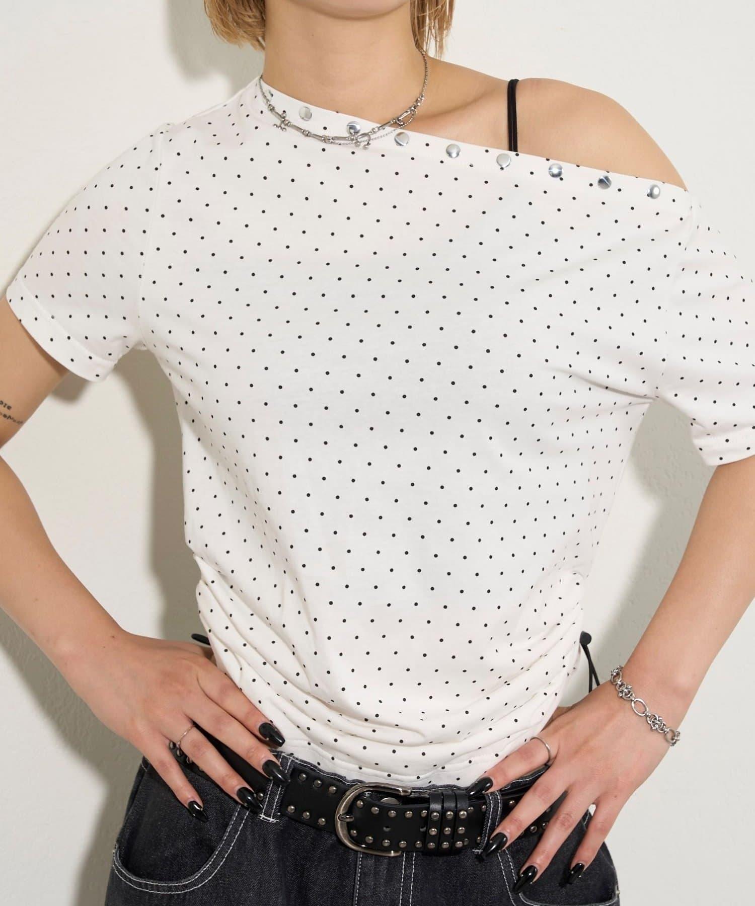 這件上衣既有頸部鉚釘的酷感,又有單肩上衣的女人味。