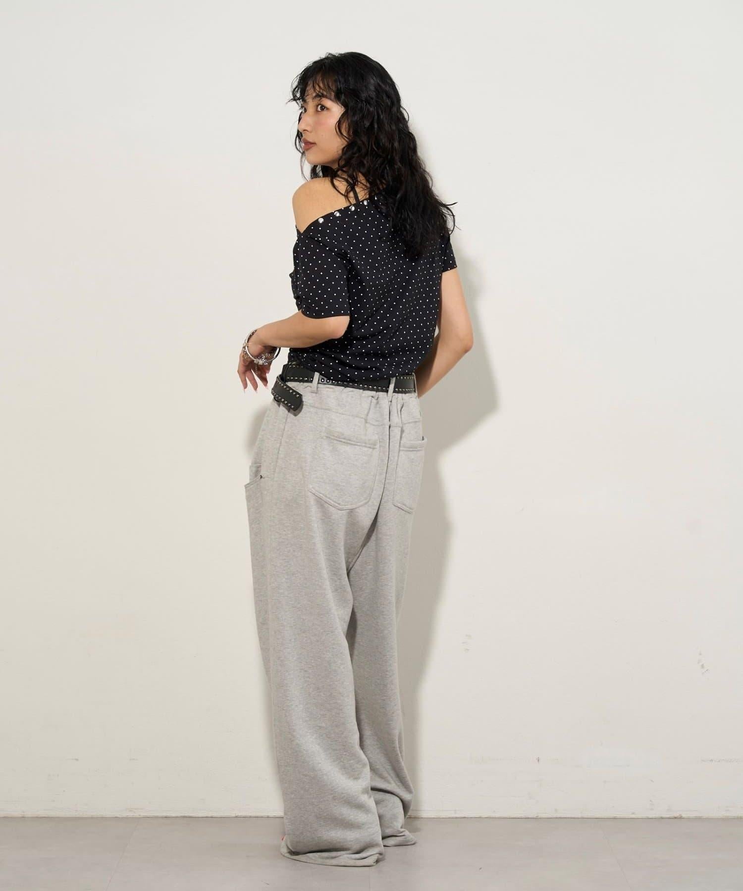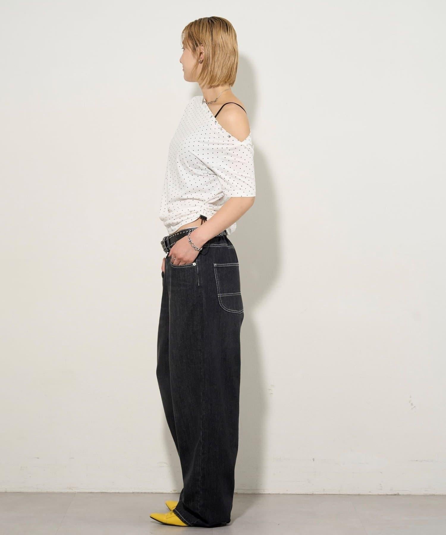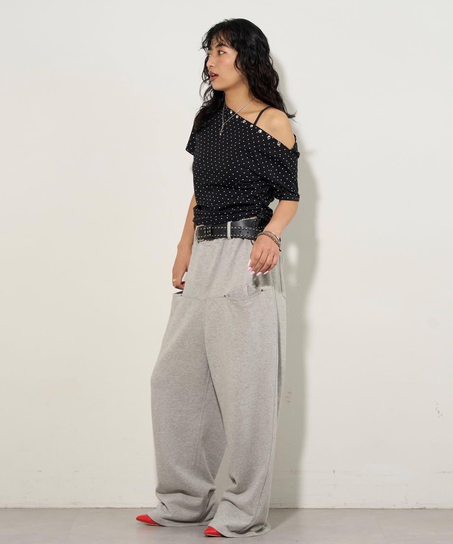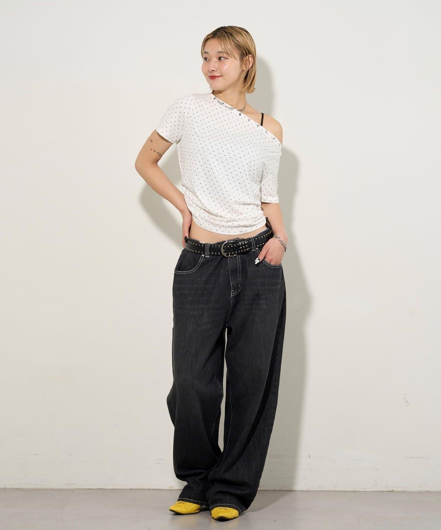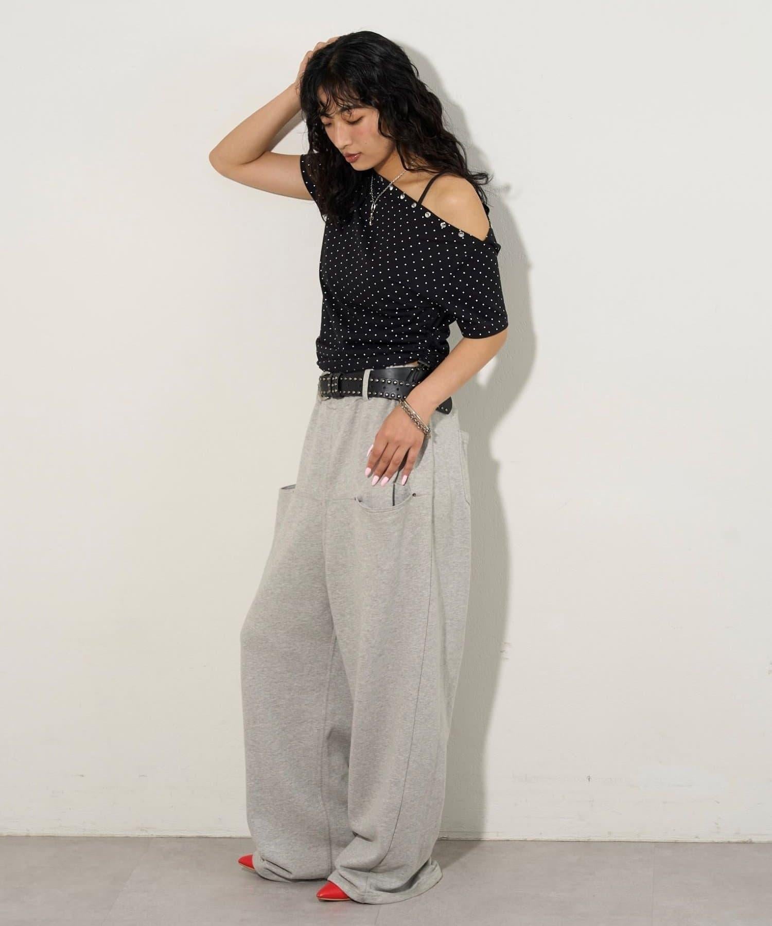 這件上衣既有頸部鉚釘的酷感,又有單肩上衣的女人味。