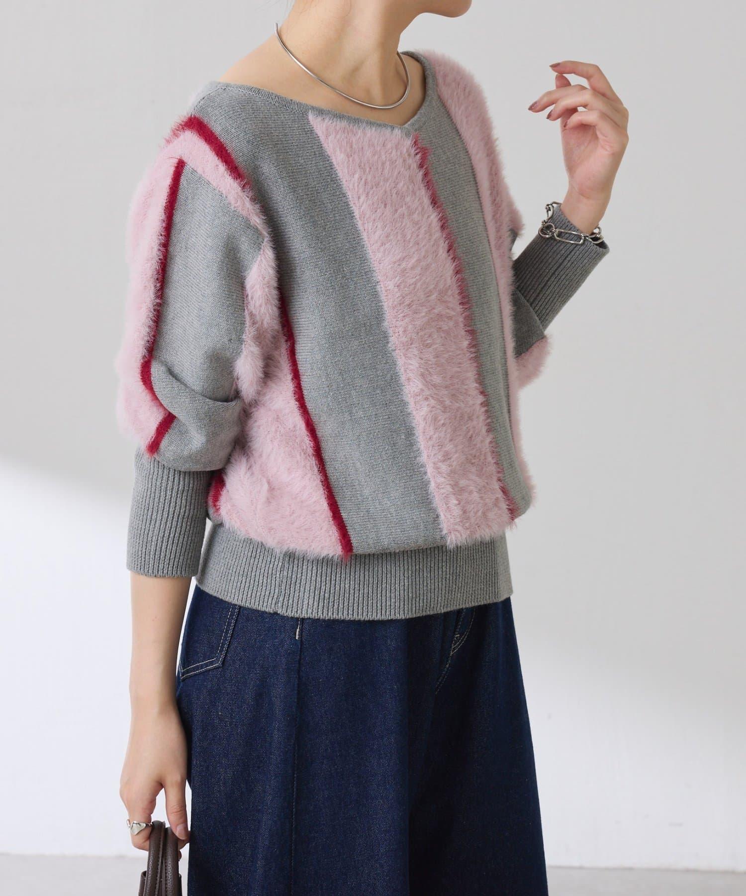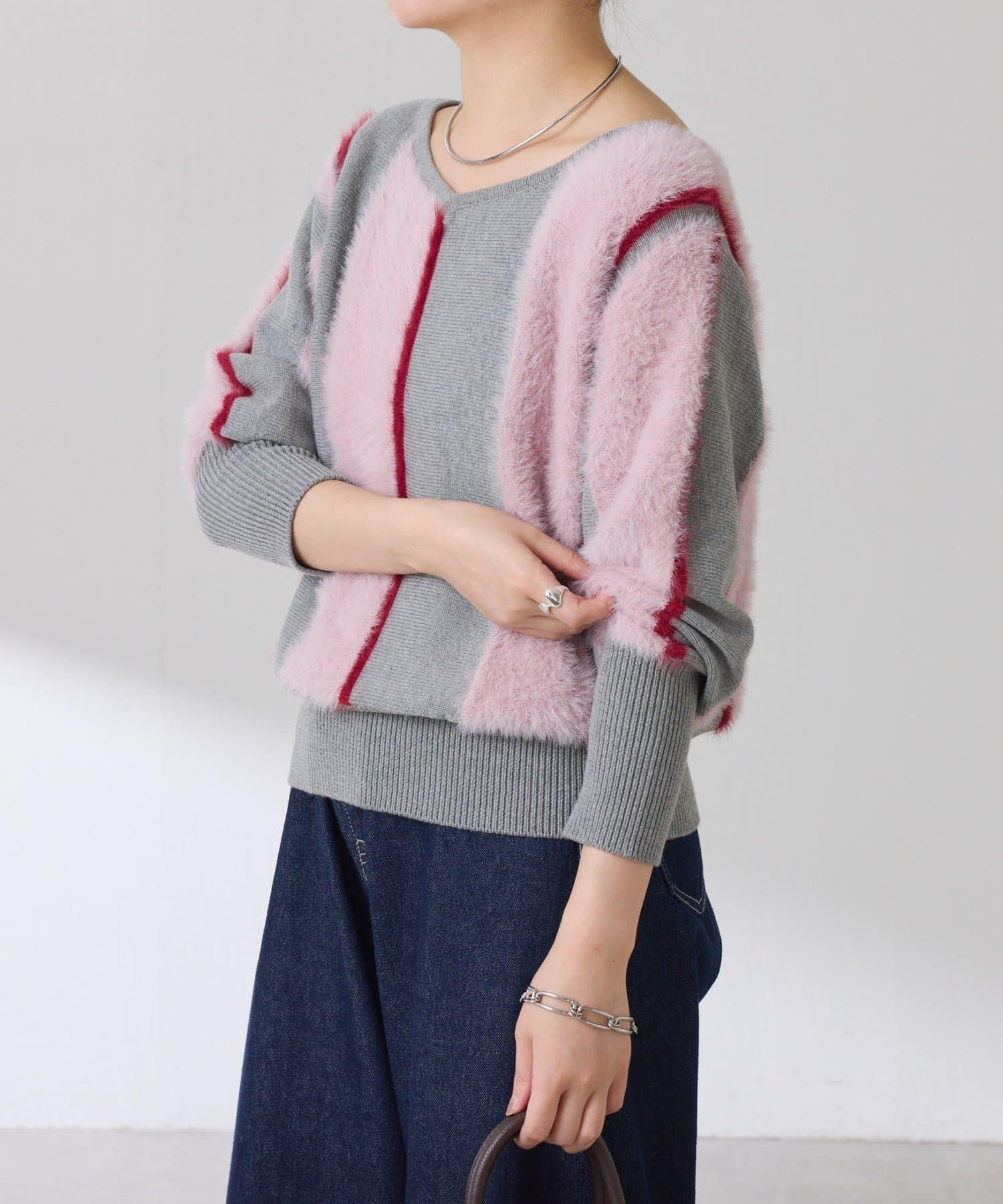 這款 V 領針織衫採用不同外觀的紗線編織成條紋圖案。