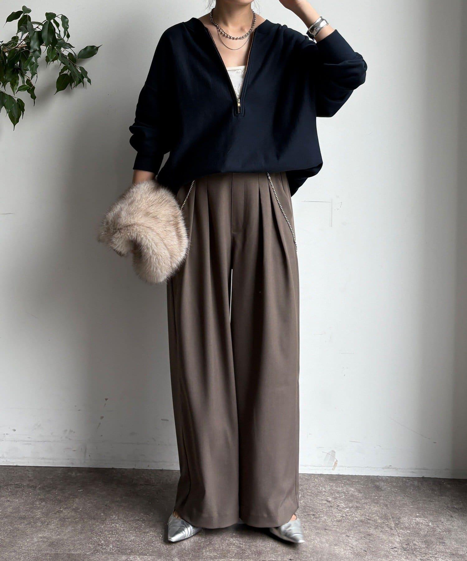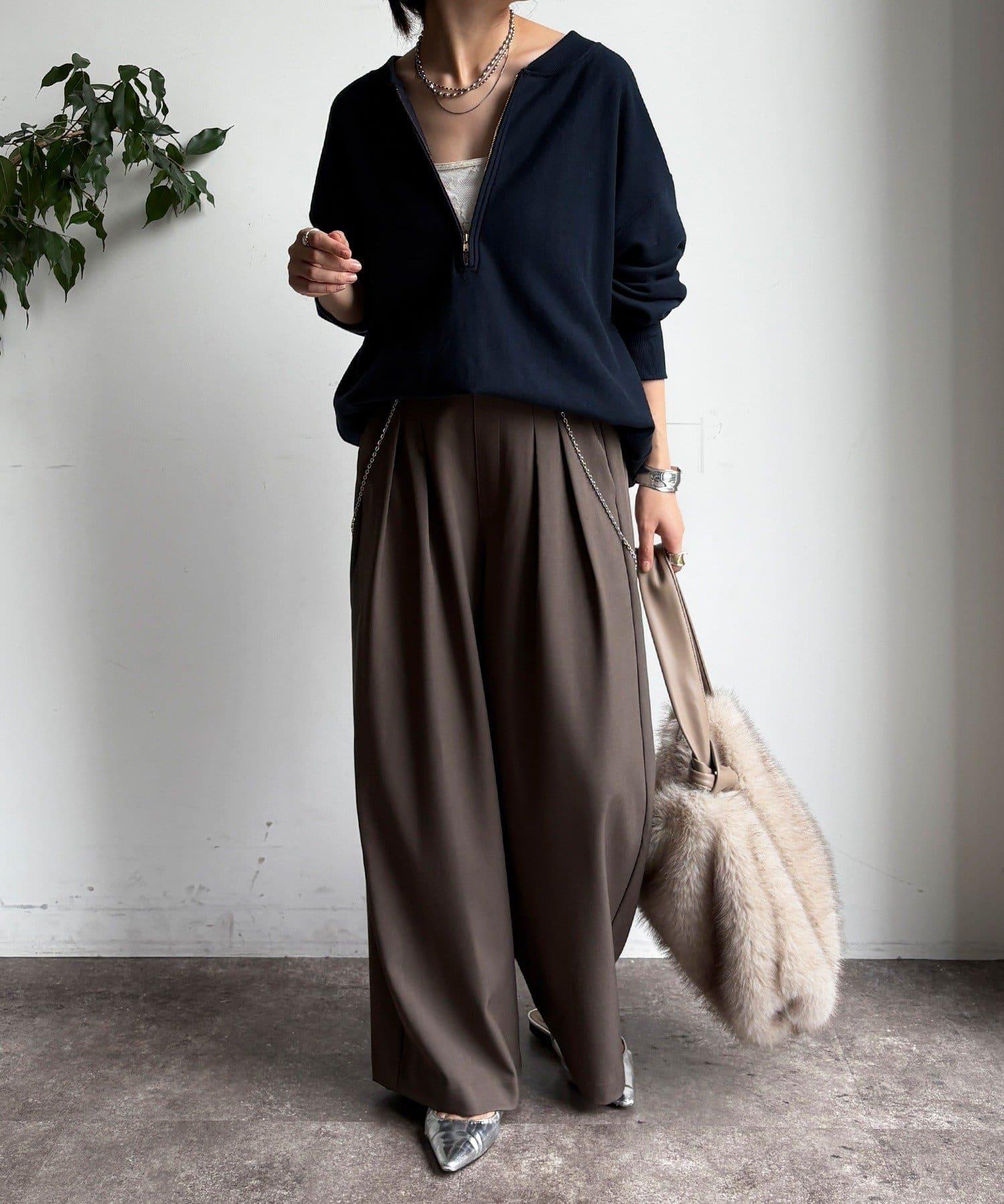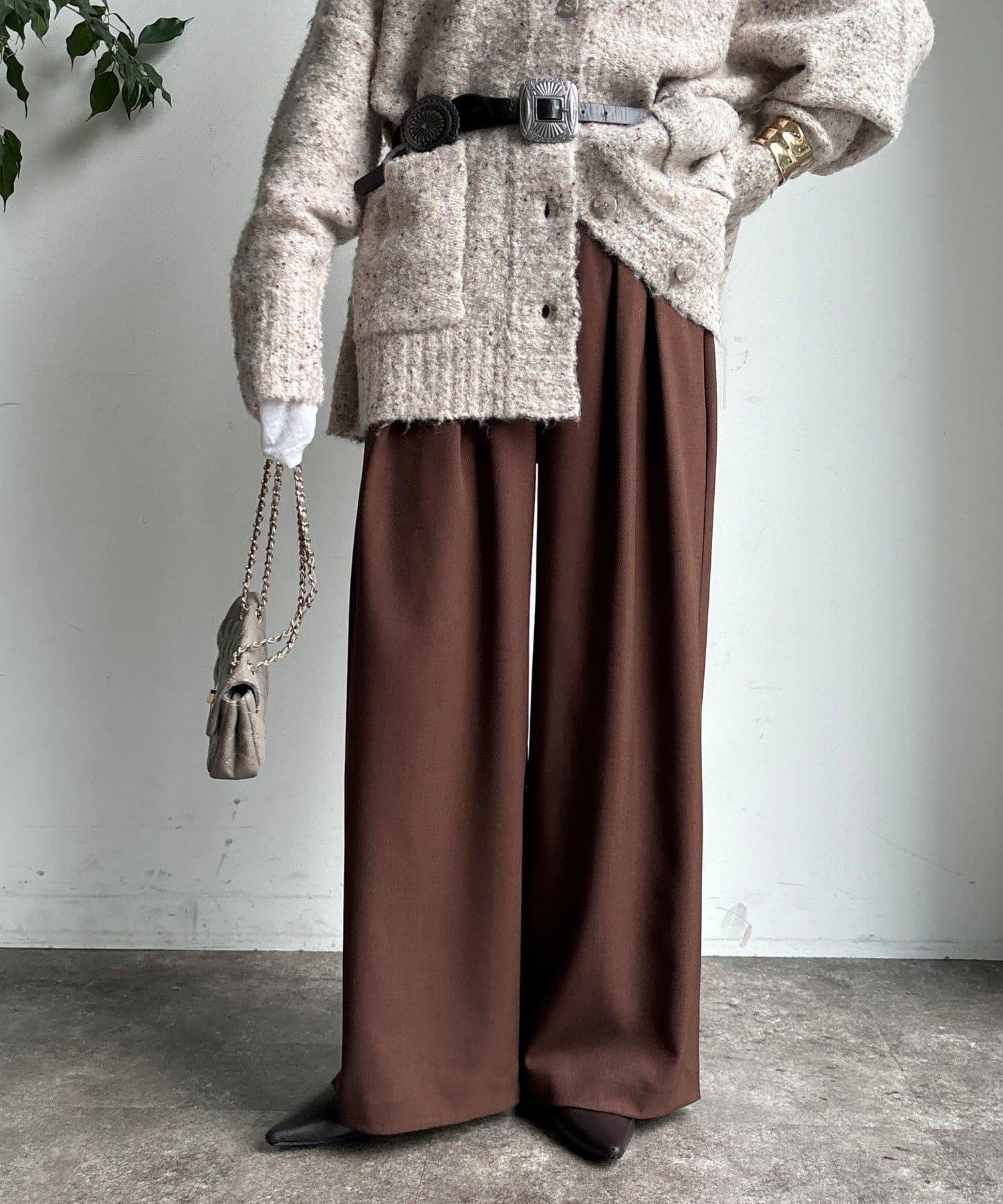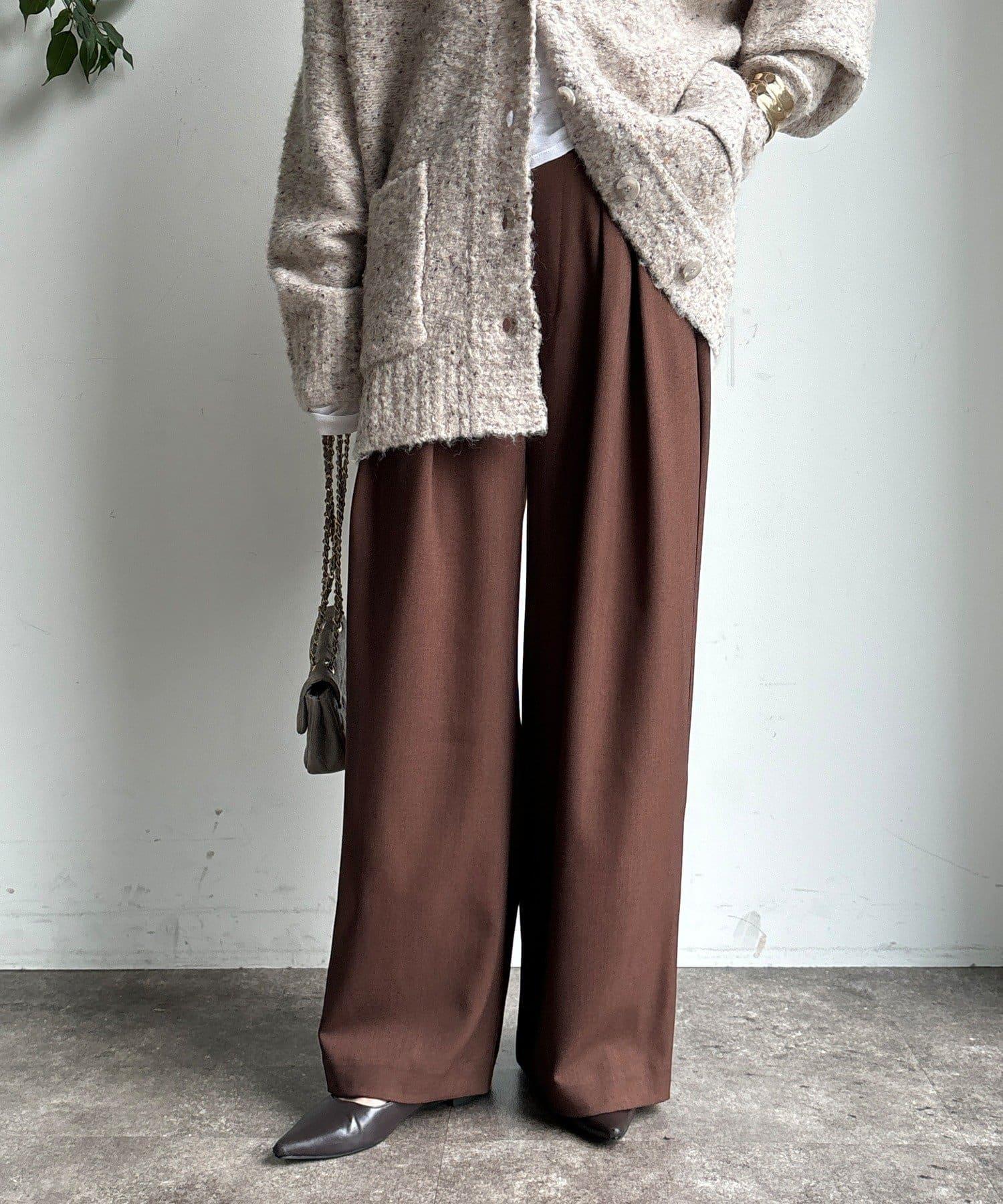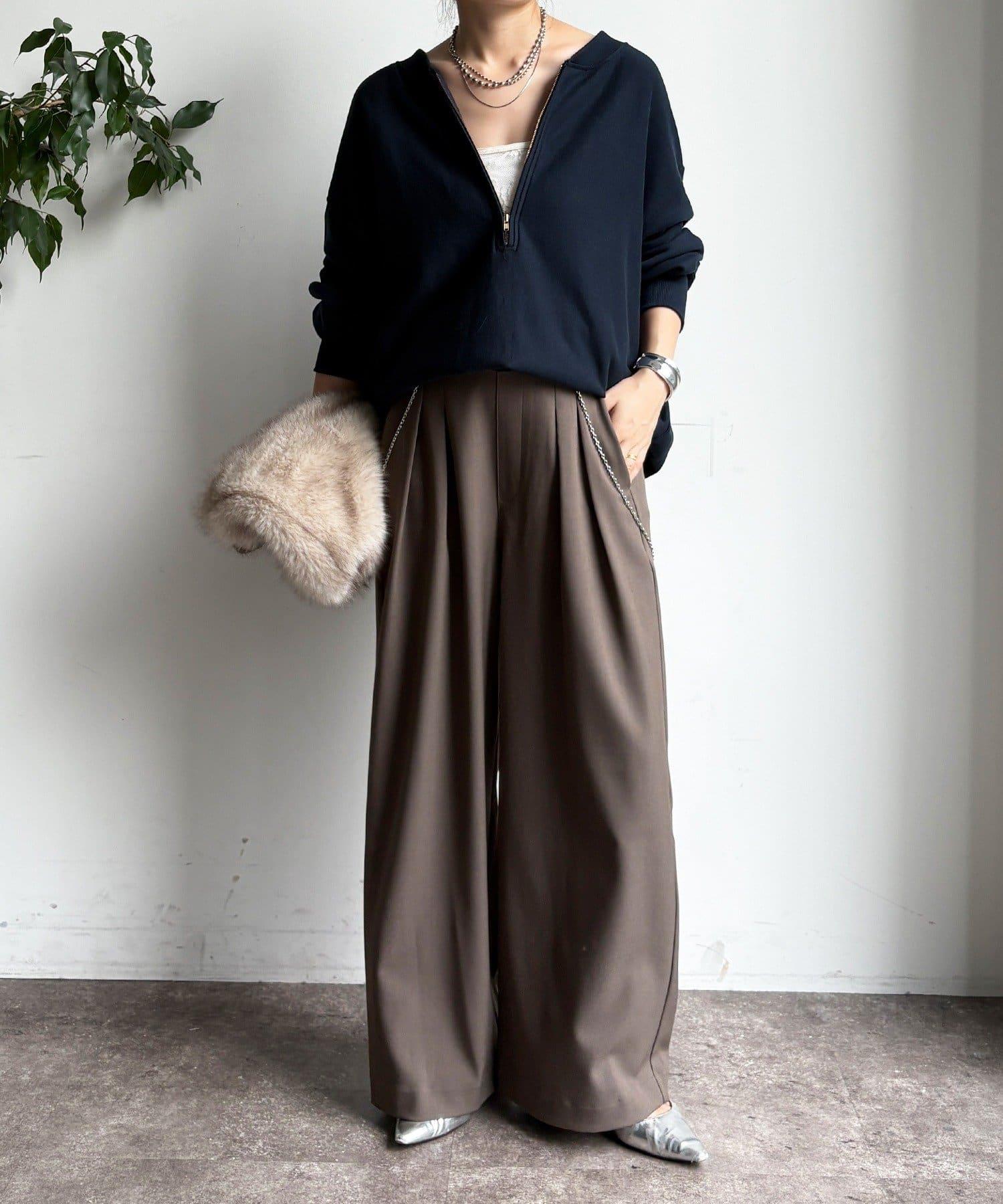 內收式寬鬆長褲同樣具有垂墜效果,但採用了類似混色的面料,使其更適合秋冬風格。