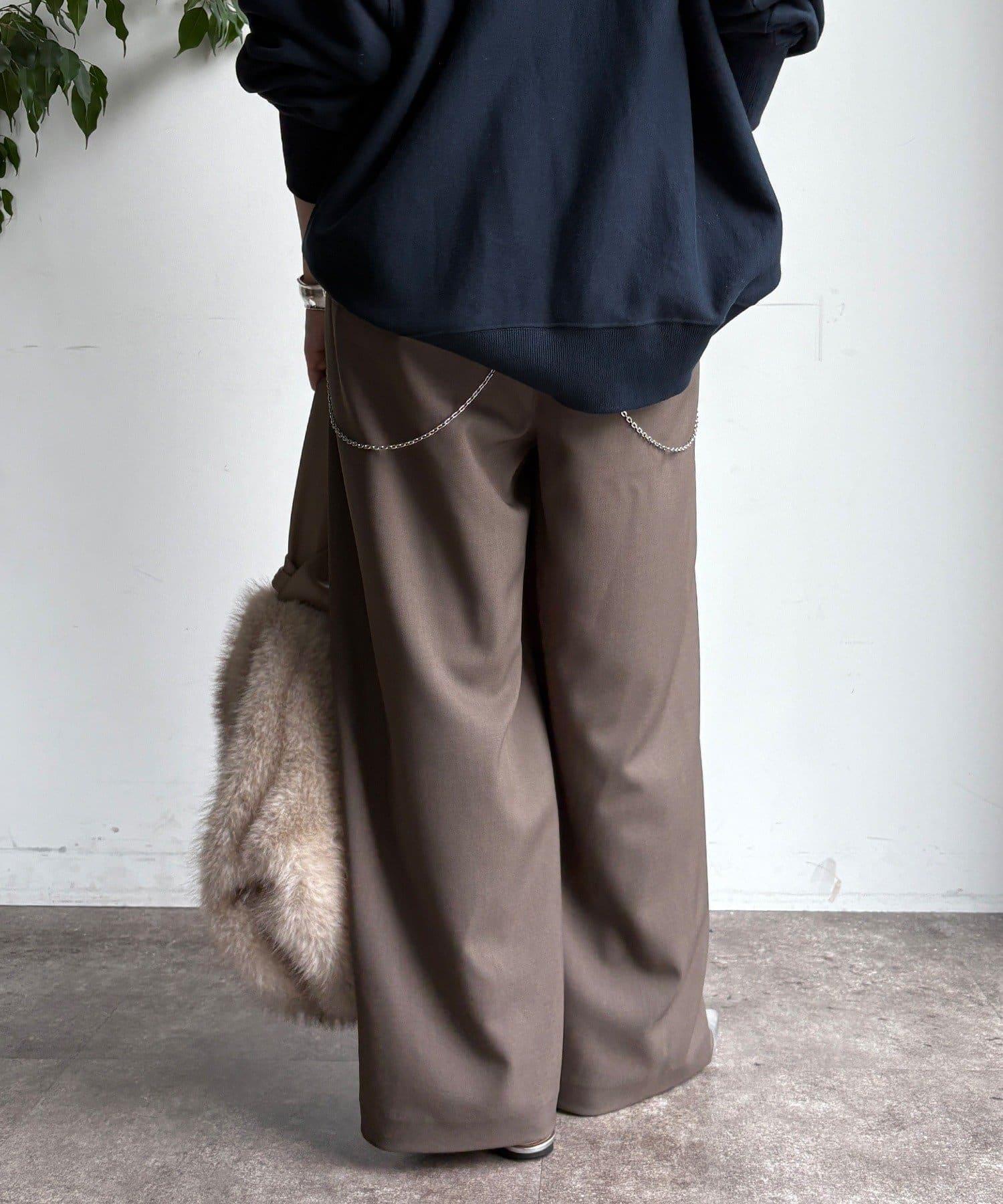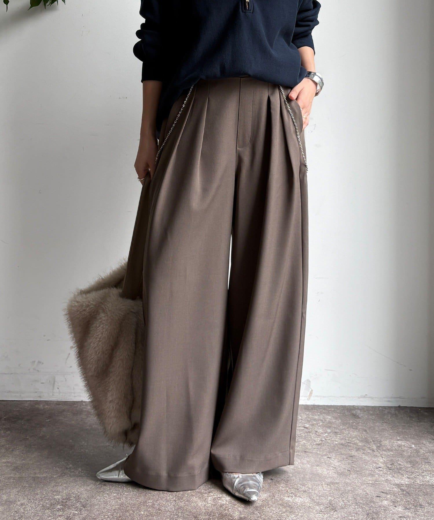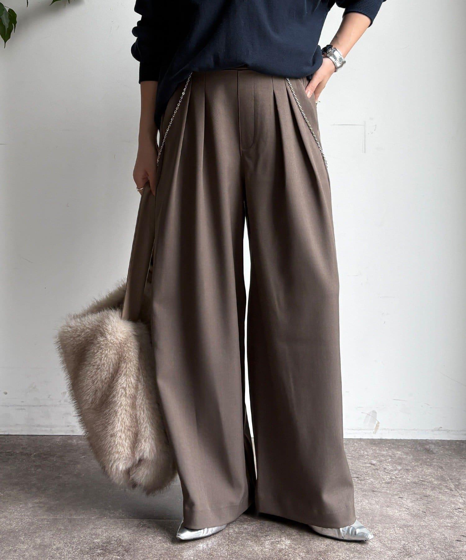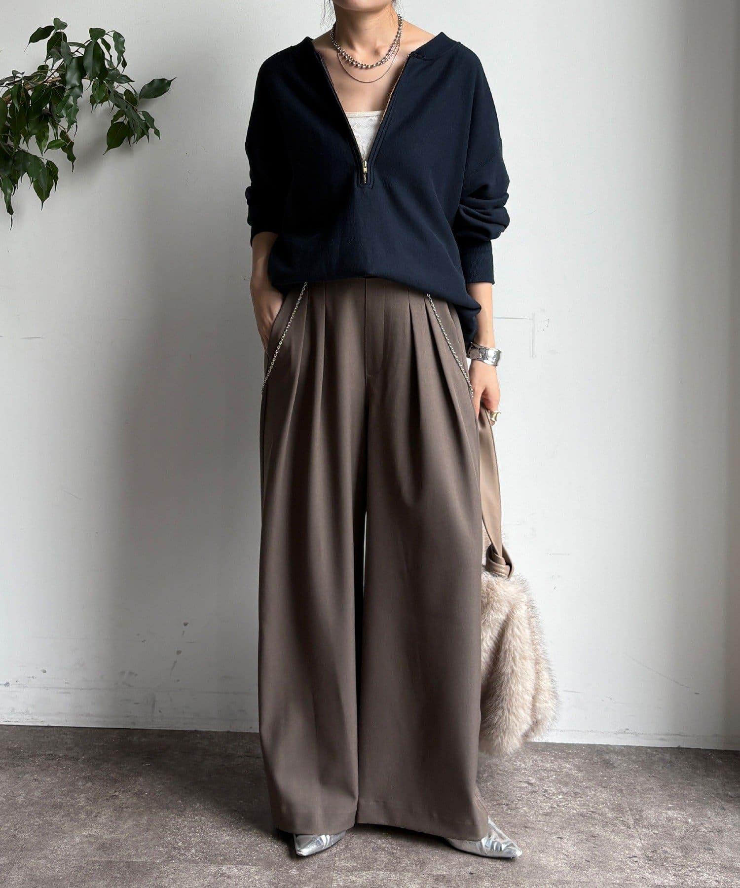 內收式寬鬆長褲同樣具有垂墜效果,但採用了類似混色的面料,使其更適合秋冬風格。