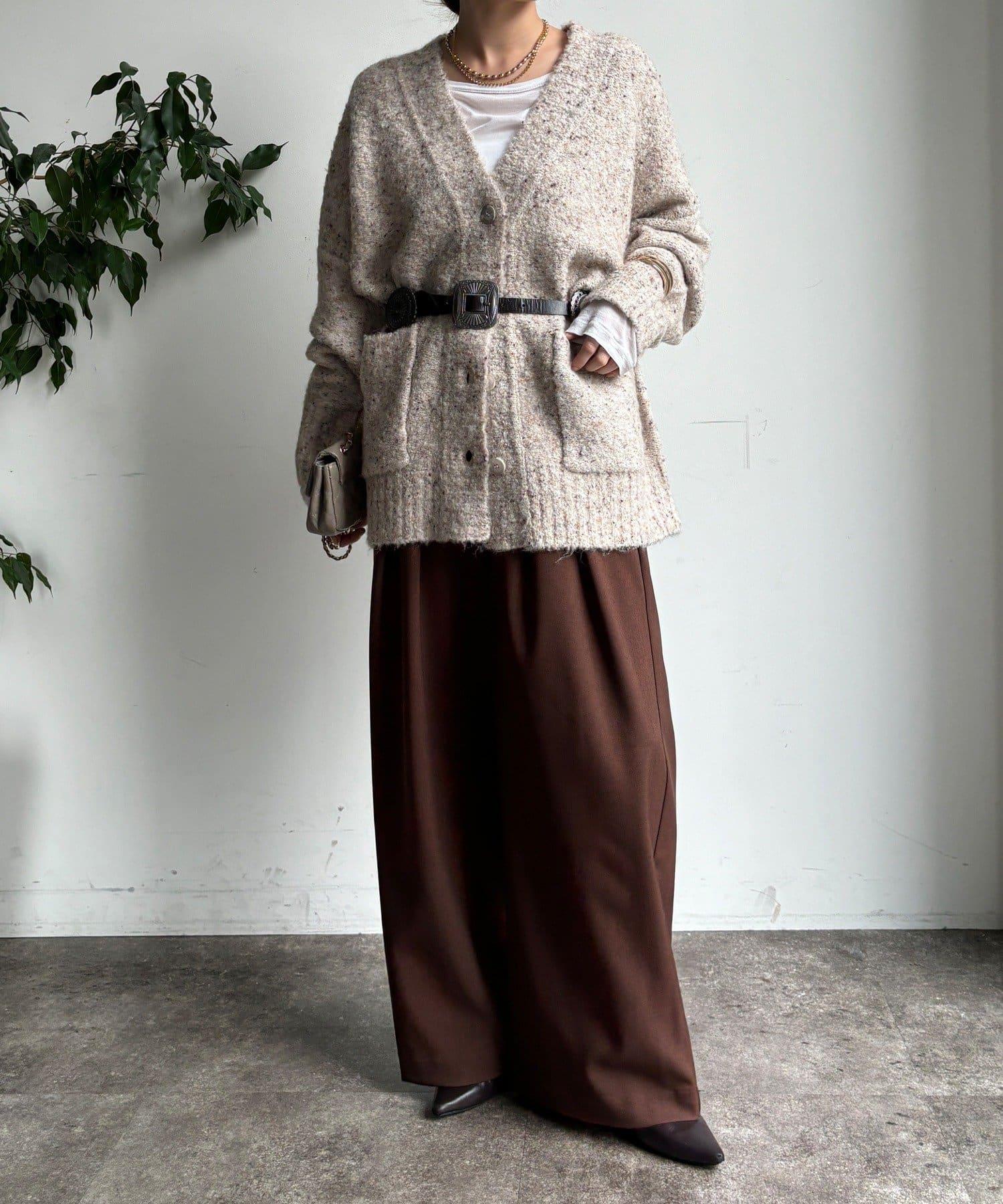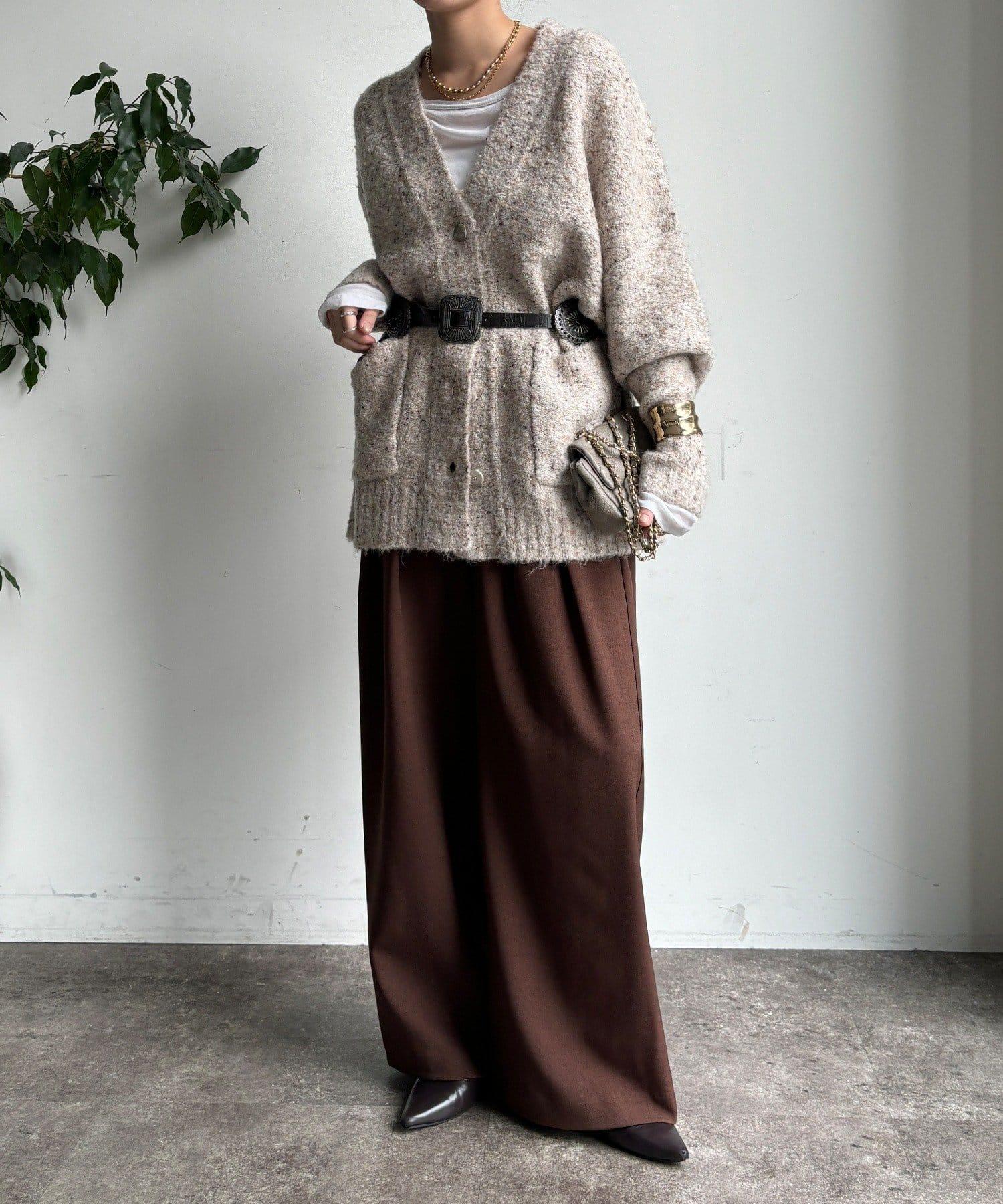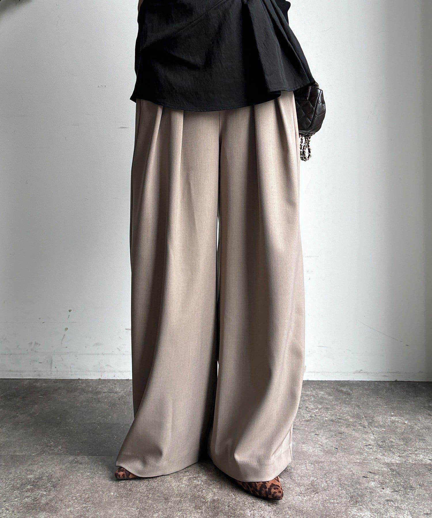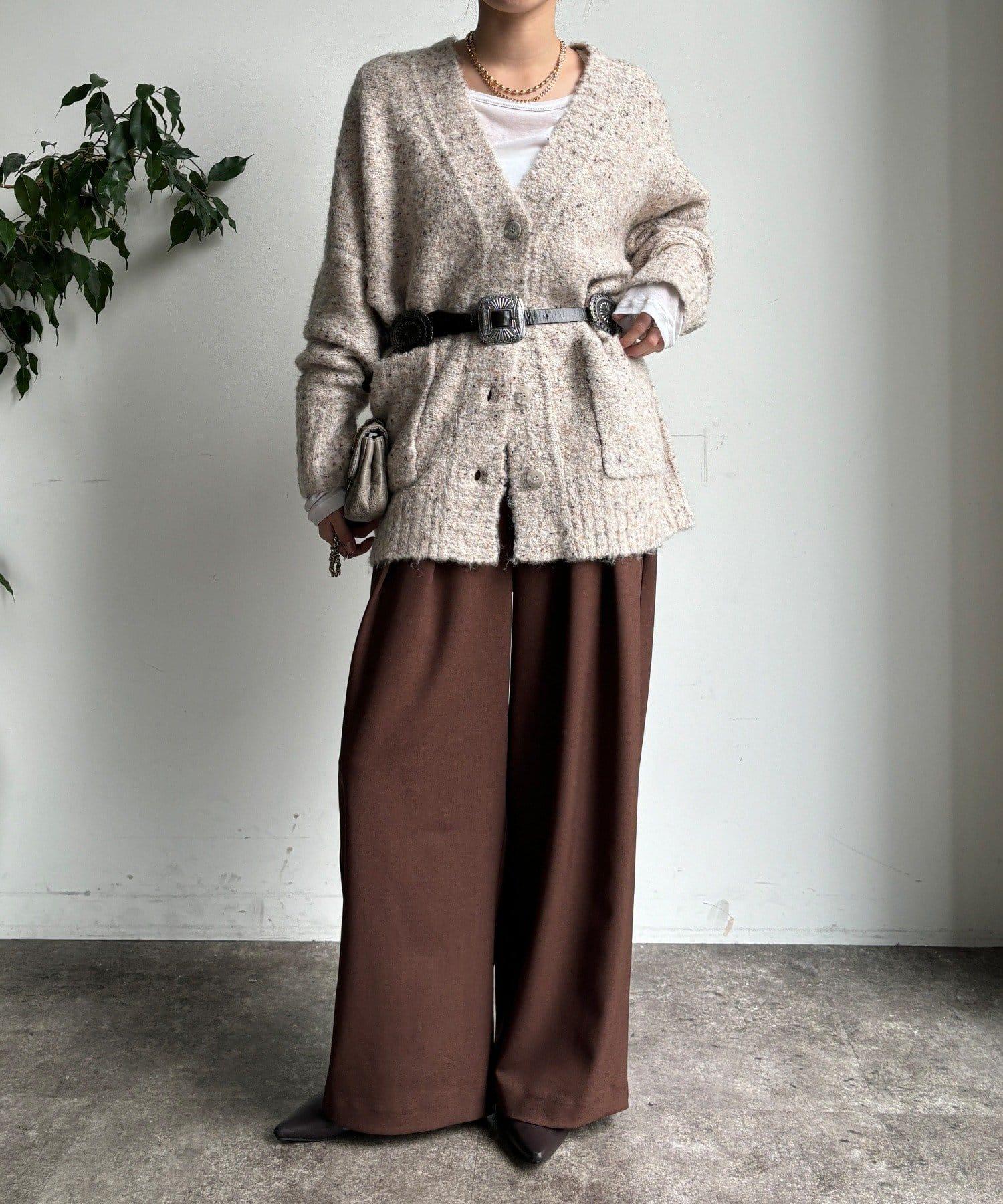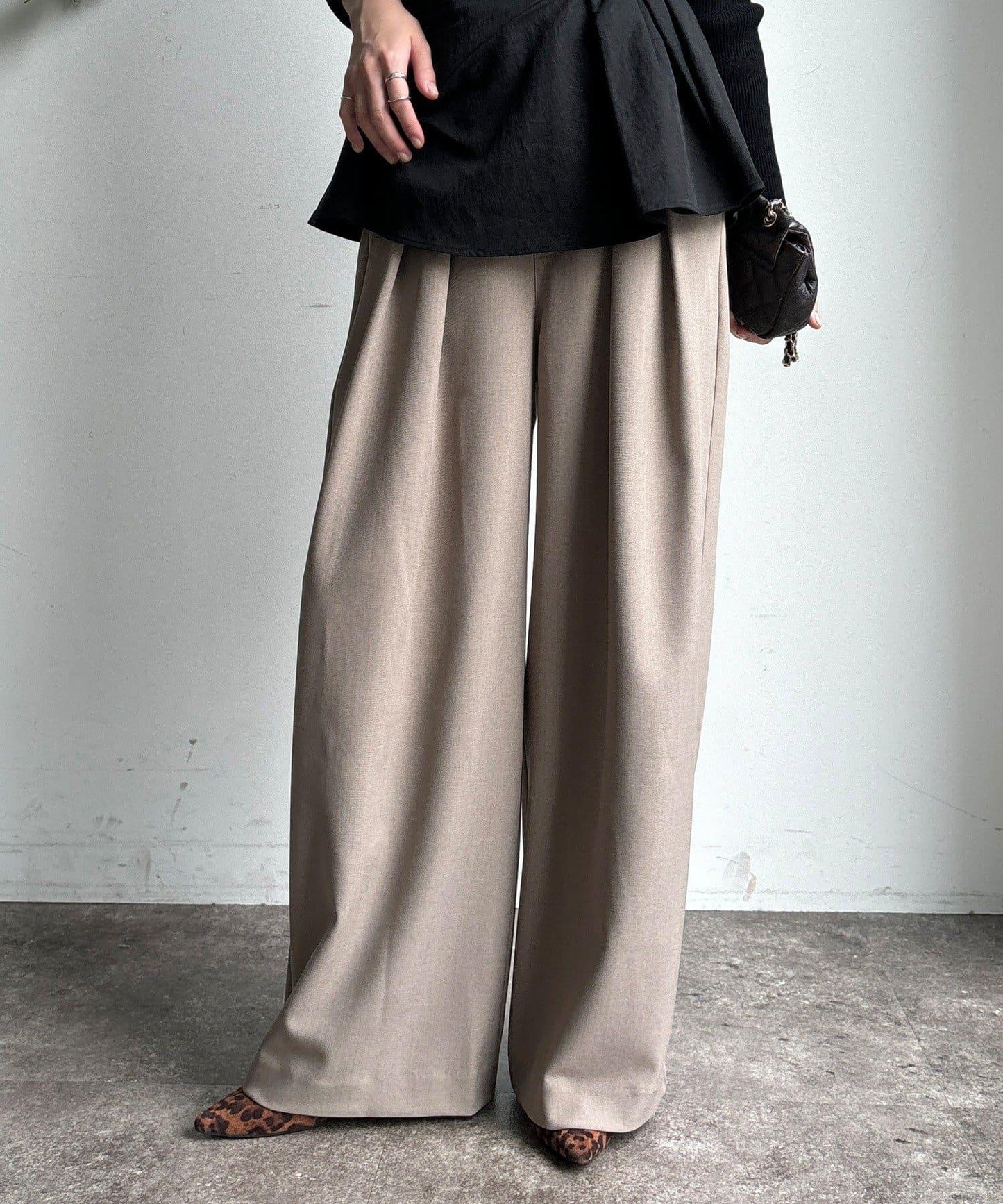 內收式寬鬆長褲同樣具有垂墜效果,但採用了類似混色的面料,使其更適合秋冬風格。