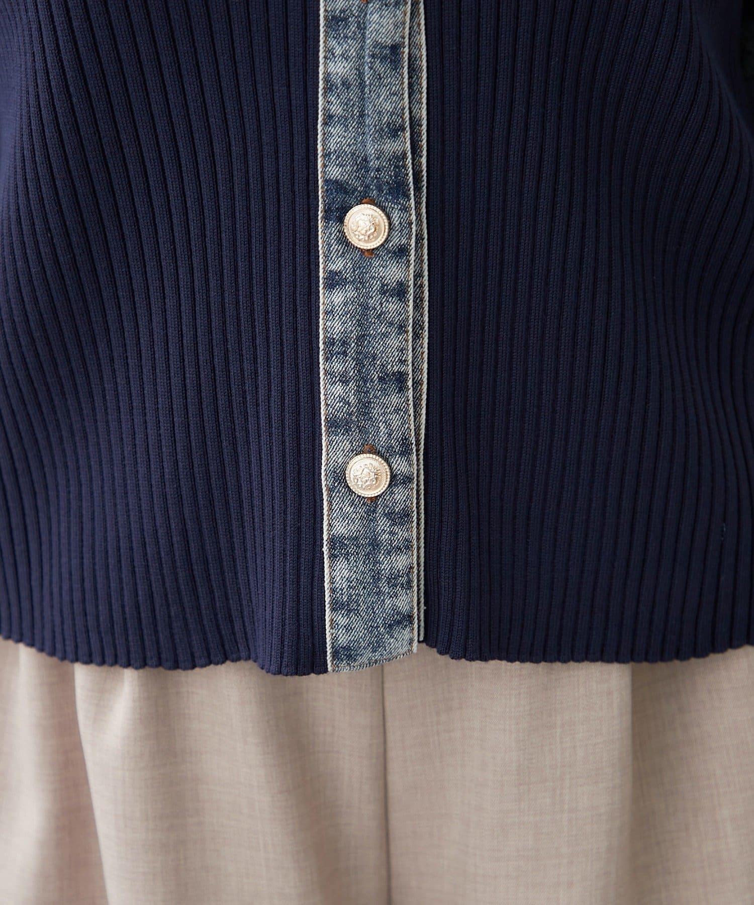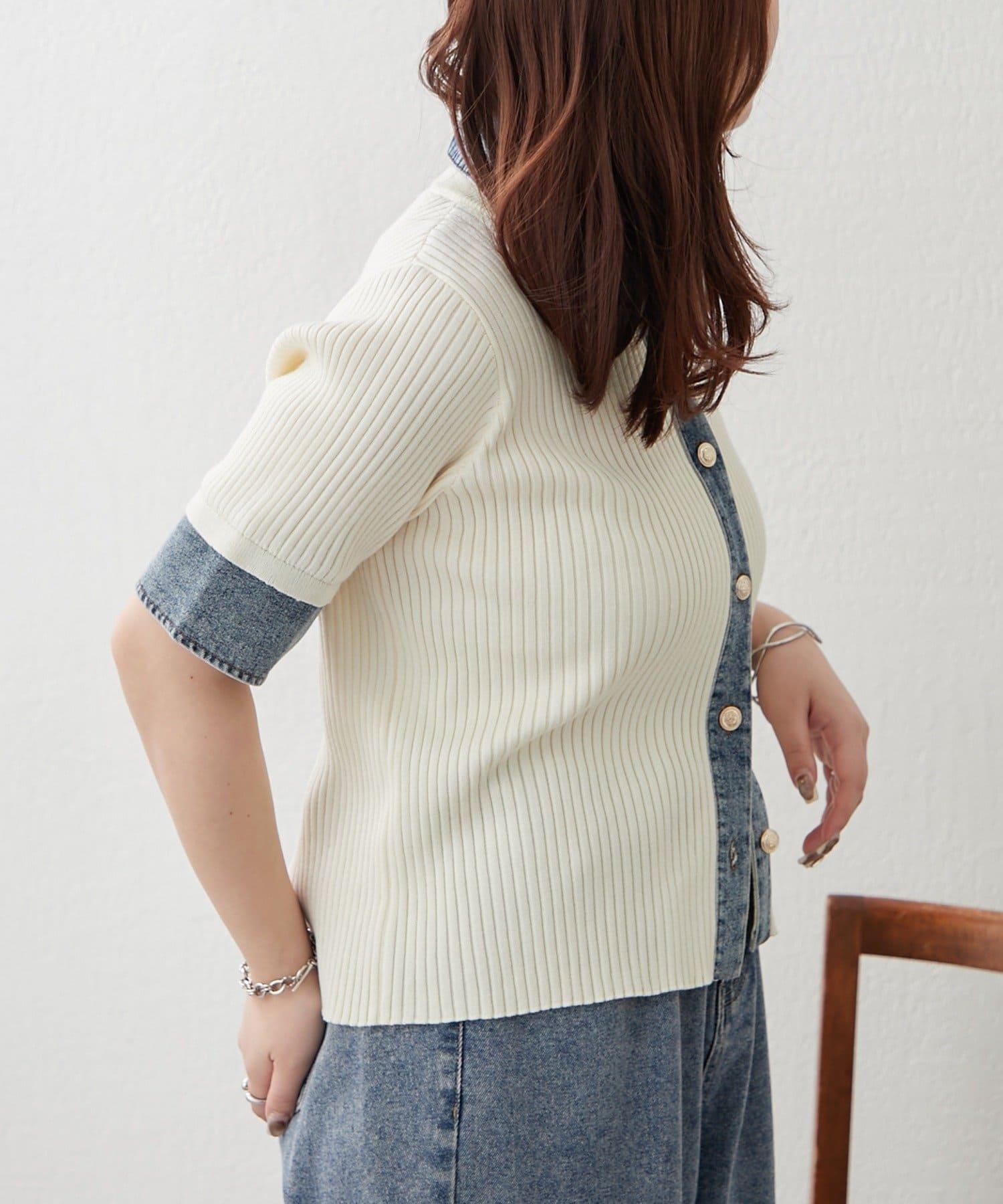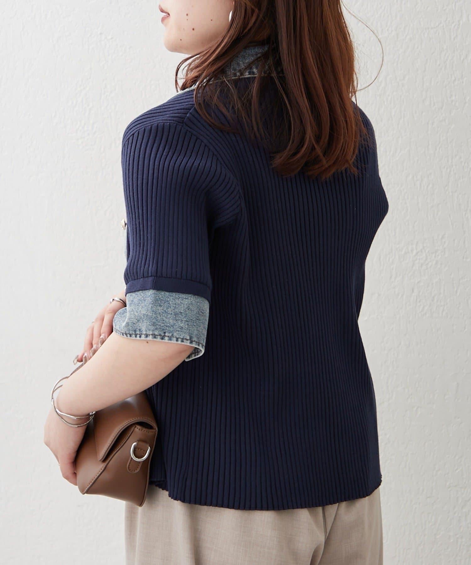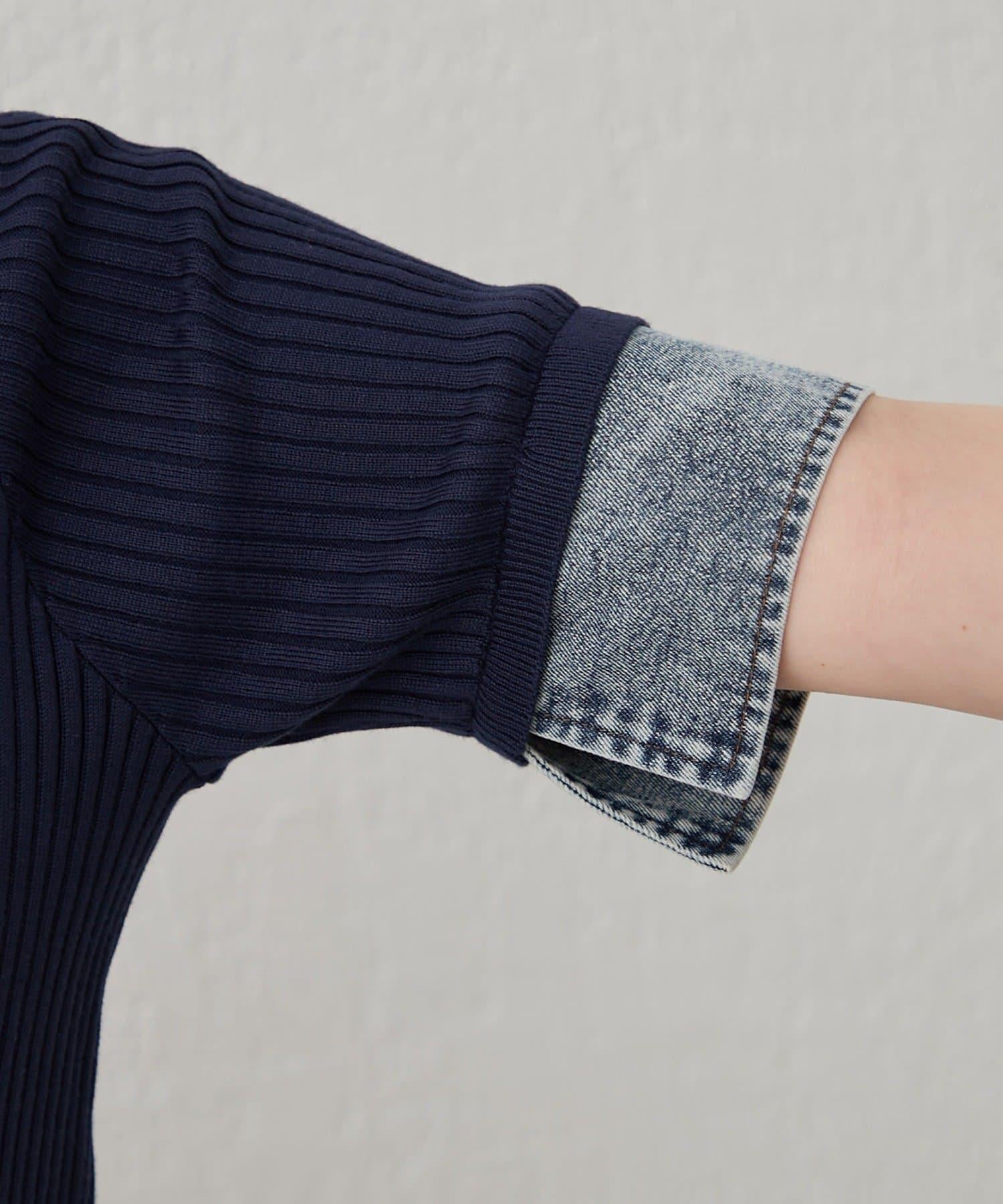 羅紋針織上衣,領口和袖口飾有牛仔布。