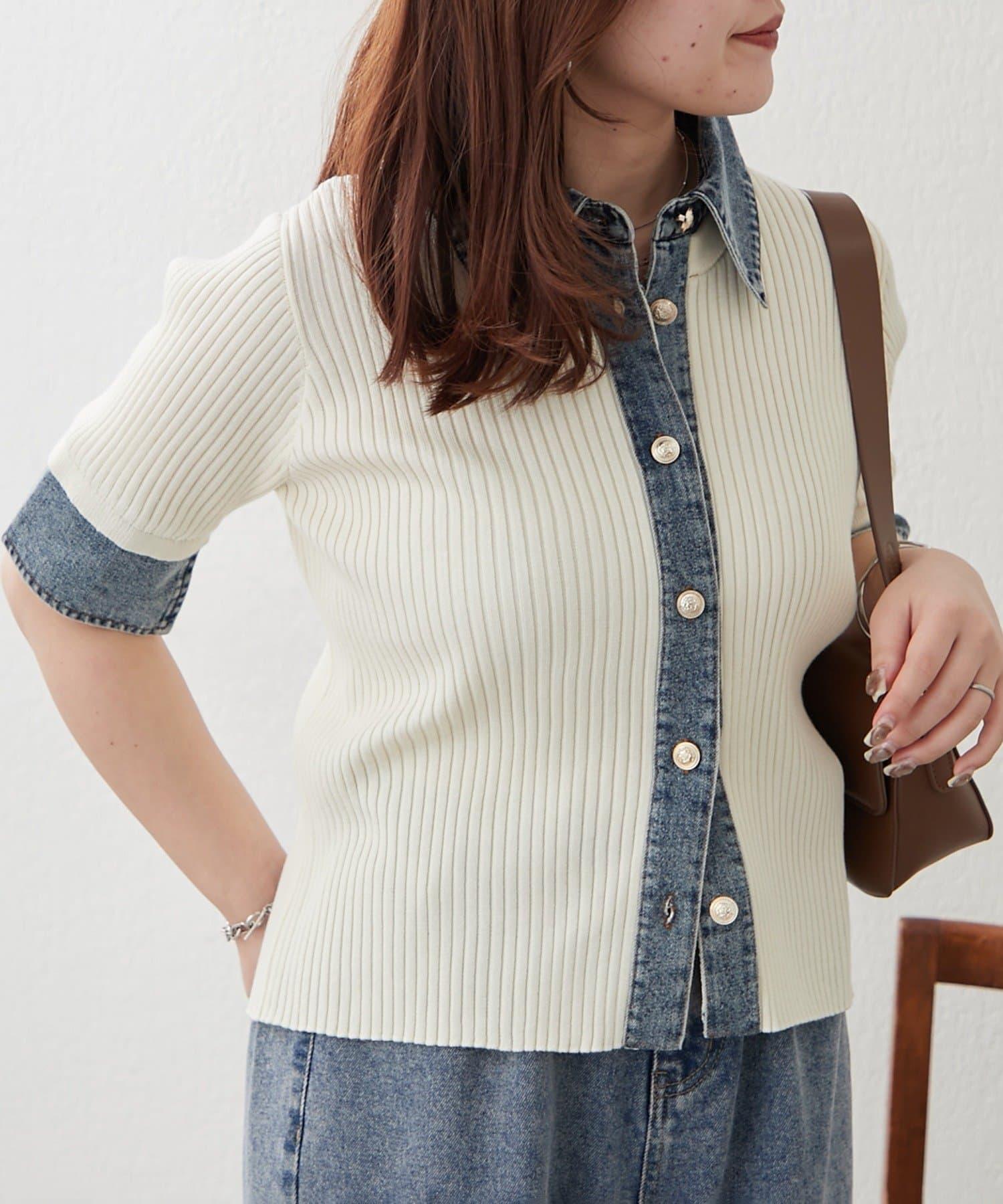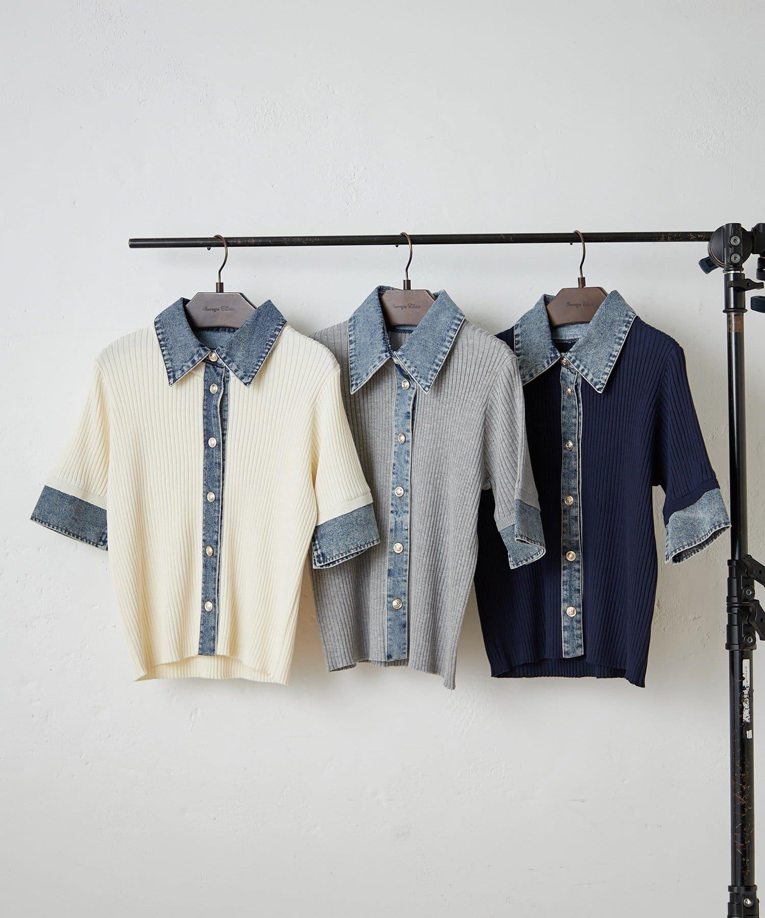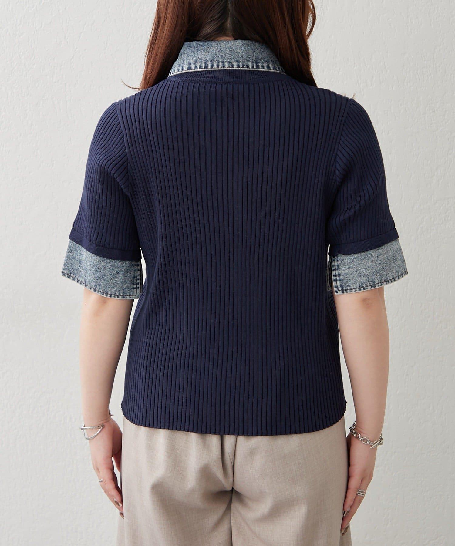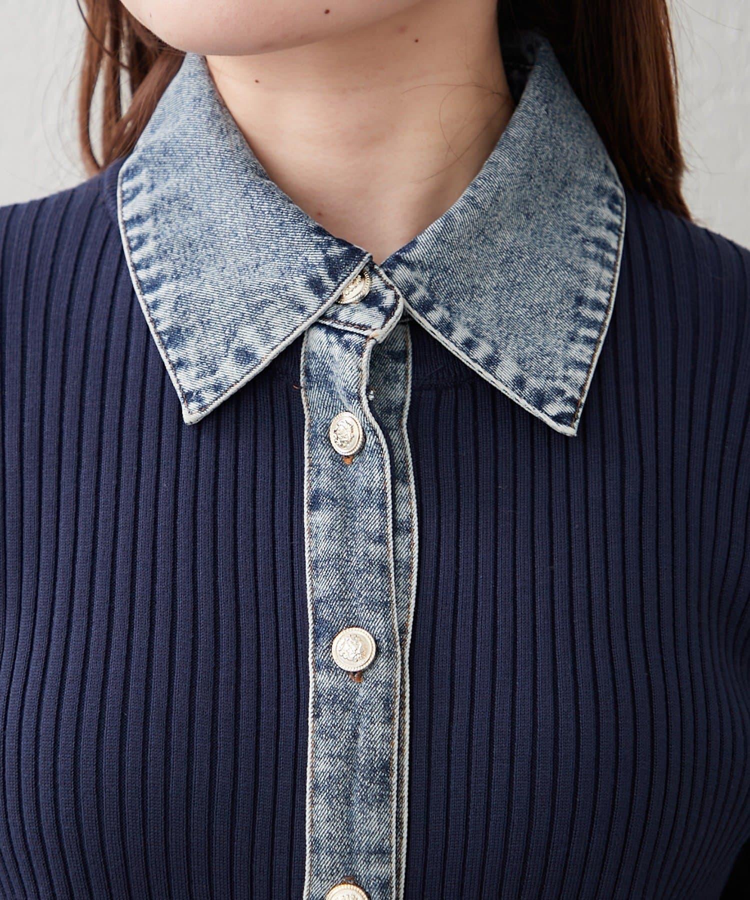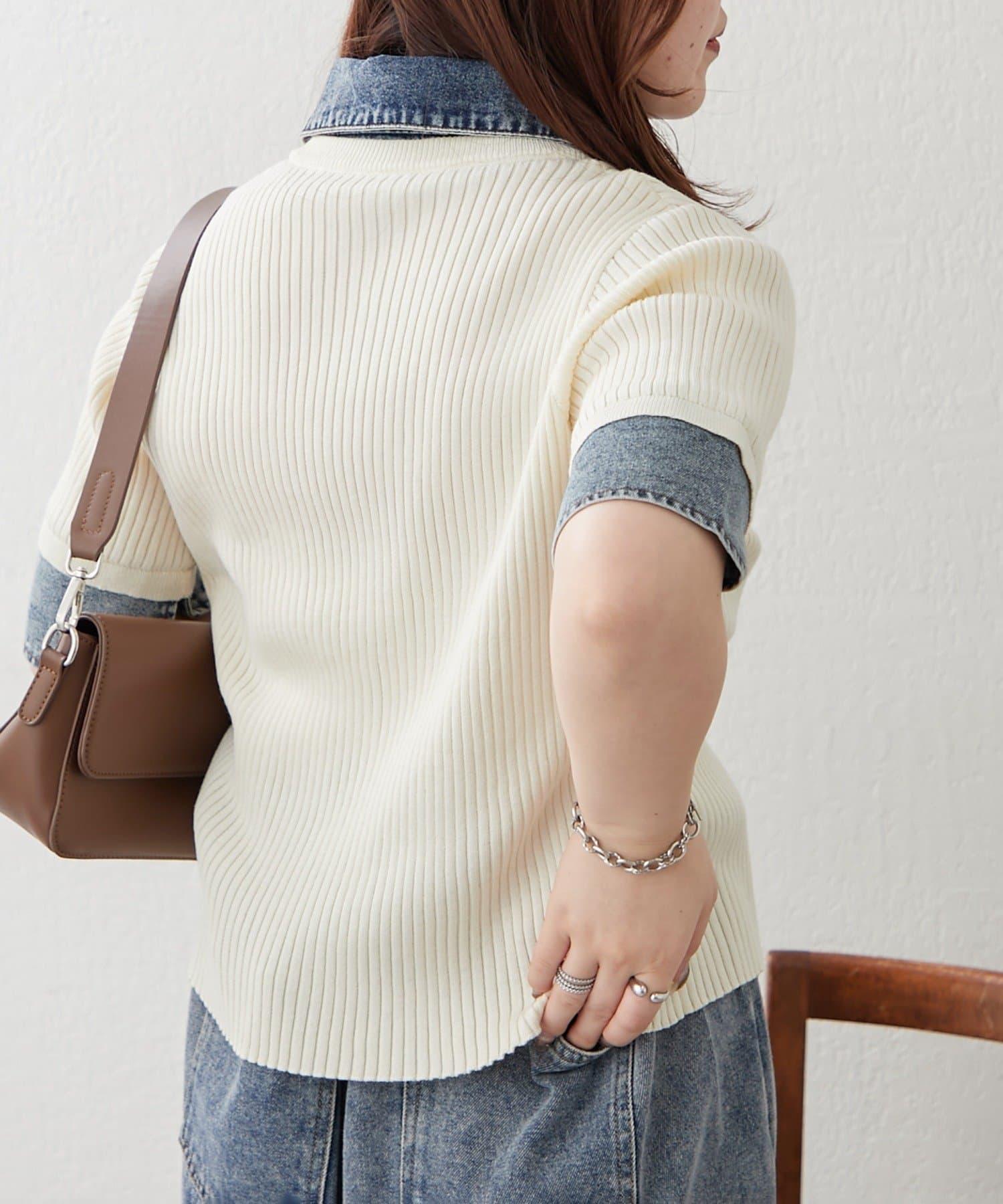 羅紋針織上衣,領口和袖口飾有牛仔布。
