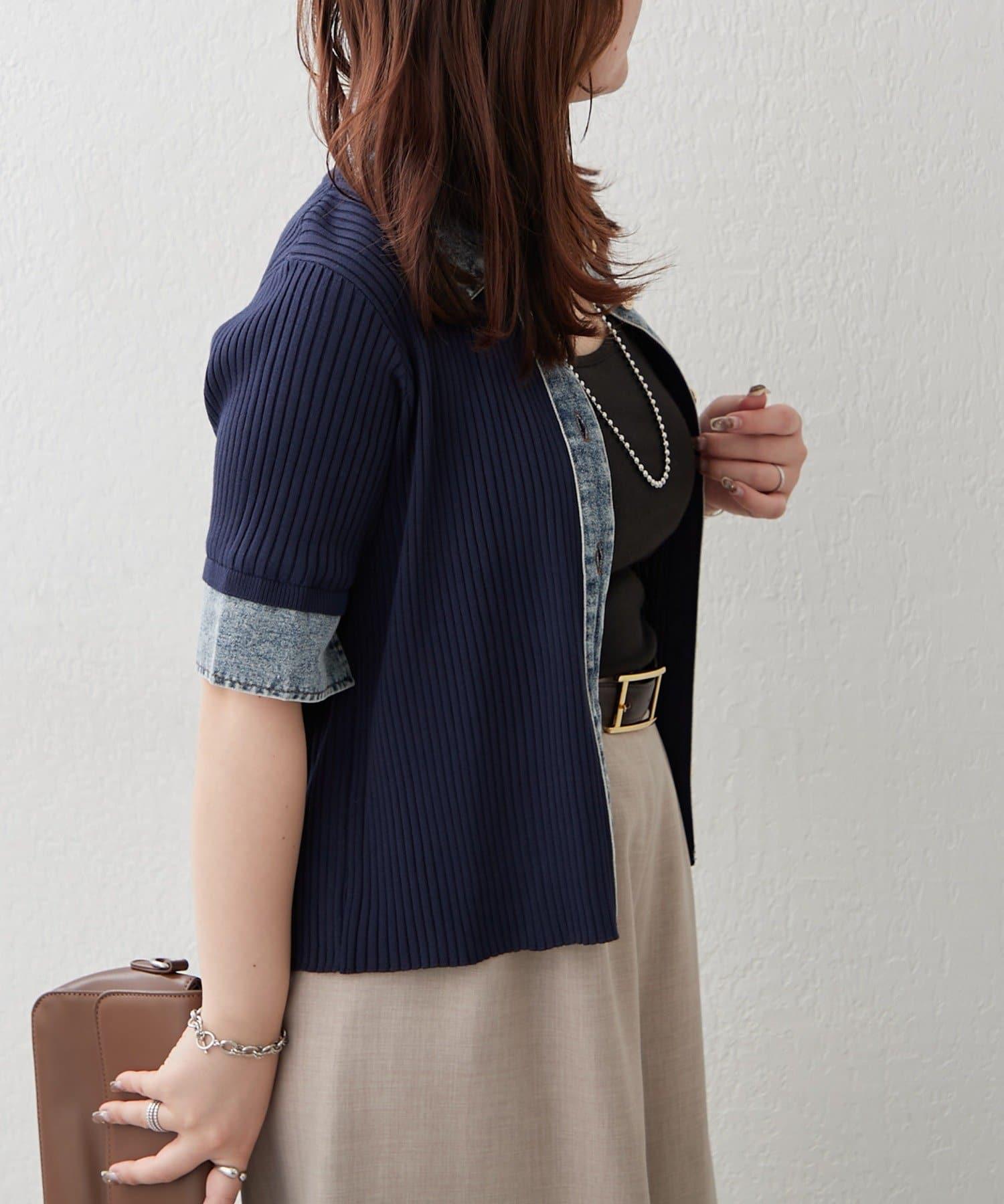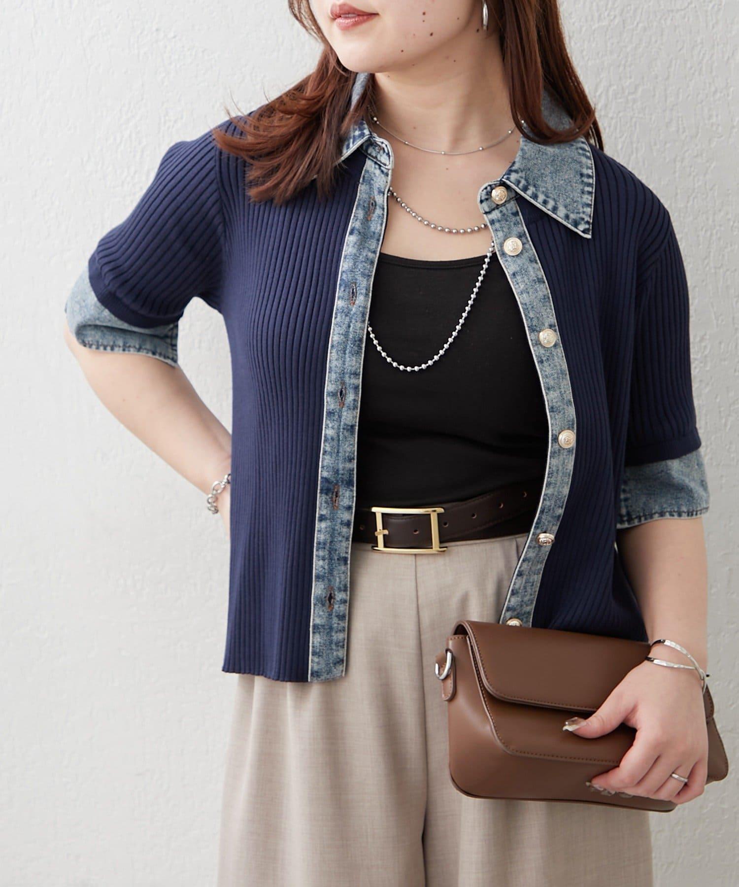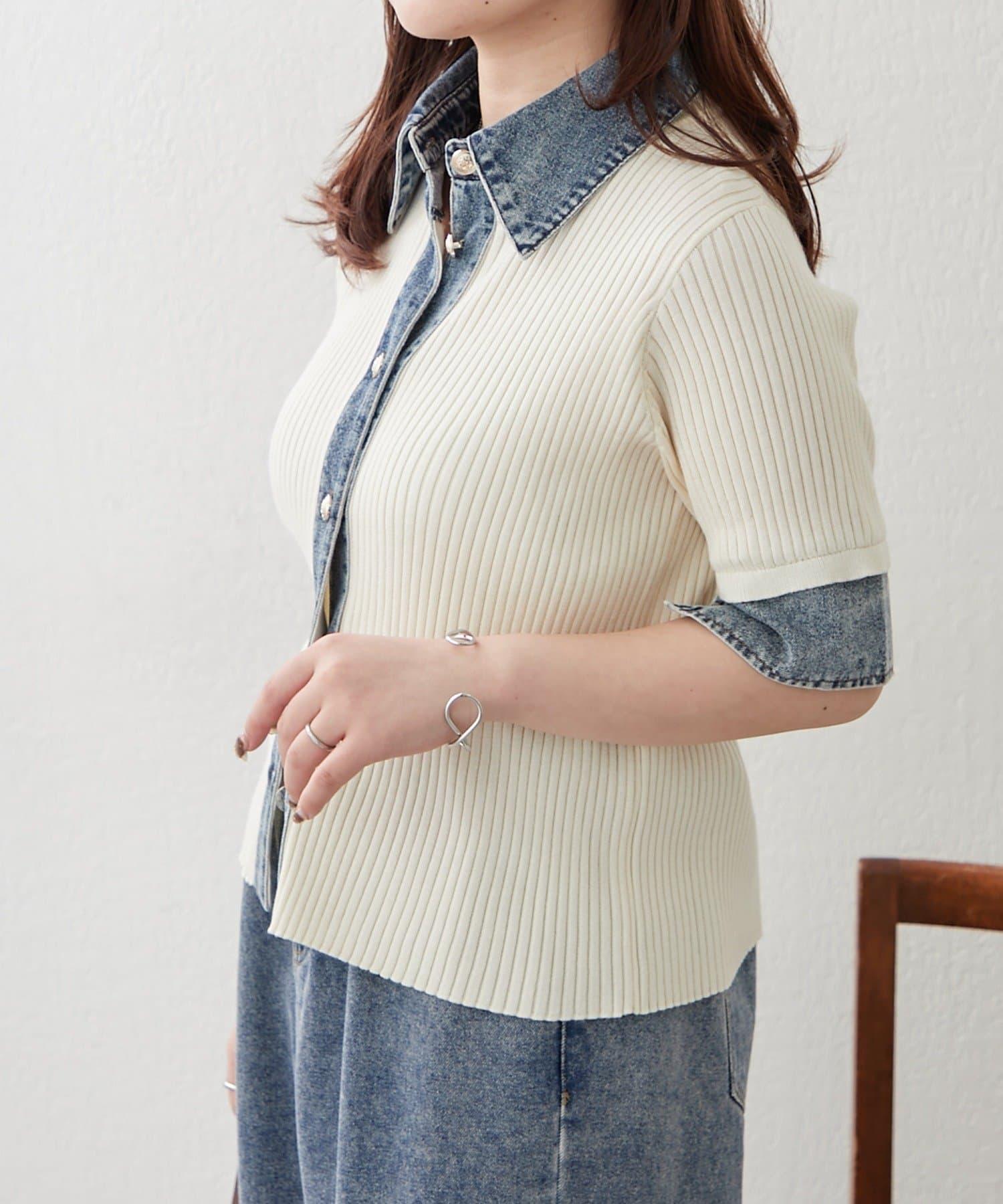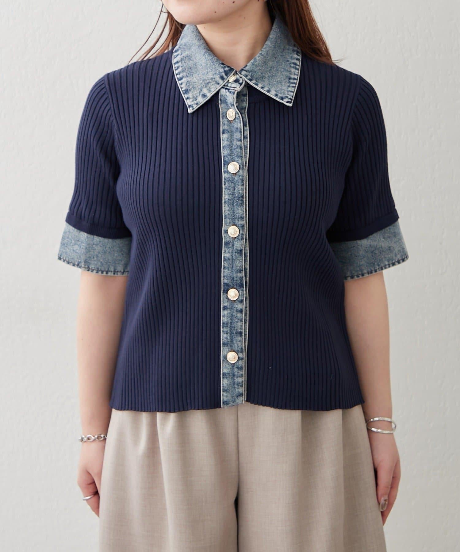 羅紋針織上衣,領口和袖口飾有牛仔布。