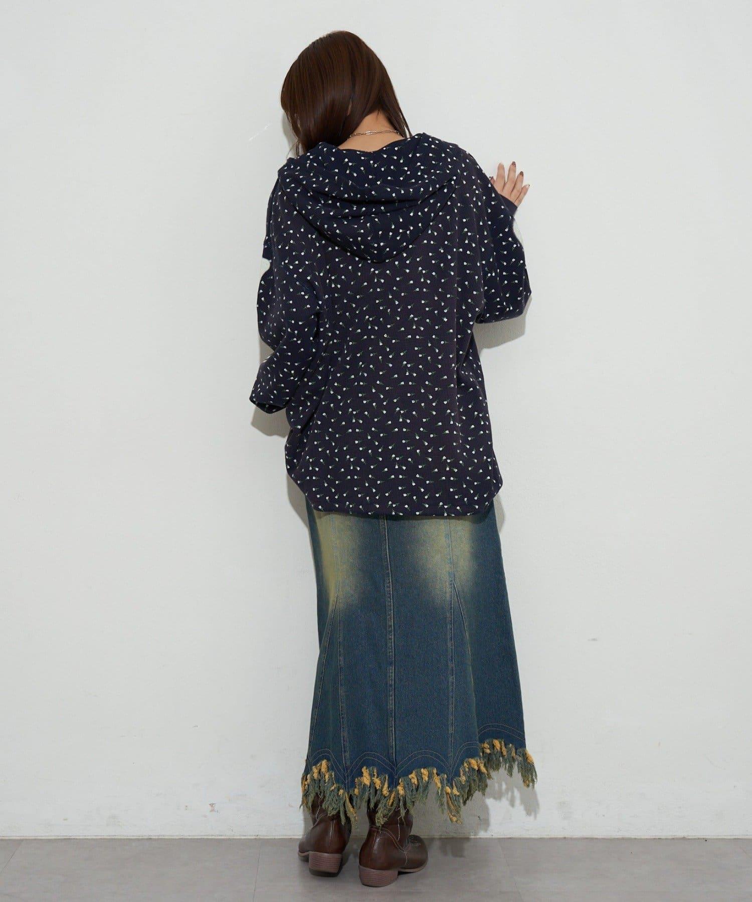 印花從前襟一直延伸至衣袖,破損的表面處理使其看起來古色古香。