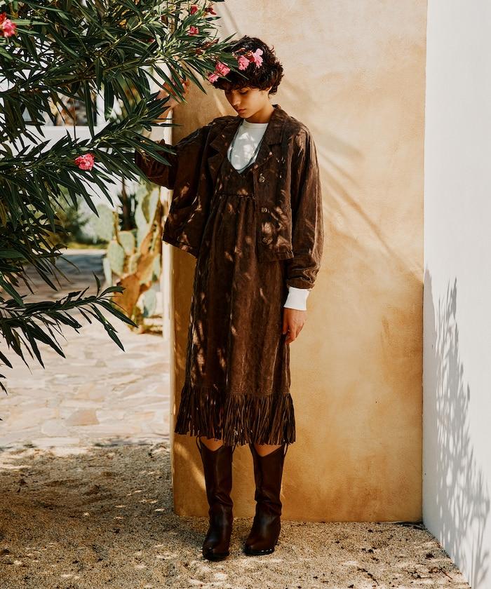 吊帶連衣裙,採用仿麂皮絨面料,打造時髦造型。