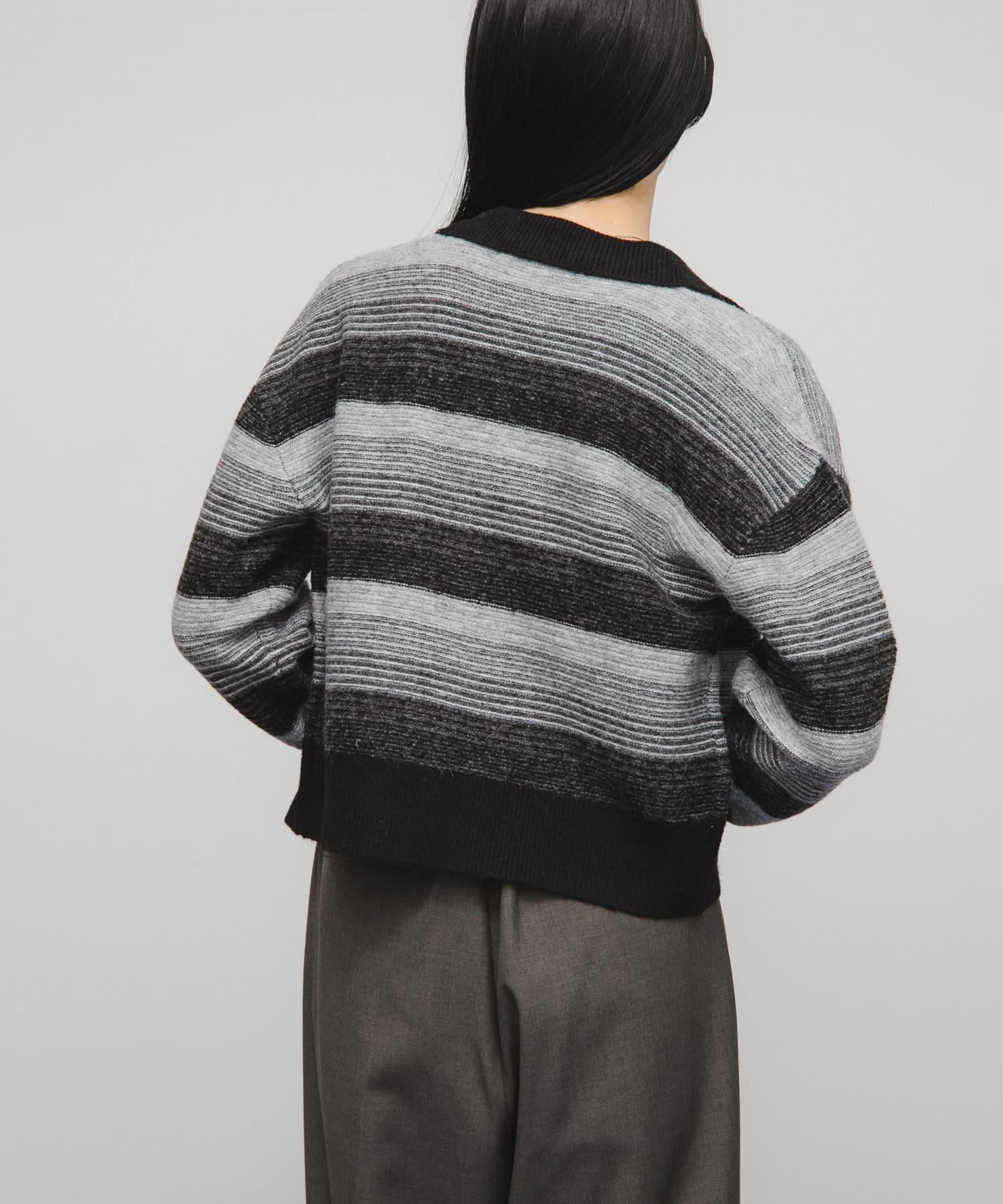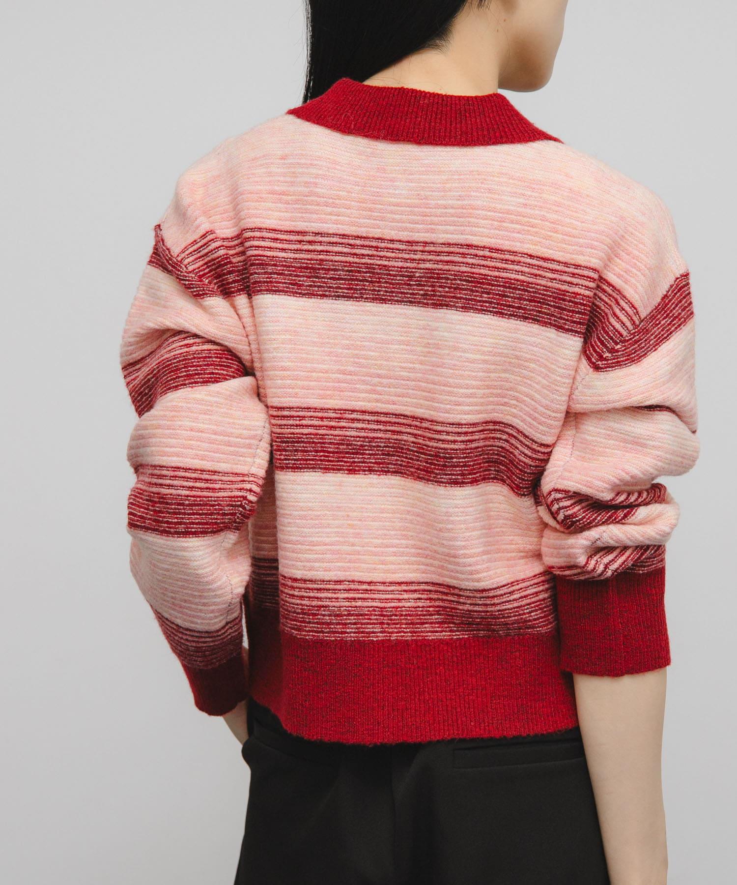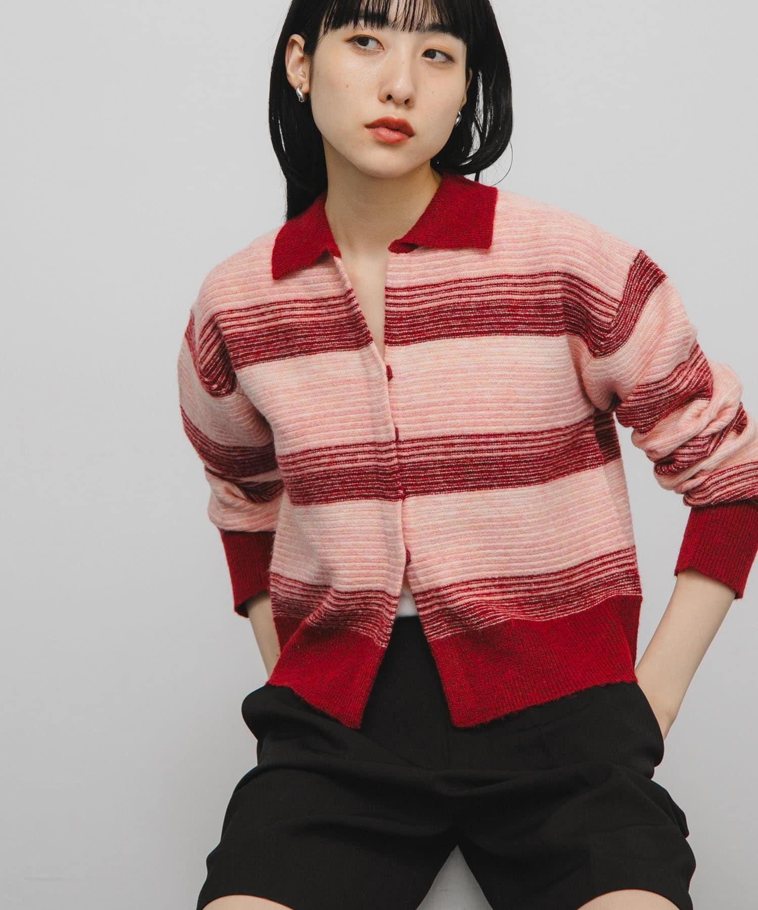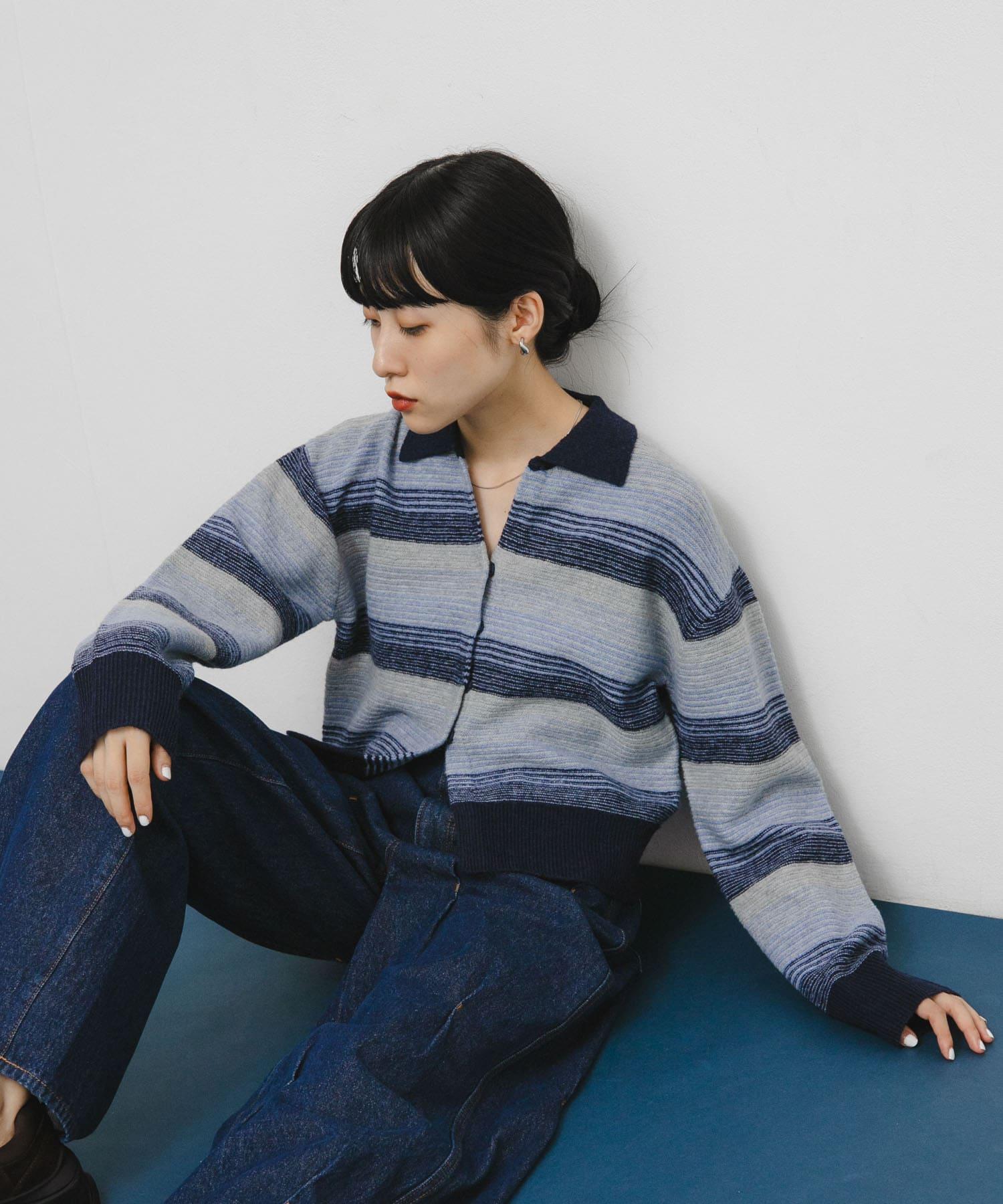 漸變色邊框的開襟羊毛衫給人以強烈的視覺衝擊。鑰匙領設計和開放式下襬使其看起來簡潔、寬鬆。RIB 雙色領口、袖口和下襬也是關鍵點。建議搭配寬鬆長褲穿著。