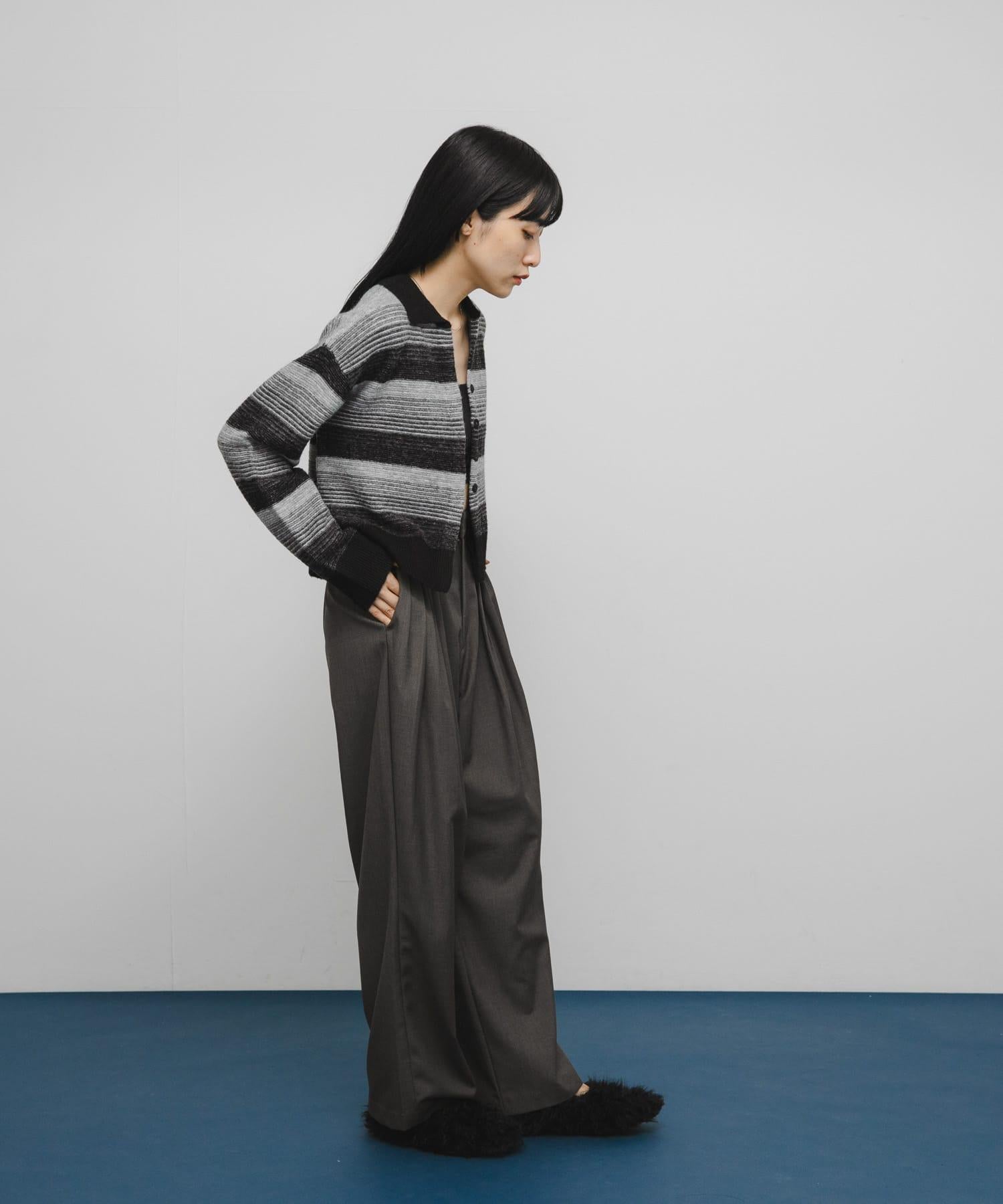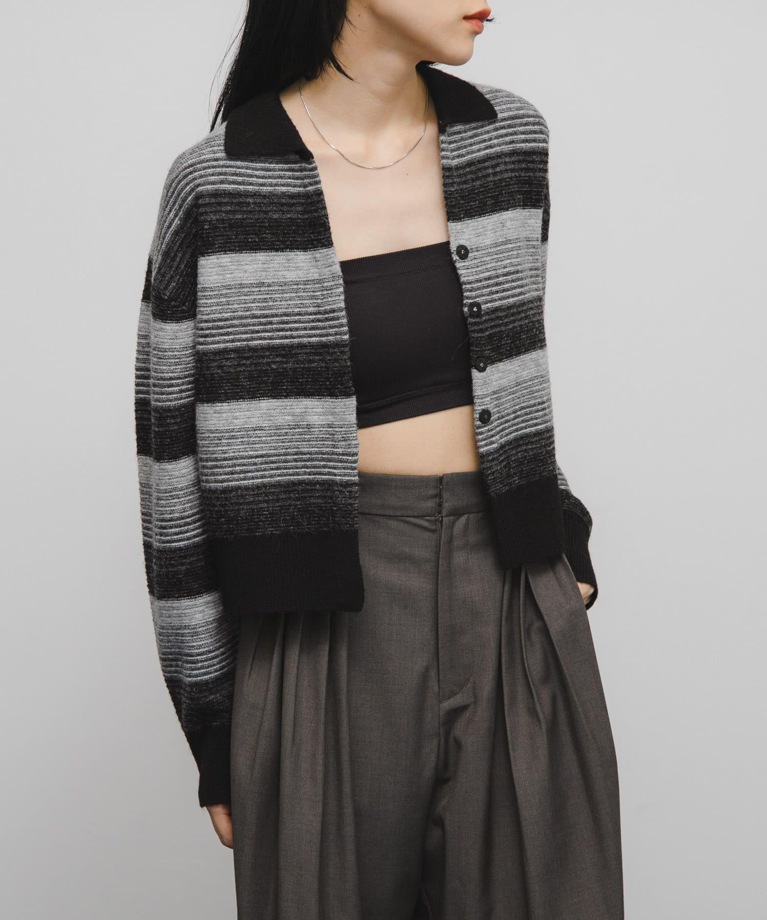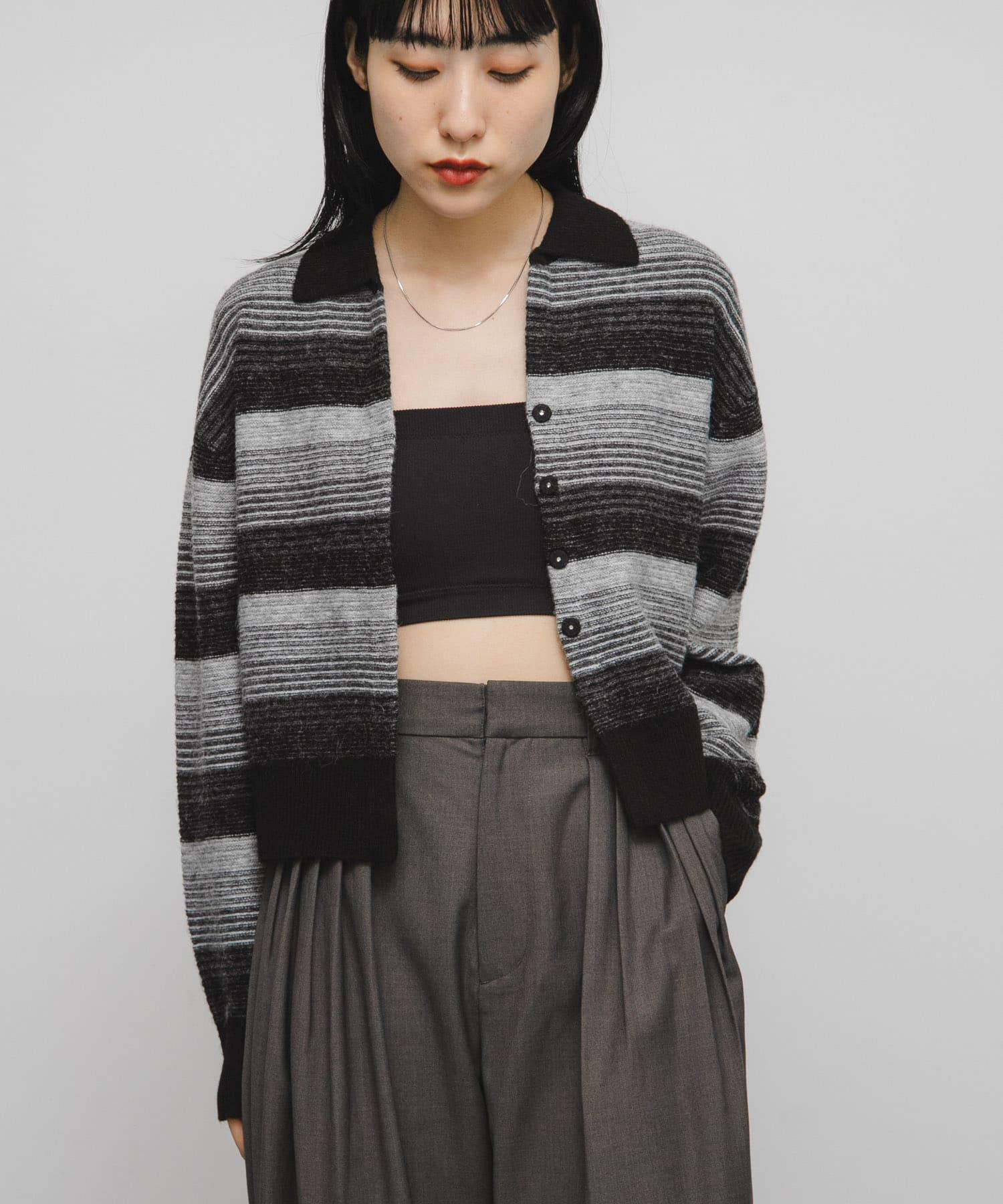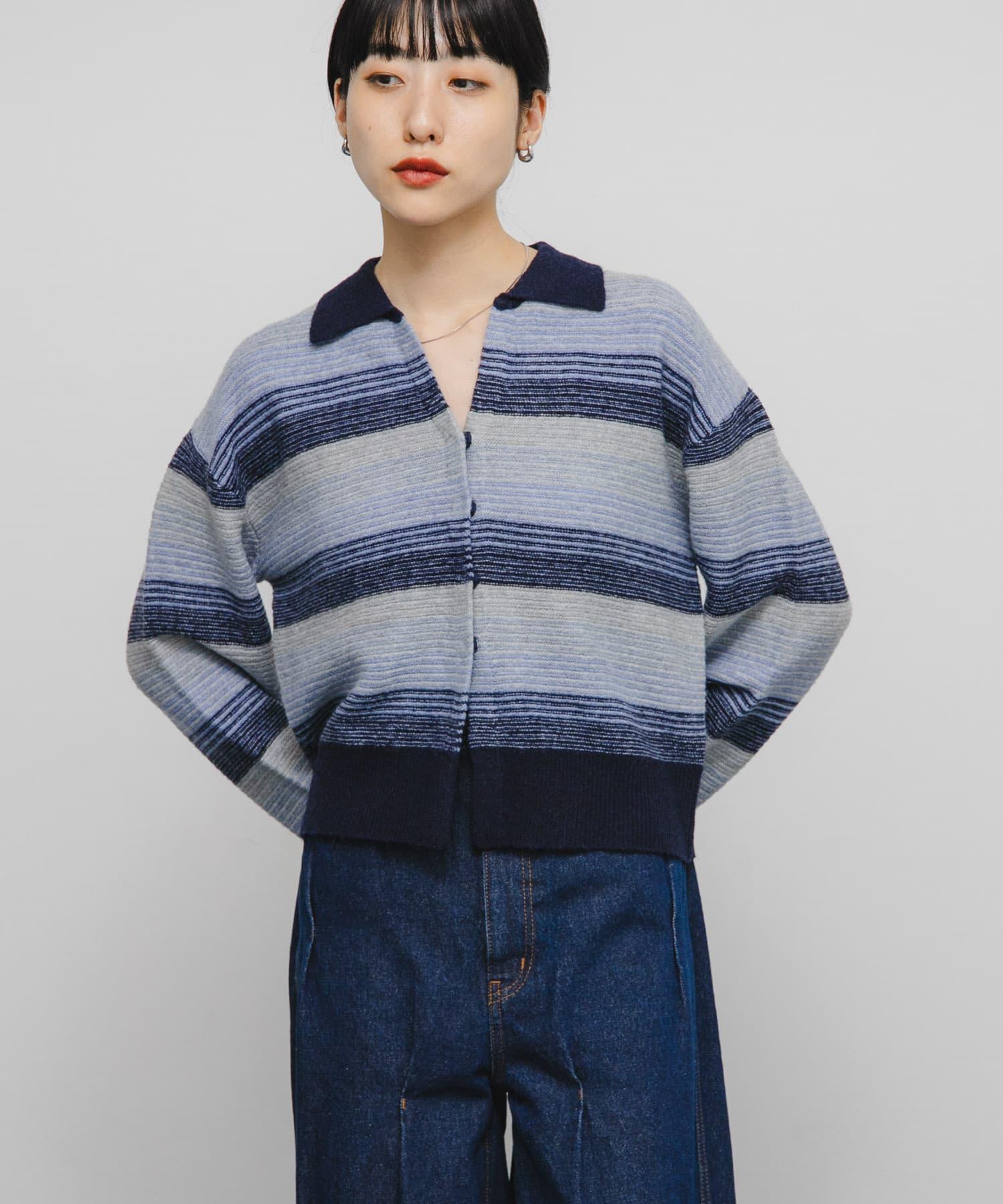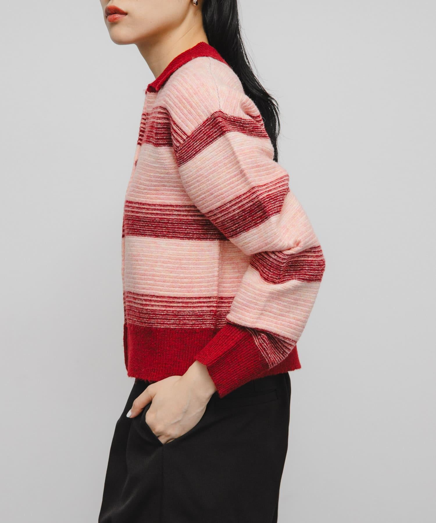 漸變色邊框的開襟羊毛衫給人以強烈的視覺衝擊。鑰匙領設計和開放式下襬使其看起來簡潔、寬鬆。RIB 雙色領口、袖口和下襬也是關鍵點。建議搭配寬鬆長褲穿著。