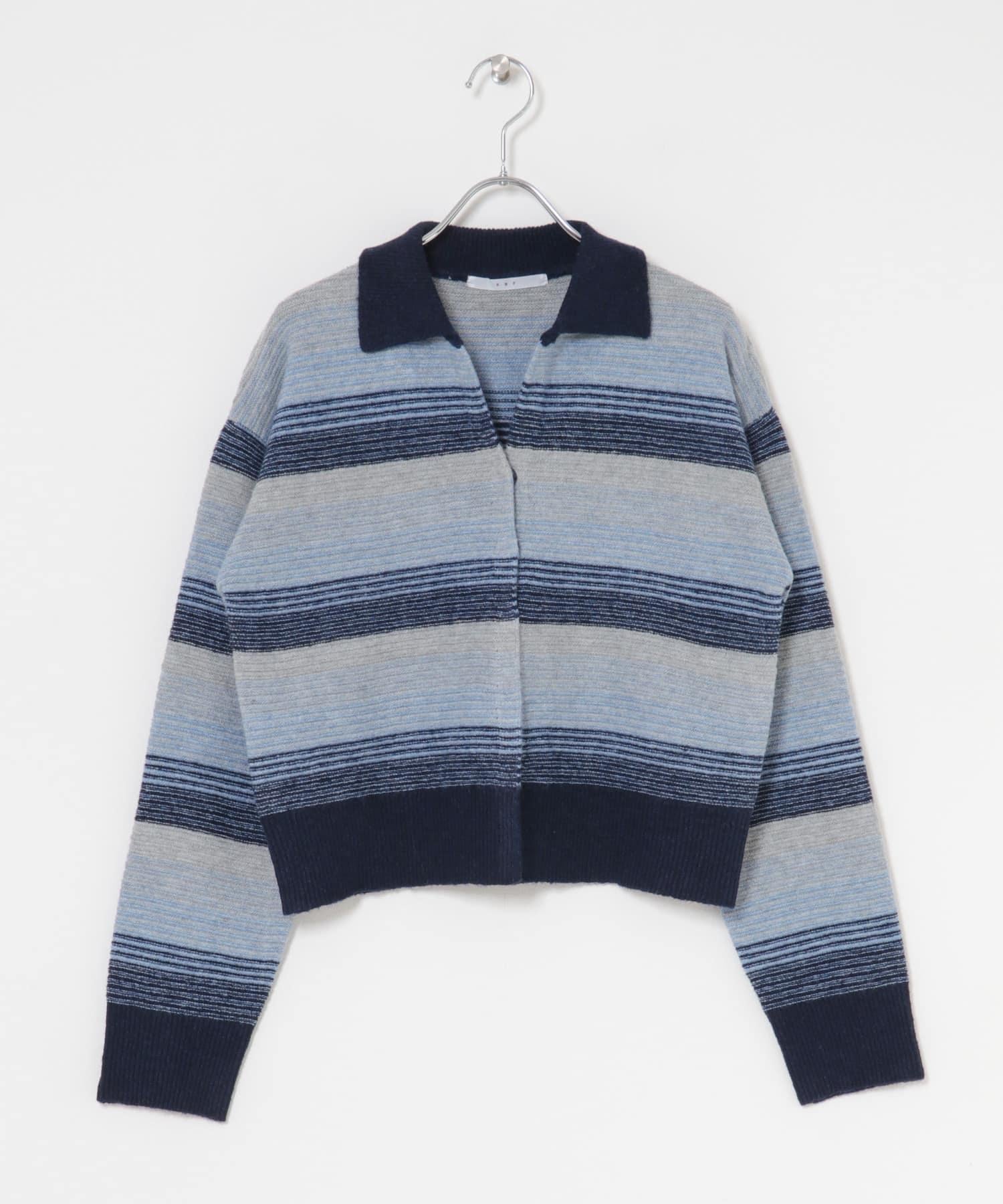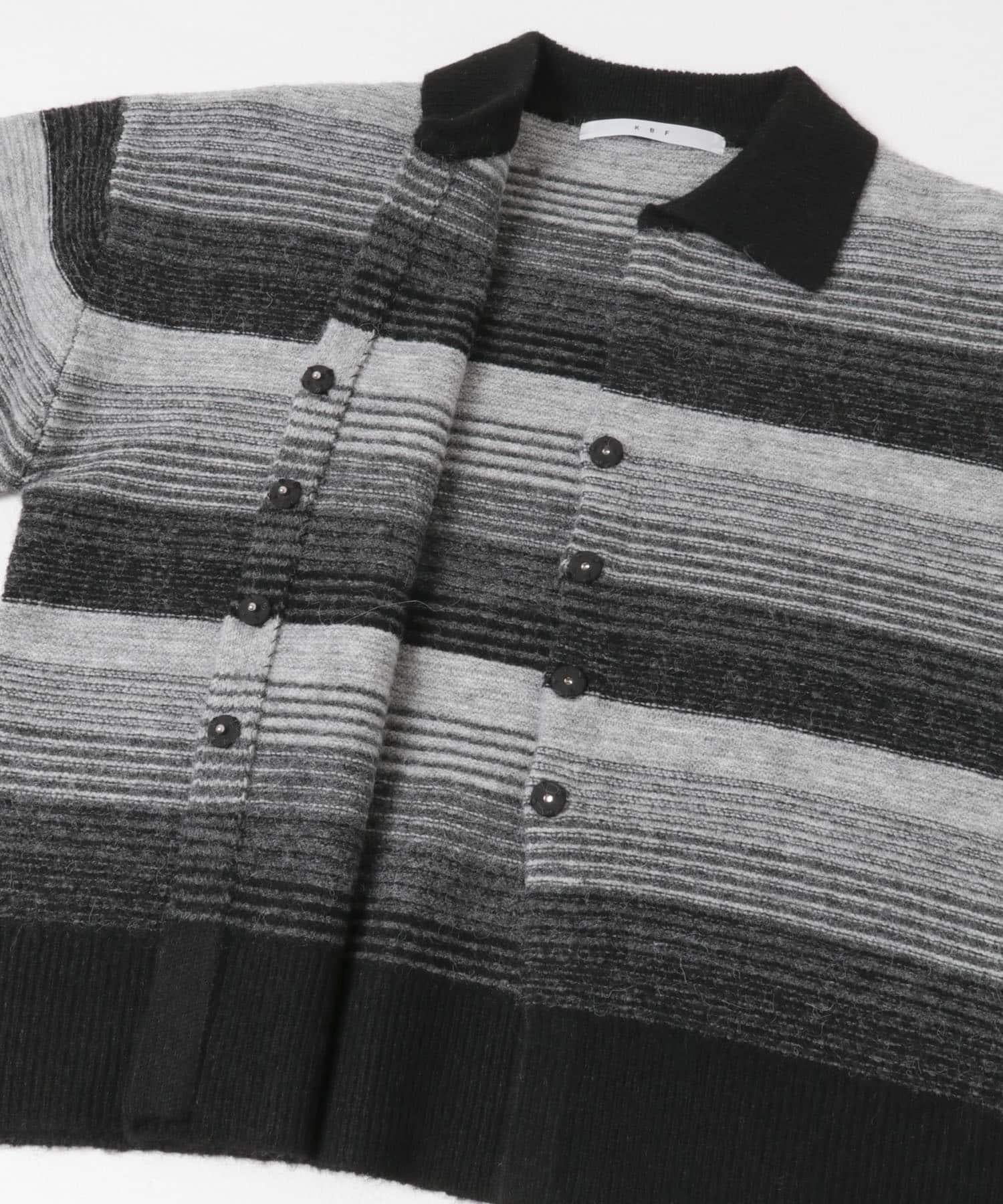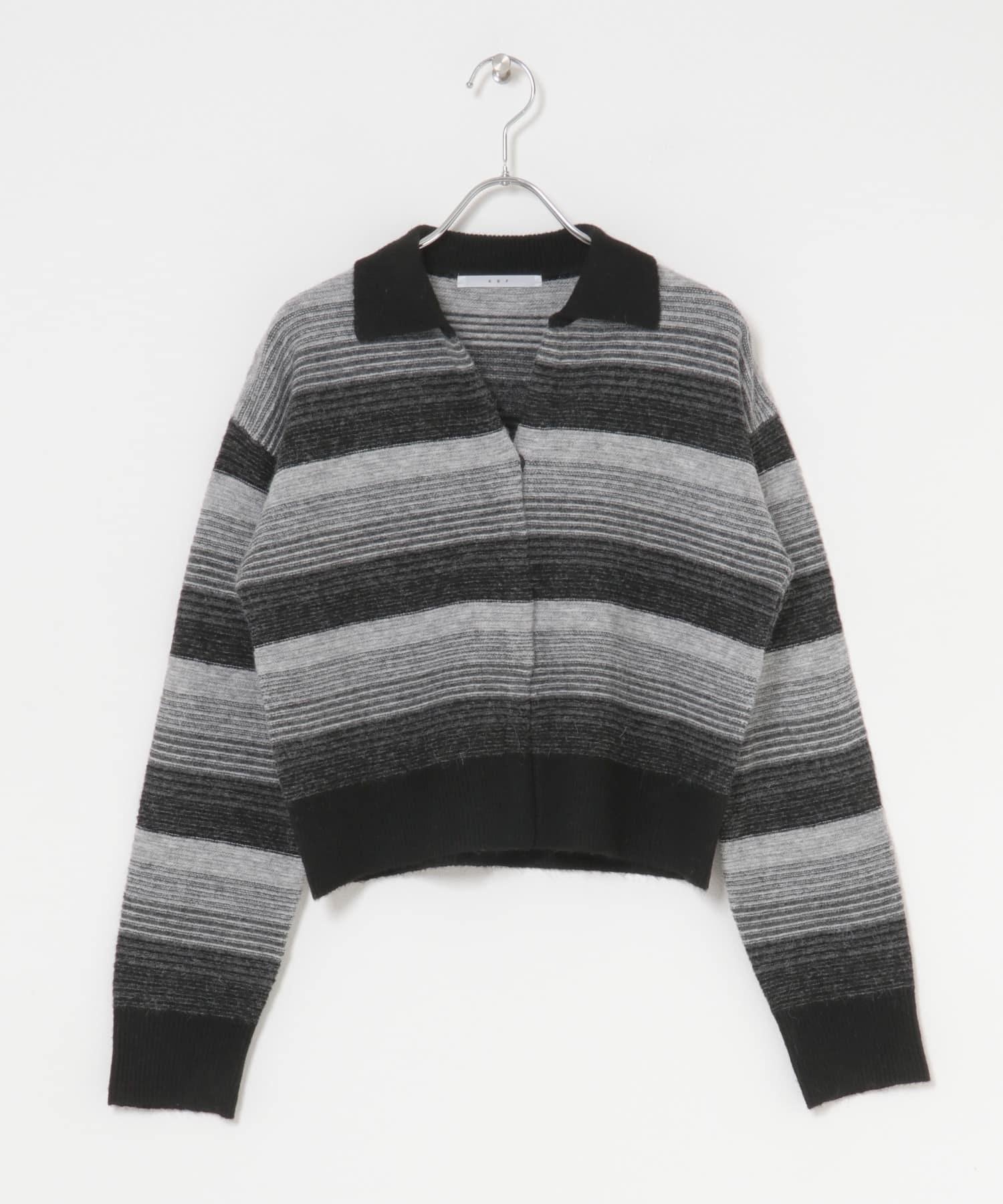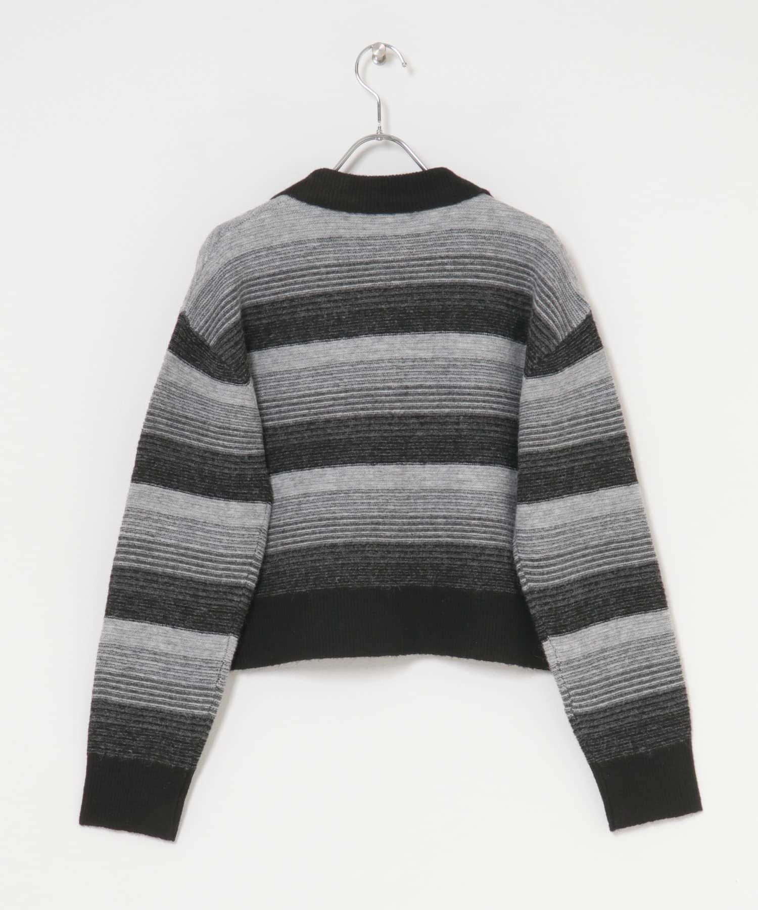 漸變色邊框的開襟羊毛衫給人以強烈的視覺衝擊。鑰匙領設計和開放式下襬使其看起來簡潔、寬鬆。RIB 雙色領口、袖口和下襬也是關鍵點。建議搭配寬鬆長褲穿著。