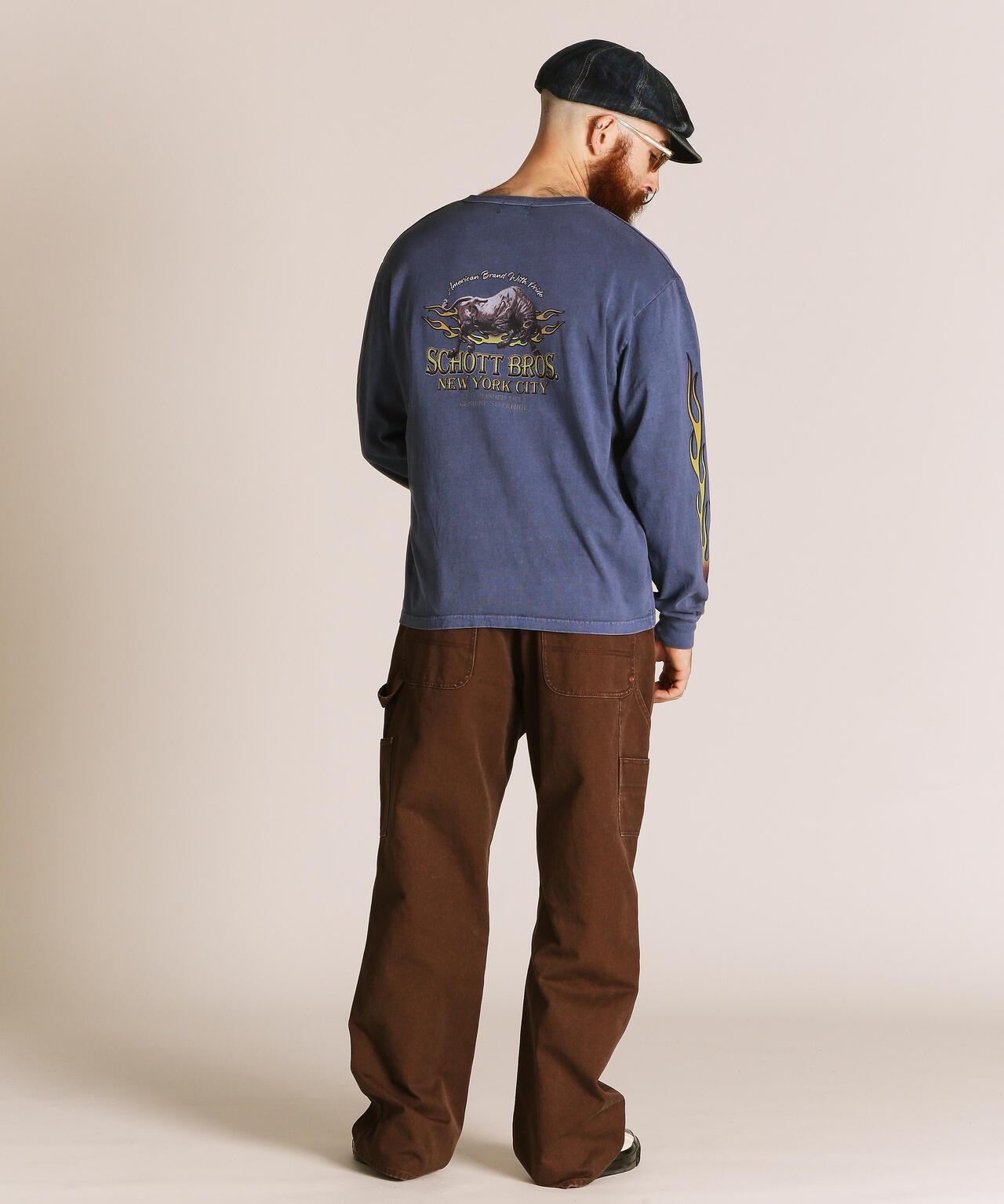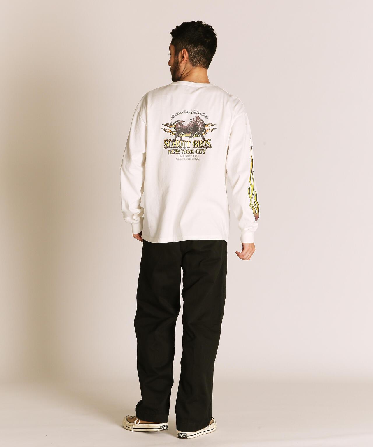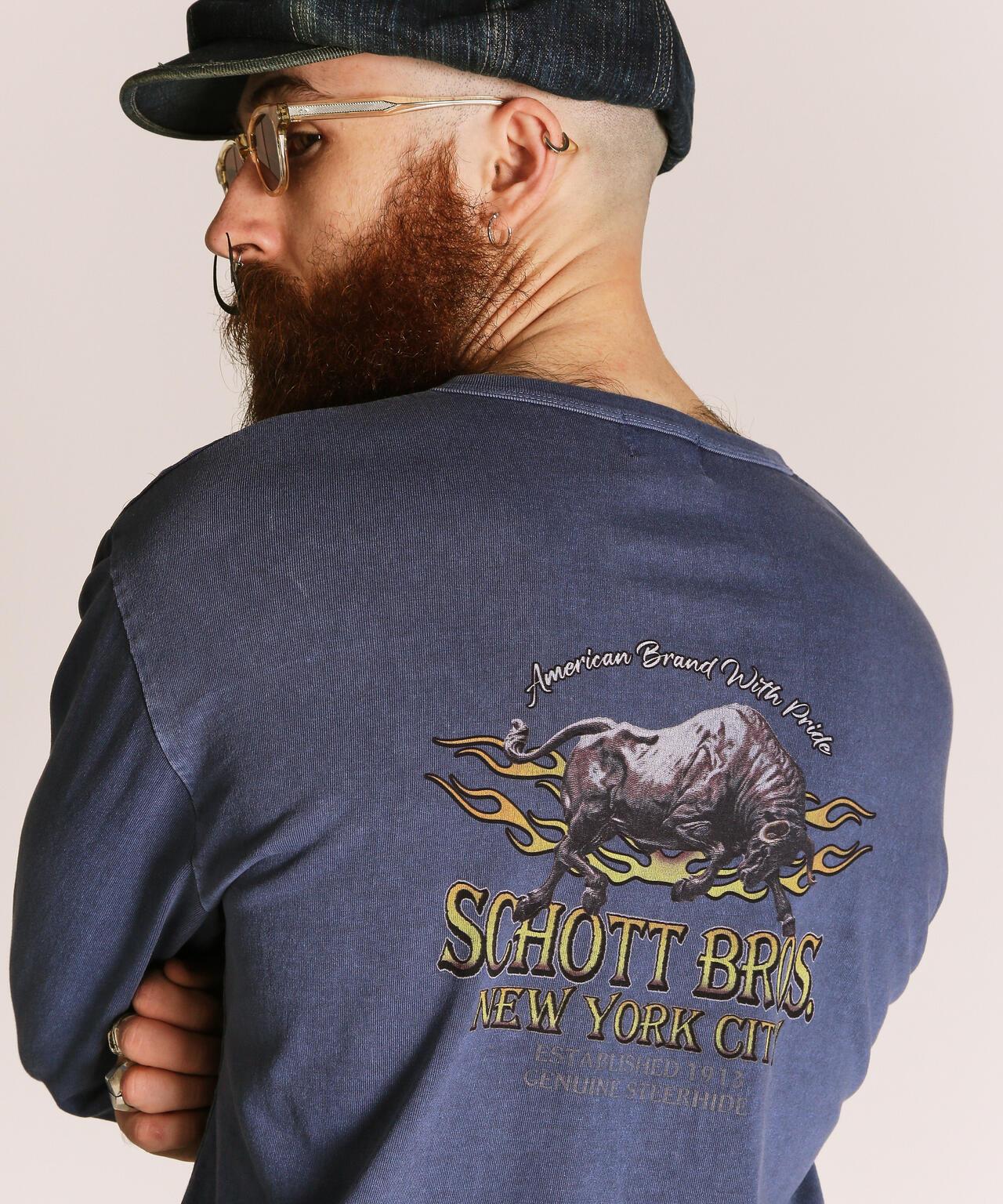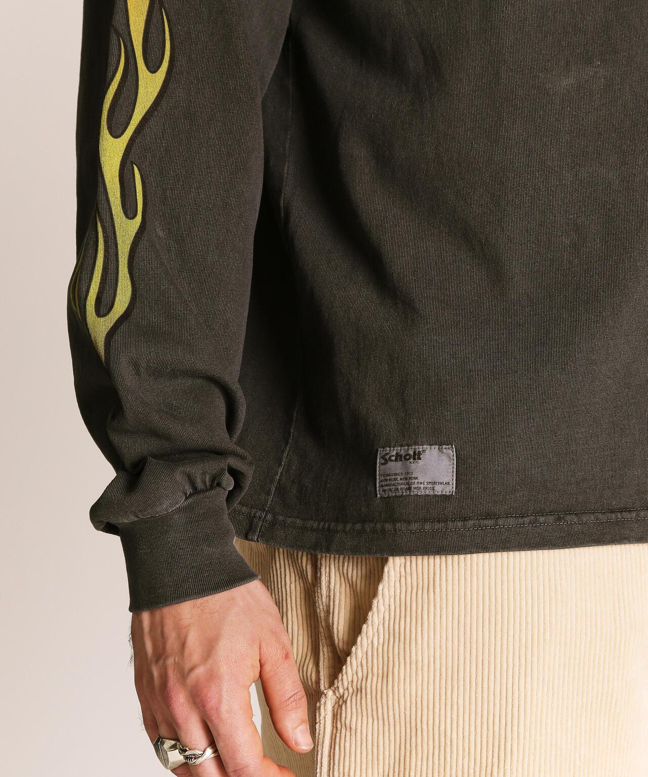 它採用 7 盎司硬質厚身紗線,具有開口紗線特有的蓬鬆、豐滿感,以及乾爽、清脆、堅硬的質感。這款 T 恤具有美國品牌的粗獷氣息。領子採用高耐久性的粘合領規格。衣領部分通過縫合使其包裹身體,不易變形,結構堅韌,可長期使用。獨創的圖案設計。顏料染色經過調整,褪色效果良好,營造出復古般的舒適質感。正面印有大膽的 FIRE BULL 圖形,存在感極強,袖子上的噴墨火苗圖案規格奢華。注重細節。