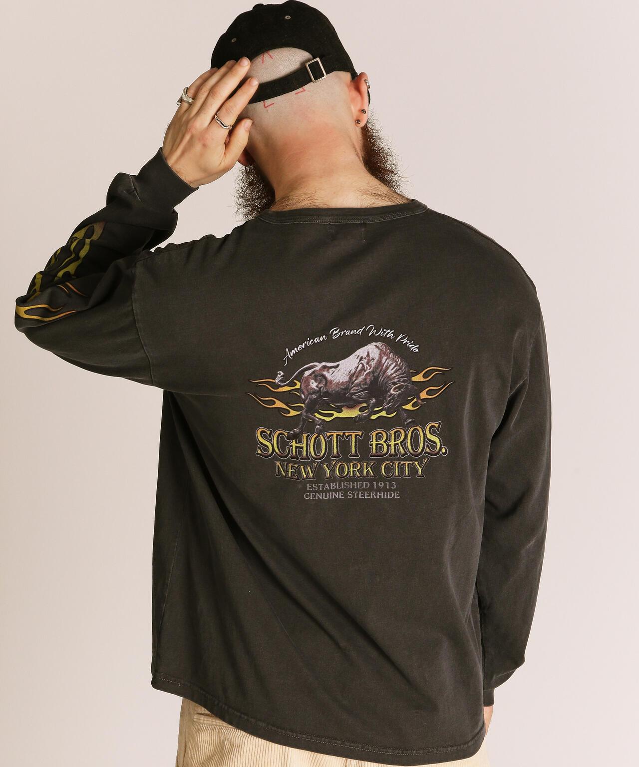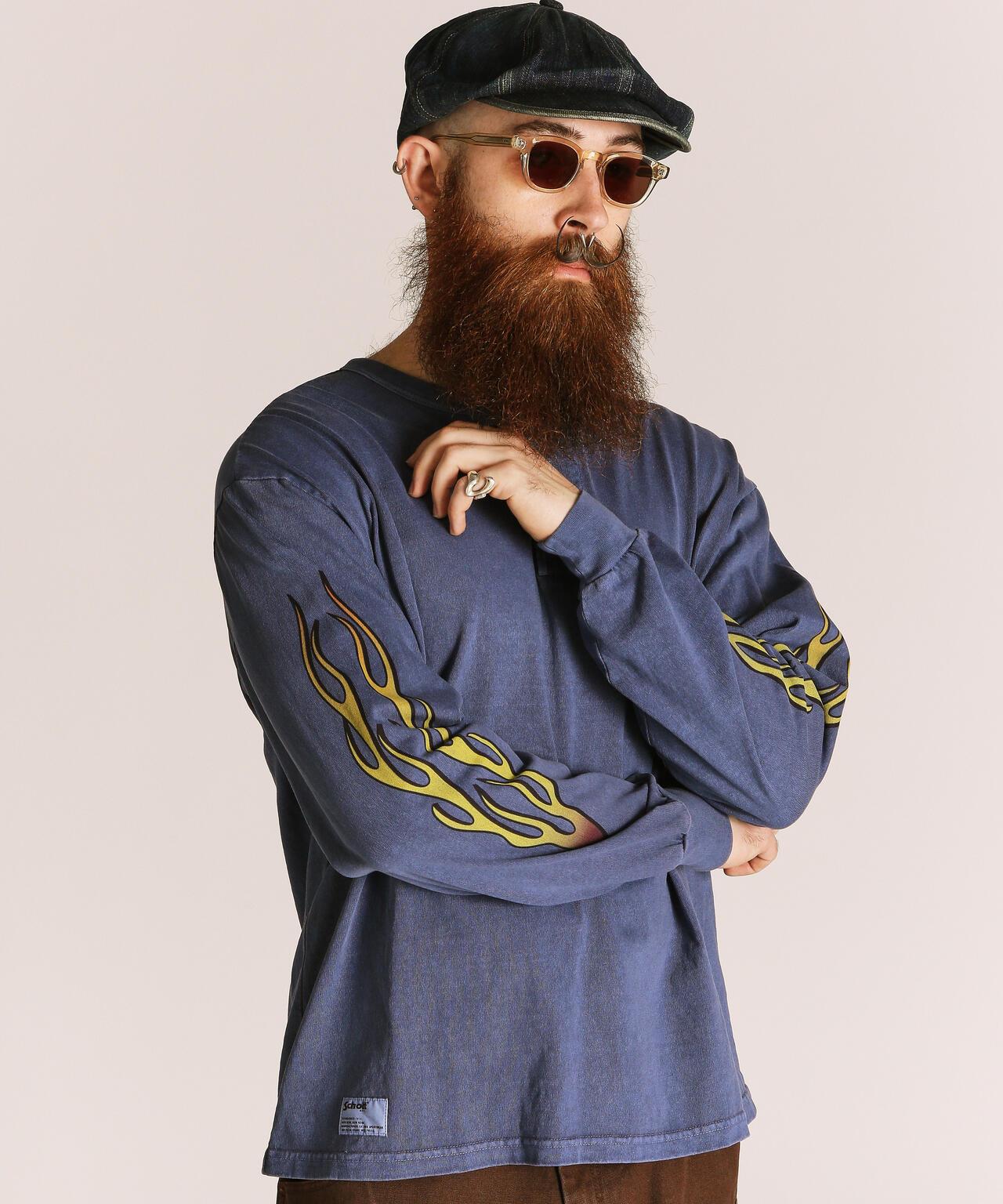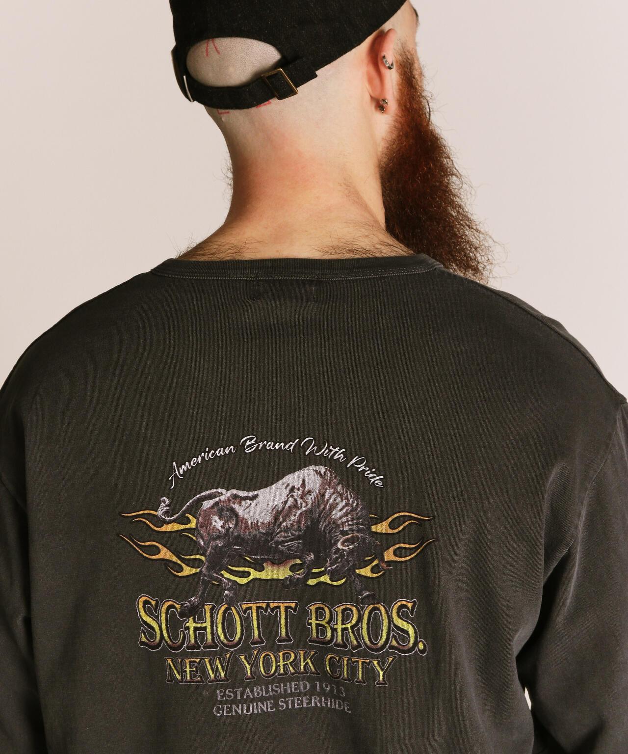 它採用 7 盎司硬質厚身紗線,具有開口紗線特有的蓬鬆、豐滿感,以及乾爽、清脆、堅硬的質感。這款 T 恤具有美國品牌的粗獷氣息。領子採用高耐久性的粘合領規格。衣領部分通過縫合使其包裹身體,不易變形,結構堅韌,可長期使用。獨創的圖案設計。顏料染色經過調整,褪色效果良好,營造出復古般的舒適質感。正面印有大膽的 FIRE BULL 圖形,存在感極強,袖子上的噴墨火苗圖案規格奢華。注重細節。