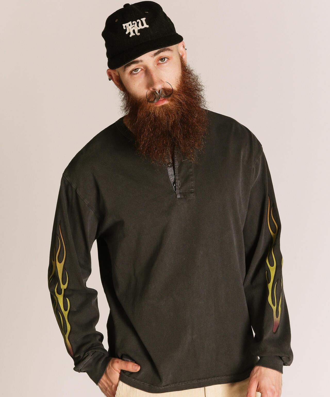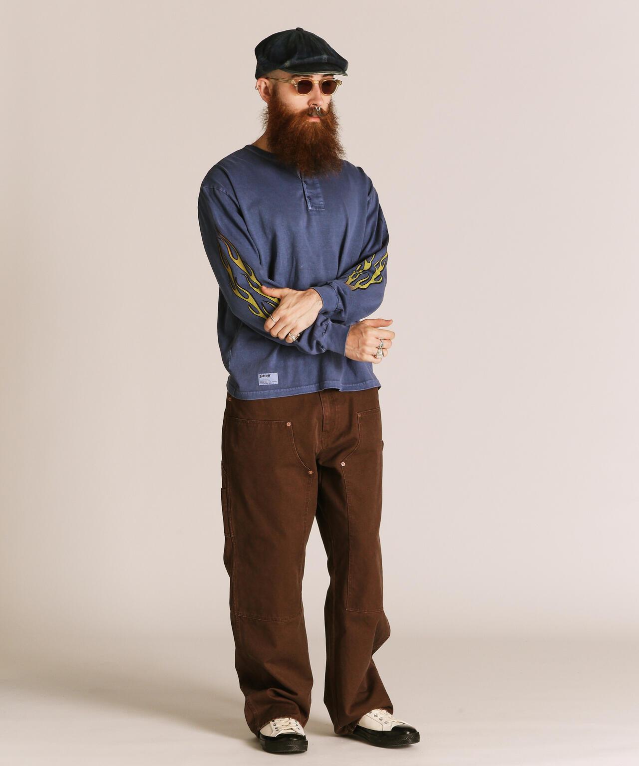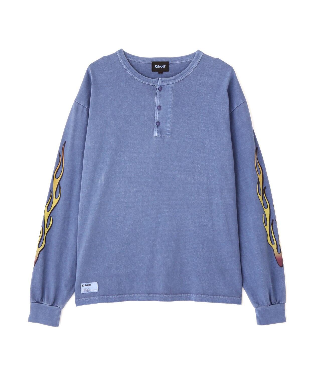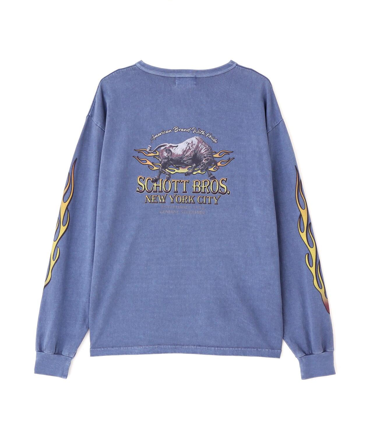 它採用 7 盎司硬質厚身紗線,具有開口紗線特有的蓬鬆、豐滿感,以及乾爽、清脆、堅硬的質感。這款 T 恤具有美國品牌的粗獷氣息。領子採用高耐久性的粘合領規格。衣領部分通過縫合使其包裹身體,不易變形,結構堅韌,可長期使用。獨創的圖案設計。顏料染色經過調整,褪色效果良好,營造出復古般的舒適質感。正面印有大膽的 FIRE BULL 圖形,存在感極強,袖子上的噴墨火苗圖案規格奢華。注重細節。