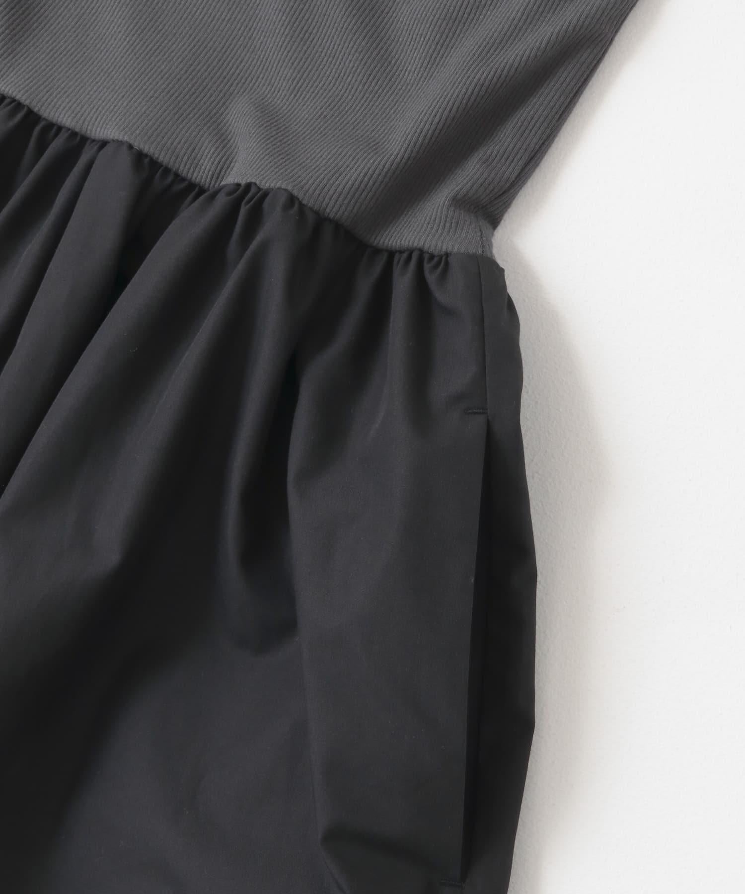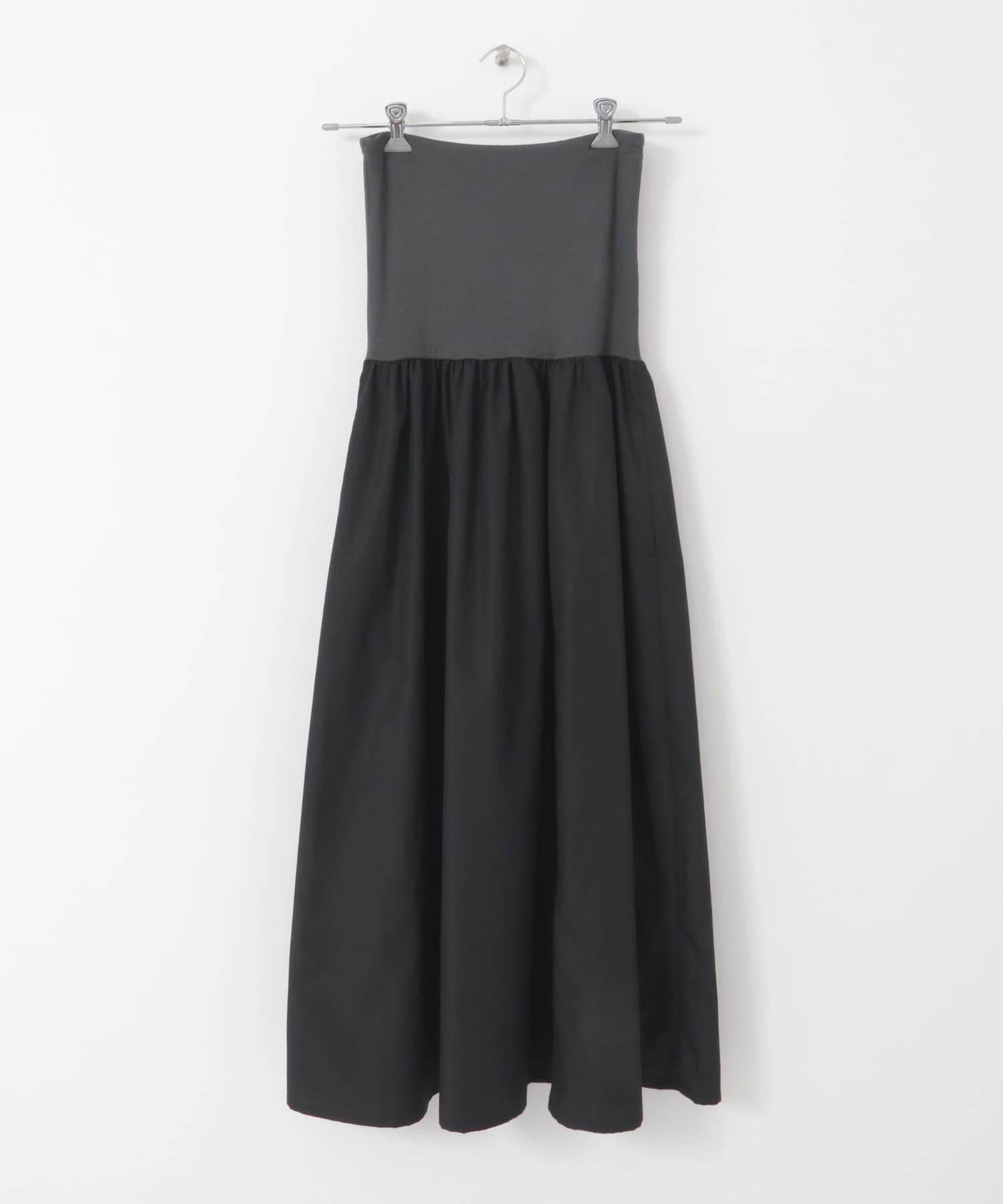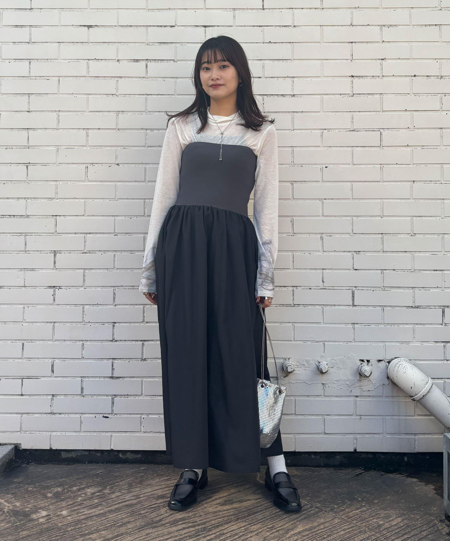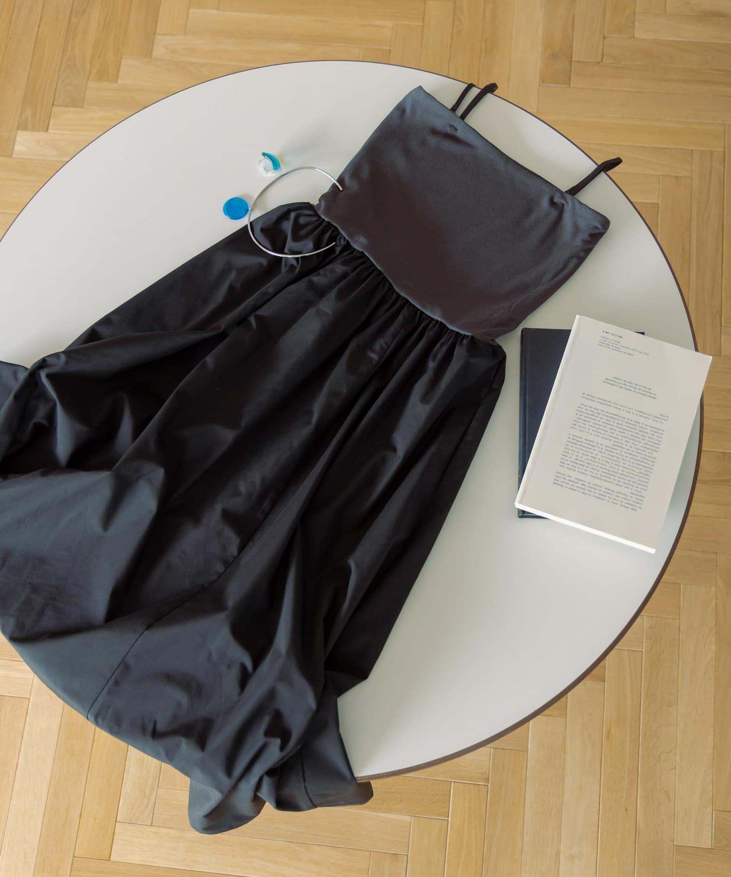由不同材質製成的連身裙,結合了具有合身感的羅紋材質和抗皺彈性材質。肩帶可以拆卸,因此您既可以將其作為裸露連體褲穿,也可以將其作為吊帶連體褲穿。兩種不同高度的尺寸也是一個吸引人的特點。您可以根據搭配的內搭和單品改變連衣裙的氛圍。