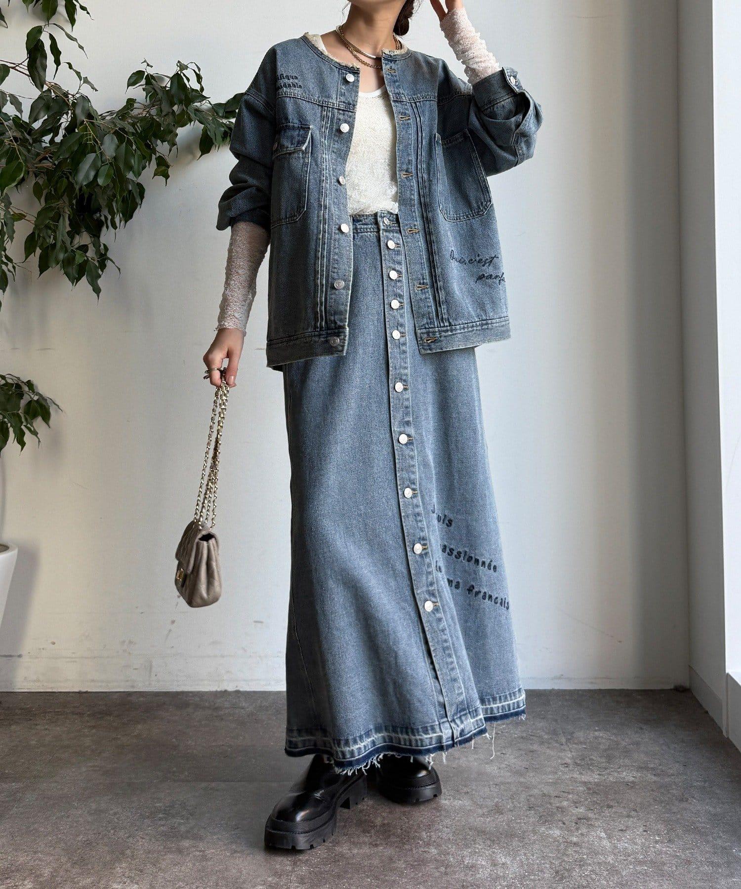 牛仔刺繡前扣半身裙