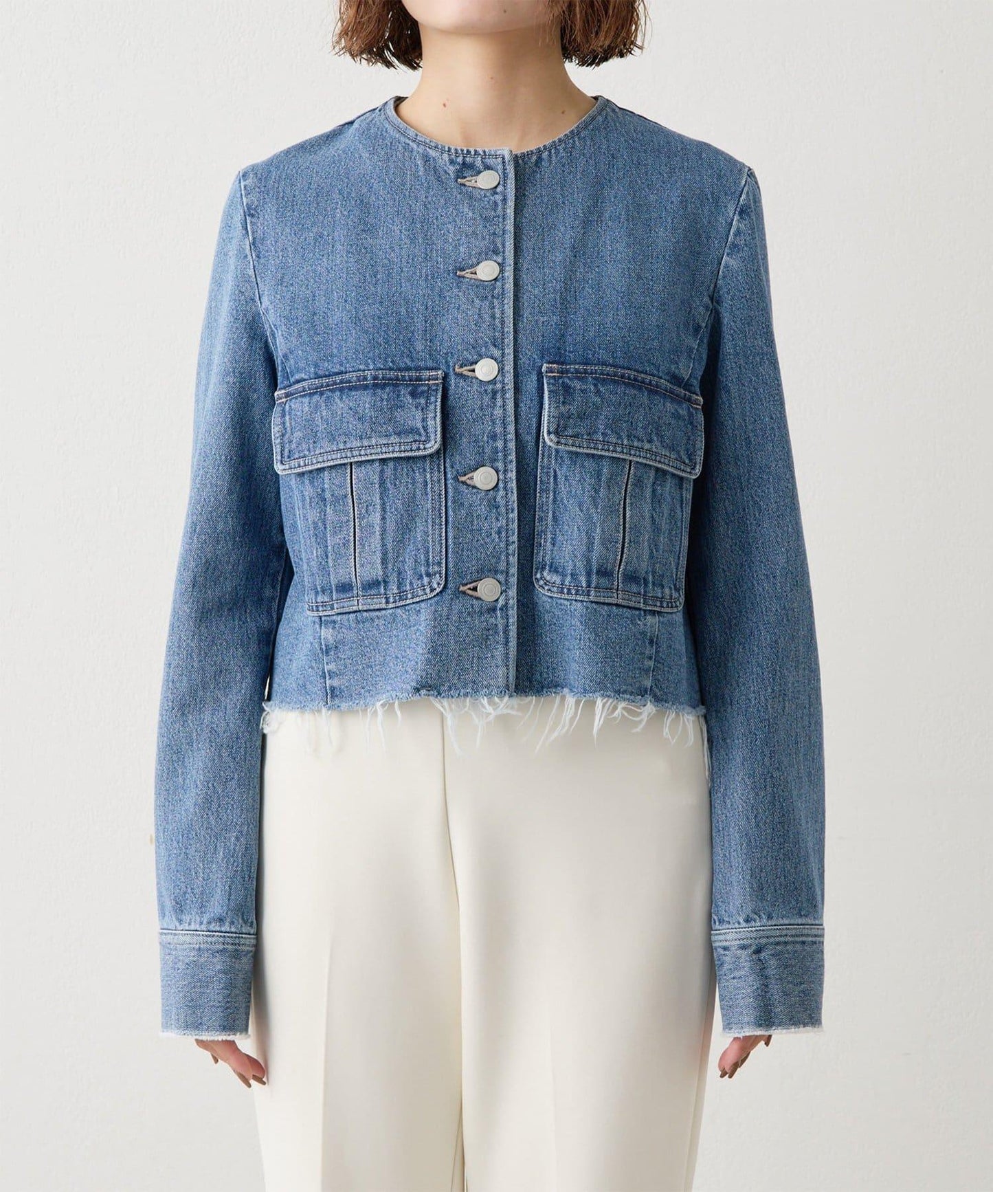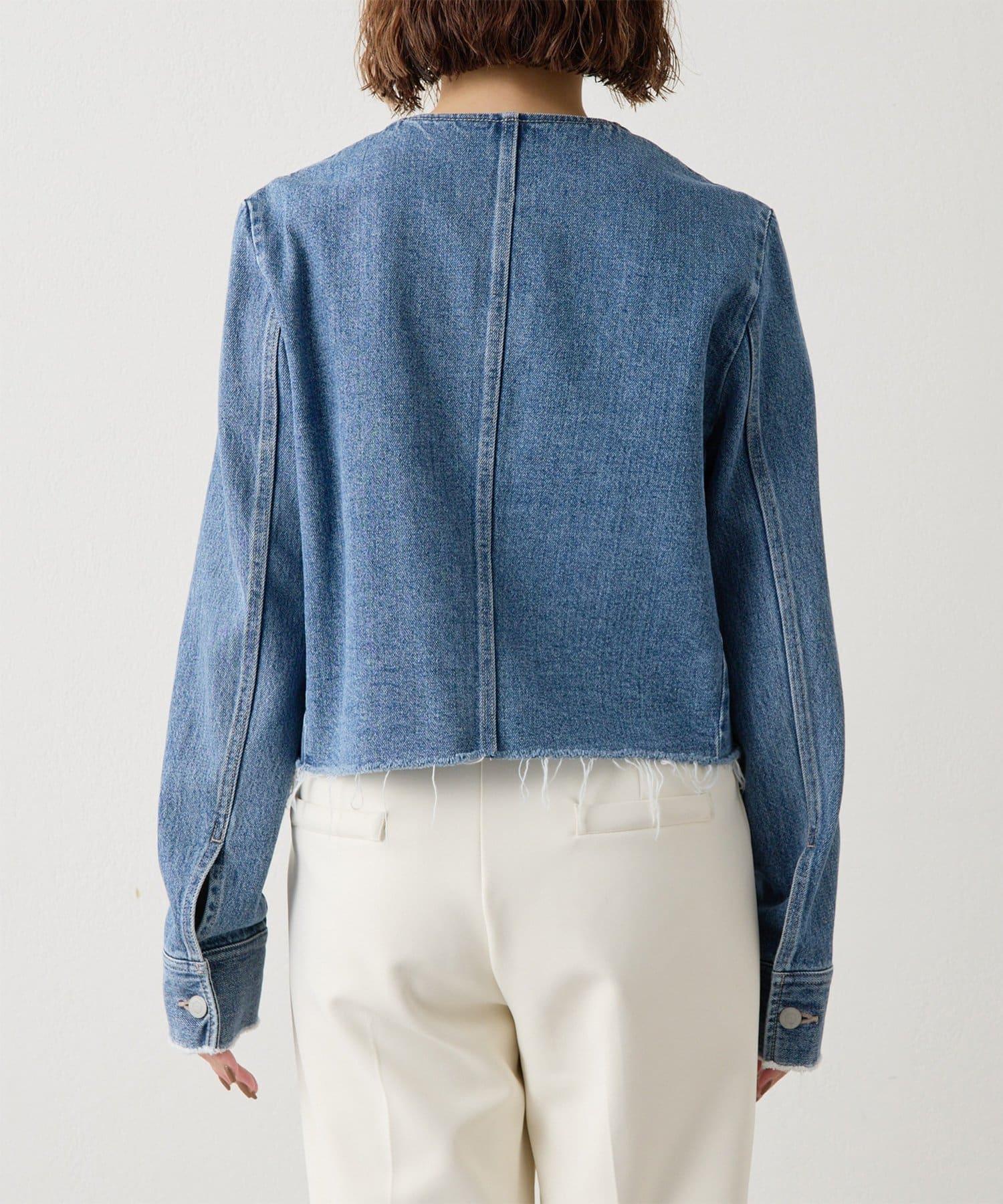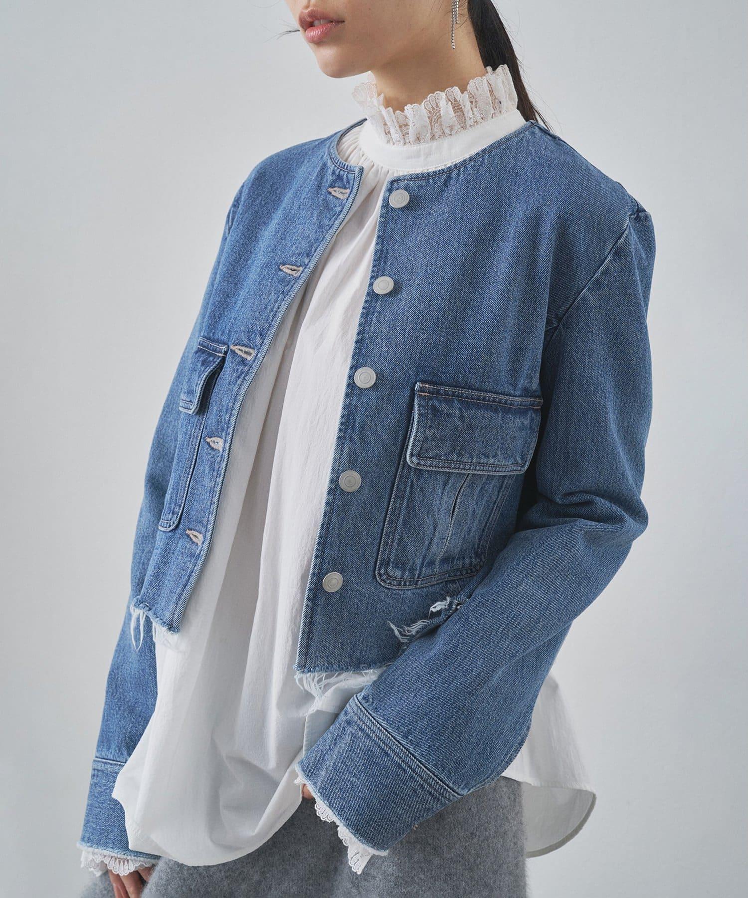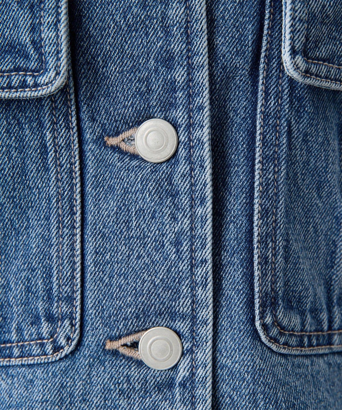 這款圓領夾克採用 12.5 盎司環舊牛仔布製成。
