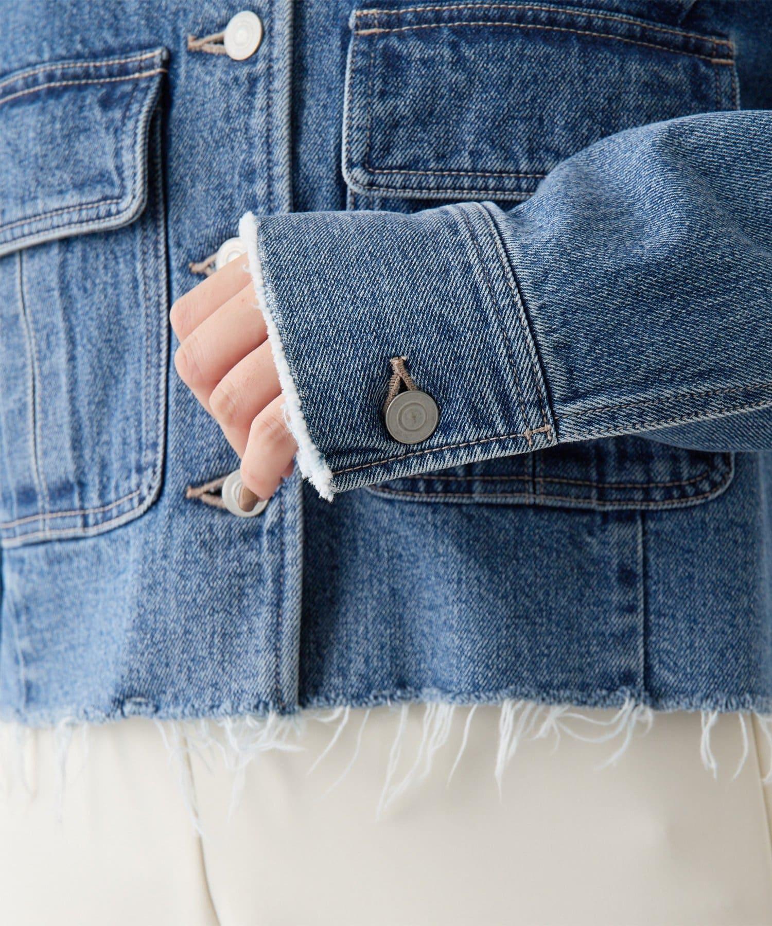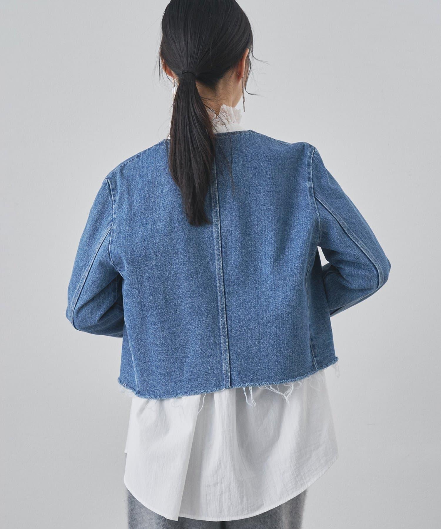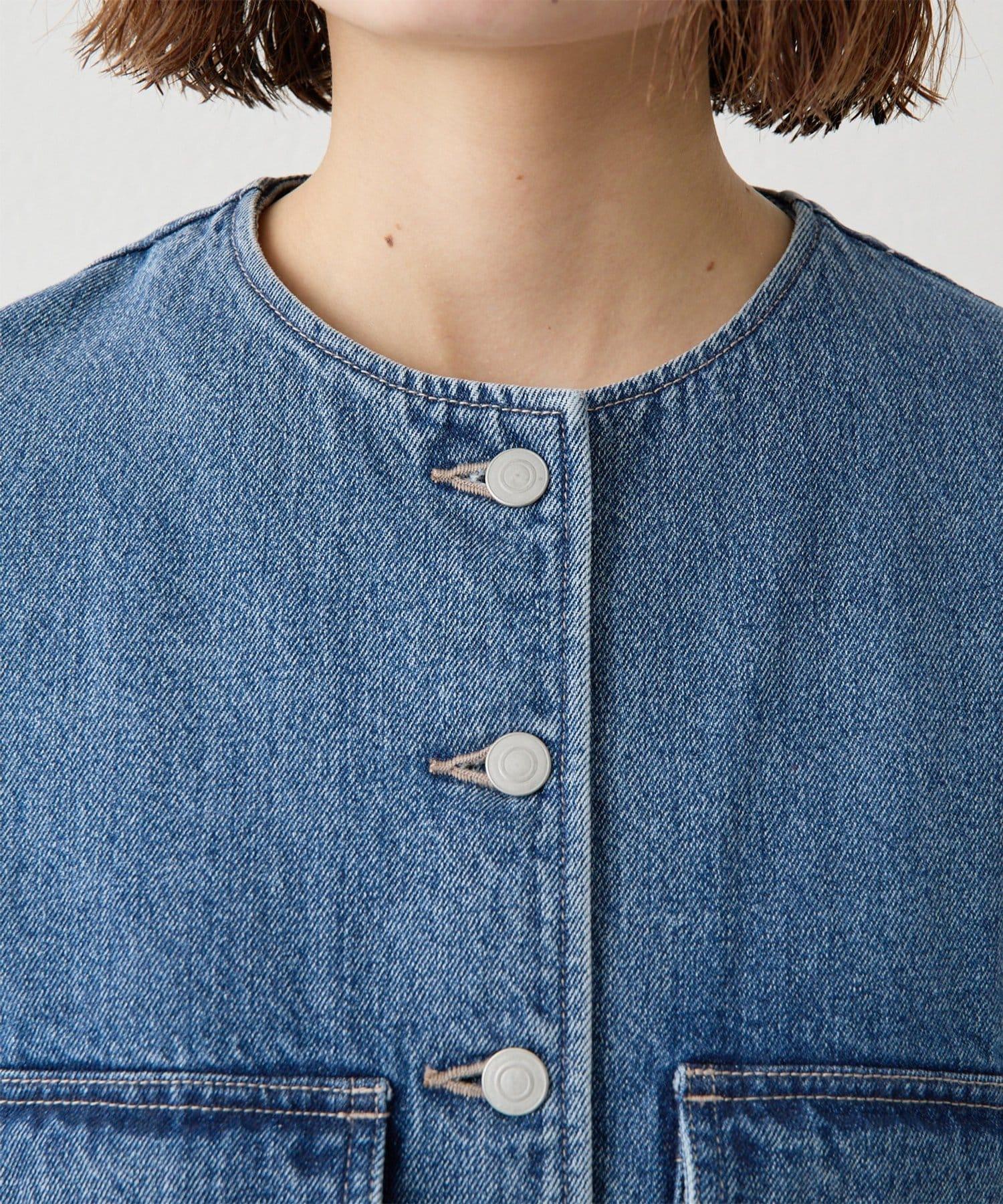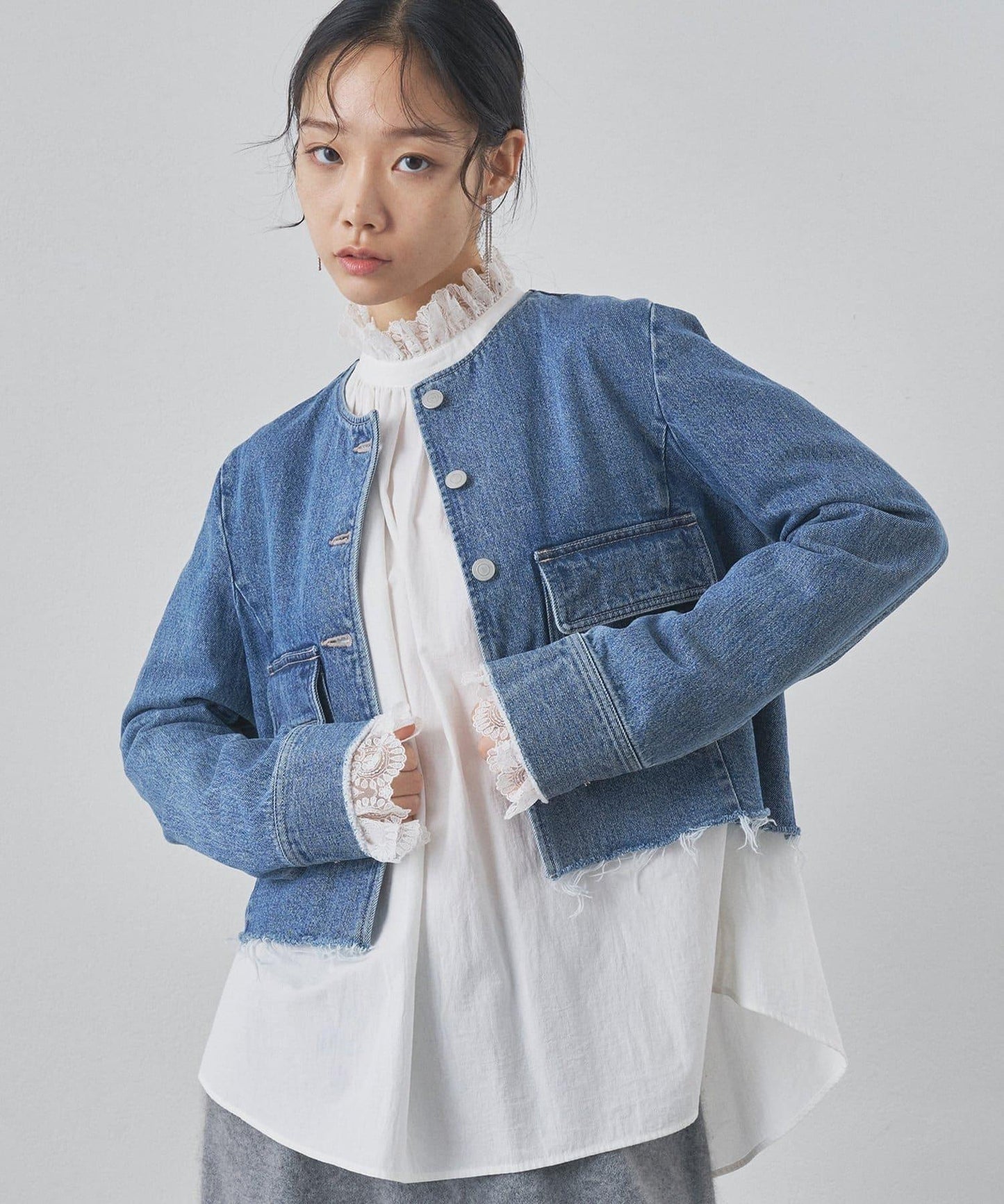 這款圓領夾克採用 12.5 盎司環舊牛仔布製成。