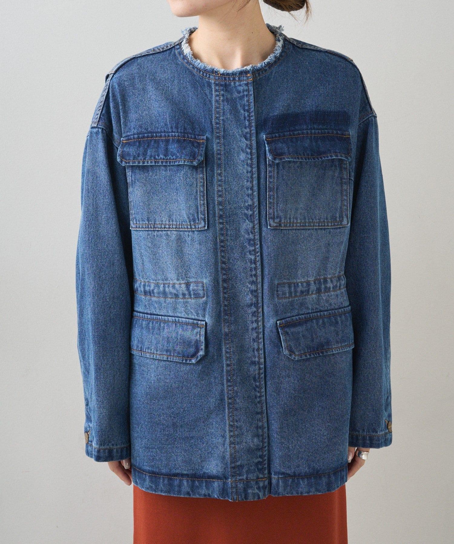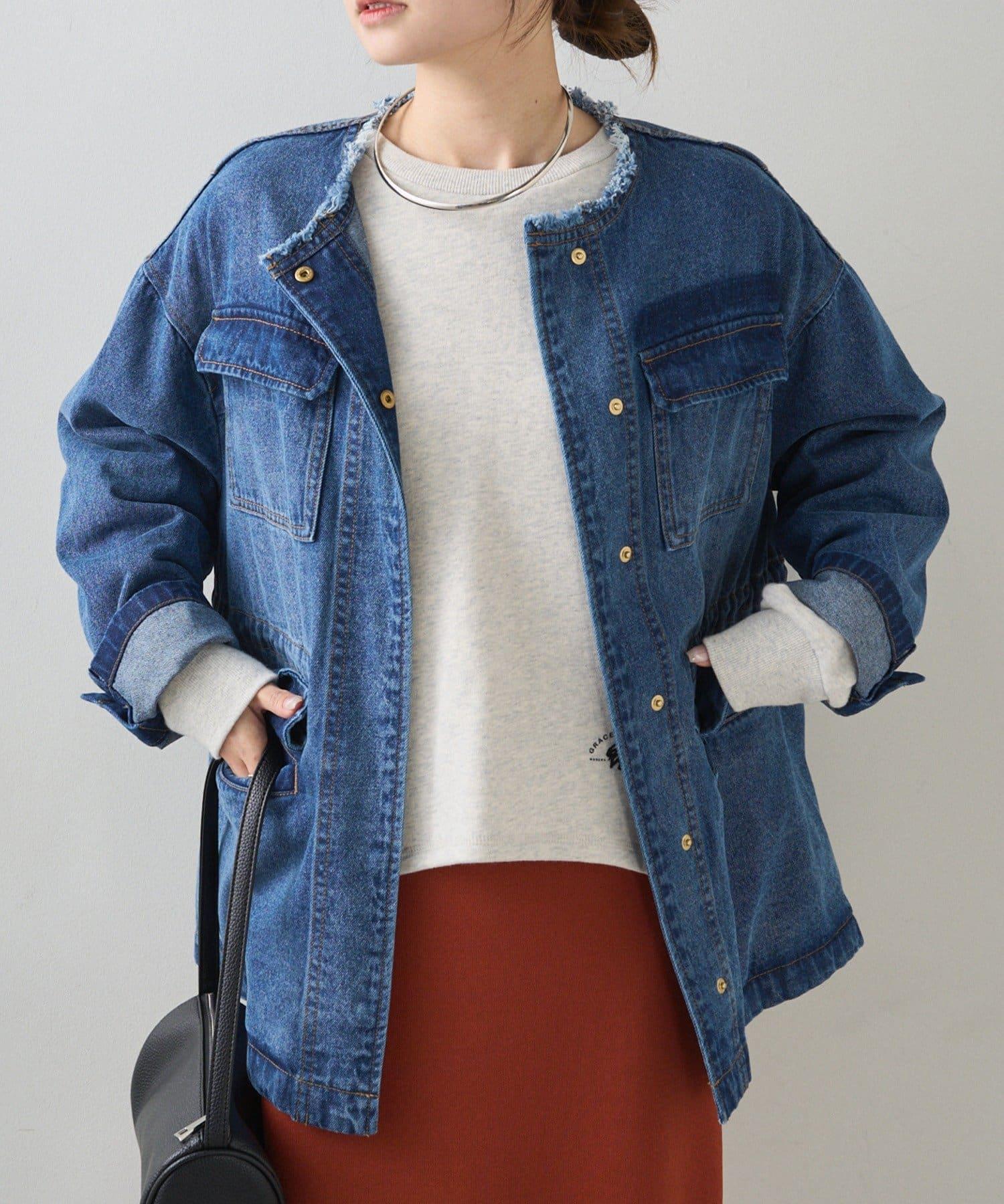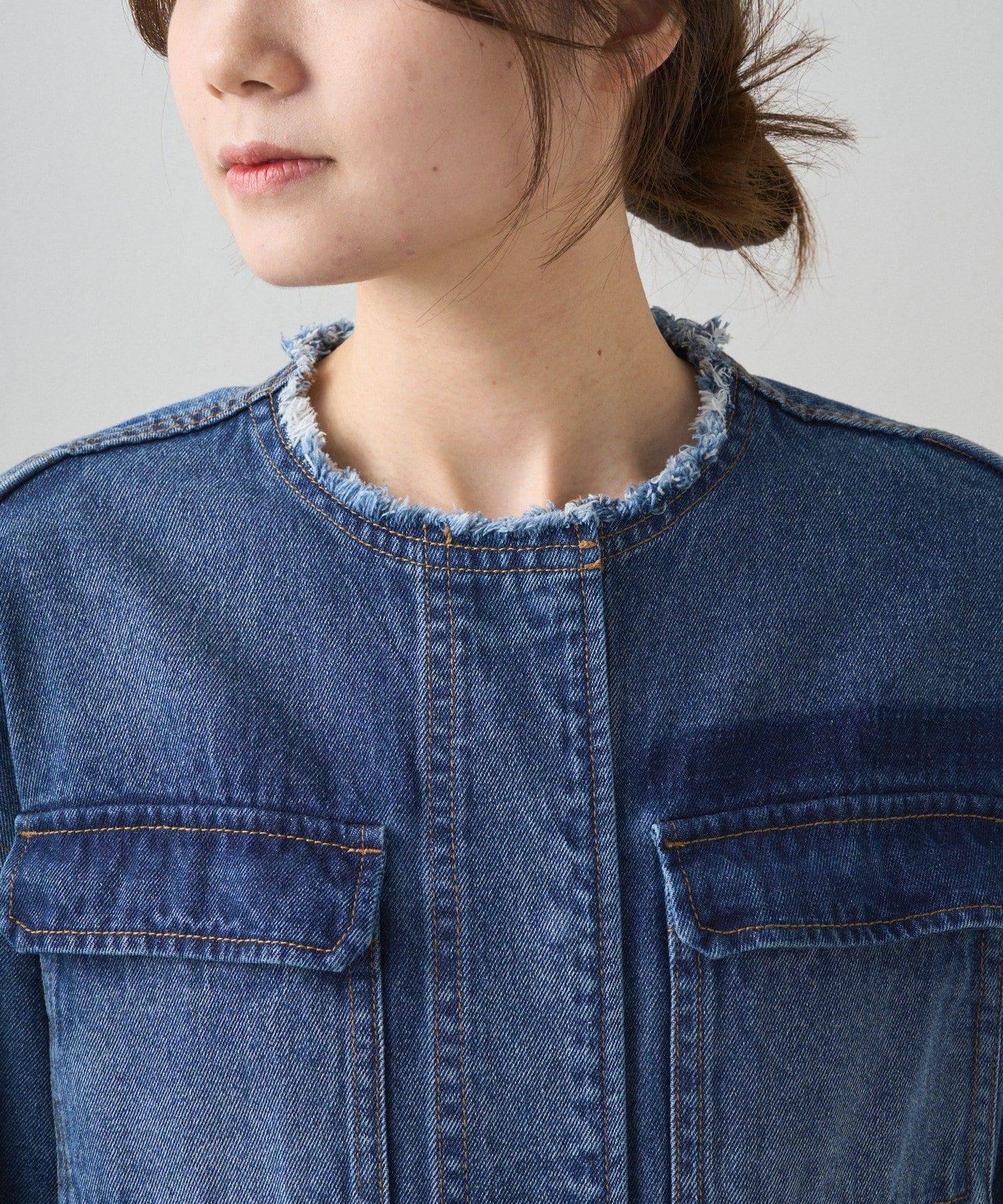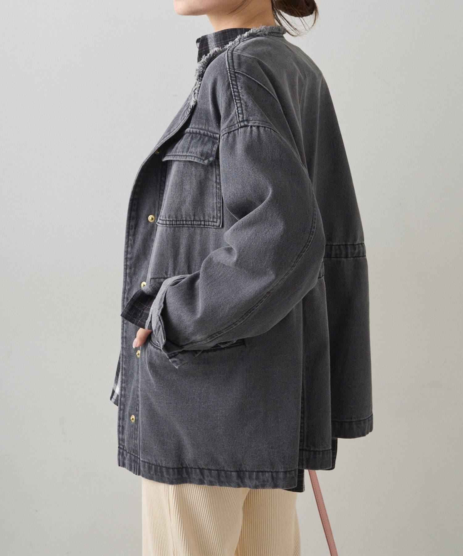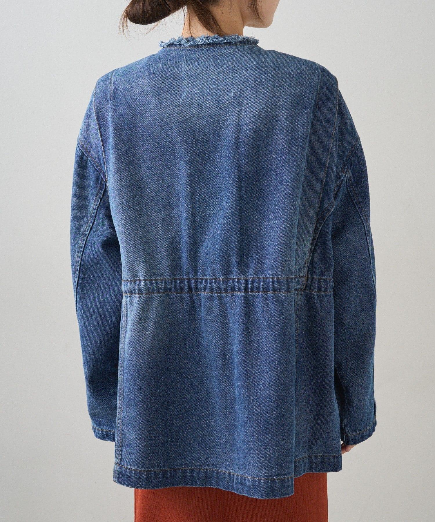 這款夾克既有牛仔布的休閒感,又有無領的精緻感、