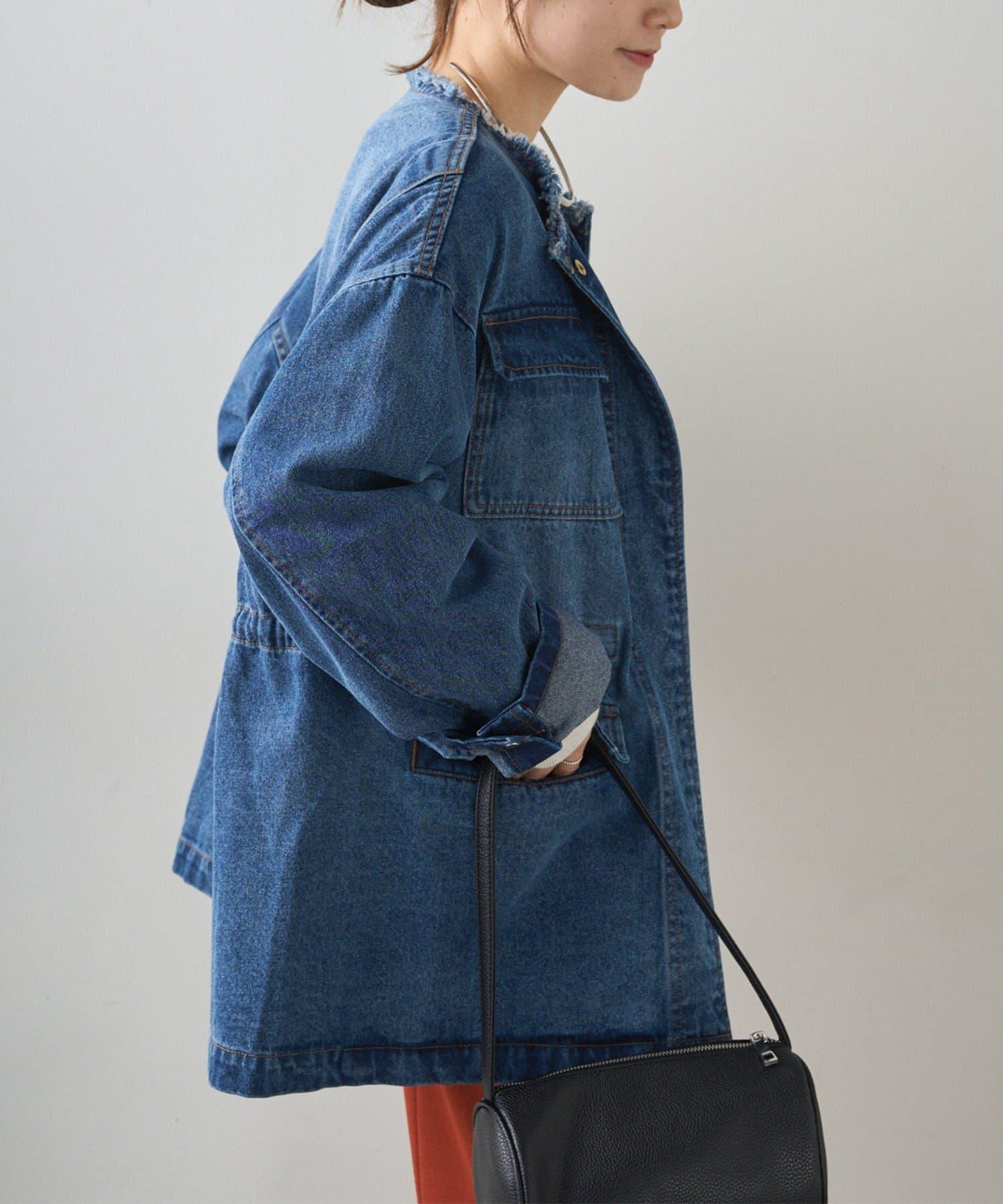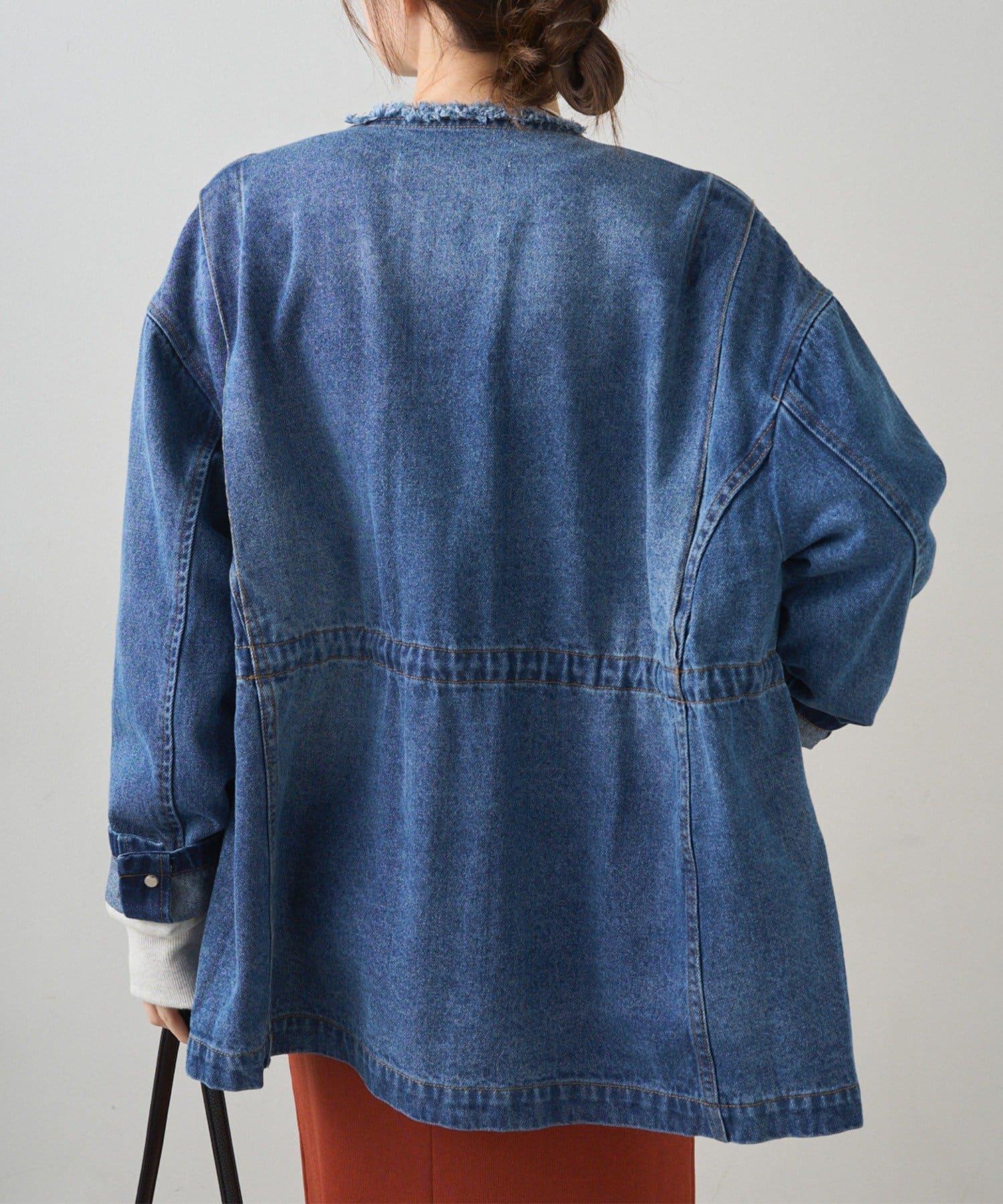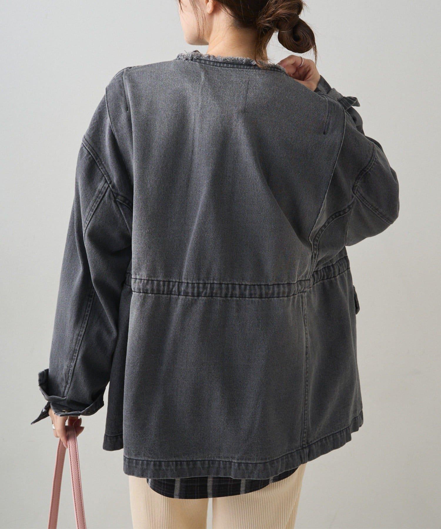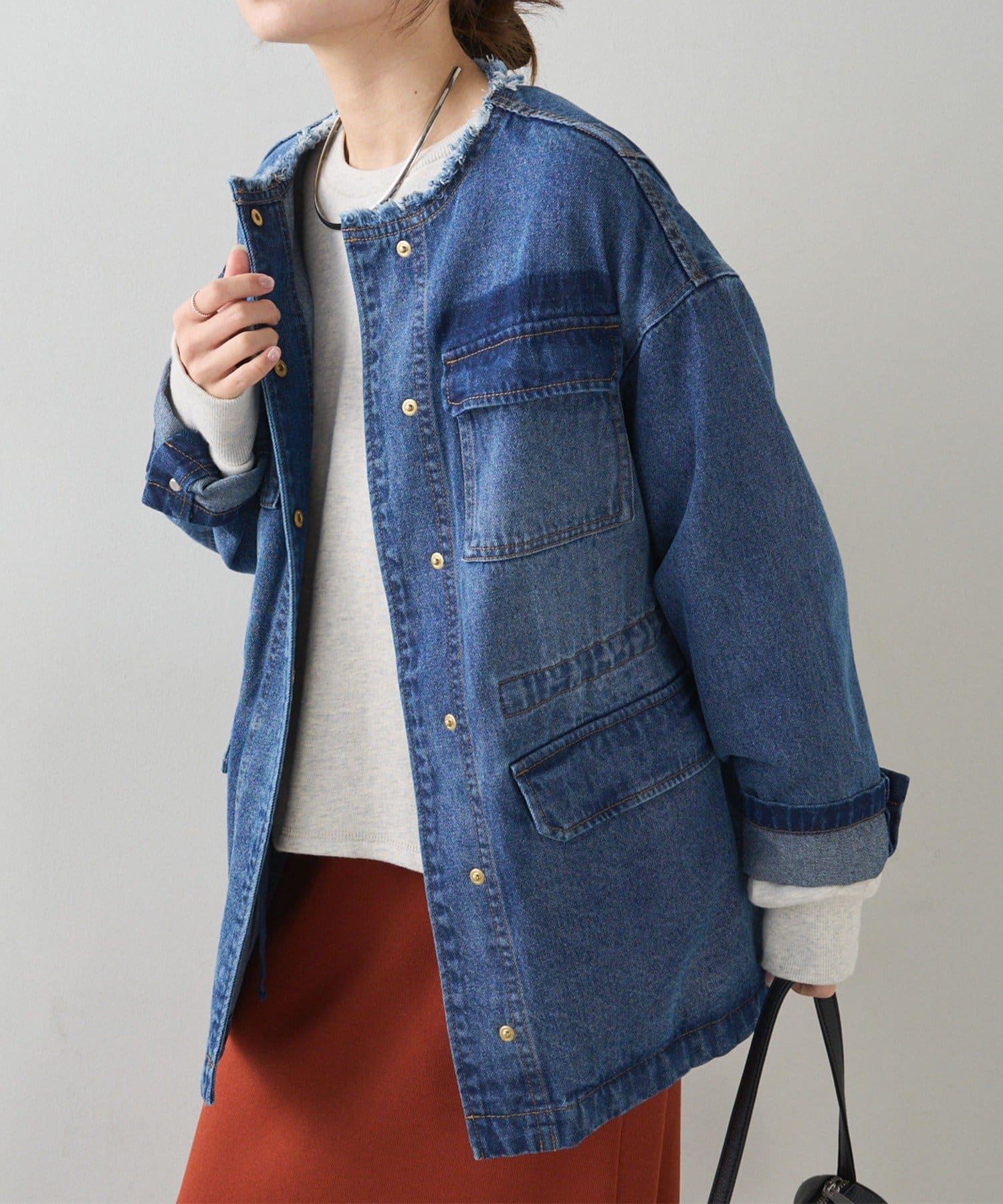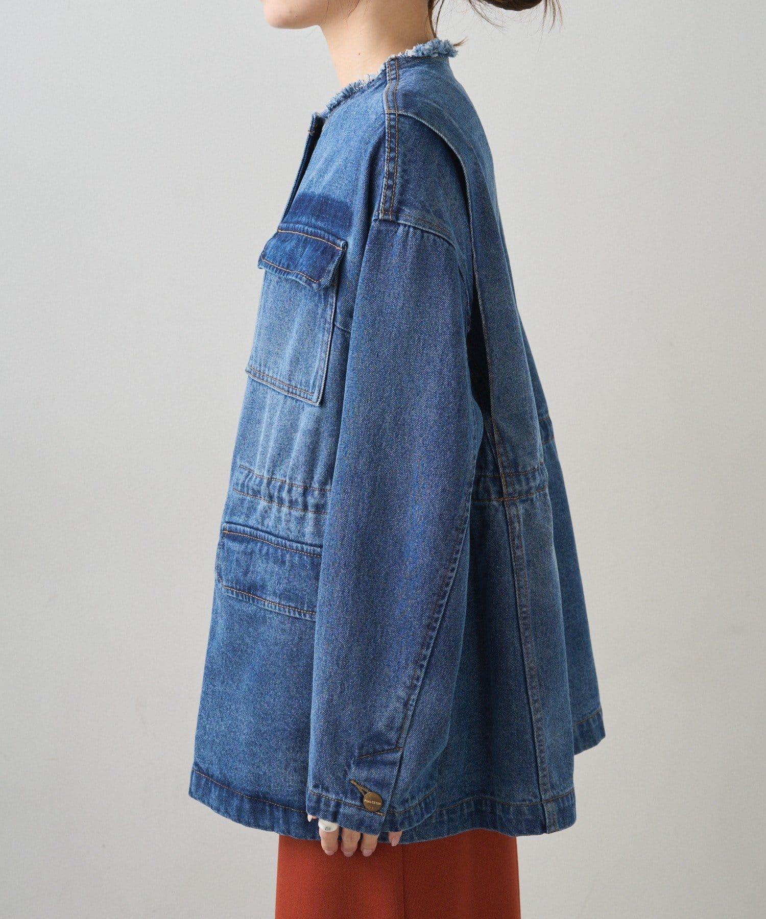 這款夾克既有牛仔布的休閒感,又有無領的精緻感、