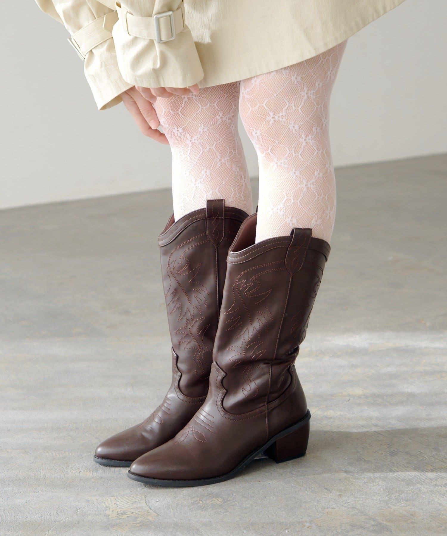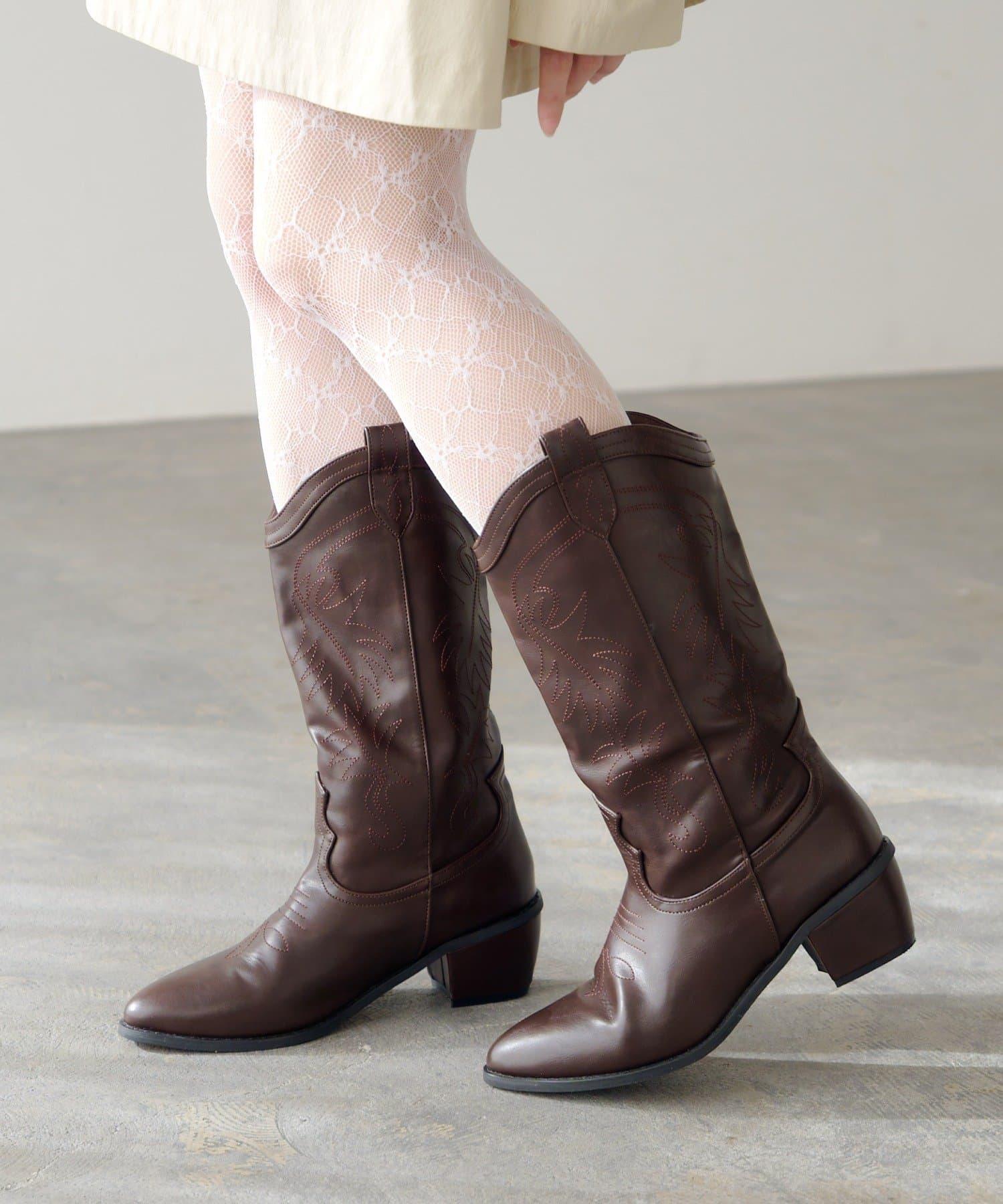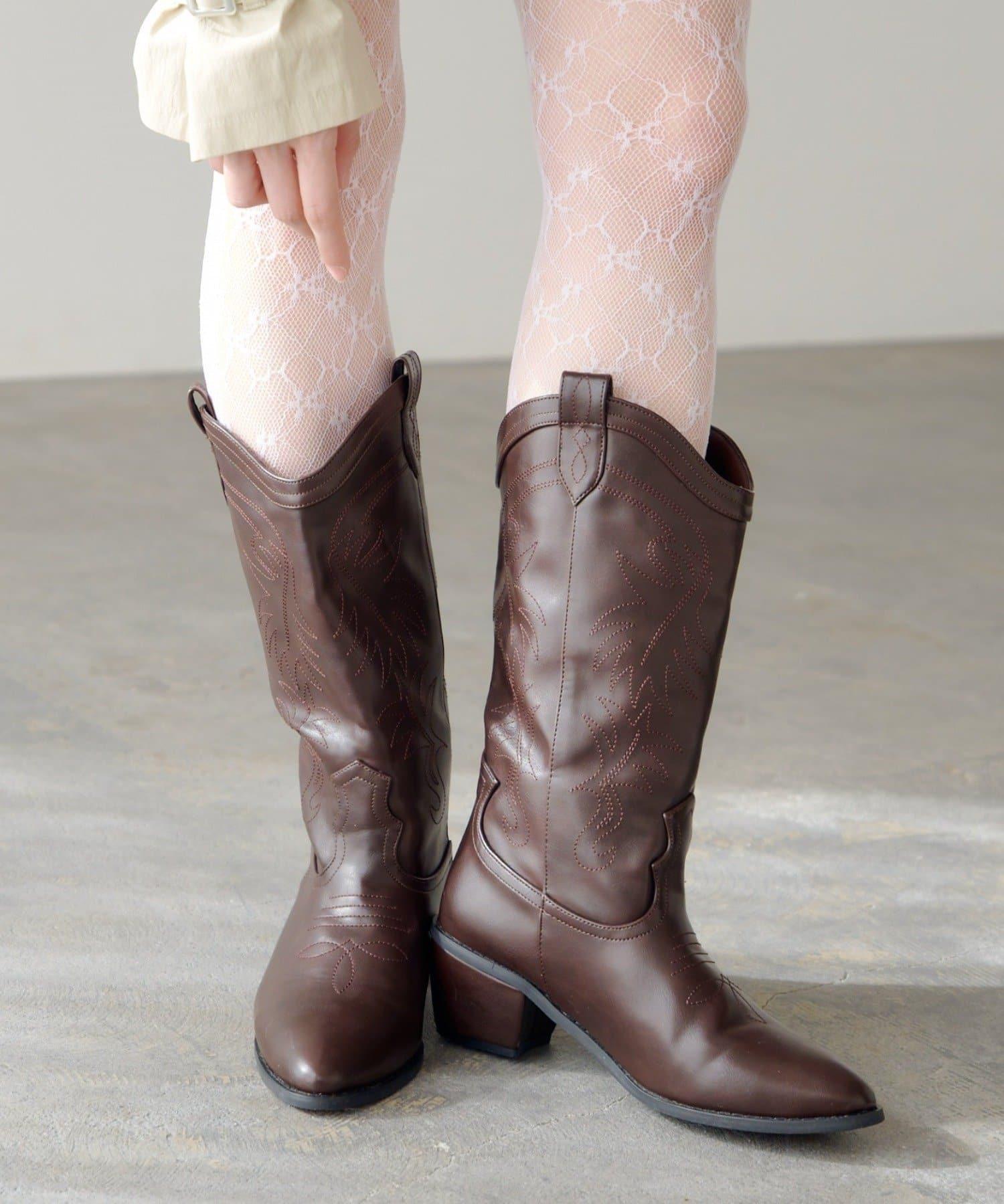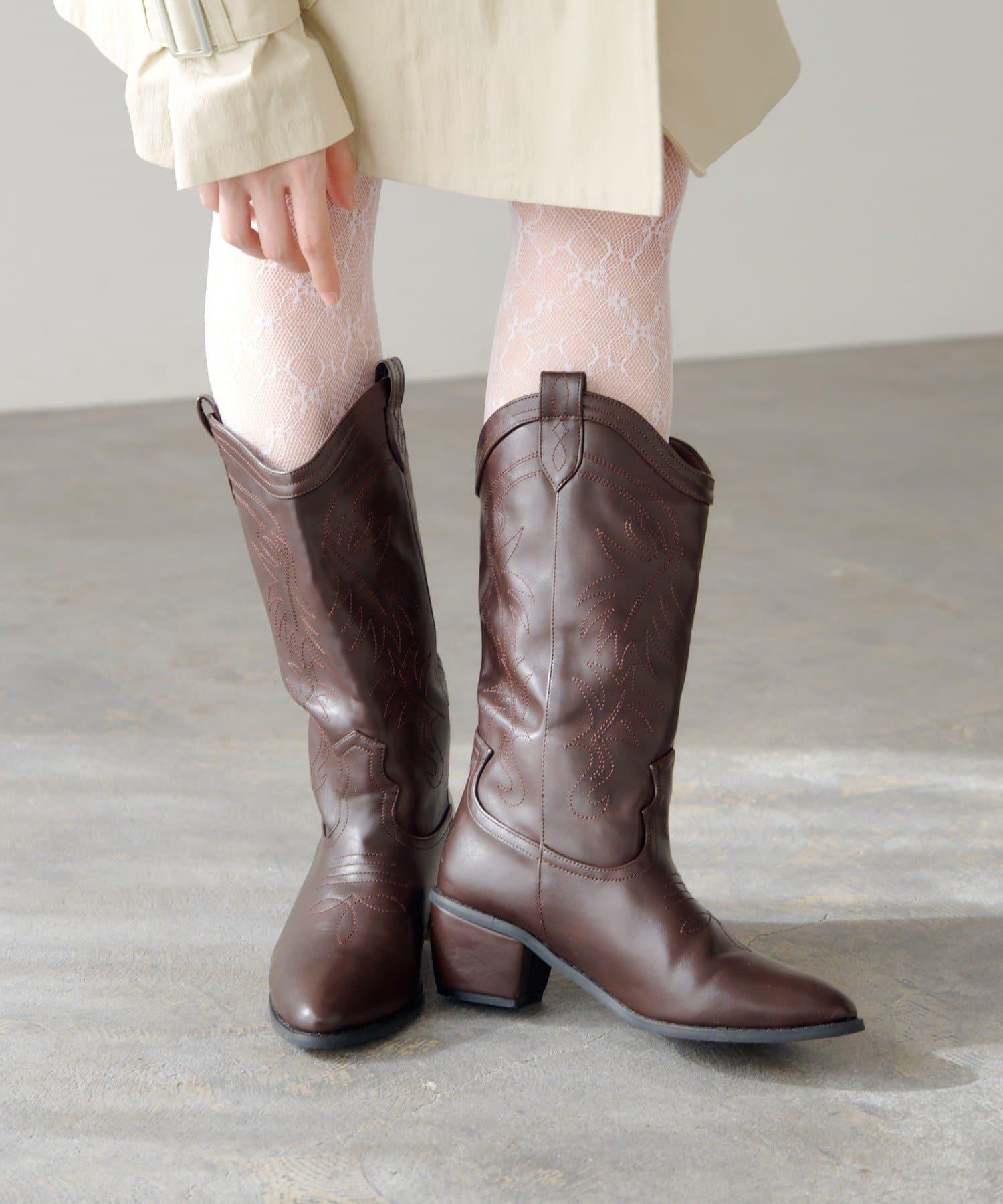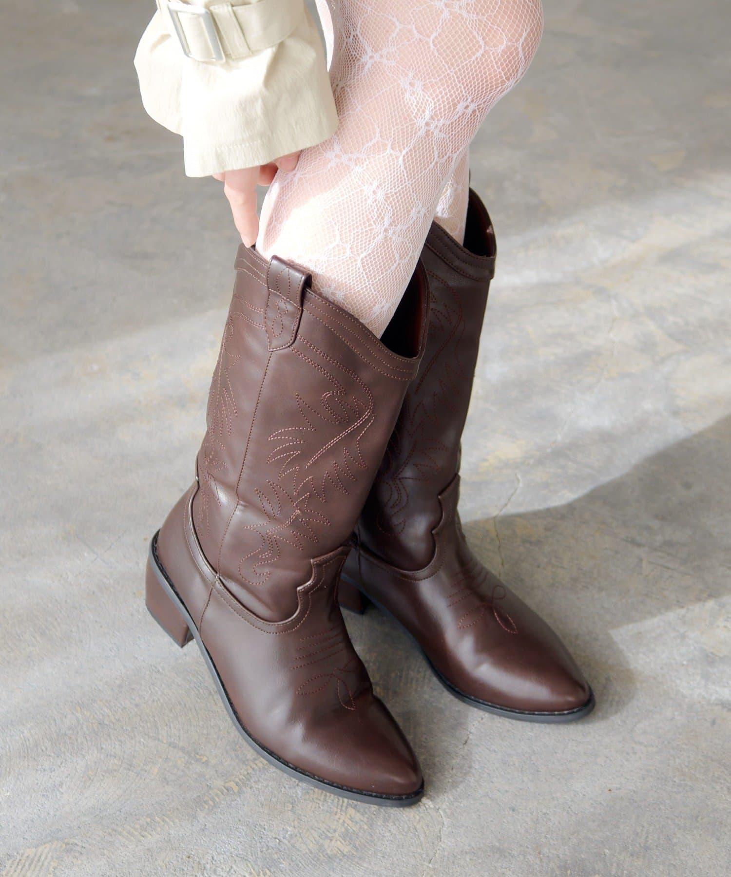 這款靴子的主要特色是西式撥扣設計和刺繡。前部尖頭設計給人一種簡潔的感覺。