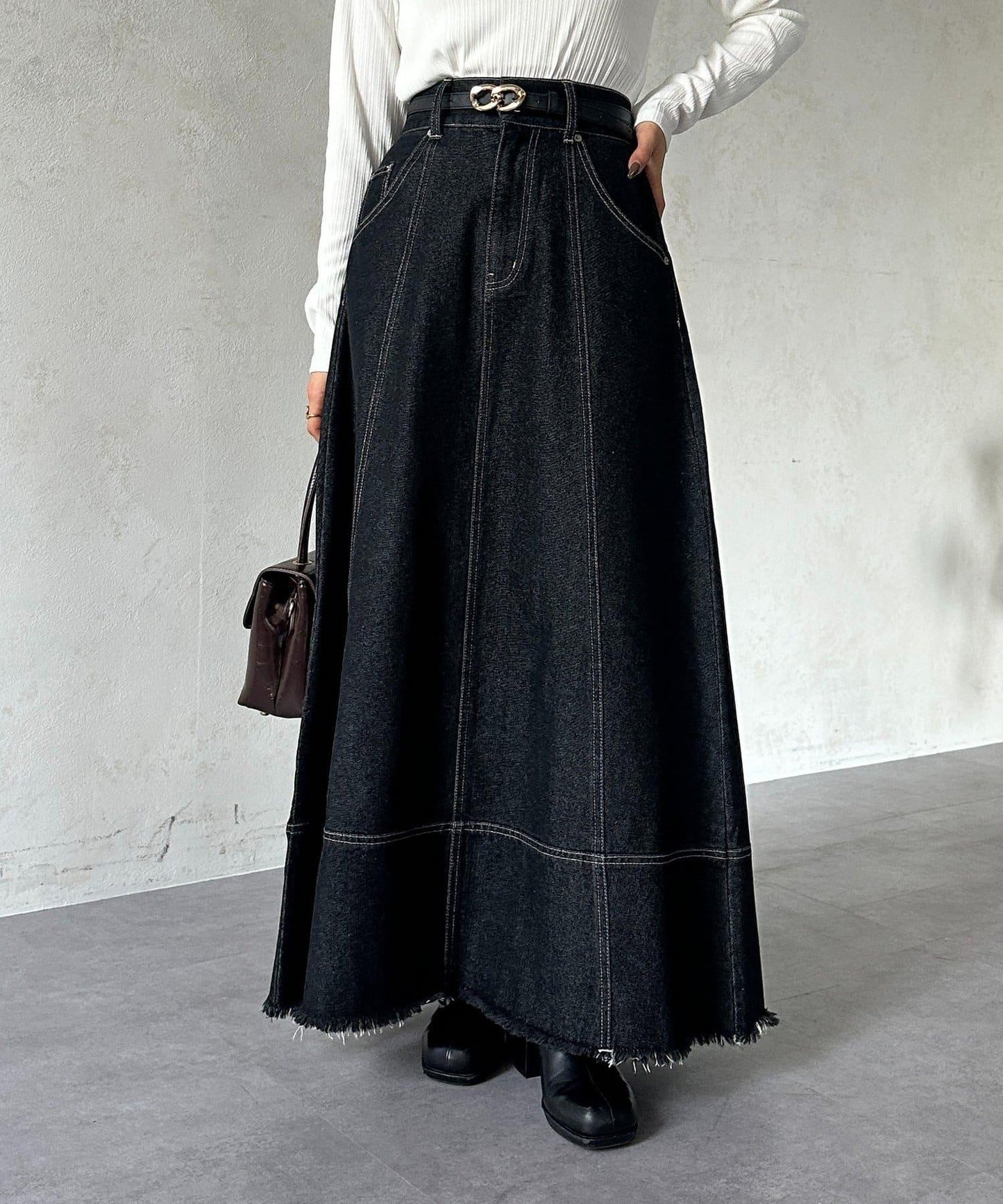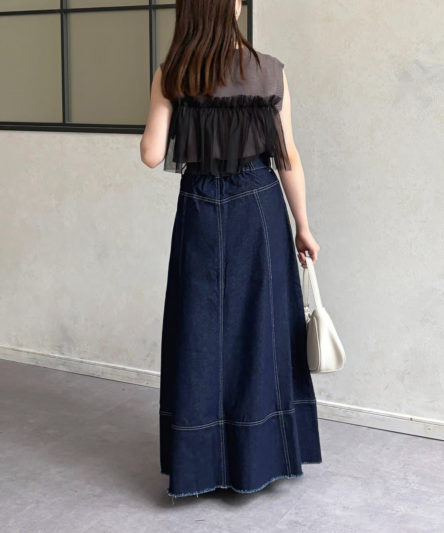 牛仔裙的喇叭線條優雅舒展。