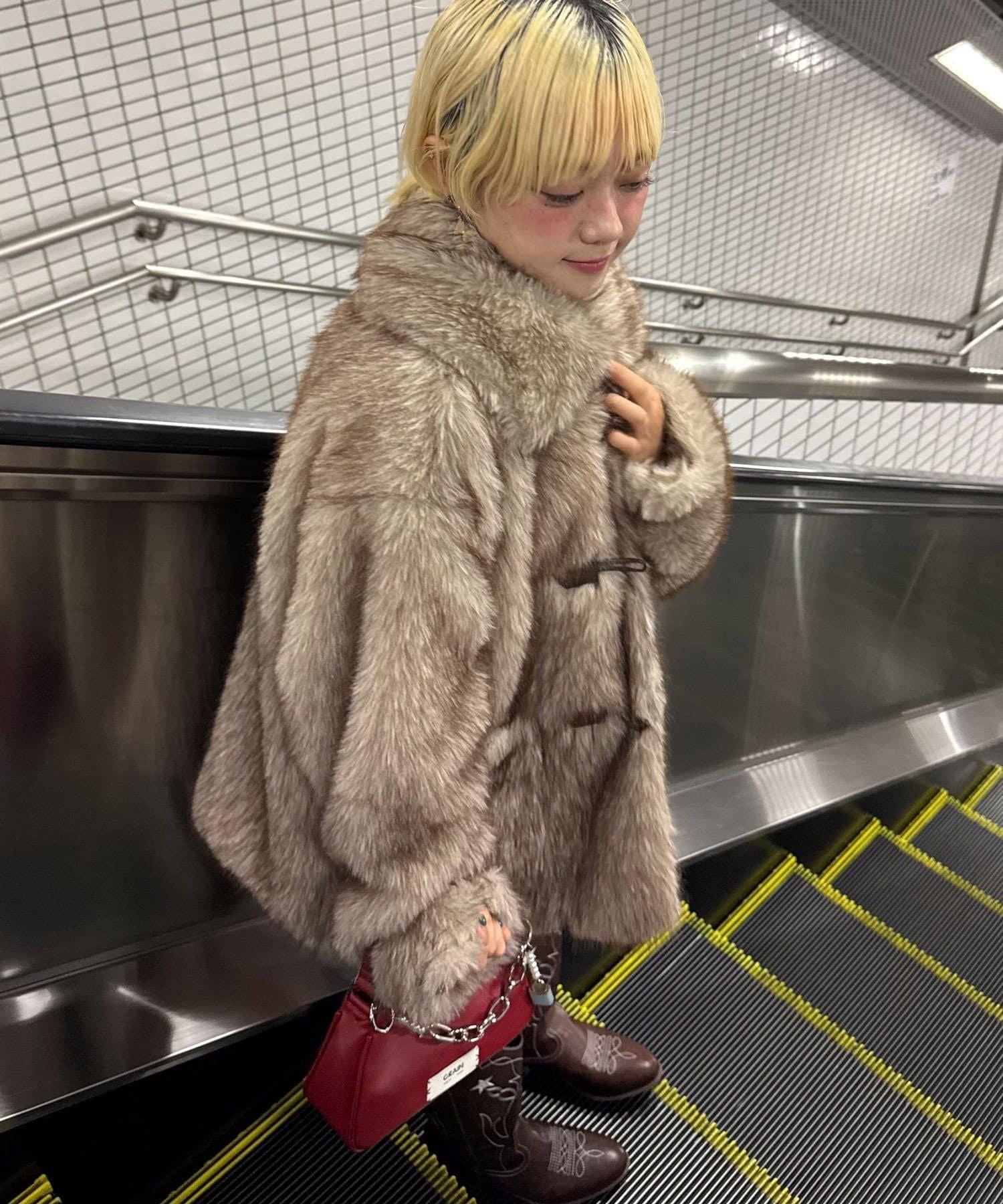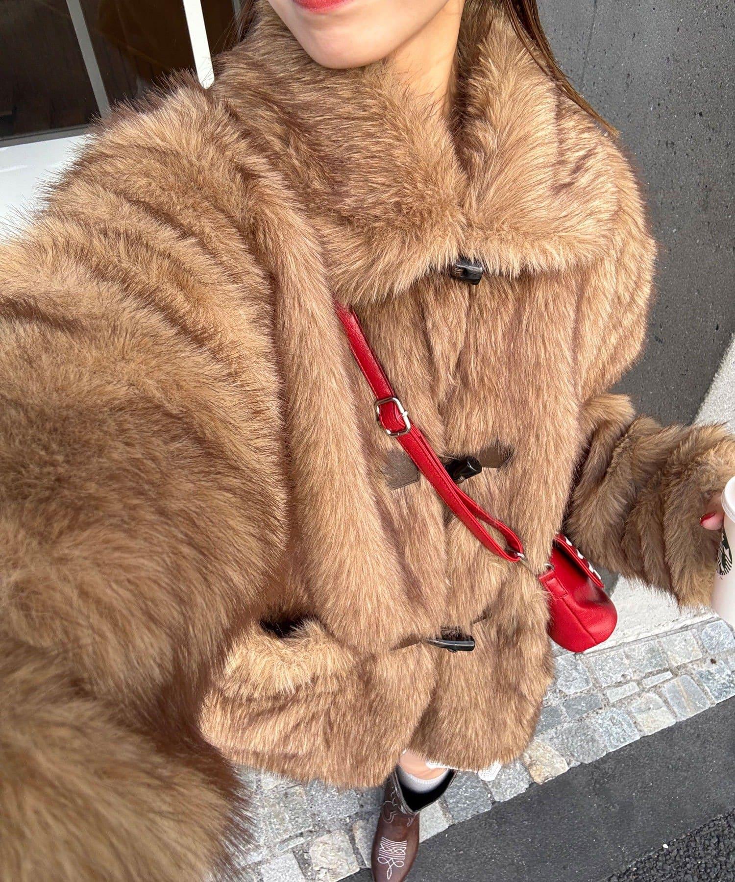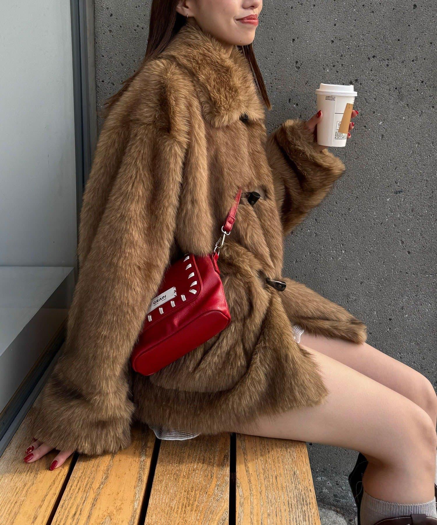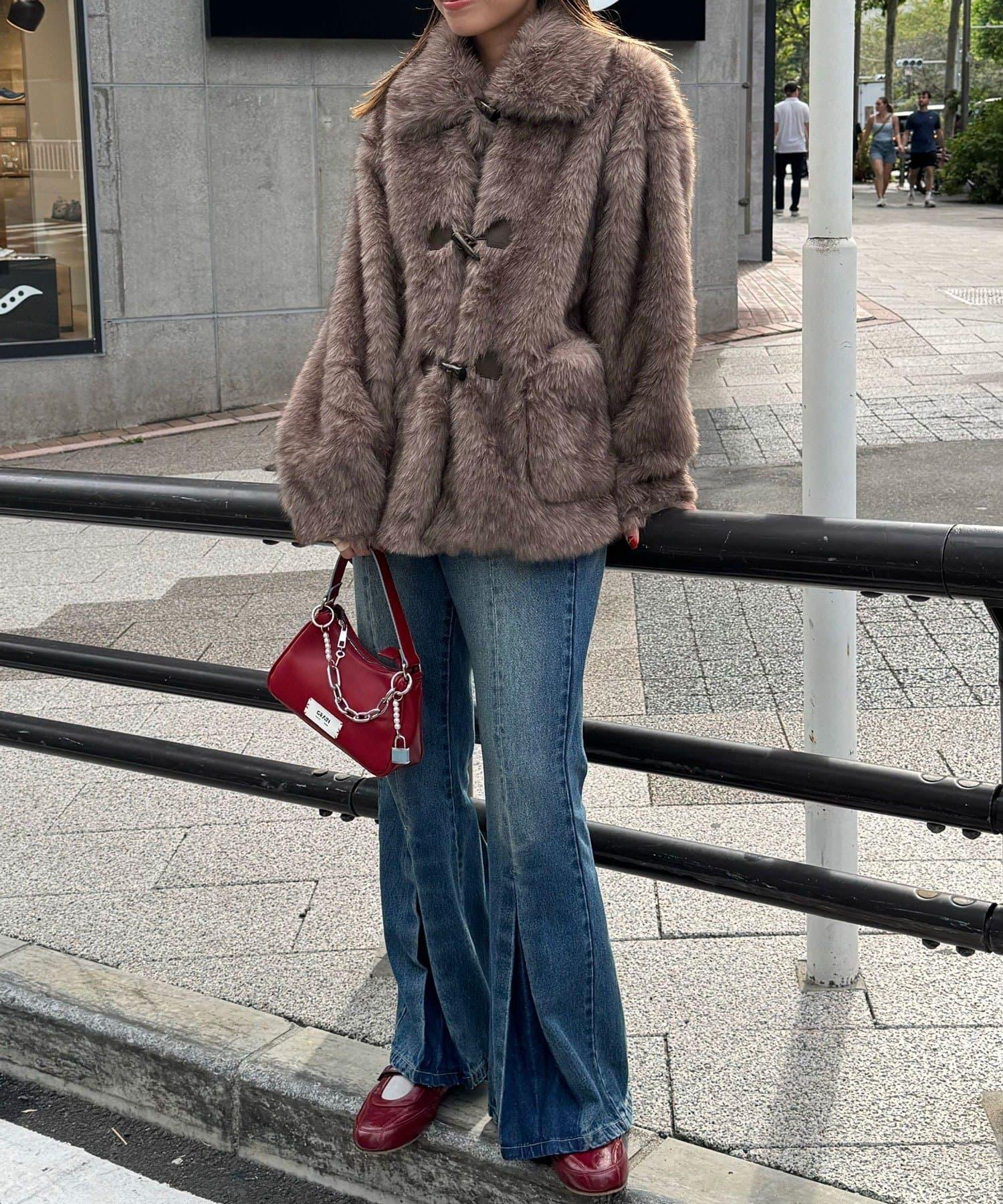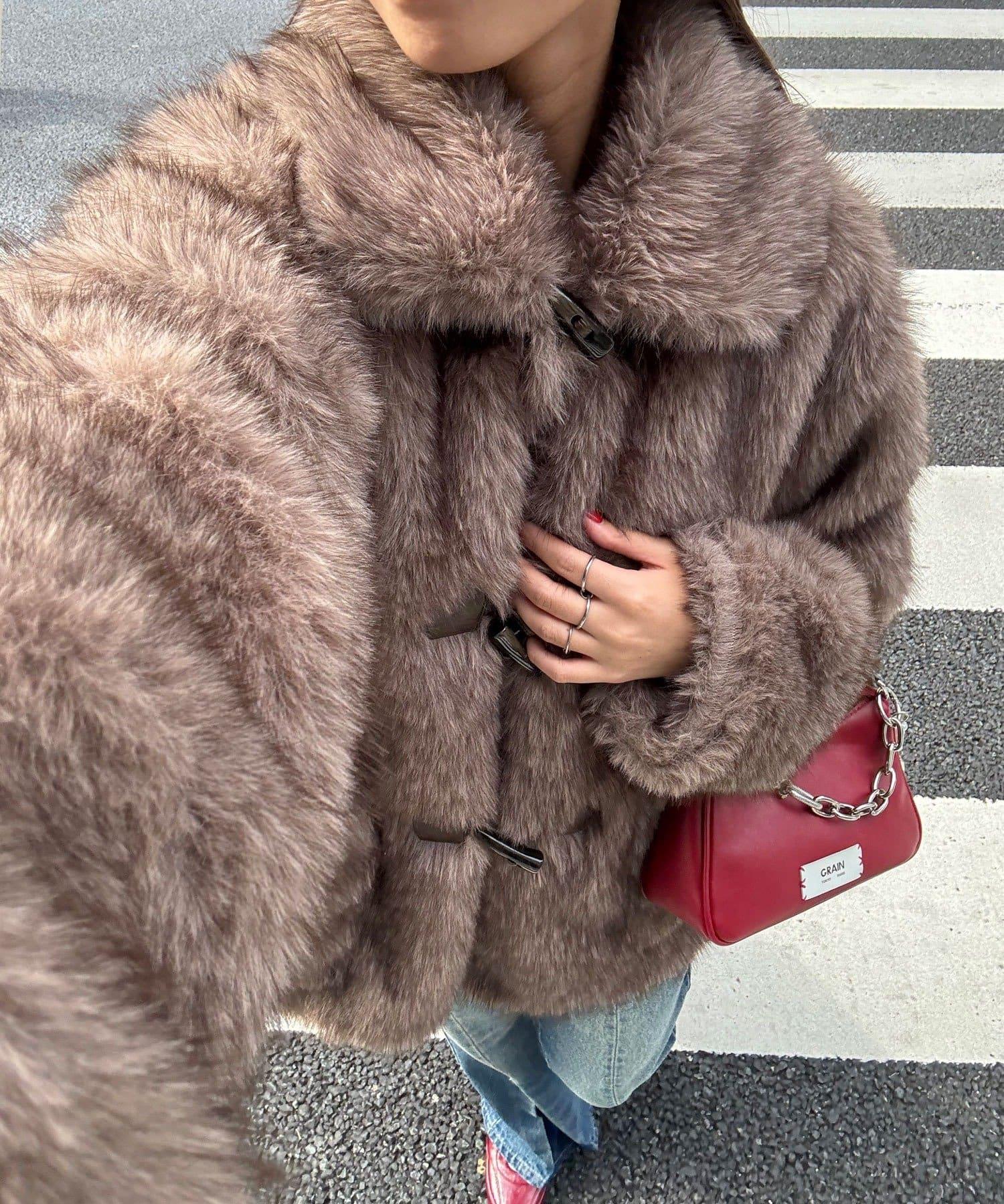 這款帶荷葉邊紐扣的皮草外套有著可愛的蓬鬆體積。