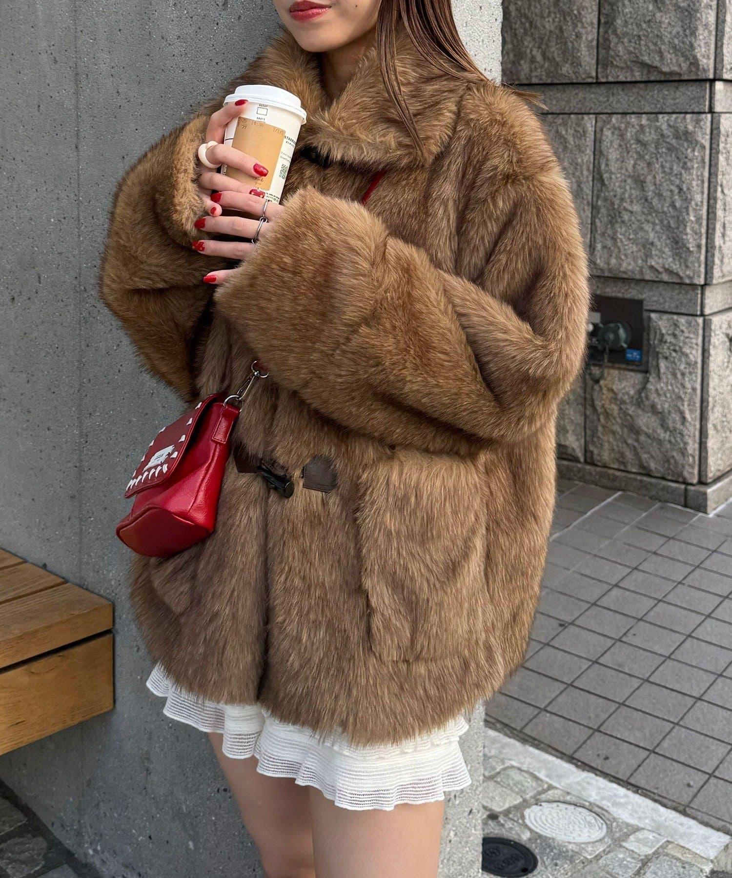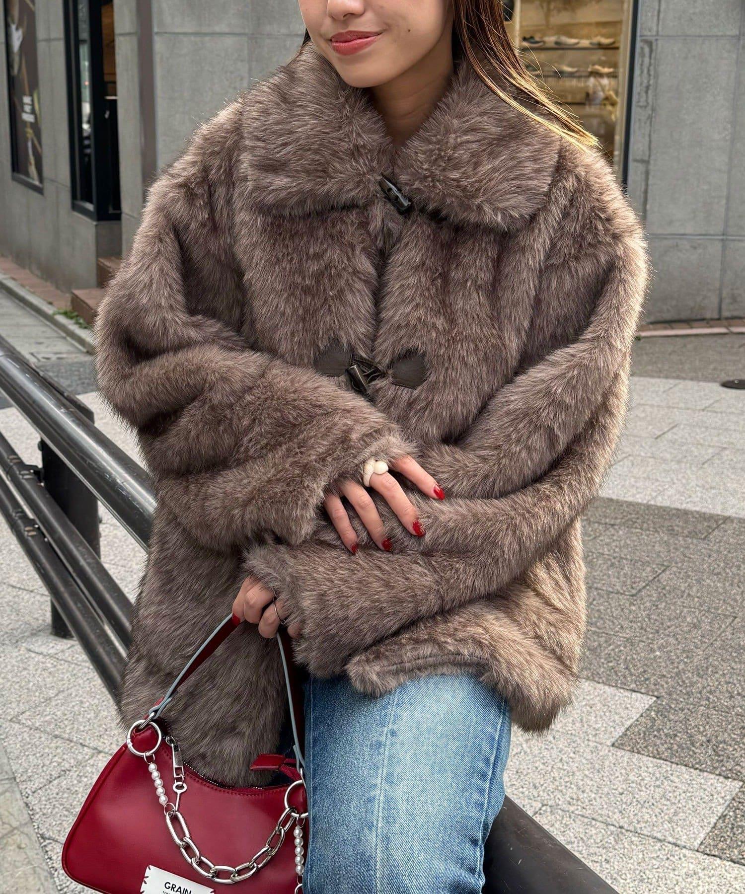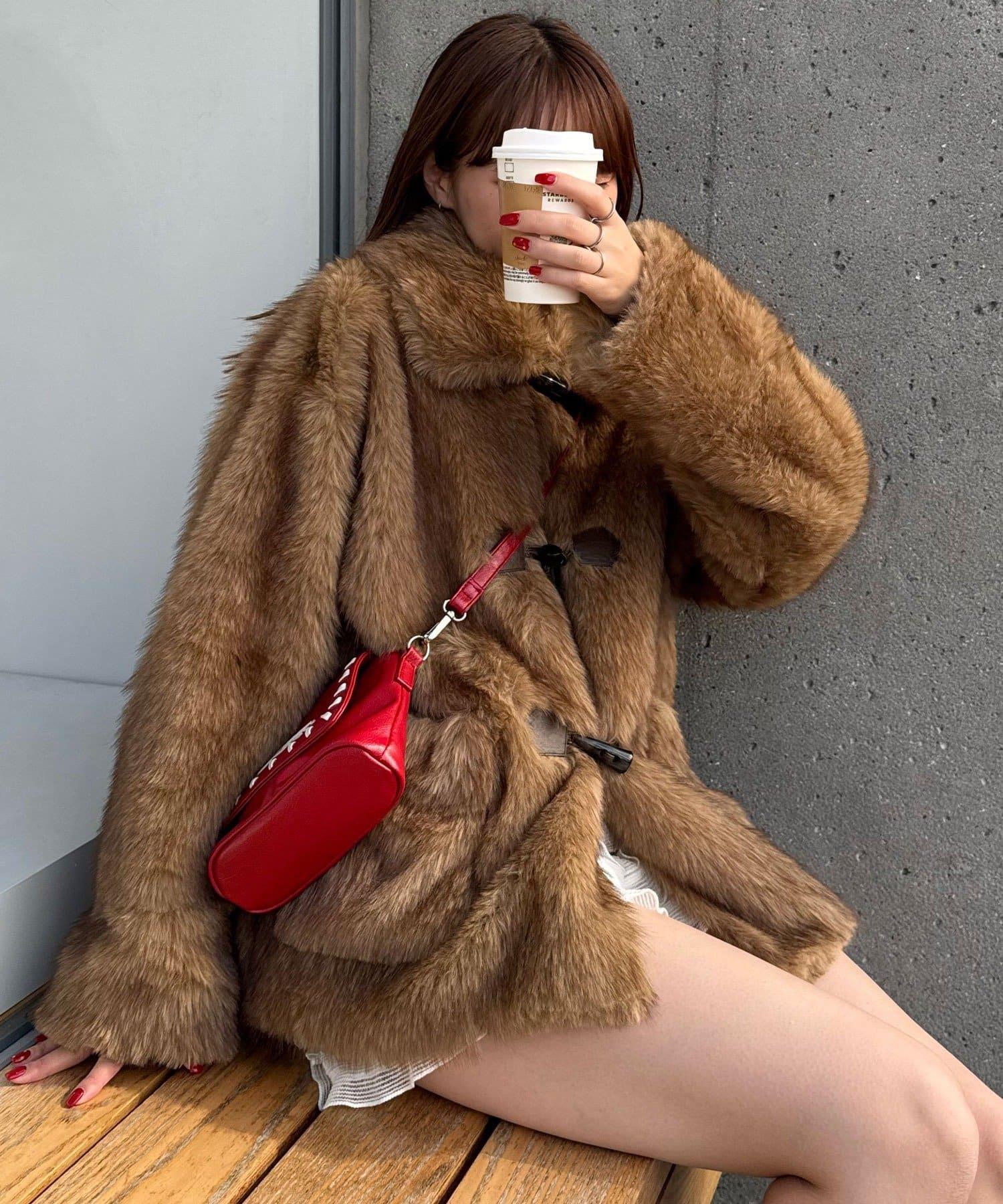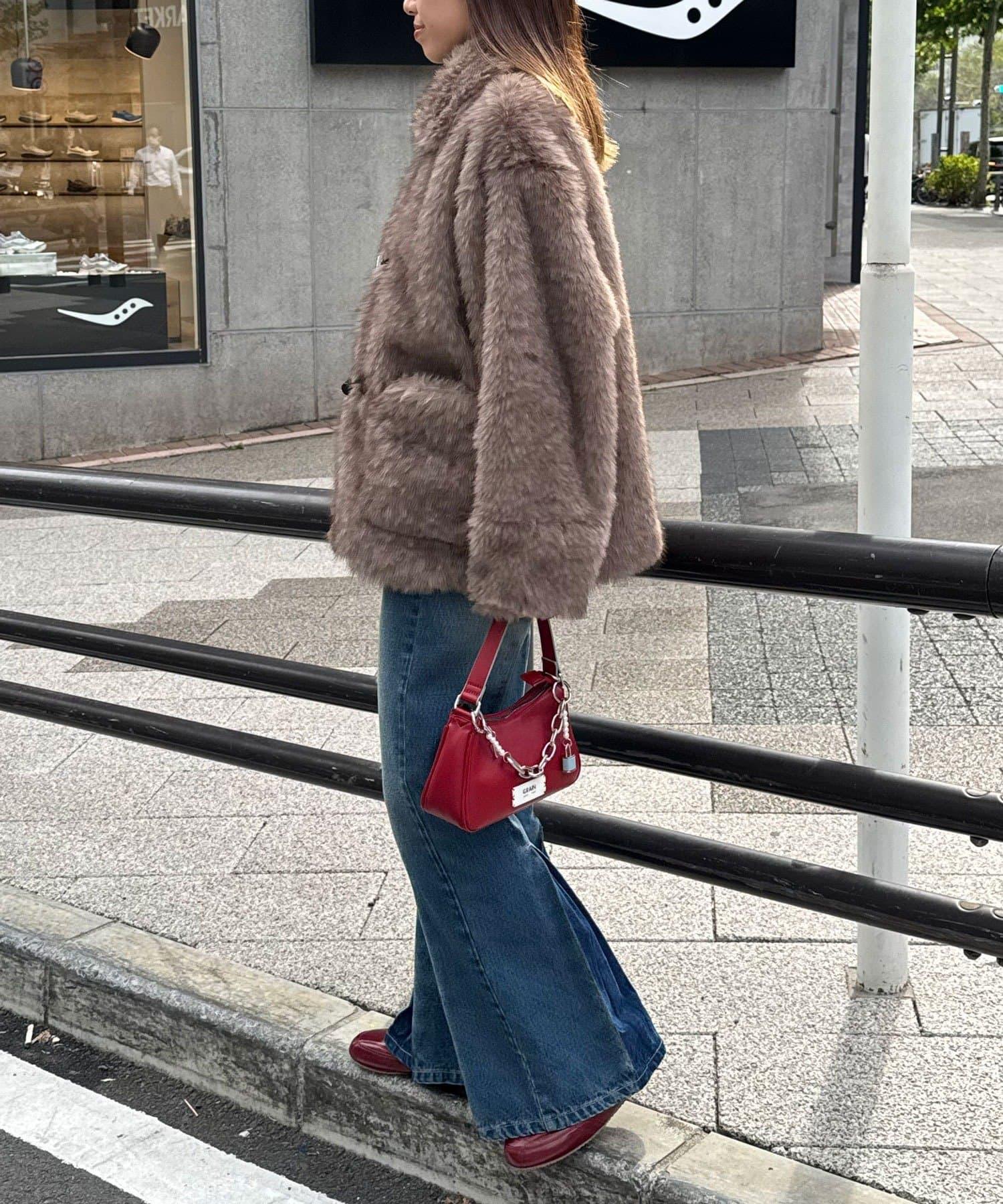 這款帶荷葉邊紐扣的皮草外套有著可愛的蓬鬆體積。