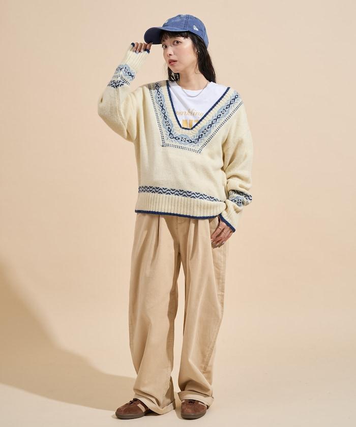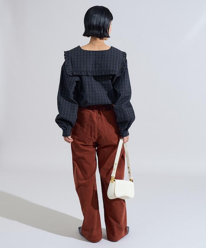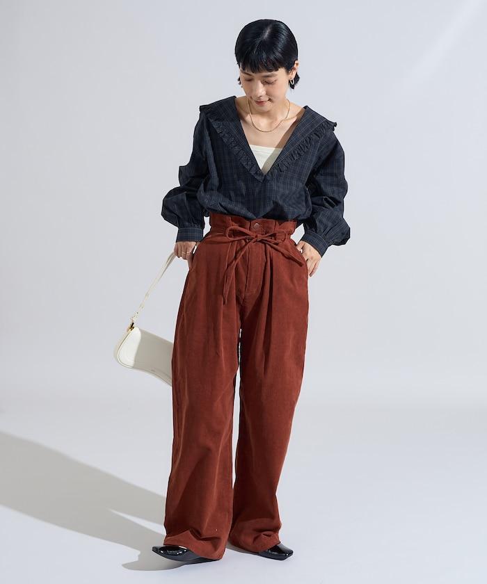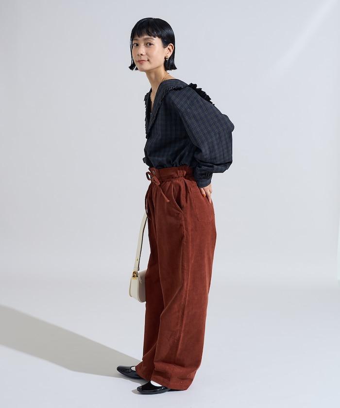 這條燈芯絨長褲的顏色和麵料增強了季節感。