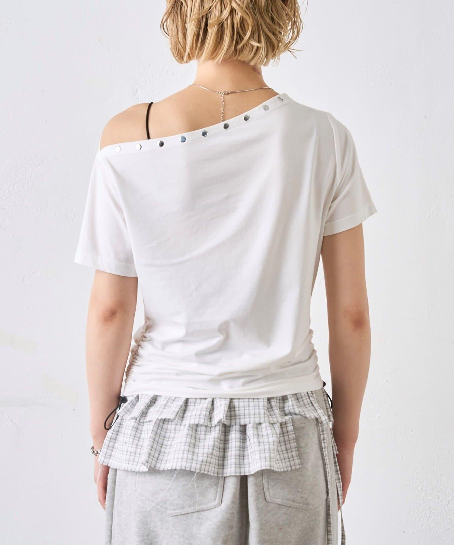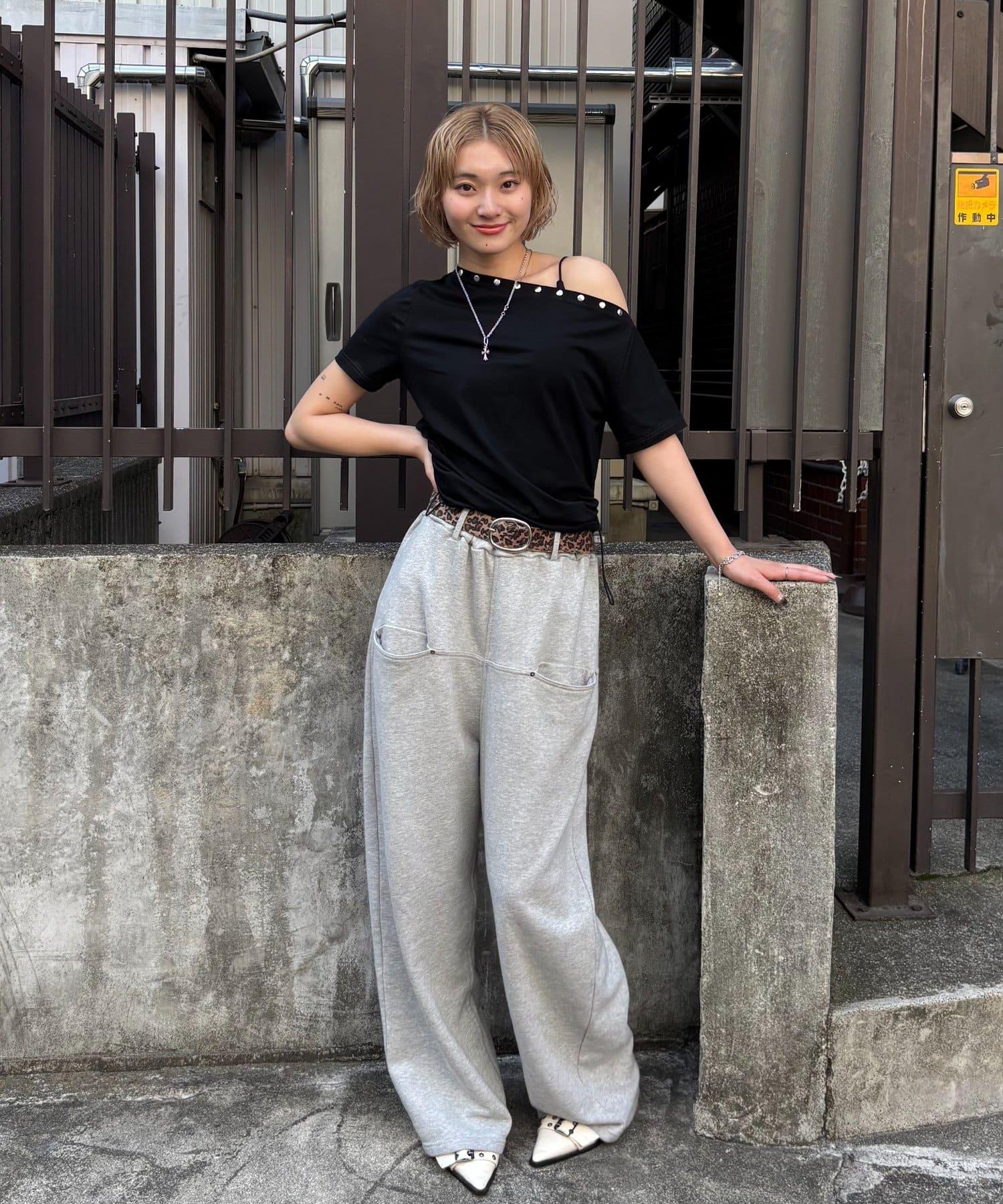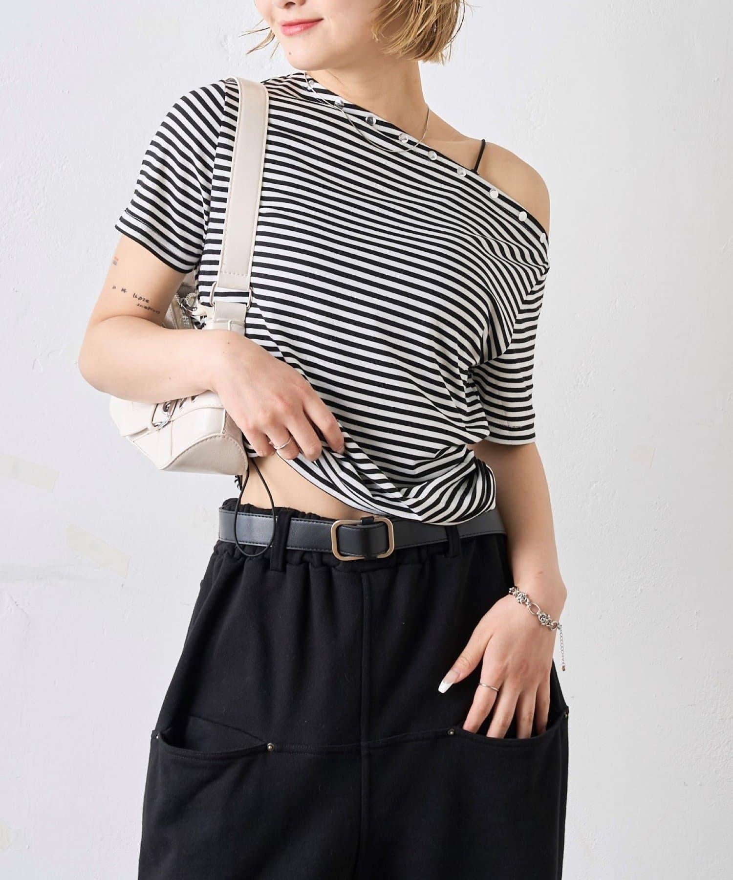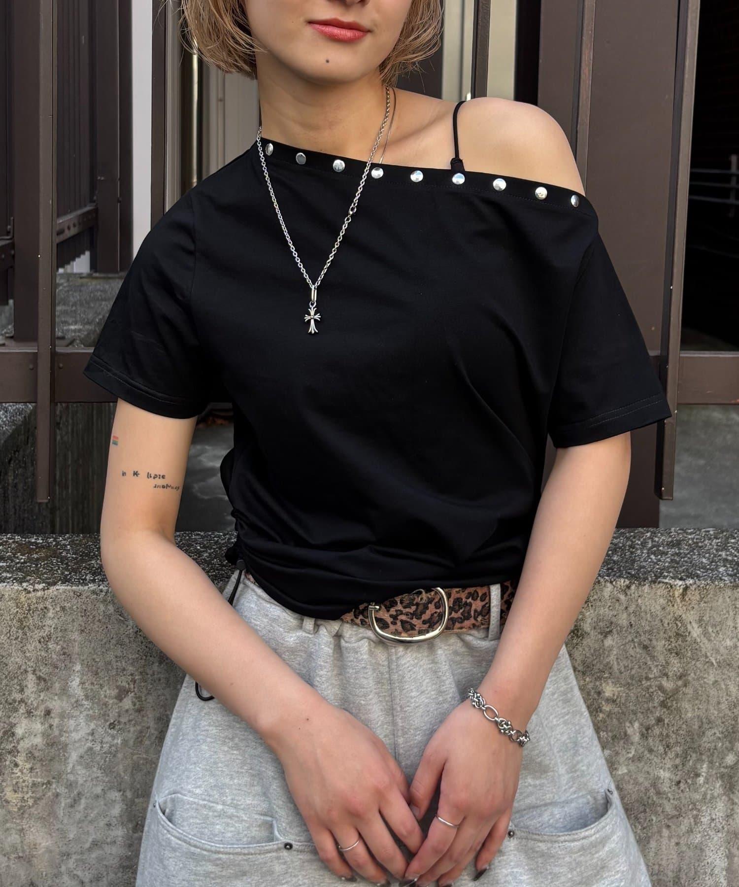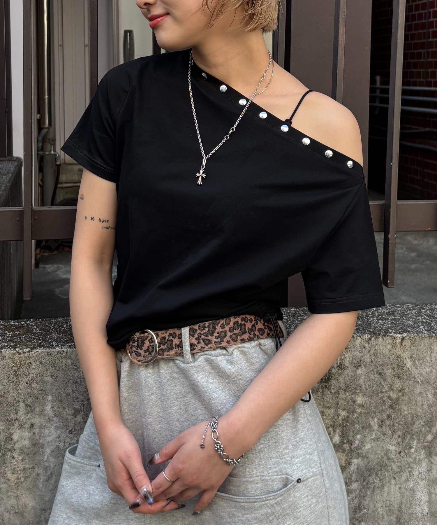 上衣是一件可愛的連體單品,鑲有鉚釘,是單肩的流行趨勢。