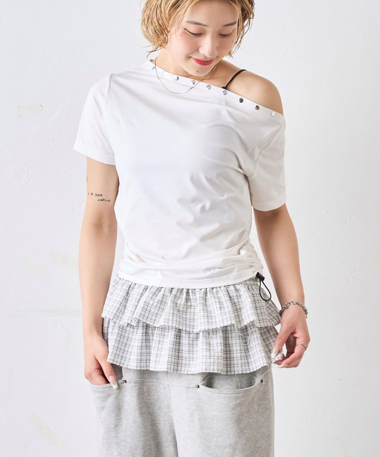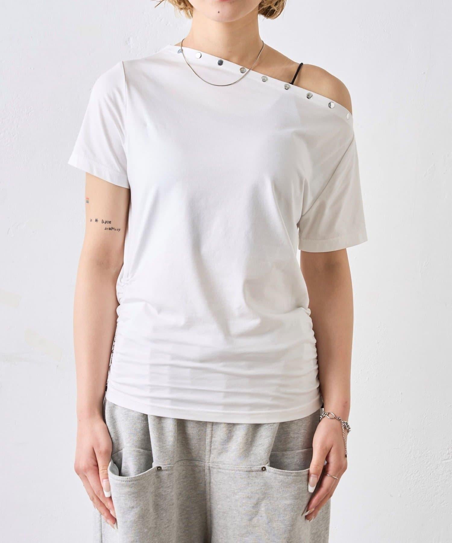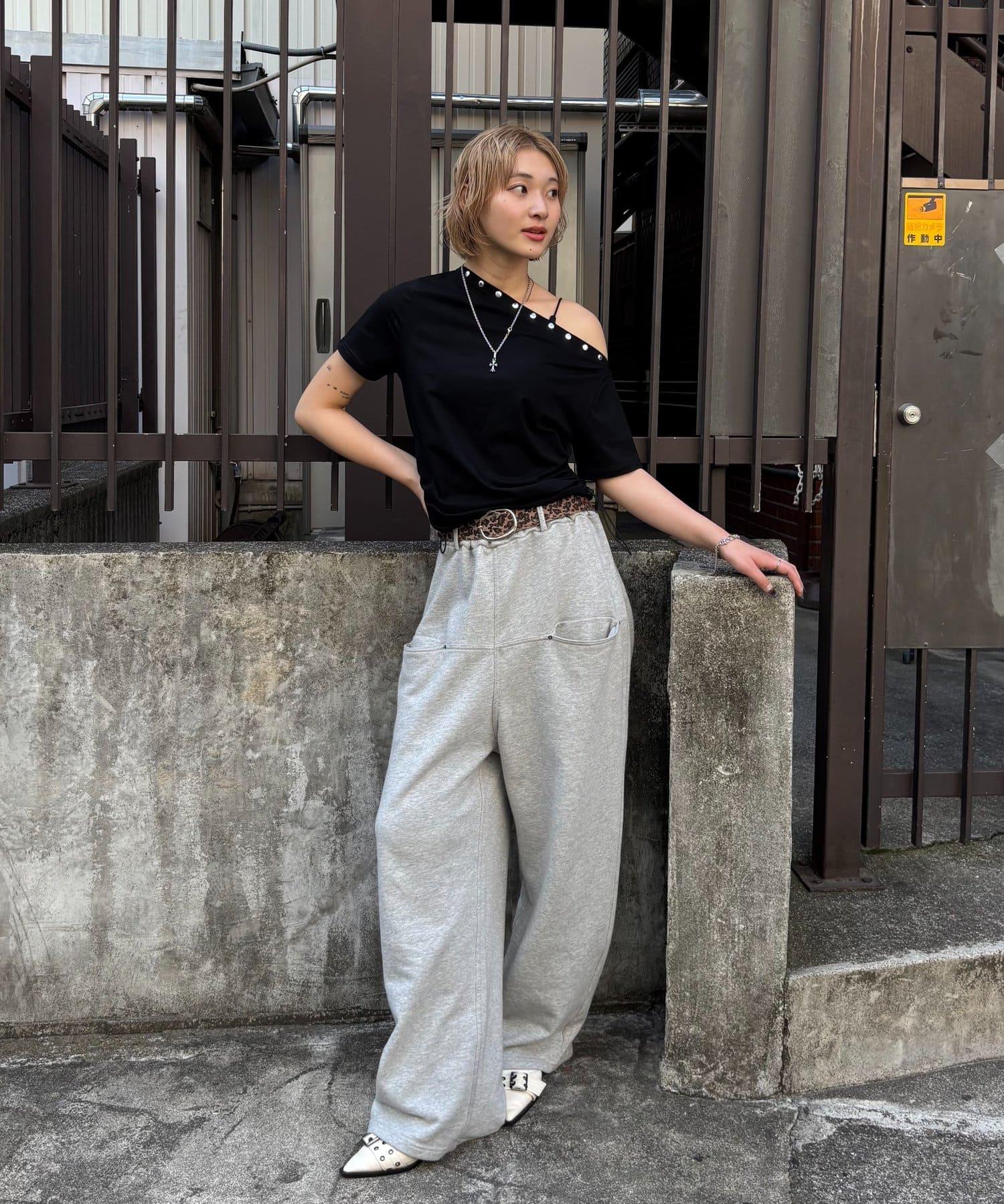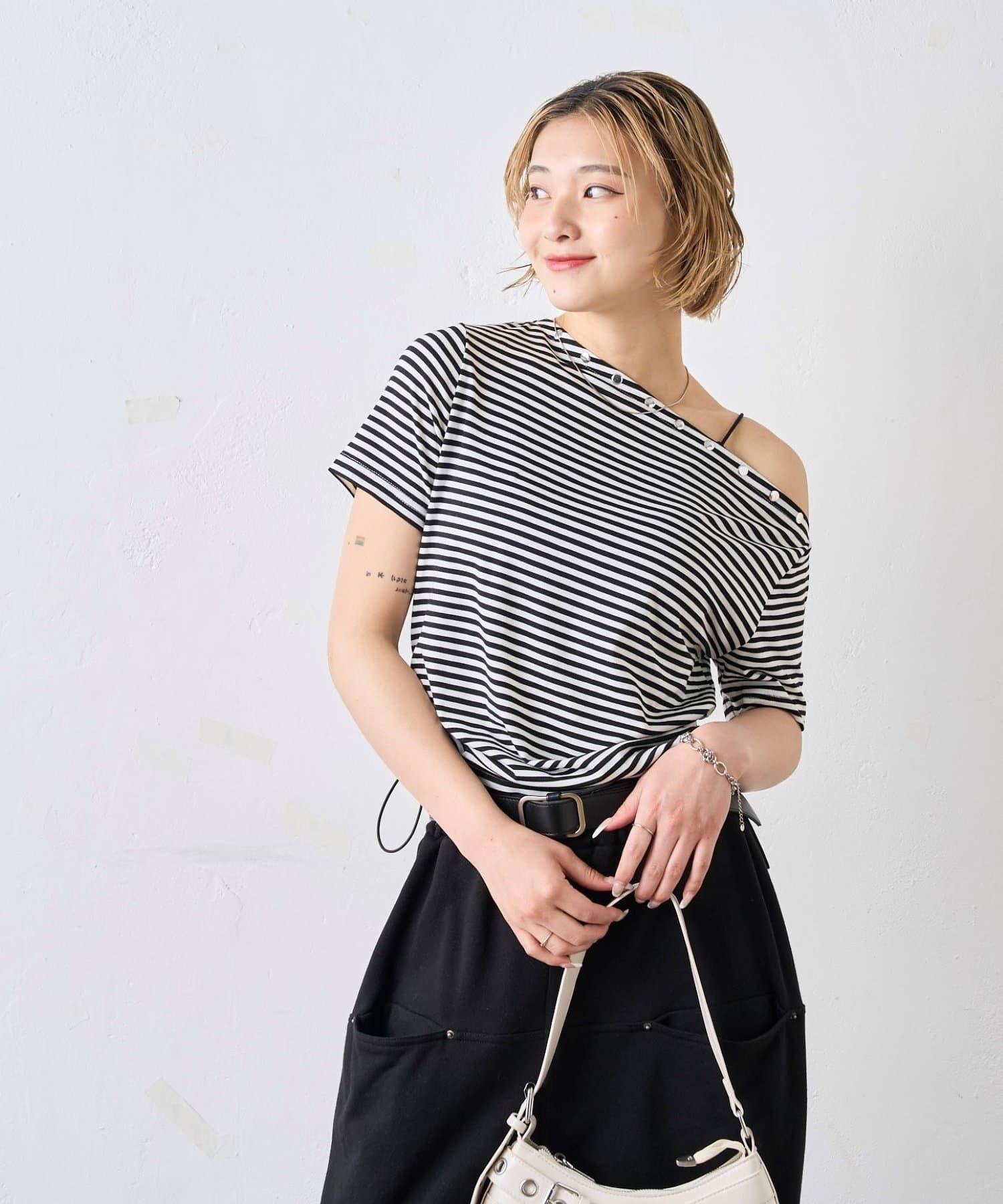 上衣是一件可愛的連體單品,鑲有鉚釘,是單肩的流行趨勢。