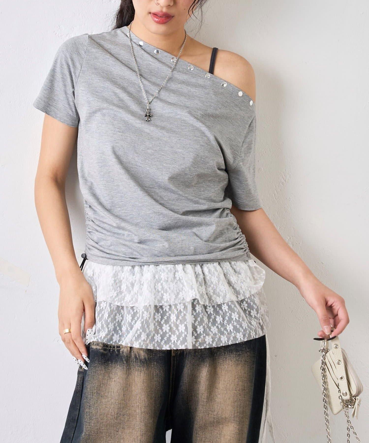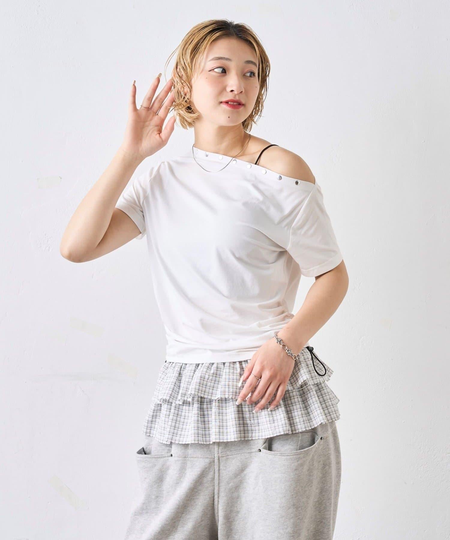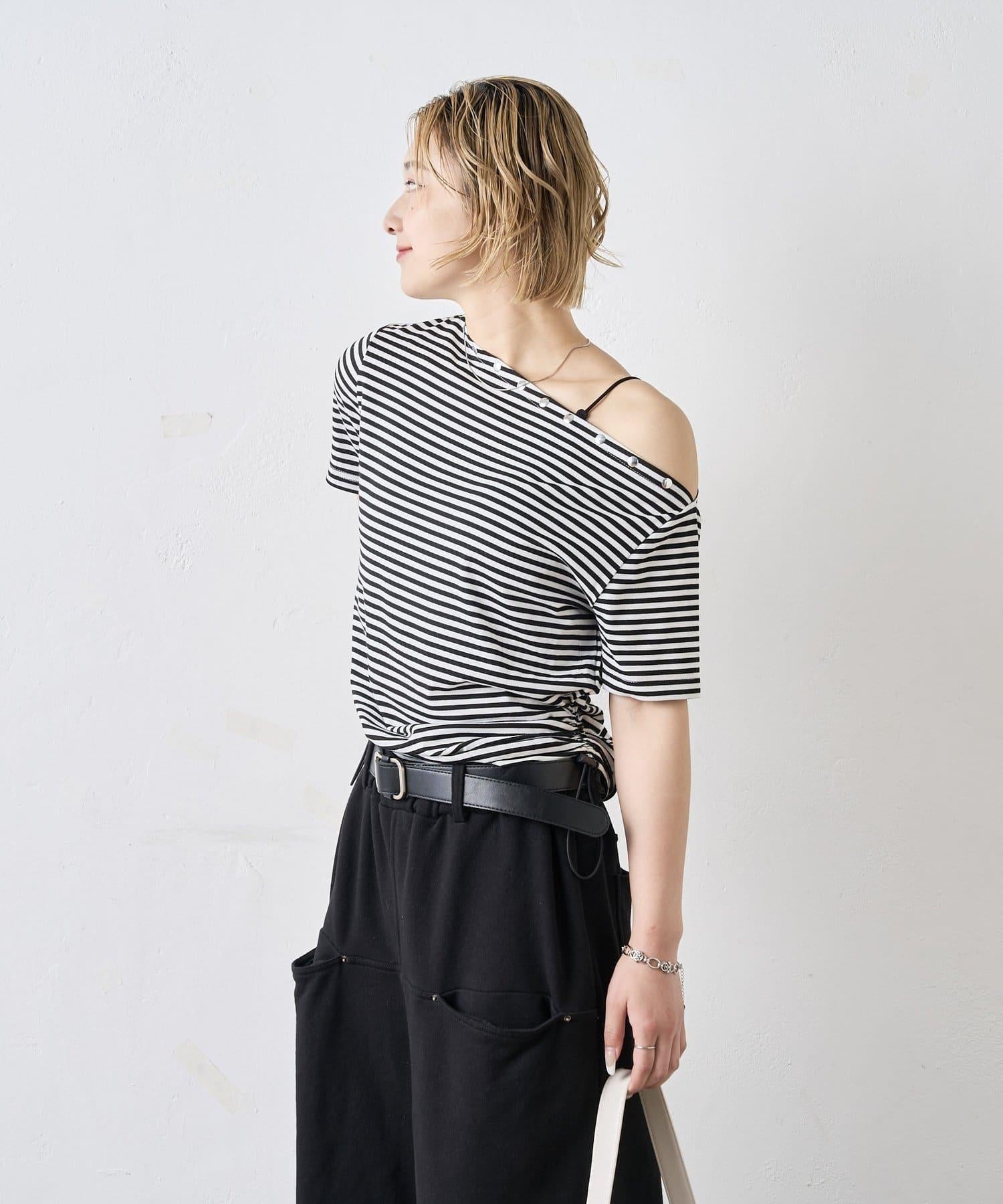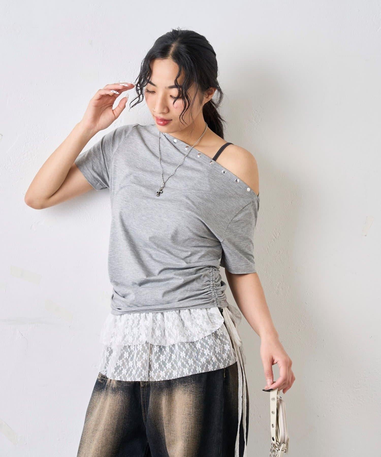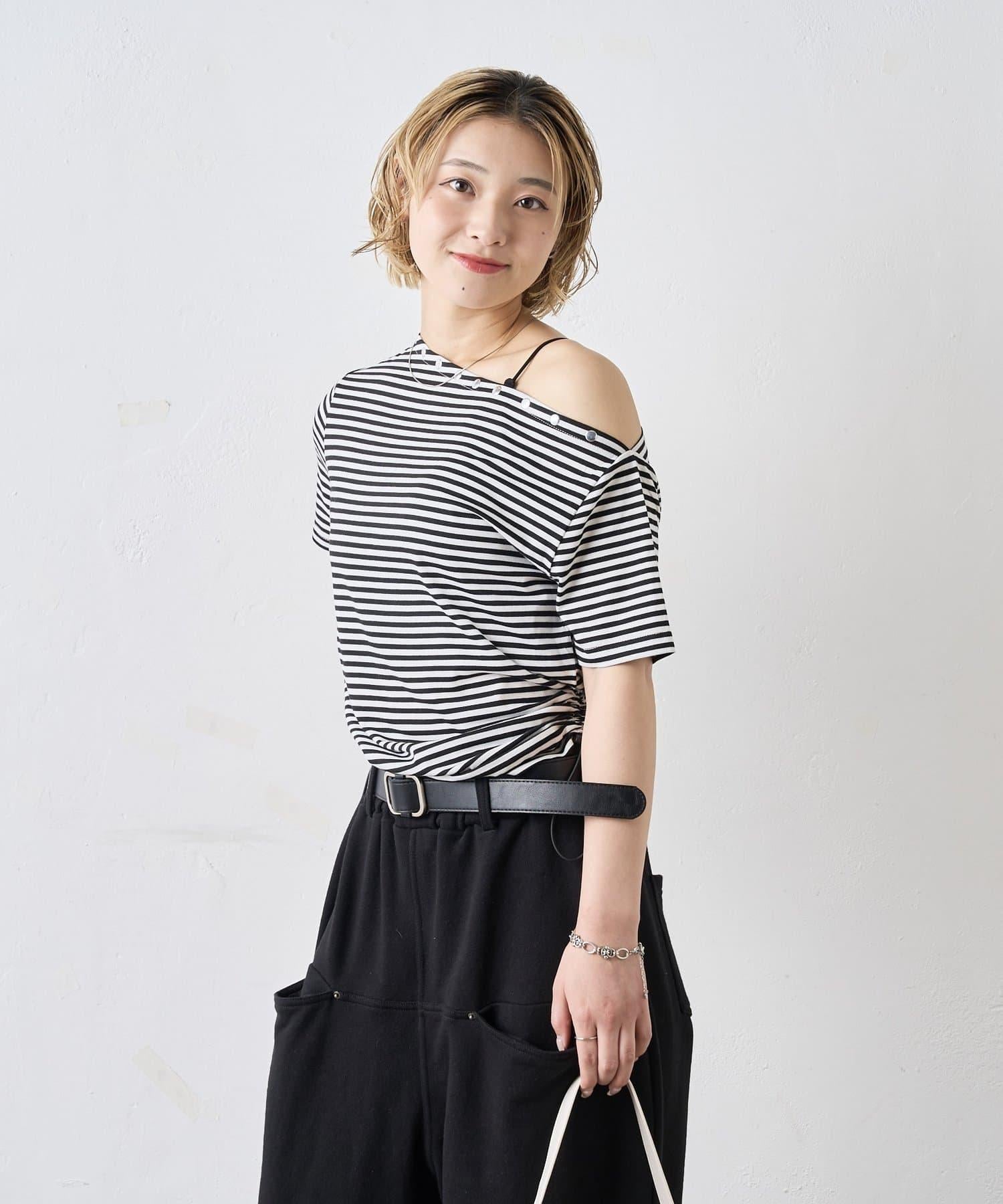 上衣是一件可愛的連體單品,鑲有鉚釘,是單肩的流行趨勢。