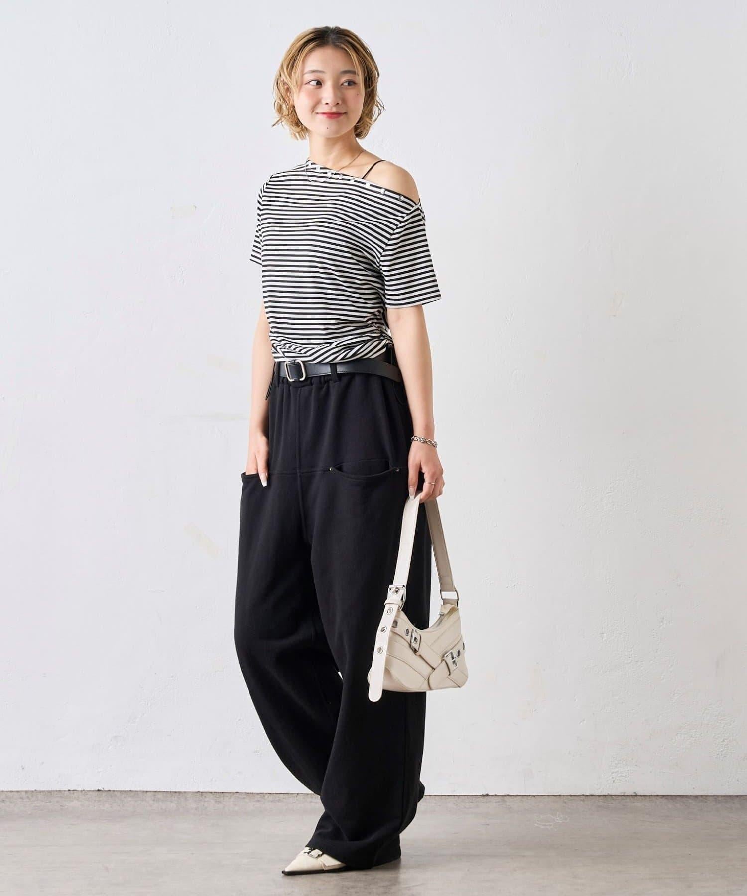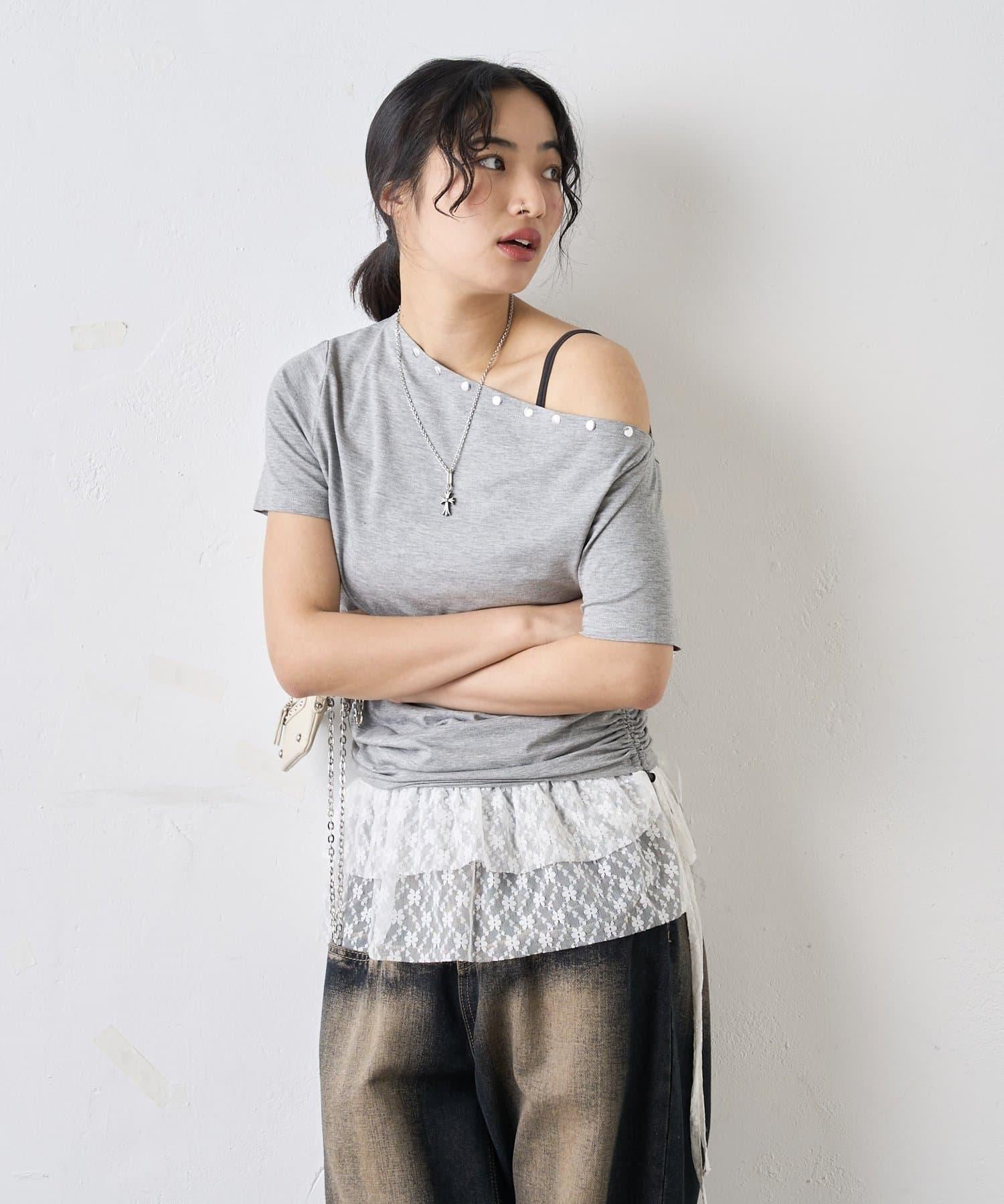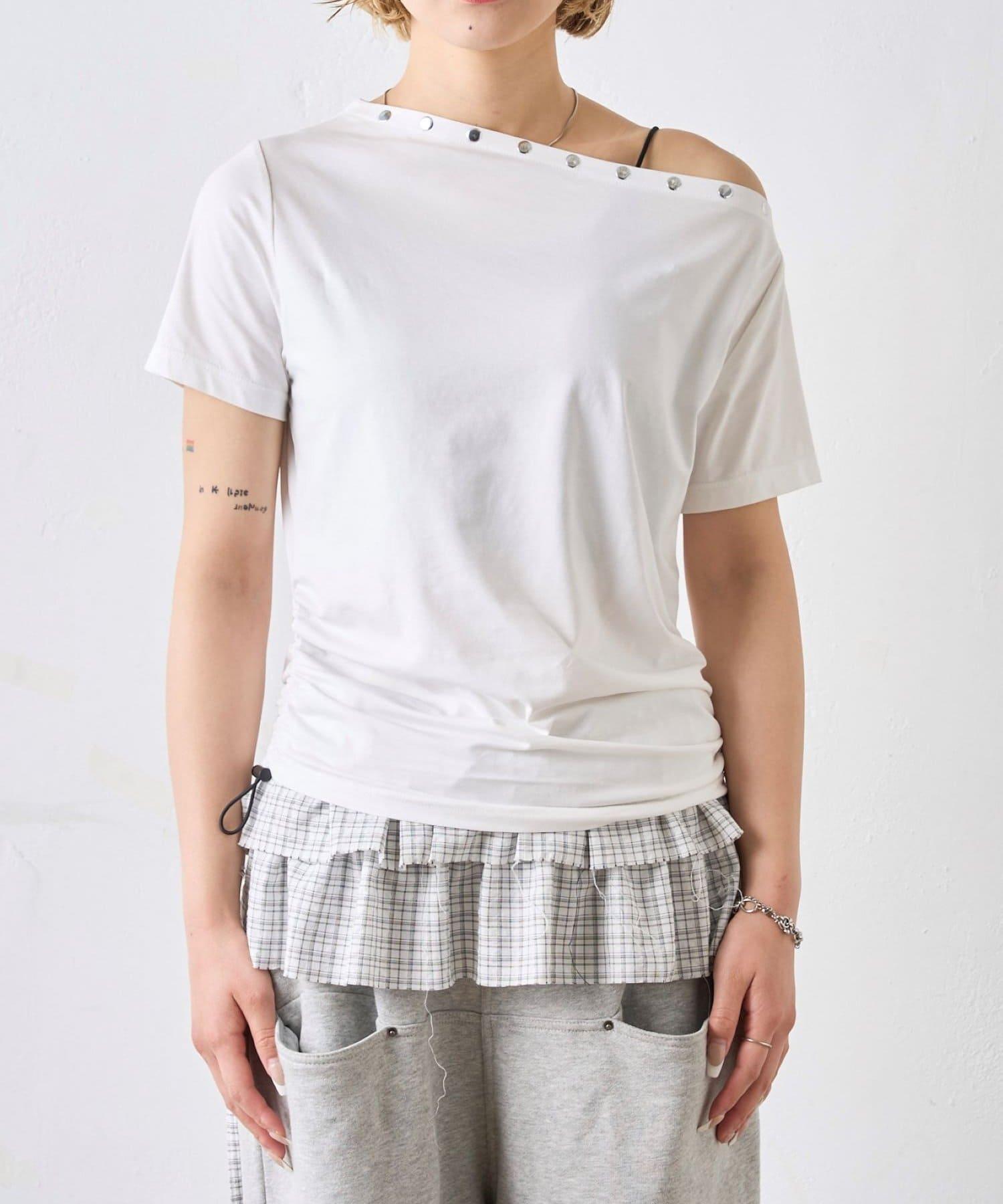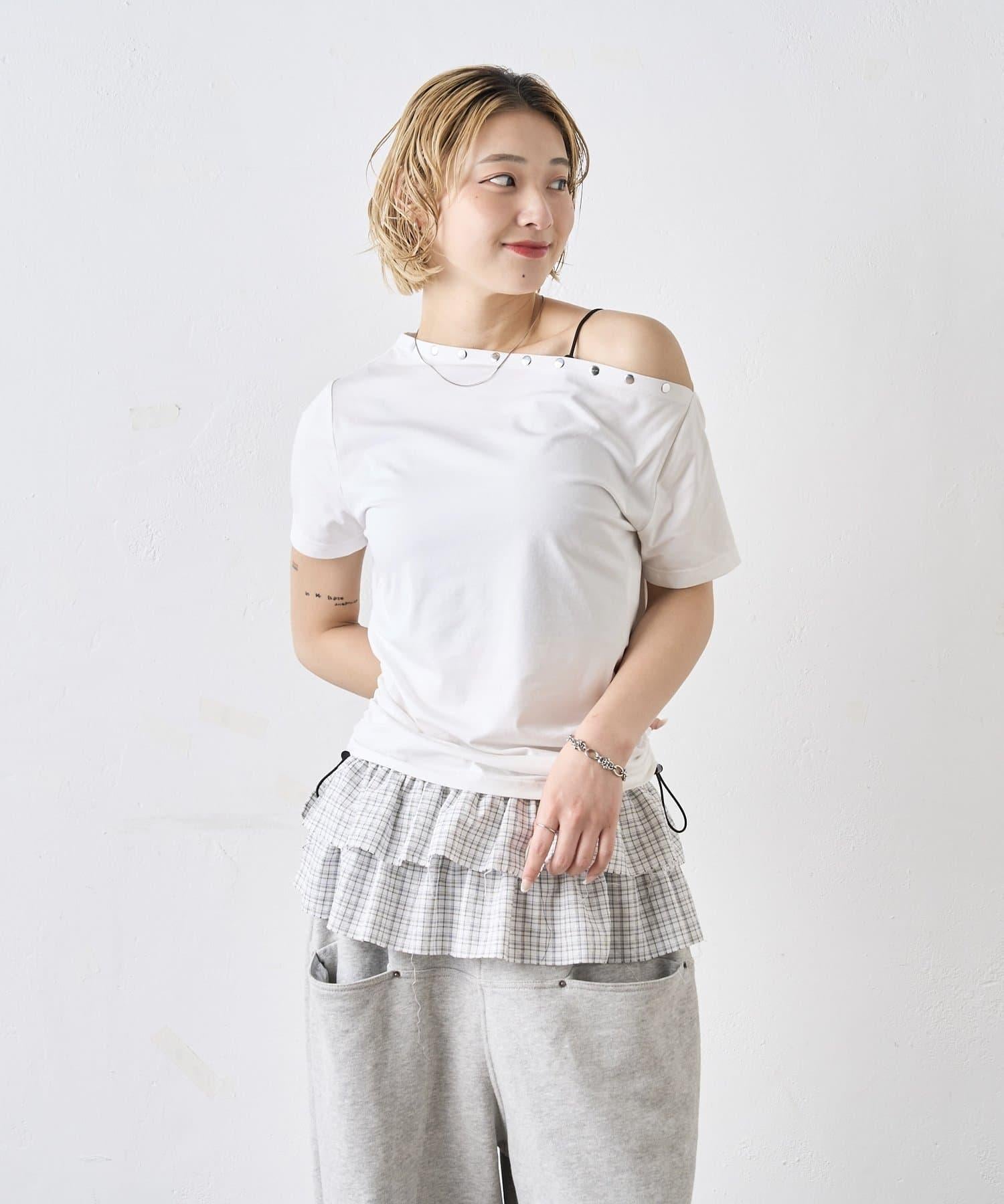 上衣是一件可愛的連體單品,鑲有鉚釘,是單肩的流行趨勢。