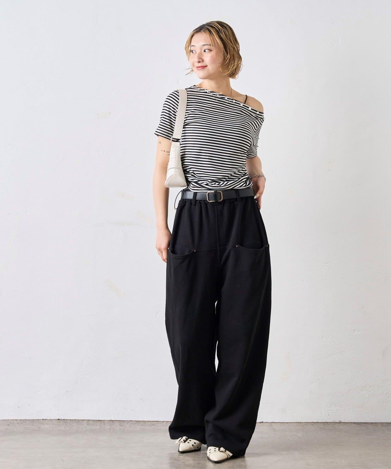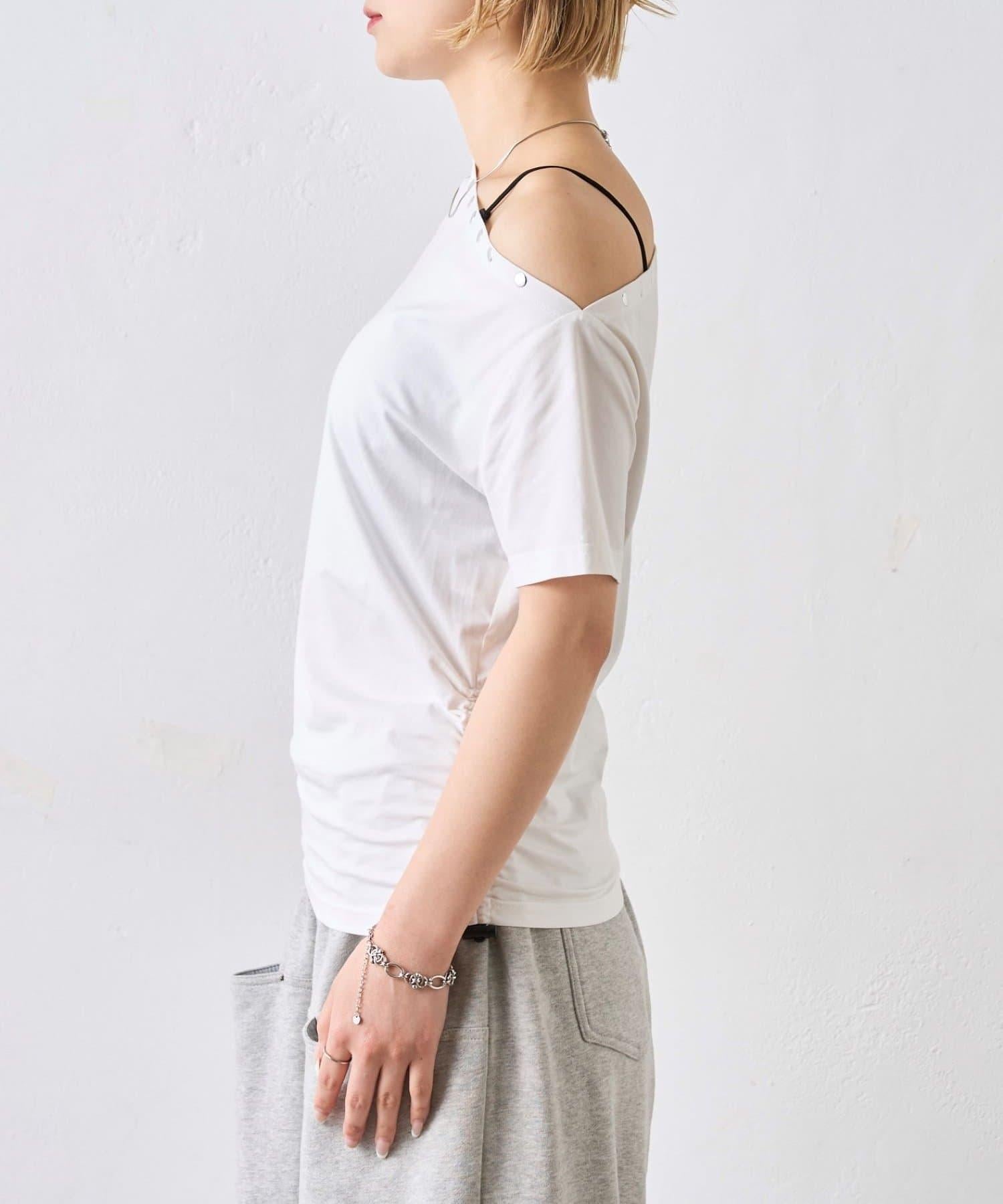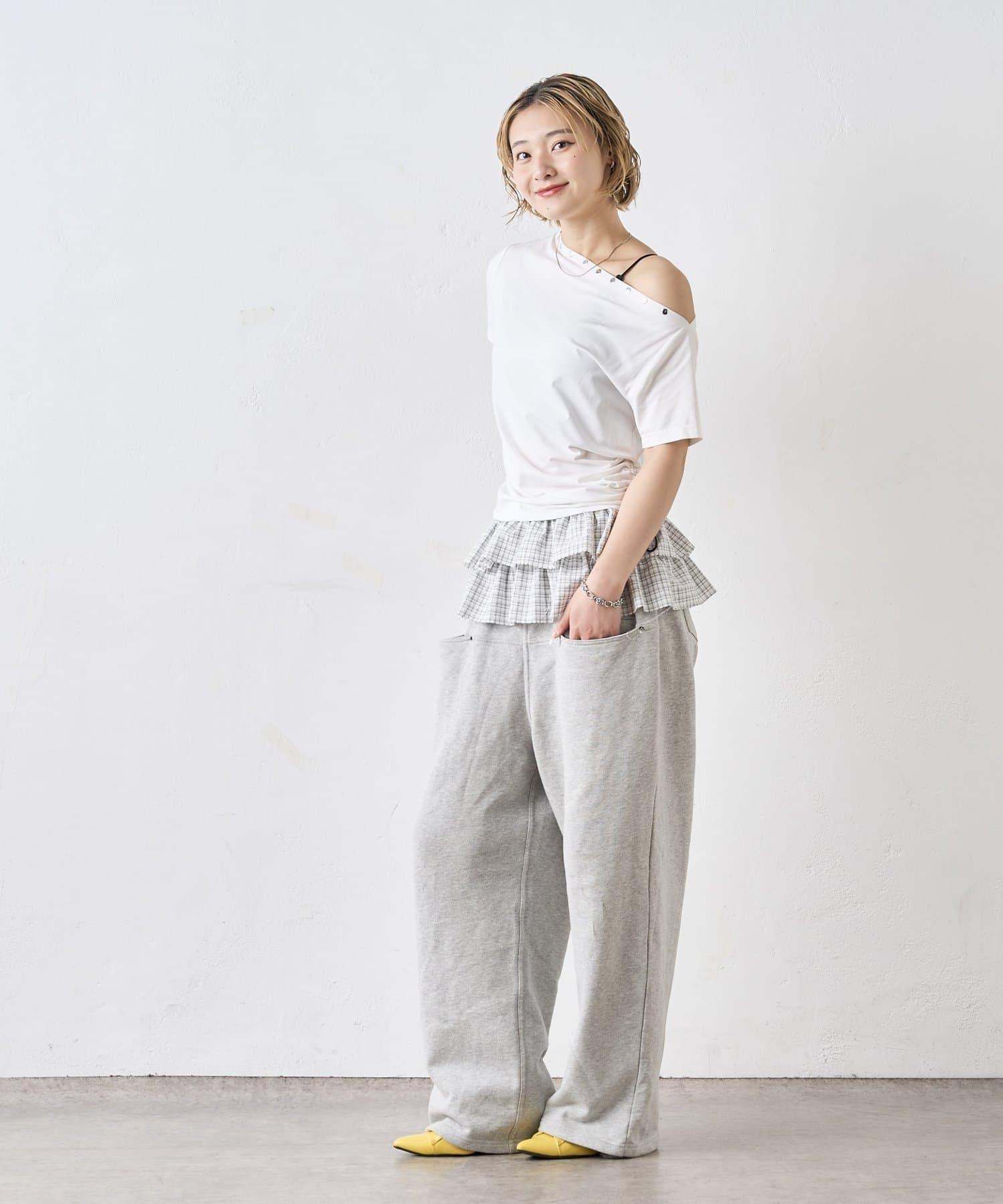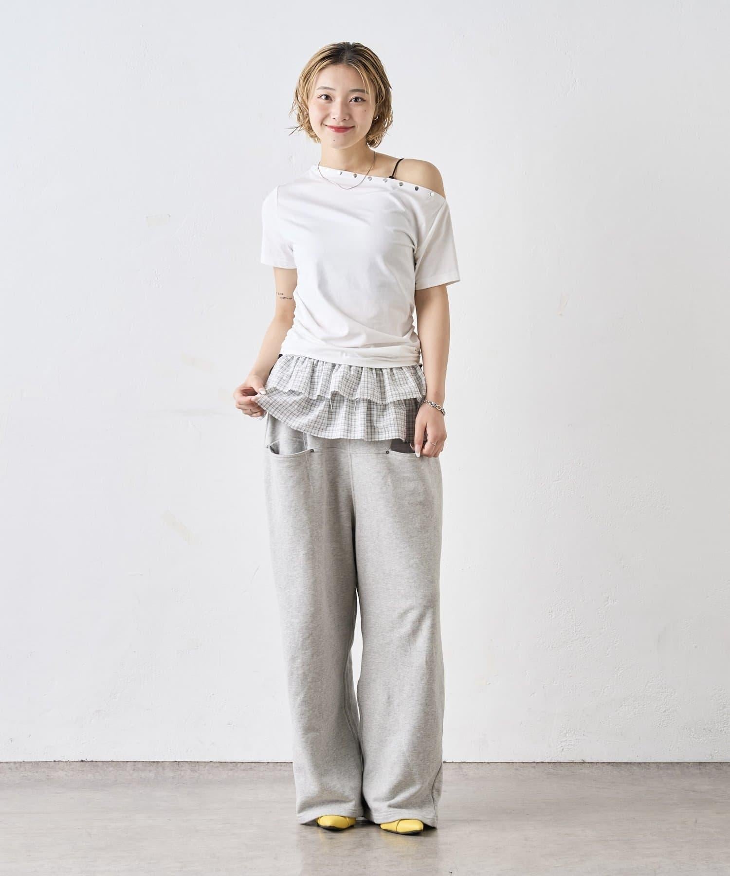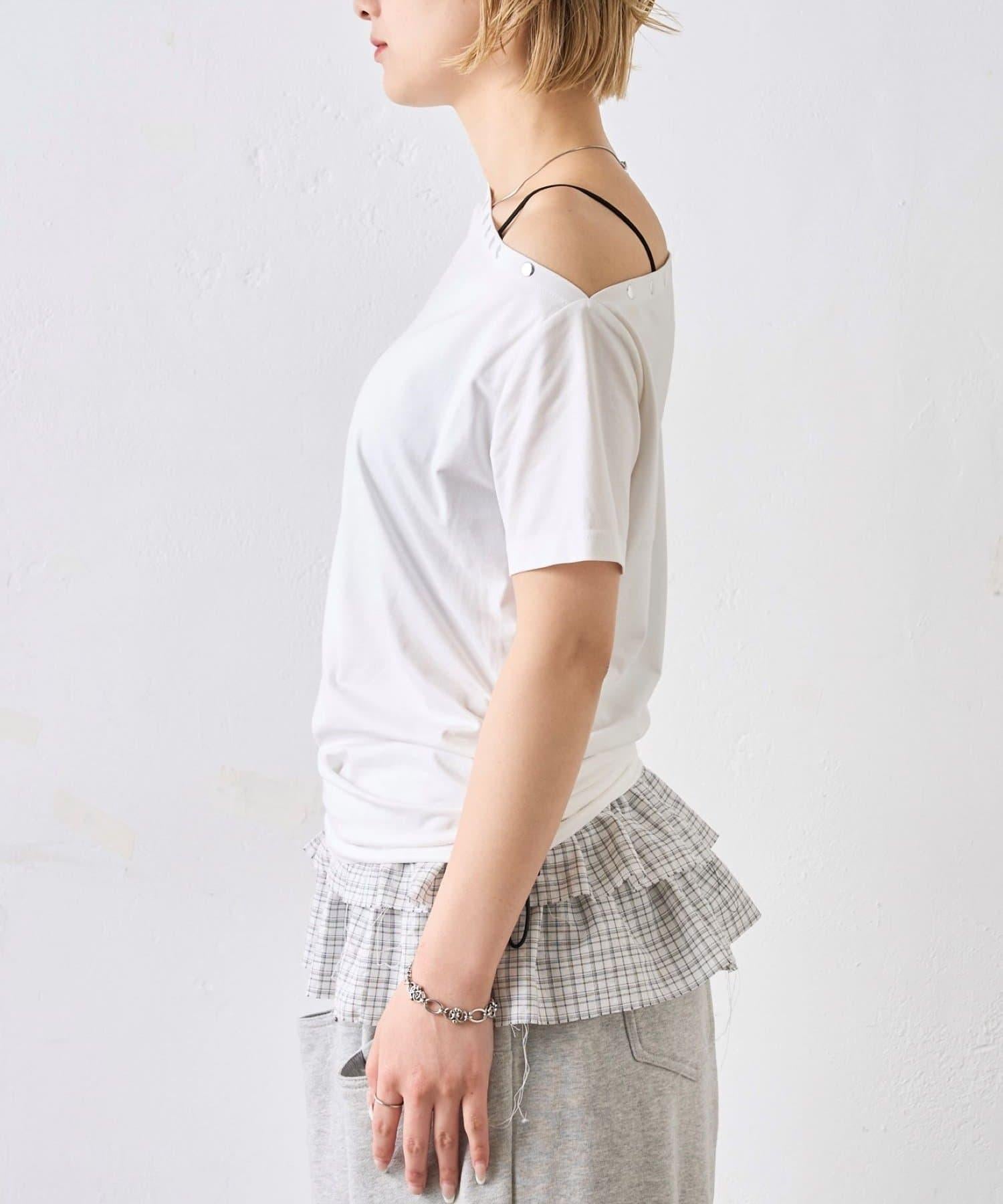 上衣是一件可愛的連體單品,鑲有鉚釘,是單肩的流行趨勢。