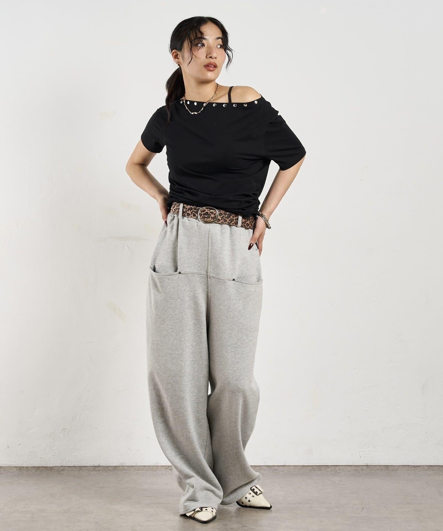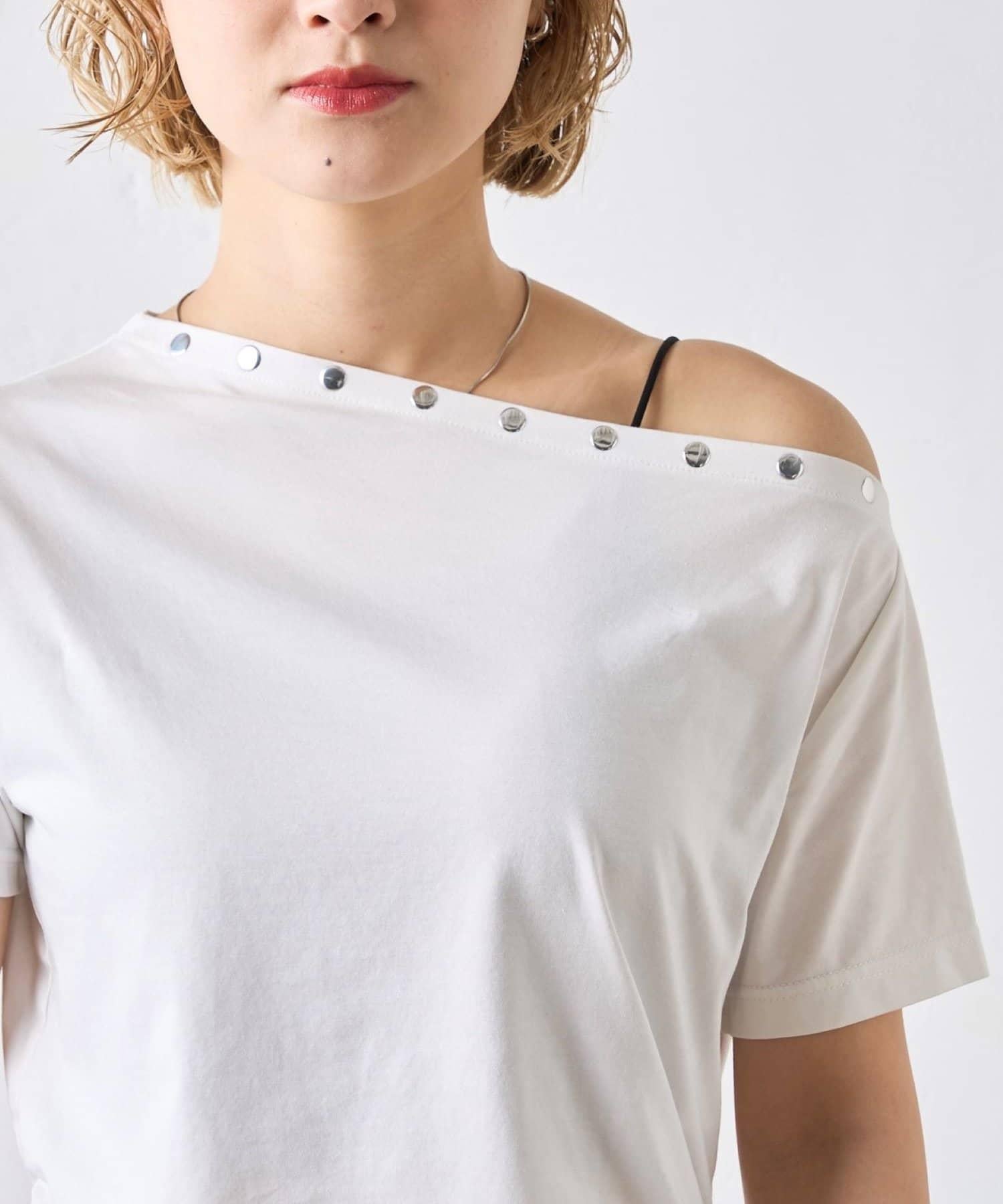 這款上衣將頸部鉚釘的酷感與一字肩上衣的柔美結合在一起。