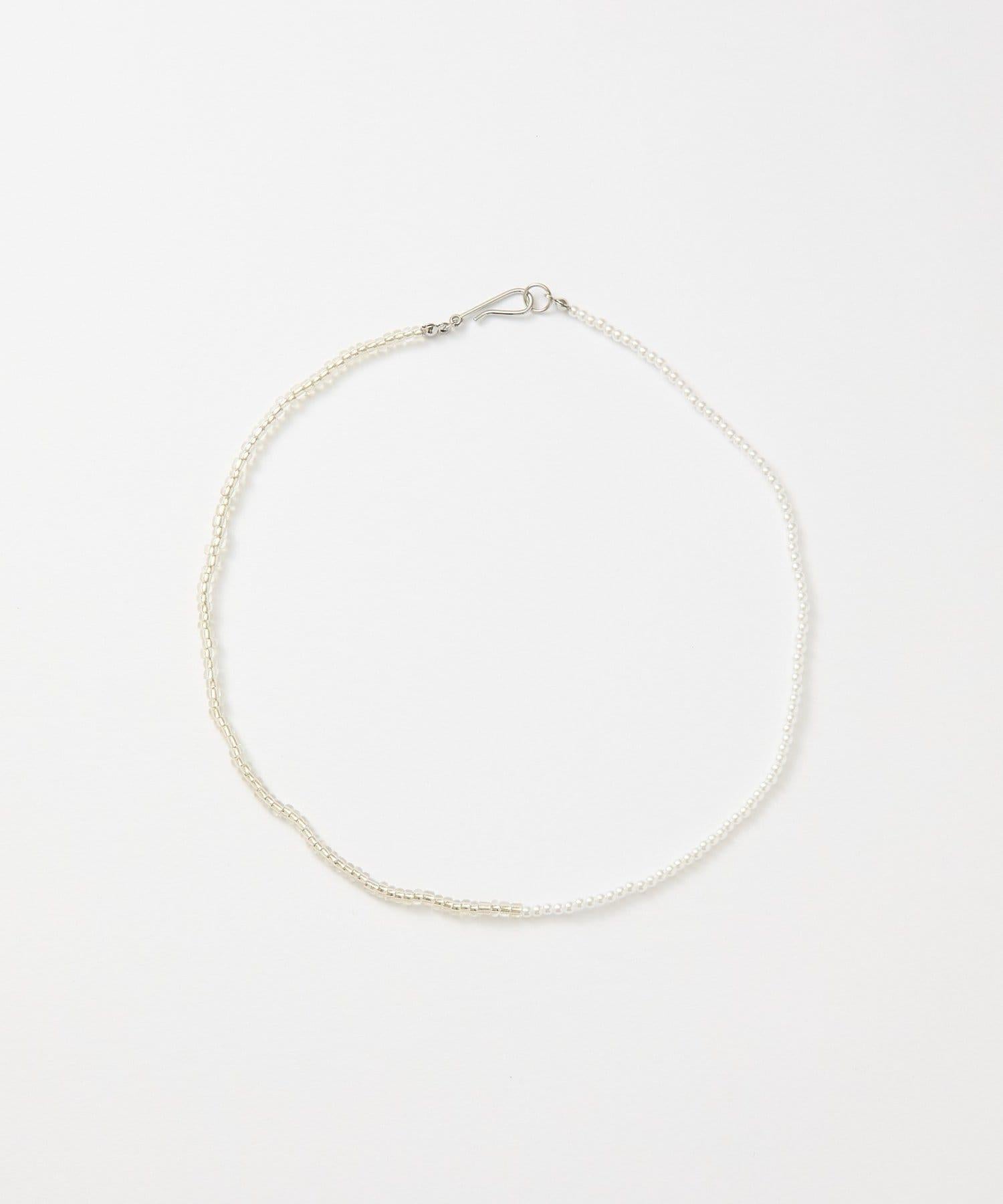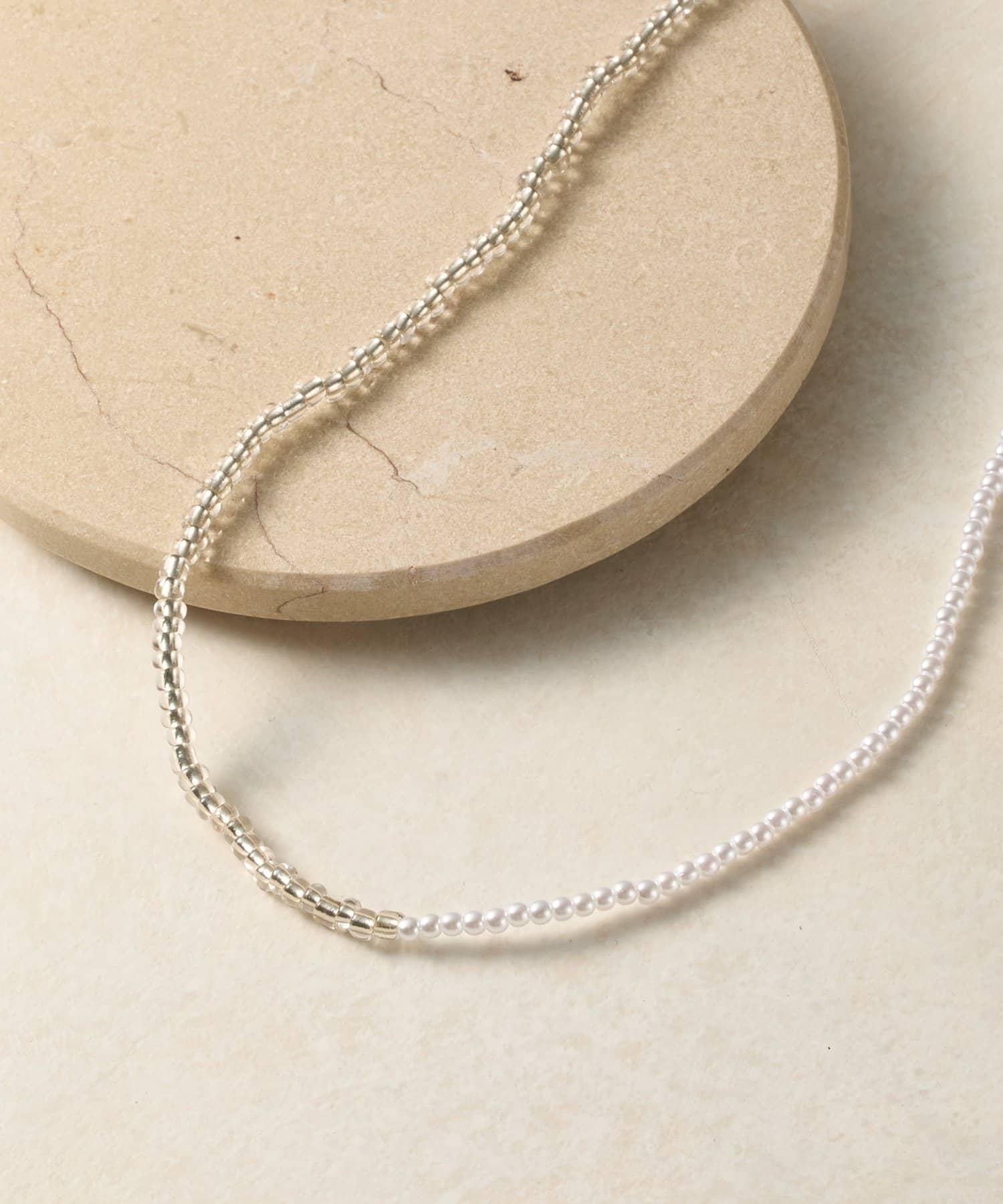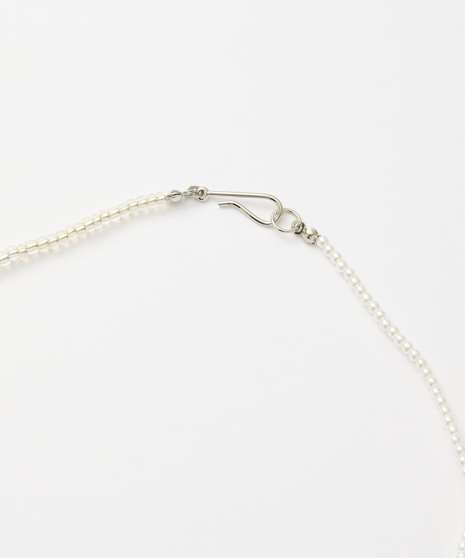 這款時尚項鍊兩側飾有透明玻璃珠和樹脂珍珠,在頸間營造出女性的迷人魅力。