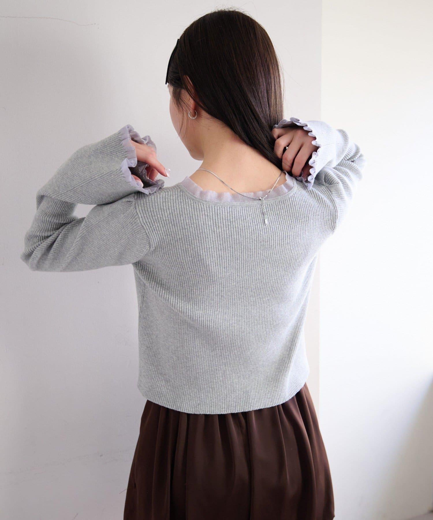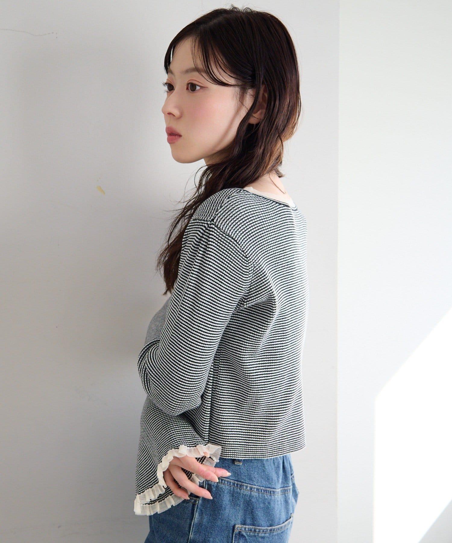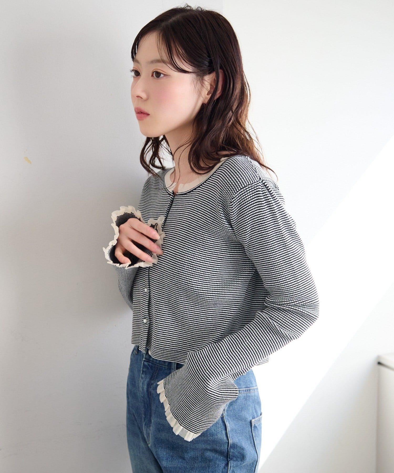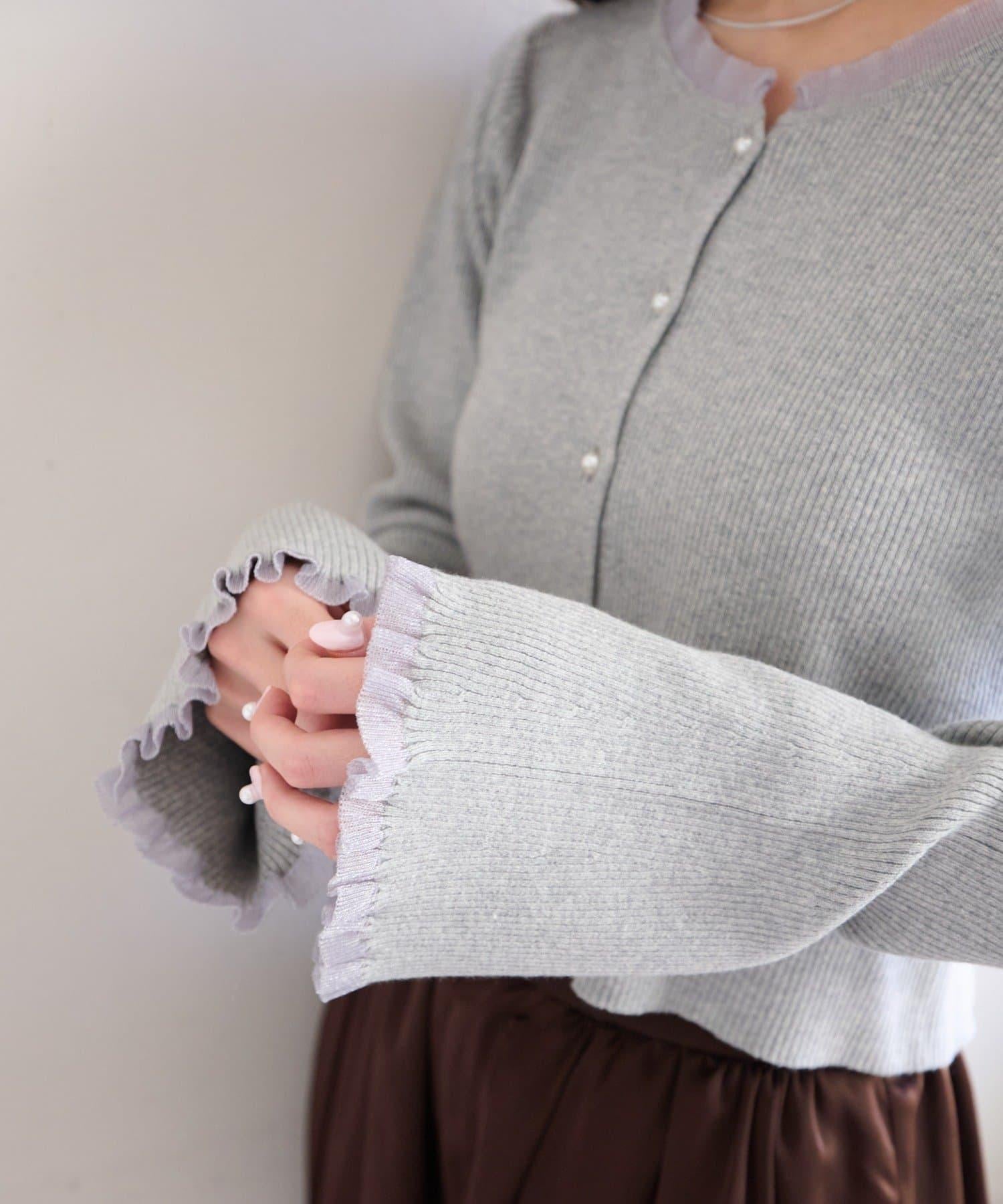 精緻的荷葉邊和珍珠鈕釦吸引著人們的目光,是一款女性化的開襟羊毛衫。