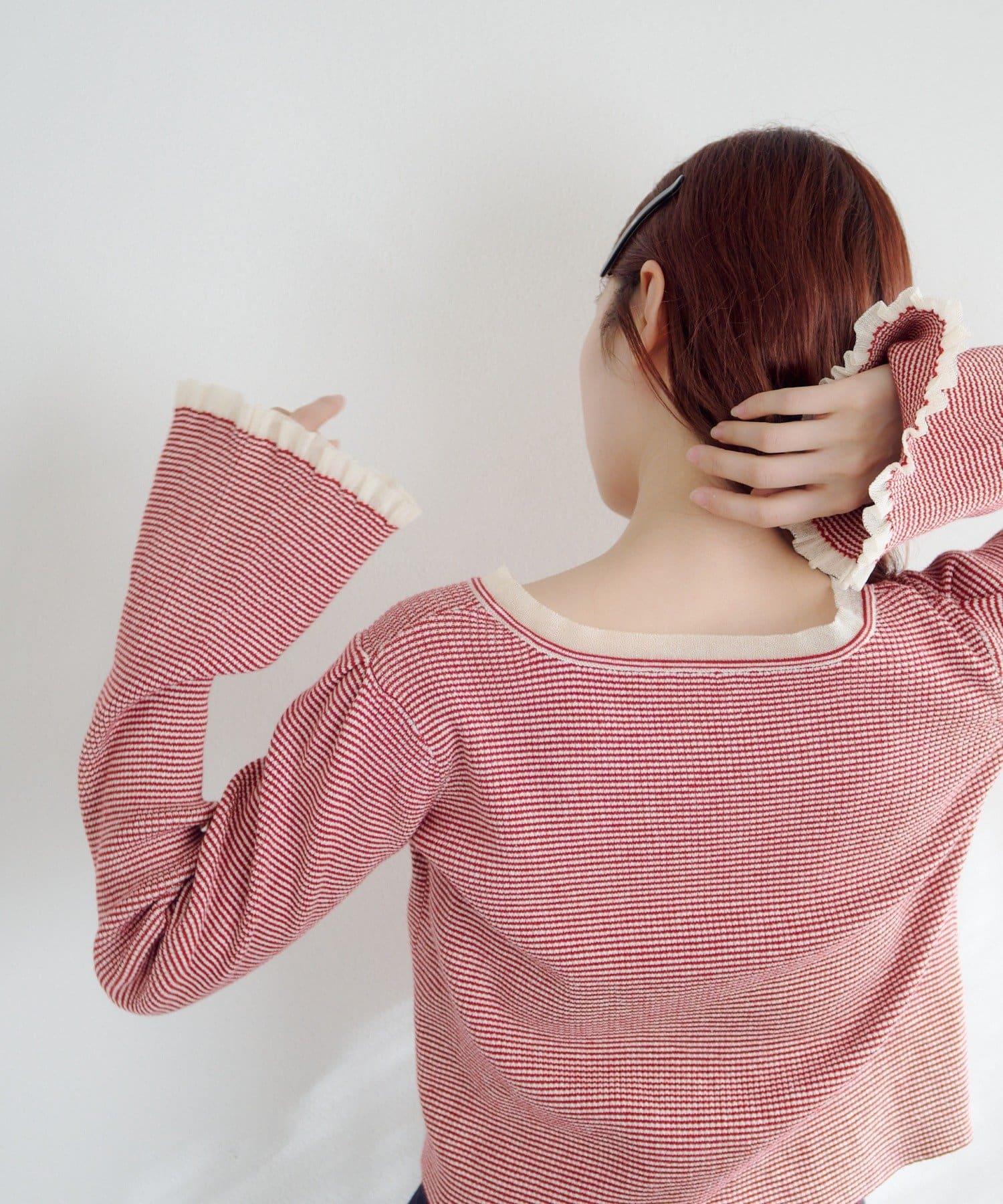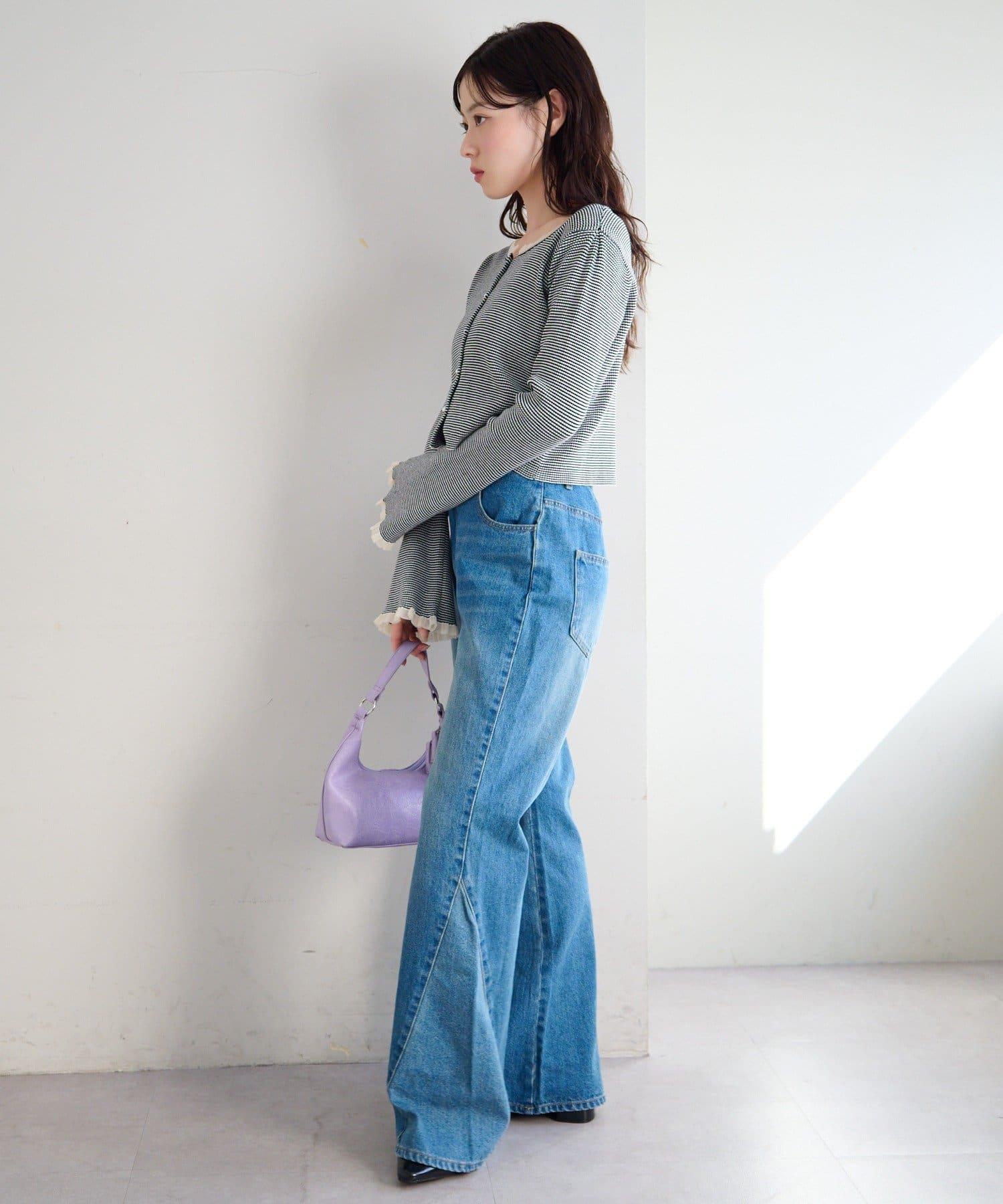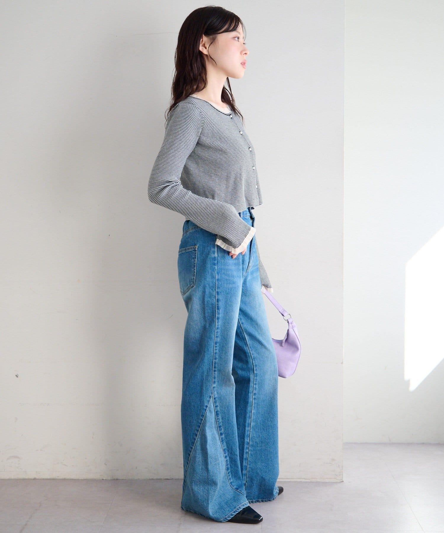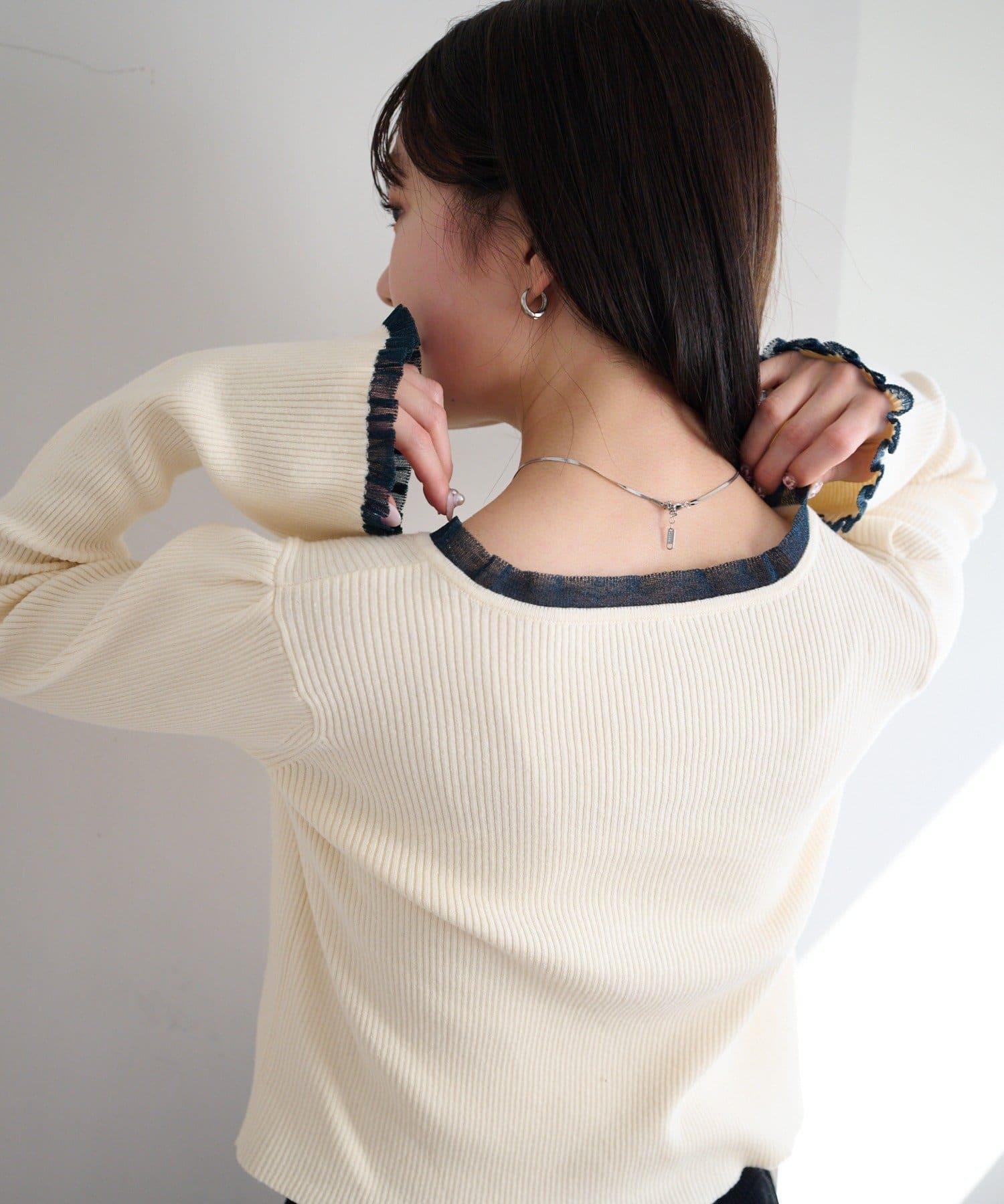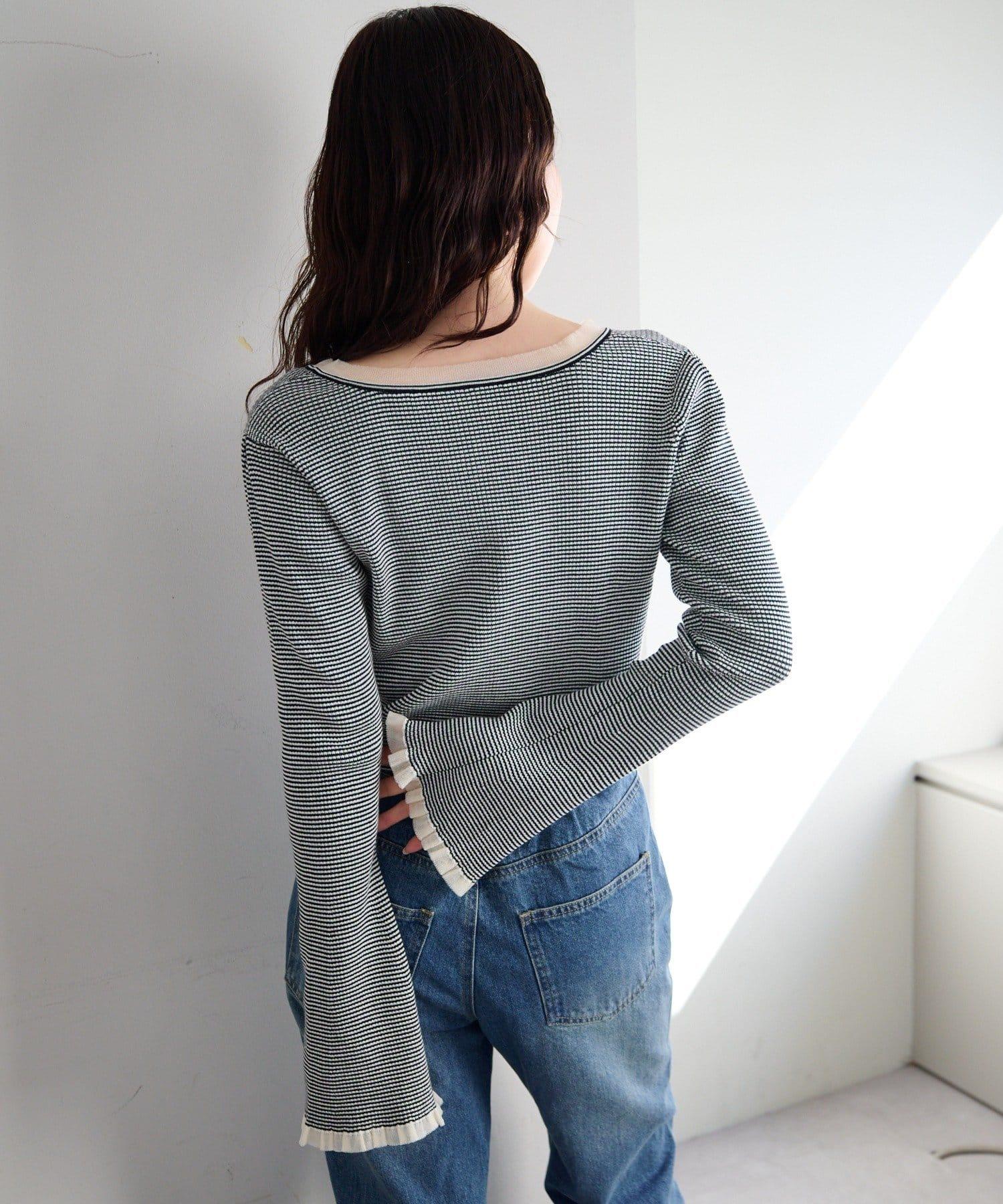 精緻的荷葉邊和珍珠鈕釦吸引著人們的目光,是一款女性化的開襟羊毛衫。