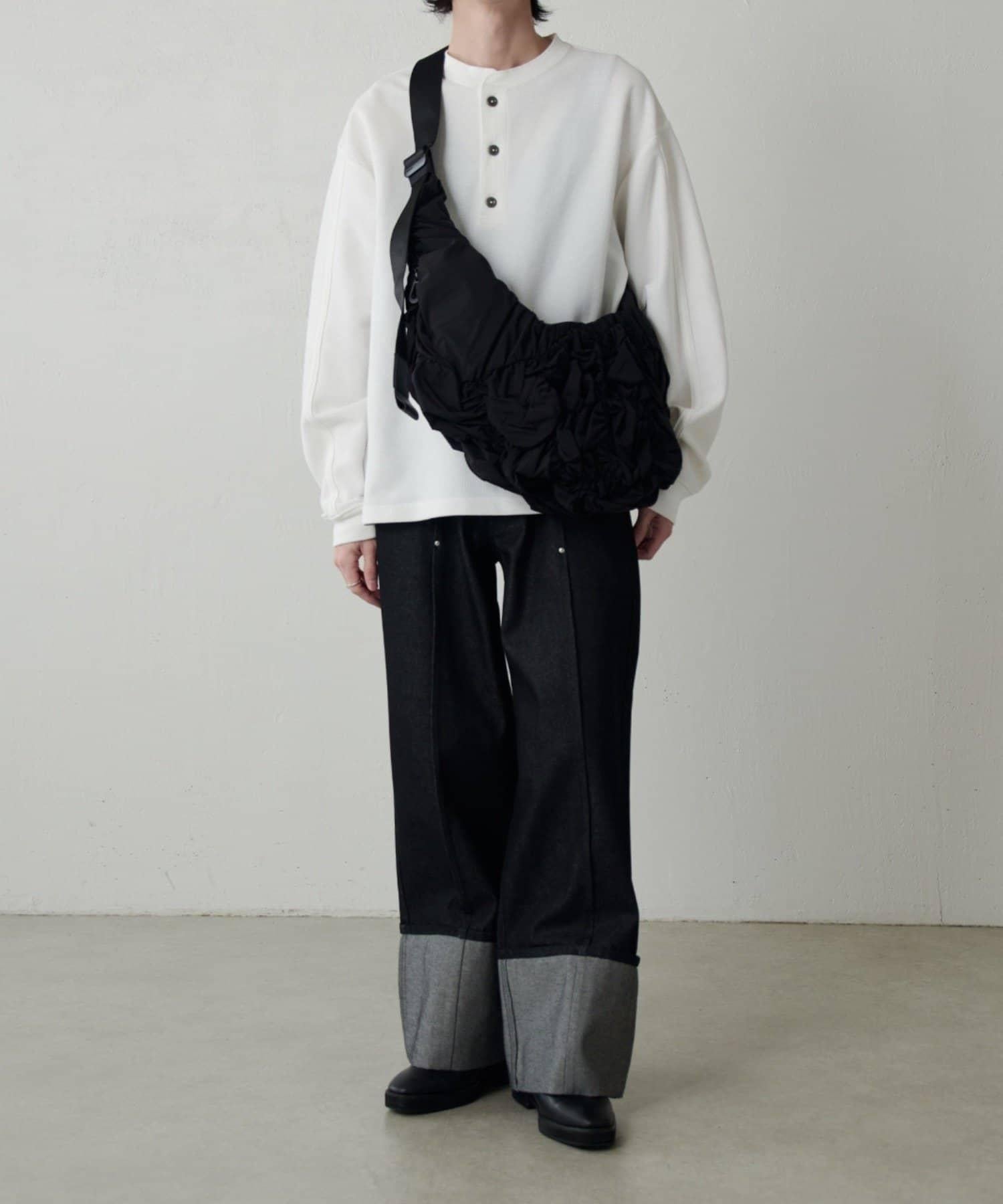 寬鬆的尺寸,肩部下垂,衣身寬大。前方雞心領上的鈕釦為金屬鈕釦,具有粗獷、優雅的感覺。這款單品款式簡單,但單穿也很有型。