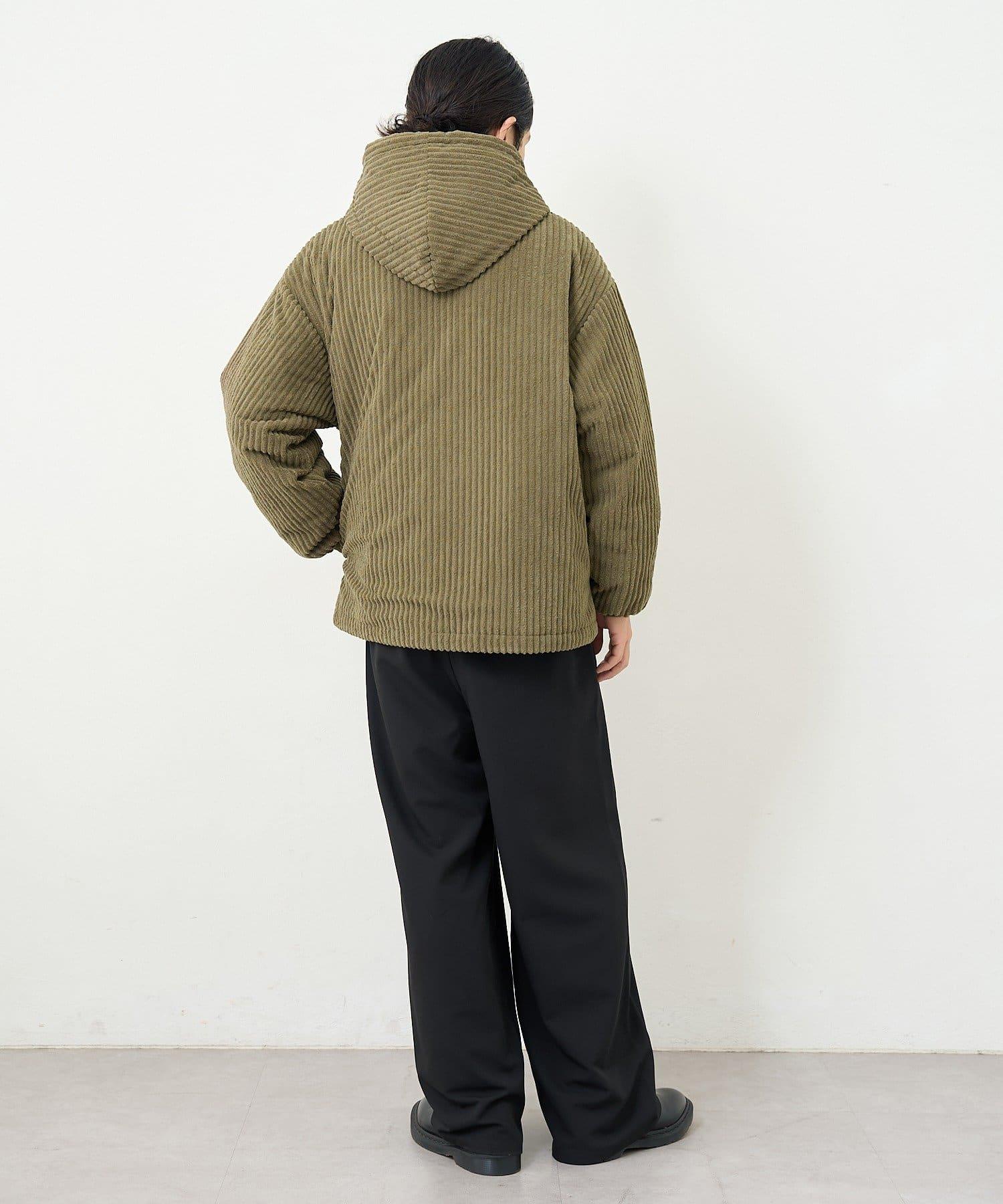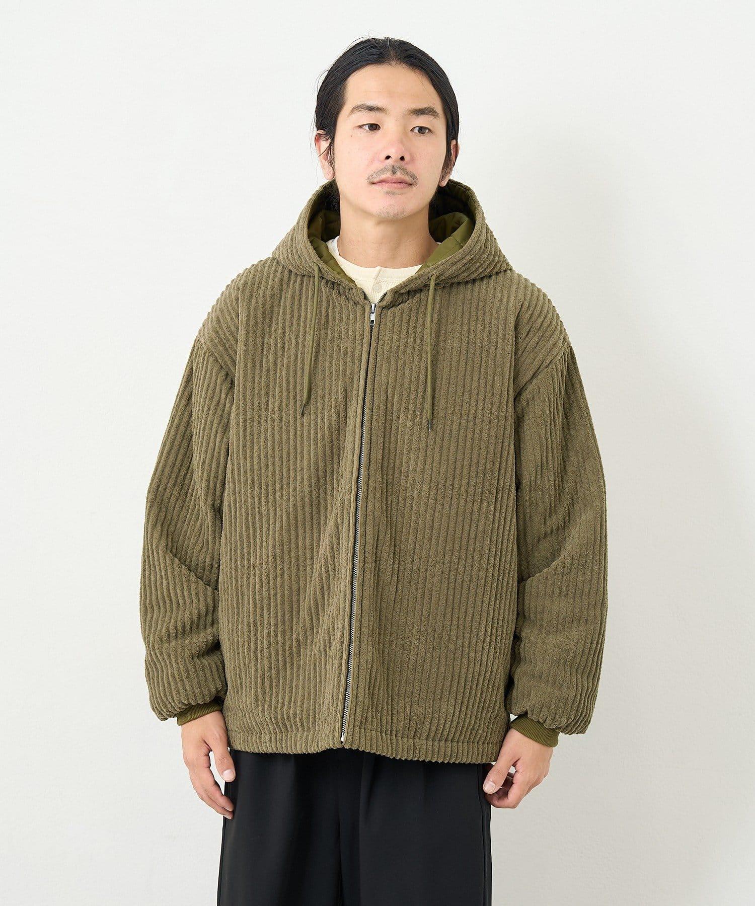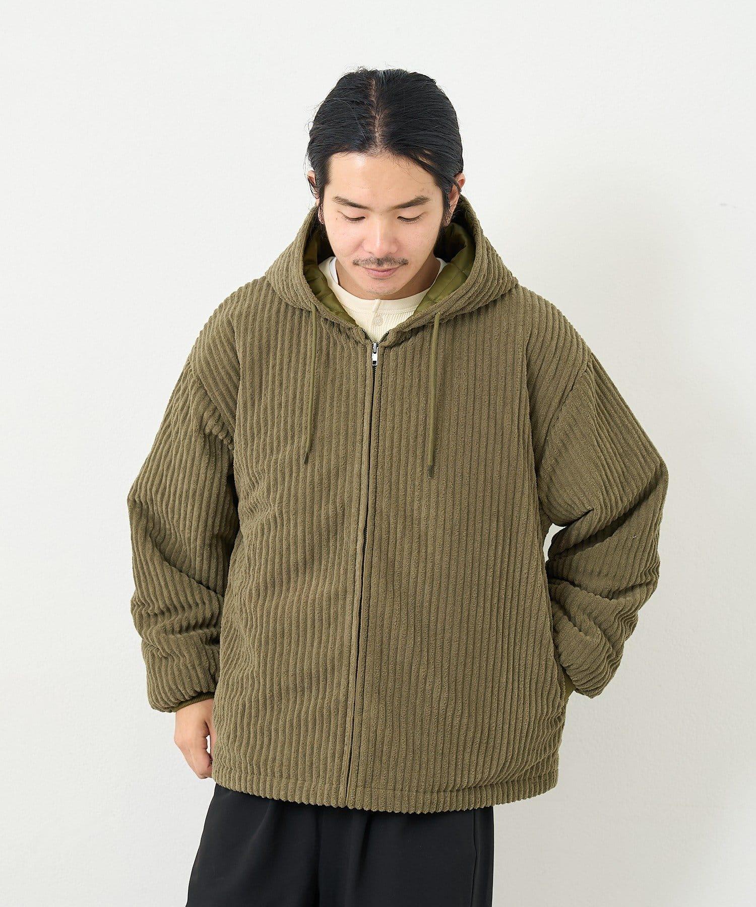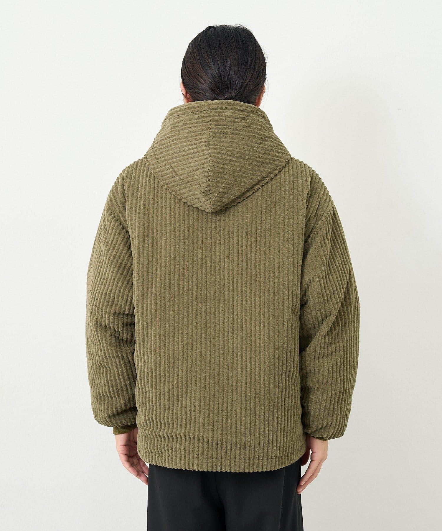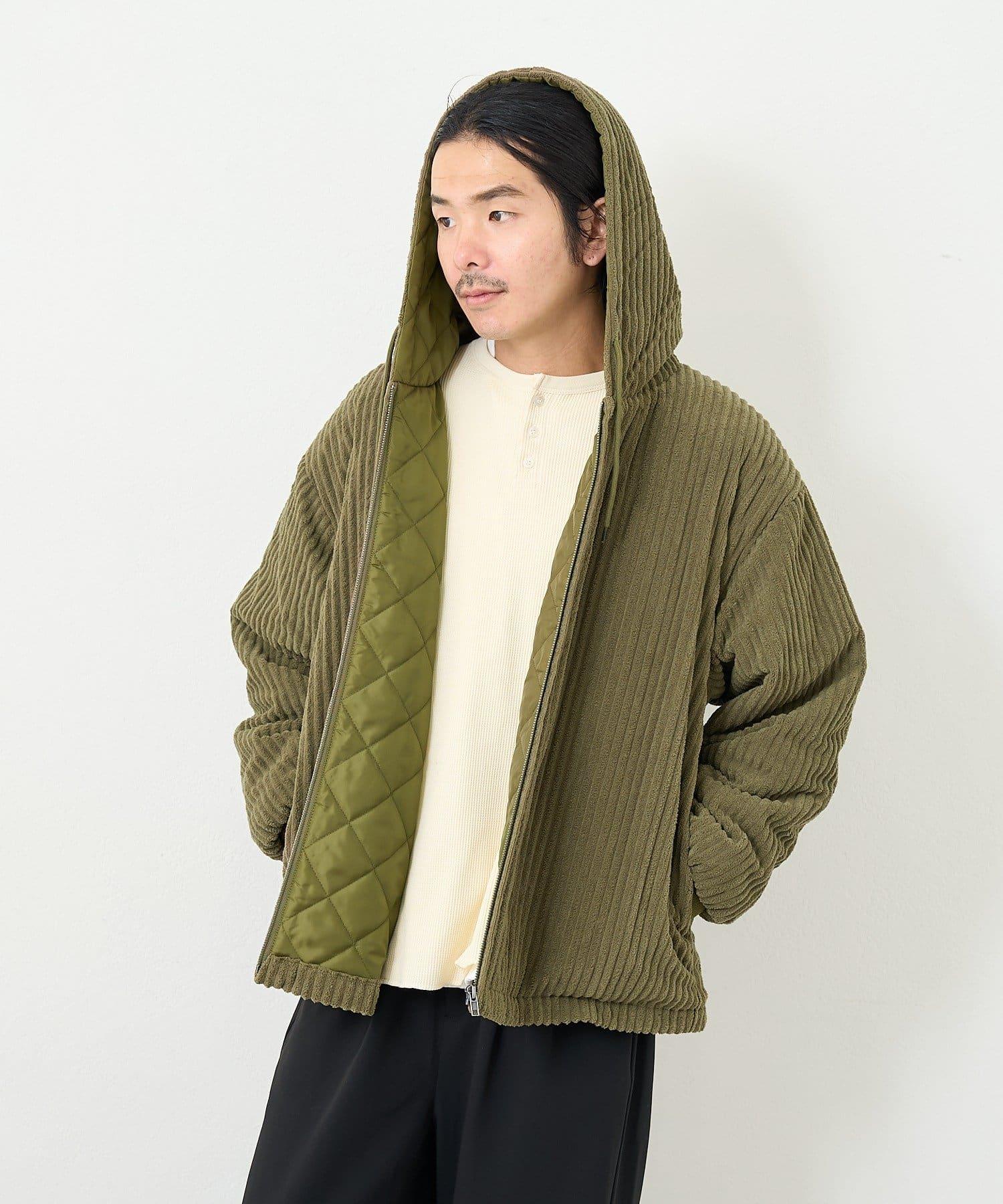 這款季節性連帽外套融合了粗稜燈芯絨的溫暖外觀和絎縫棉填充物的蓬鬆觸感。