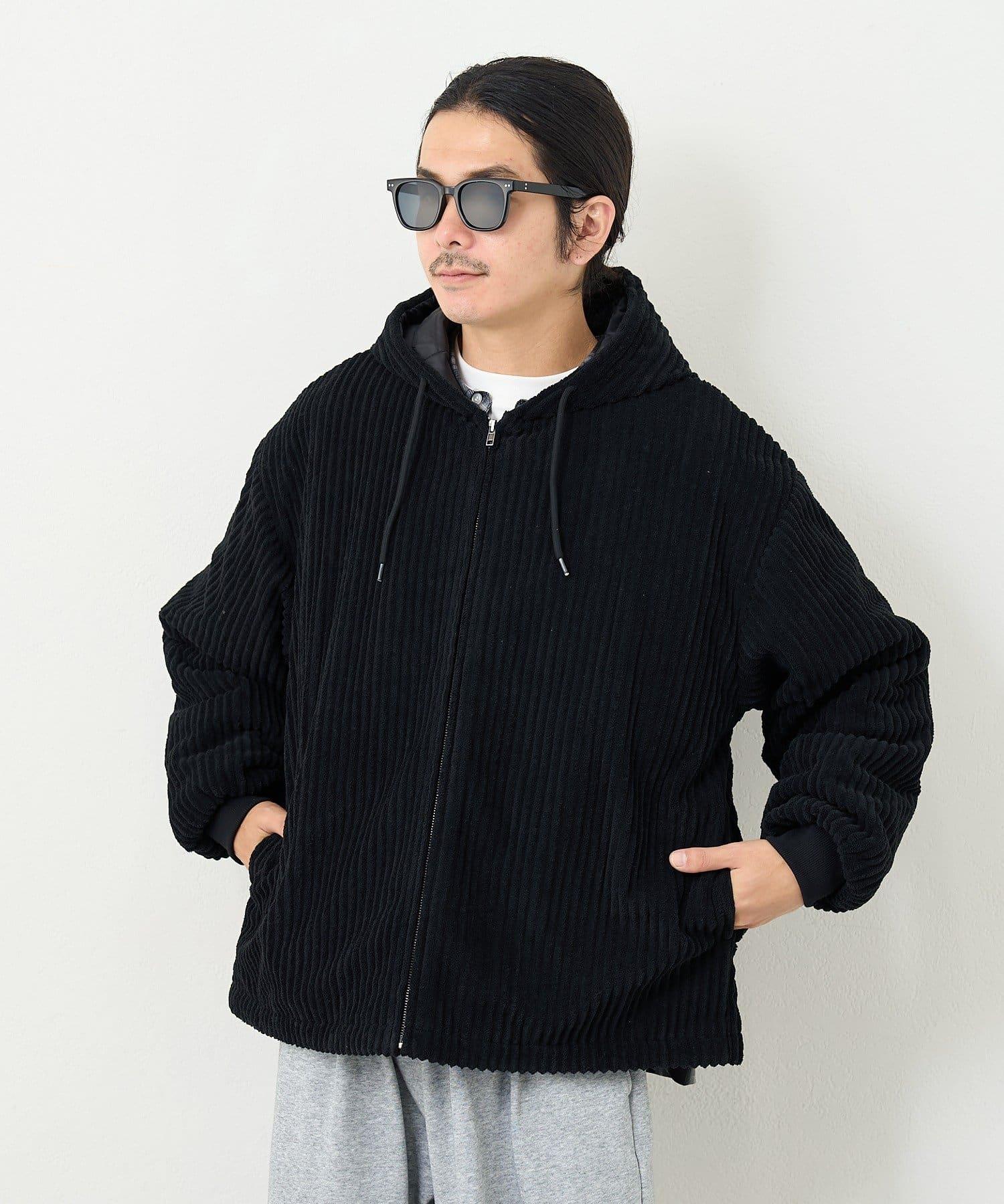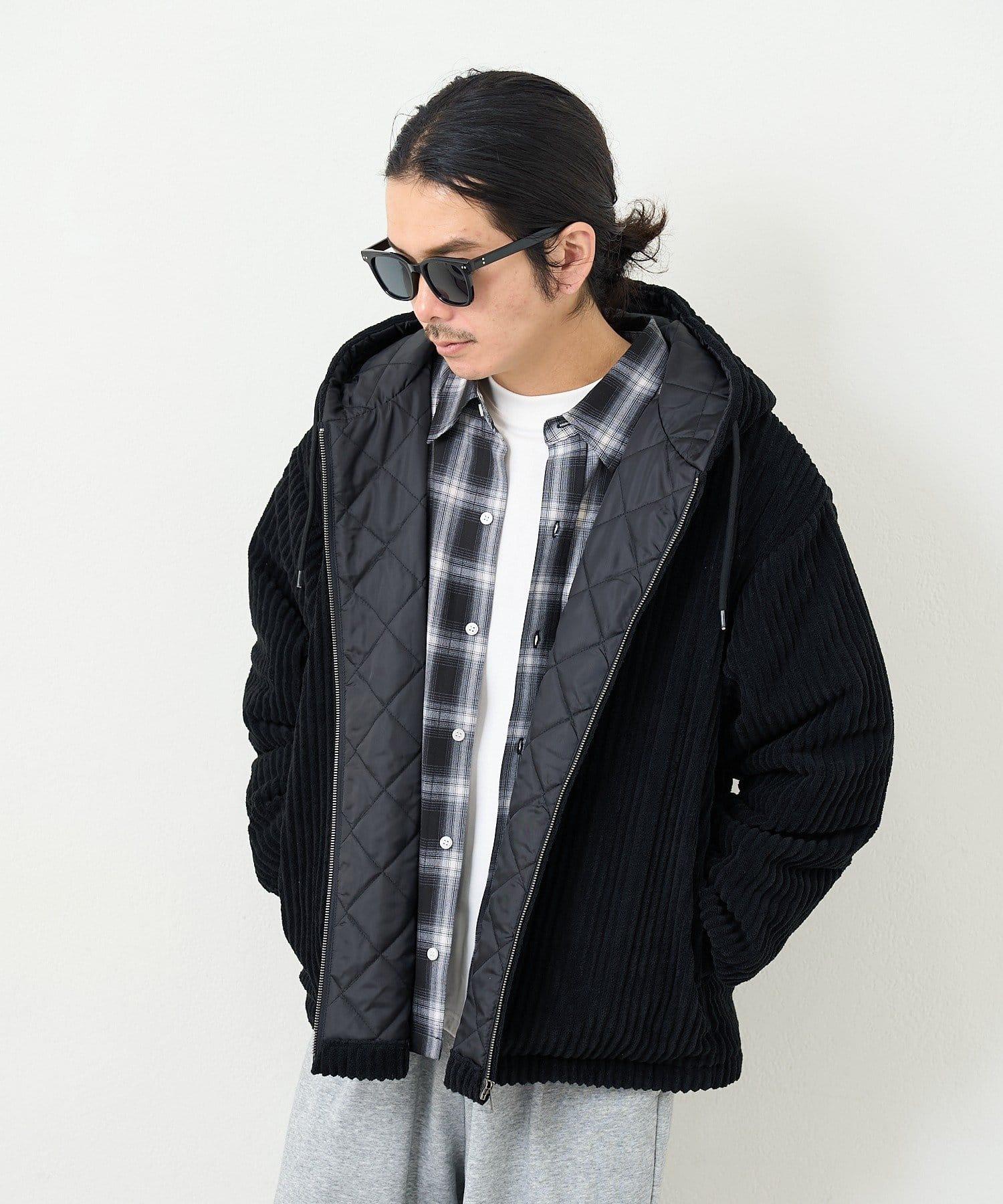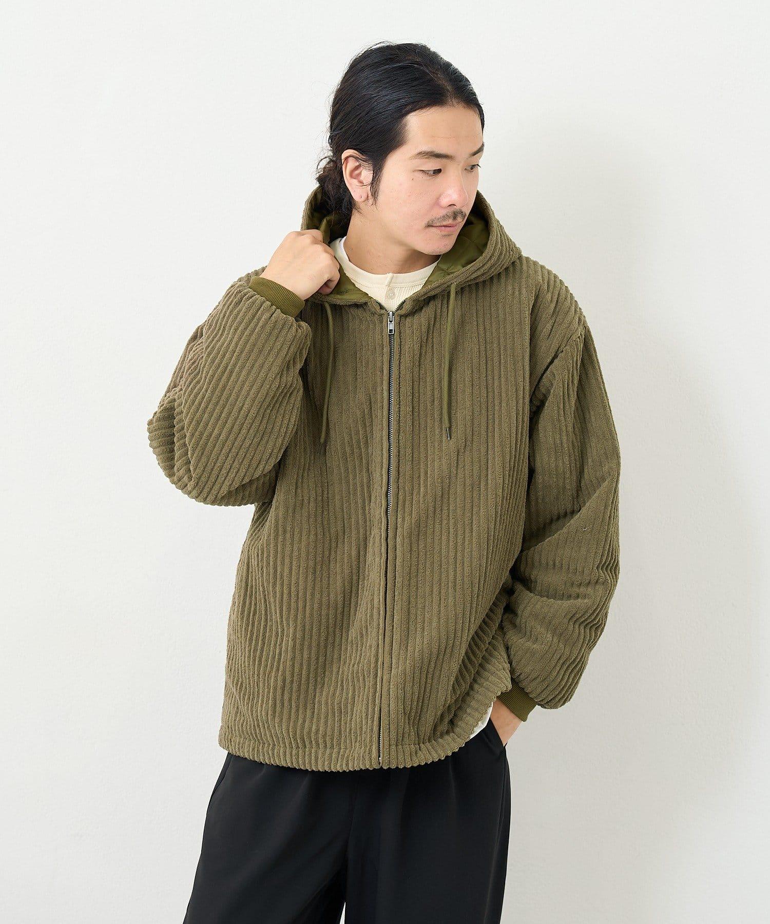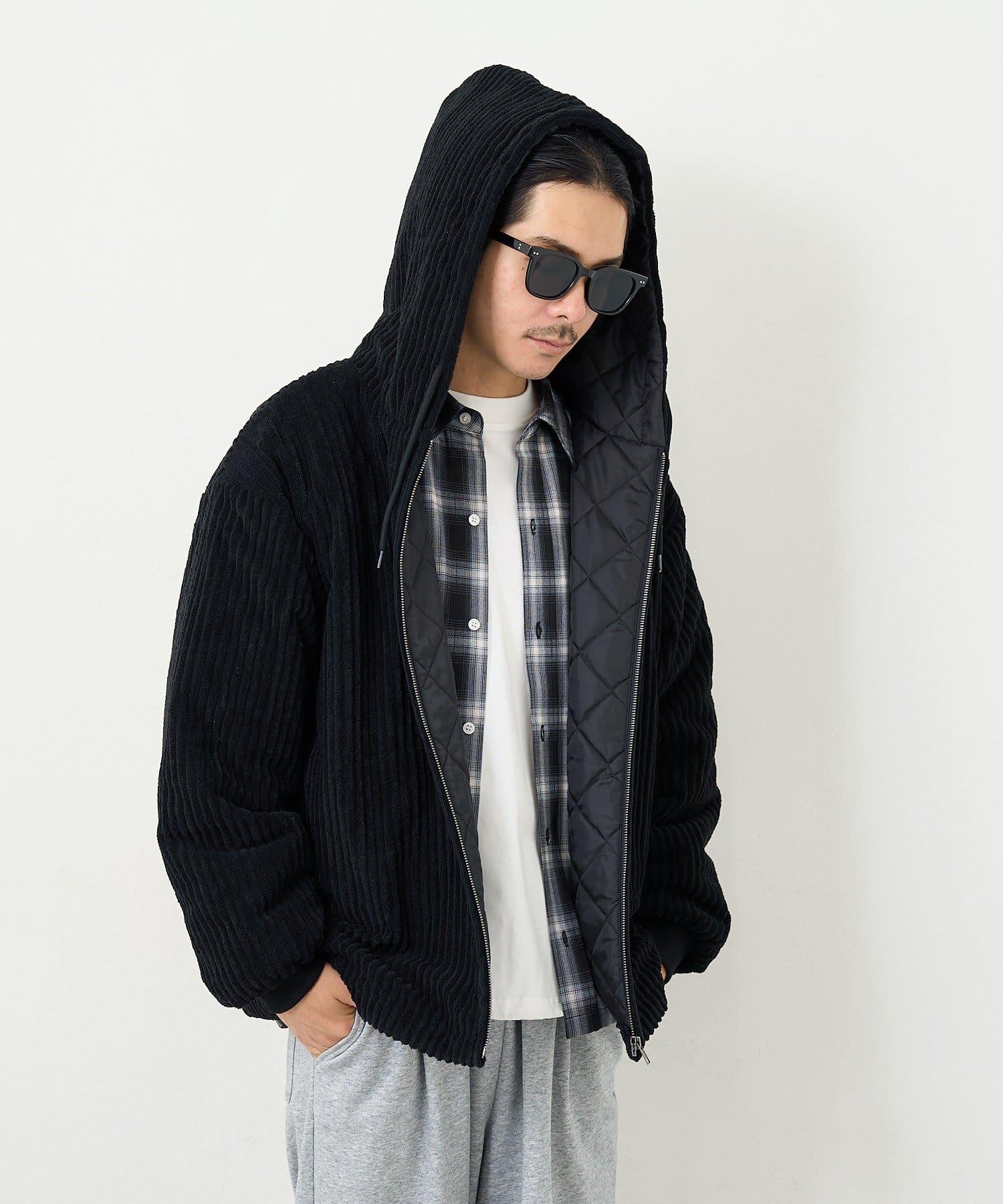 這款季節性連帽外套融合了粗稜燈芯絨的溫暖外觀和絎縫棉填充物的蓬鬆觸感。