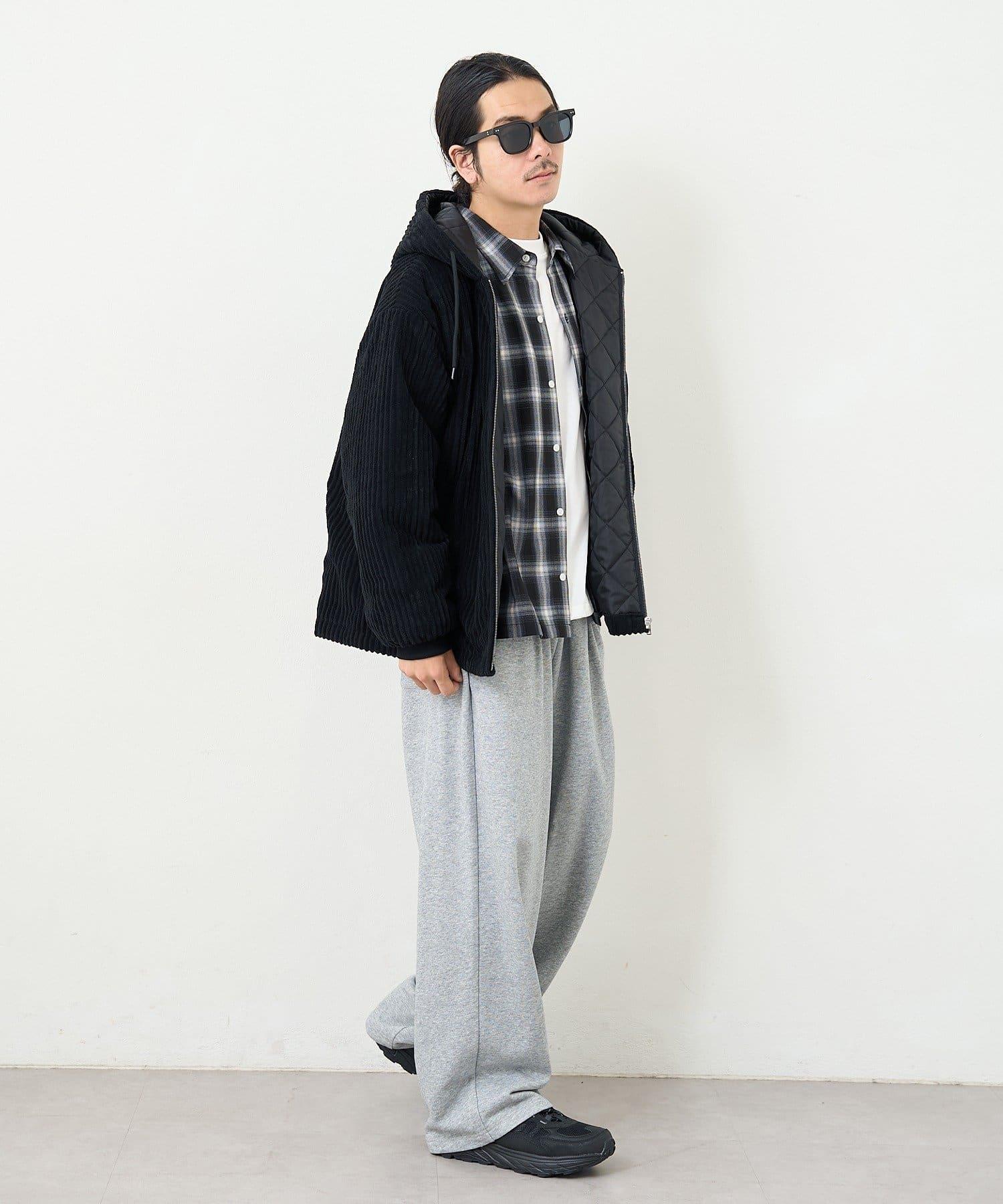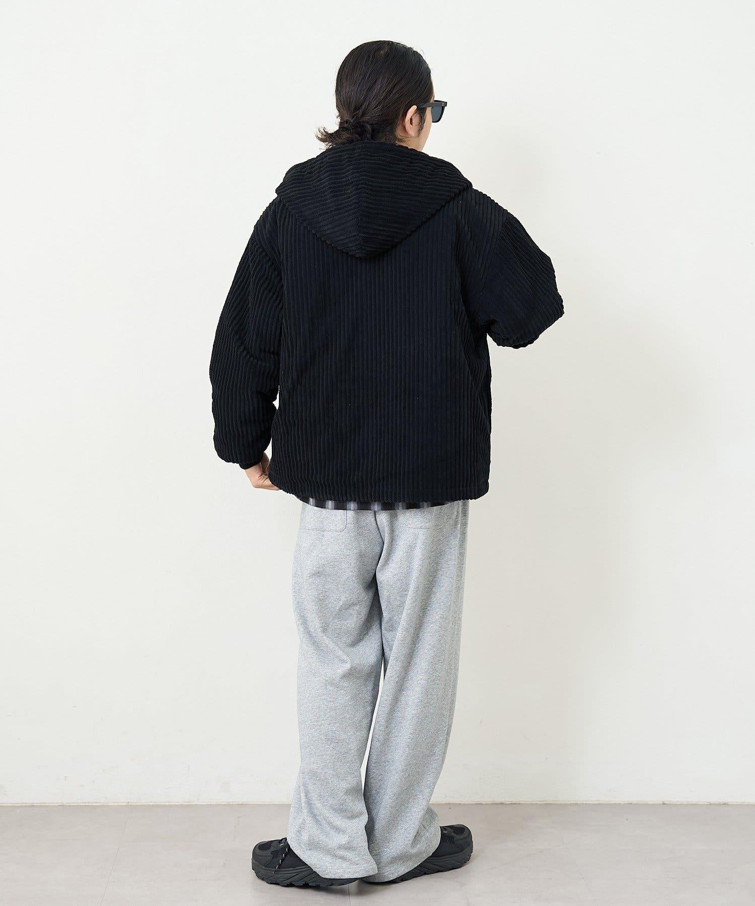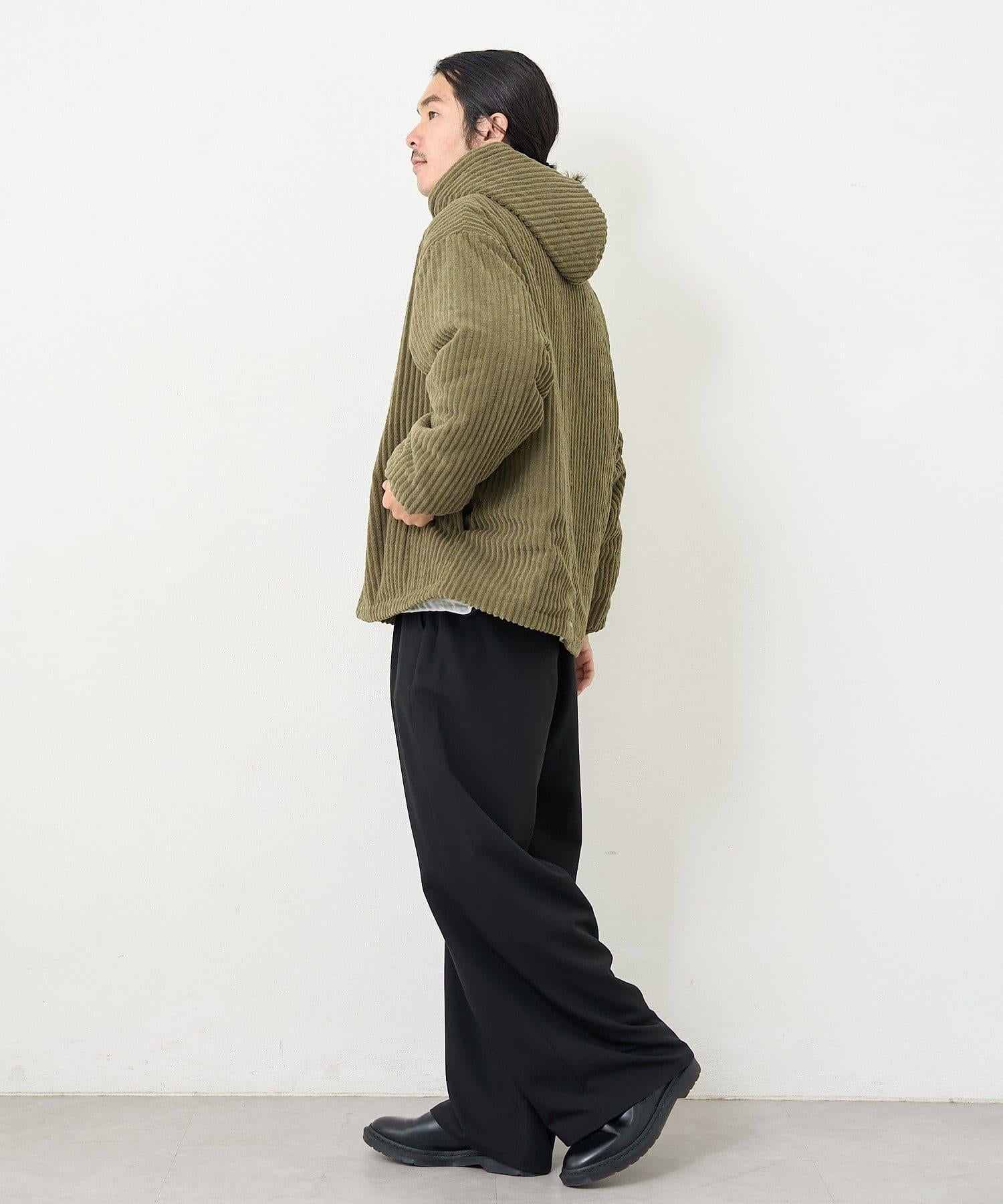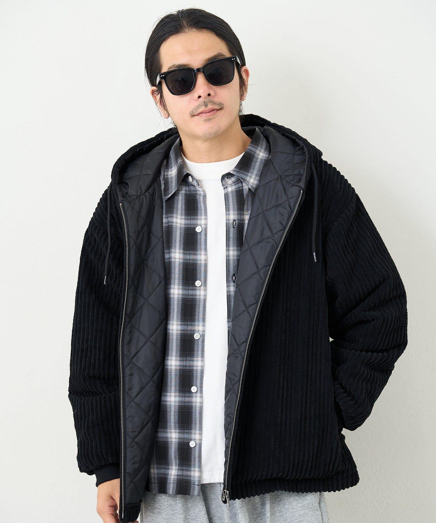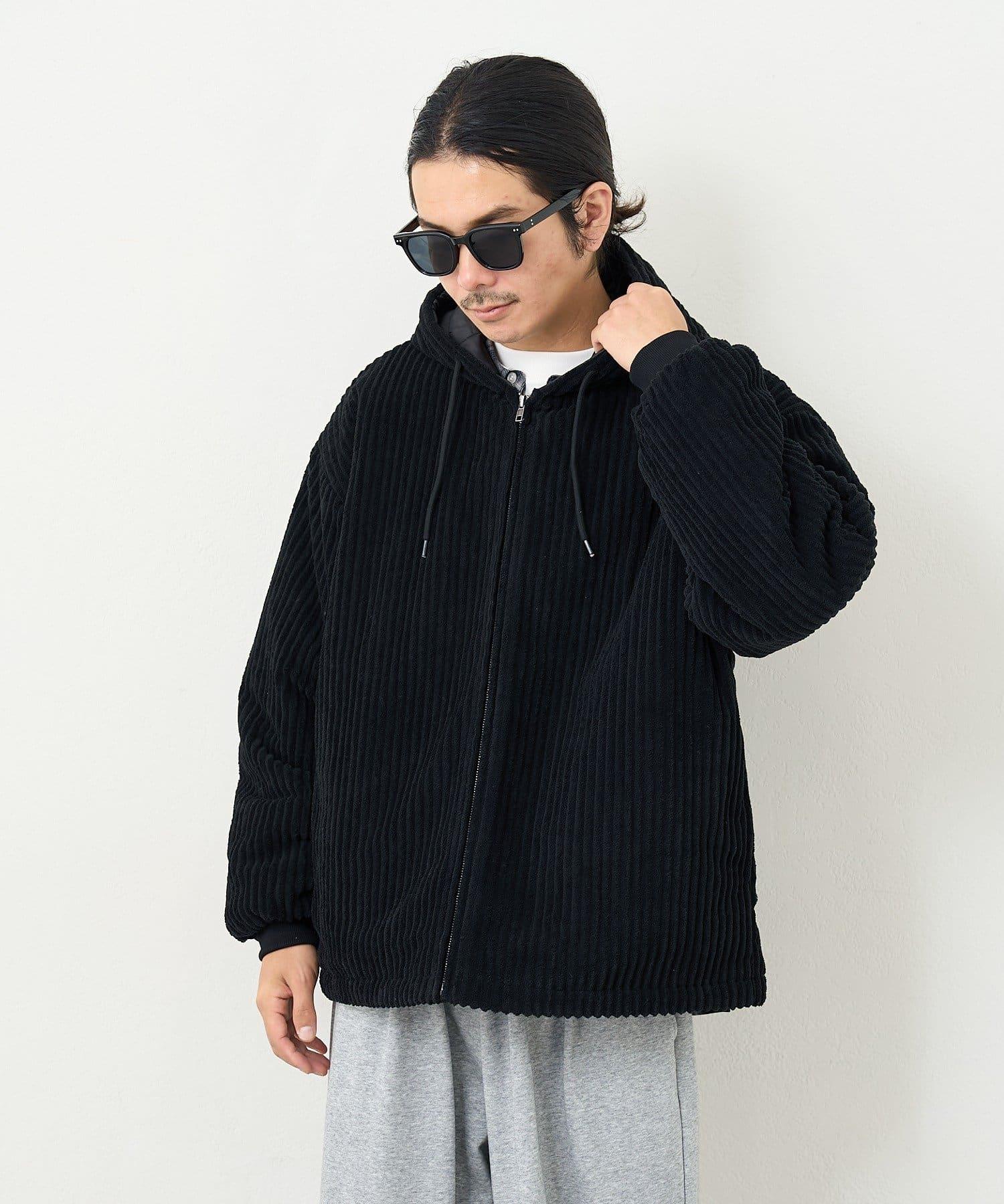 這款季節性連帽外套融合了粗稜燈芯絨的溫暖外觀和絎縫棉填充物的蓬鬆觸感。