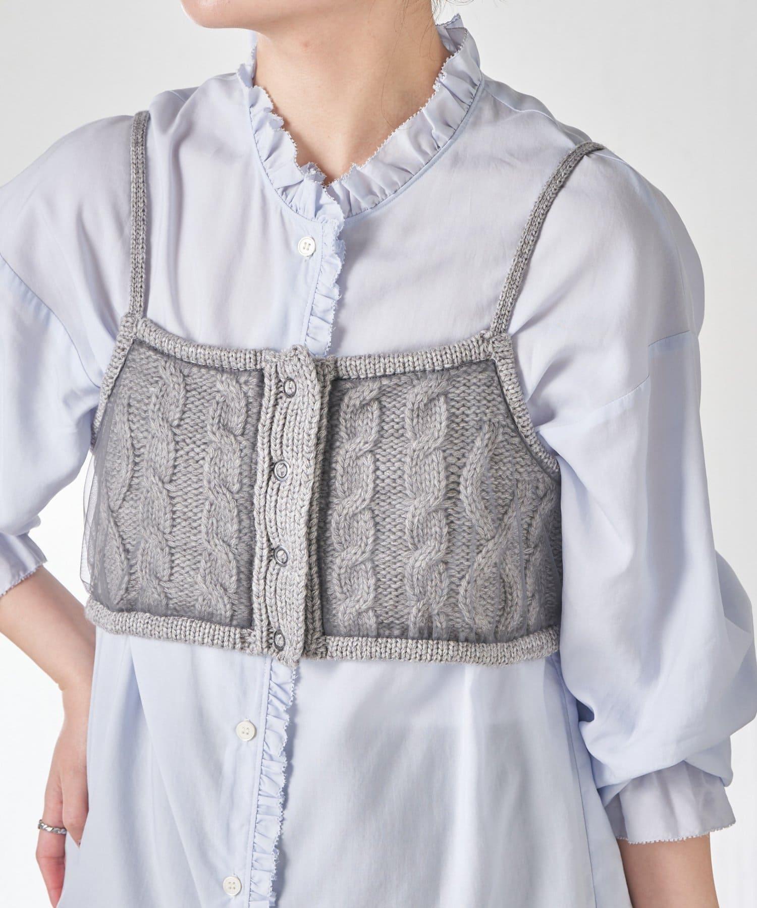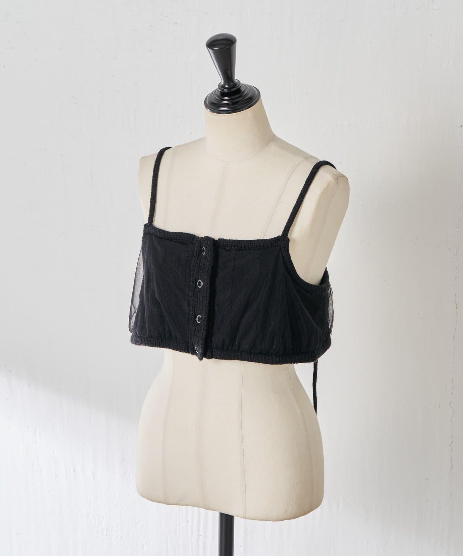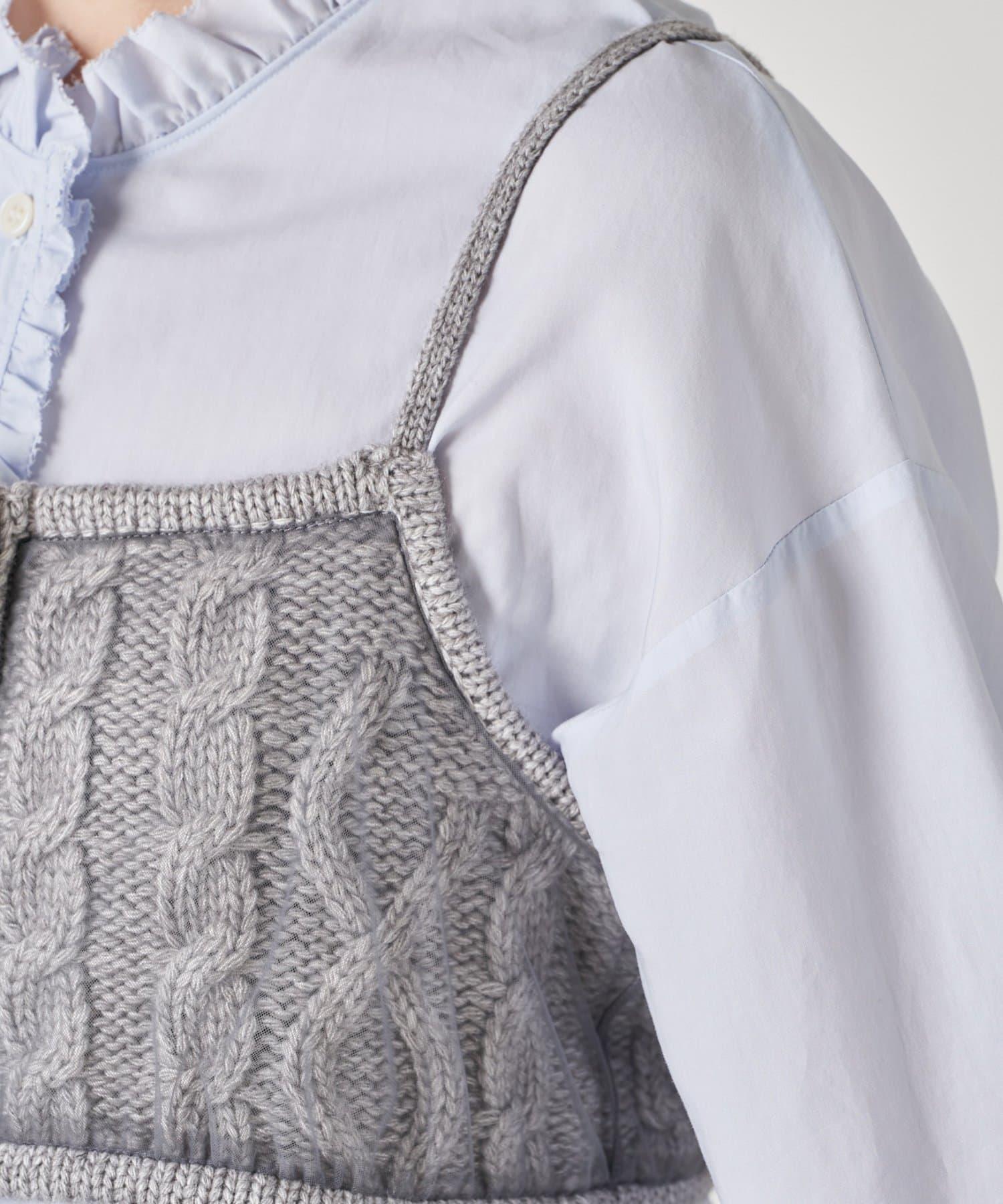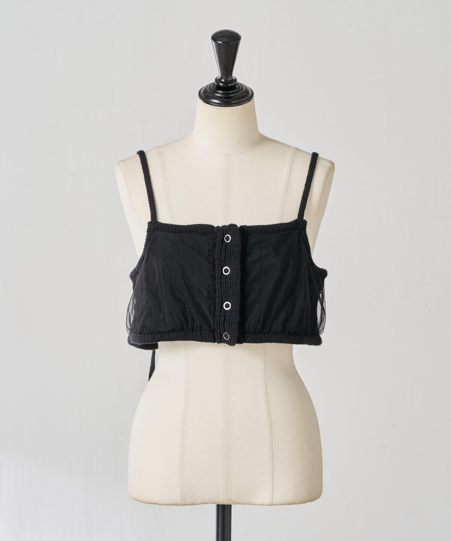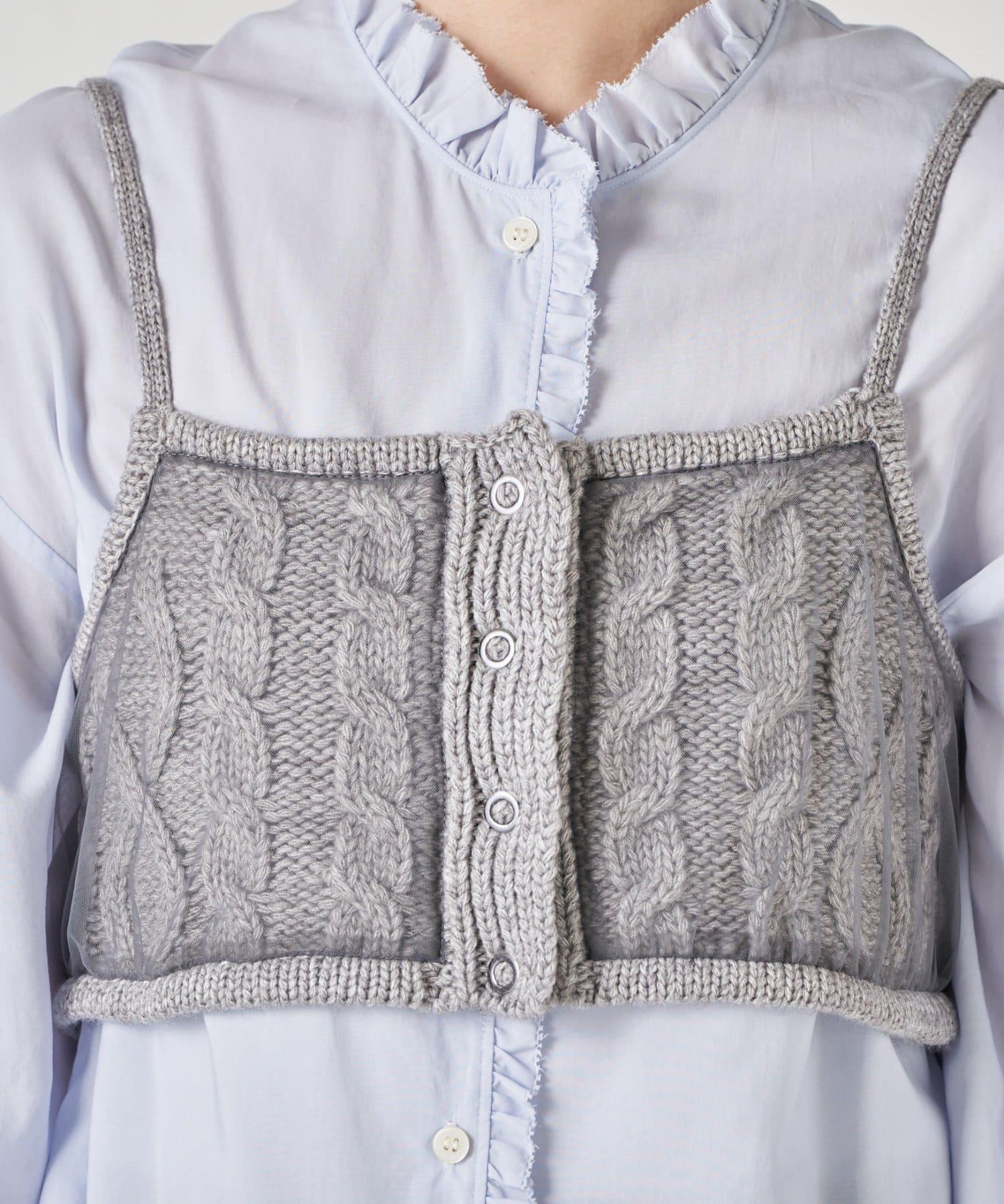 針織吊帶衫上的薄紗讓針織圖案略顯透明。