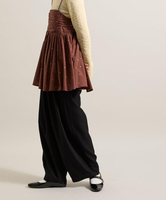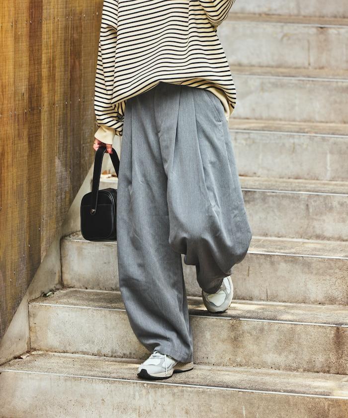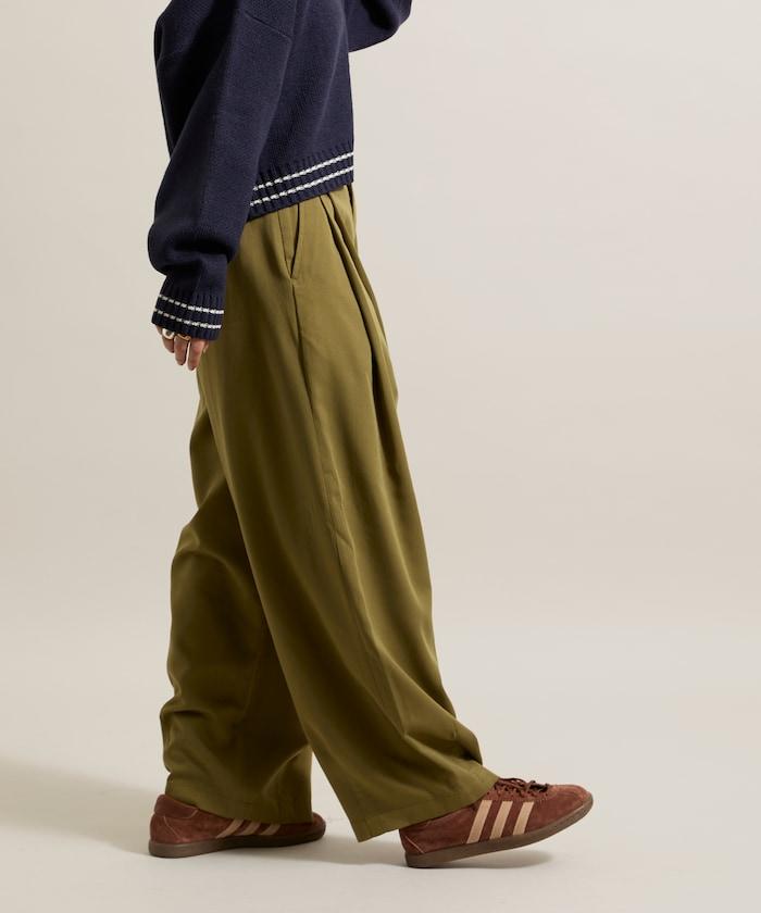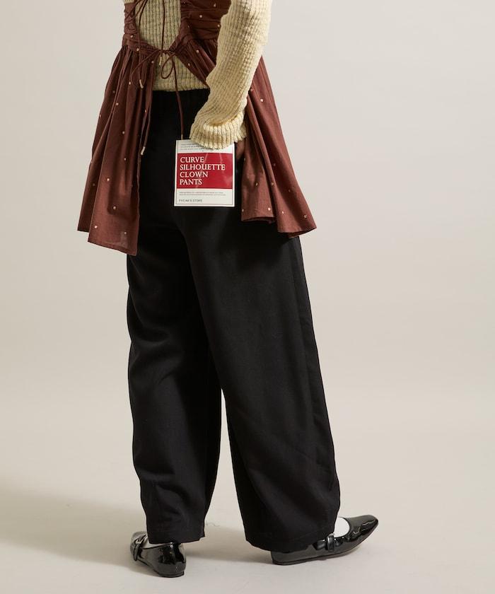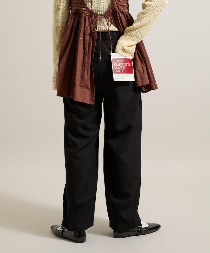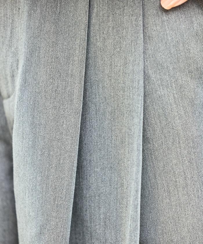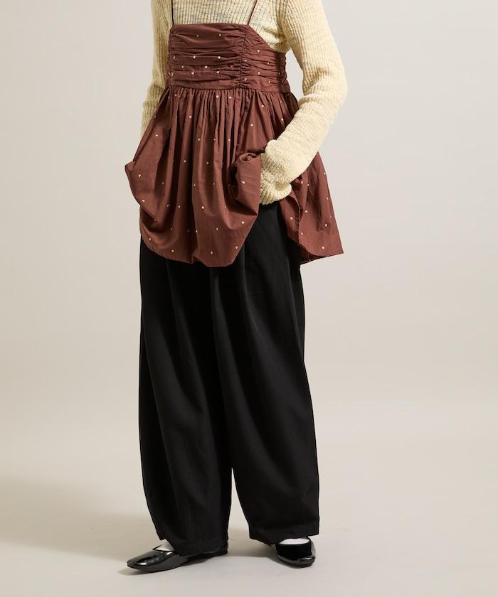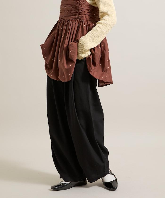 腰部的兩個收褶和下襬處的褶襉使大腿至膝蓋處的體積感更加明顯,營造出圓潤、立體的寬大輪廓。